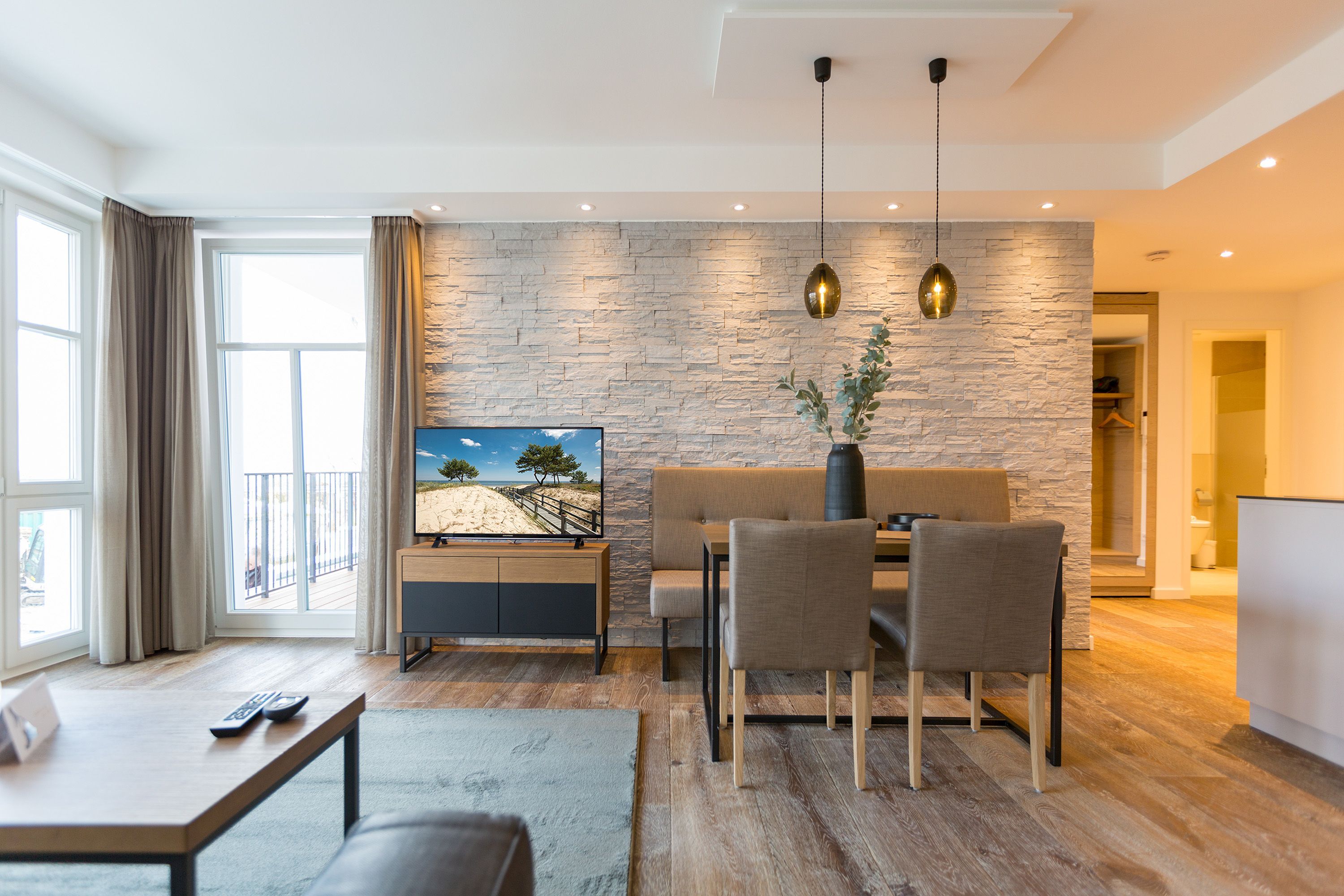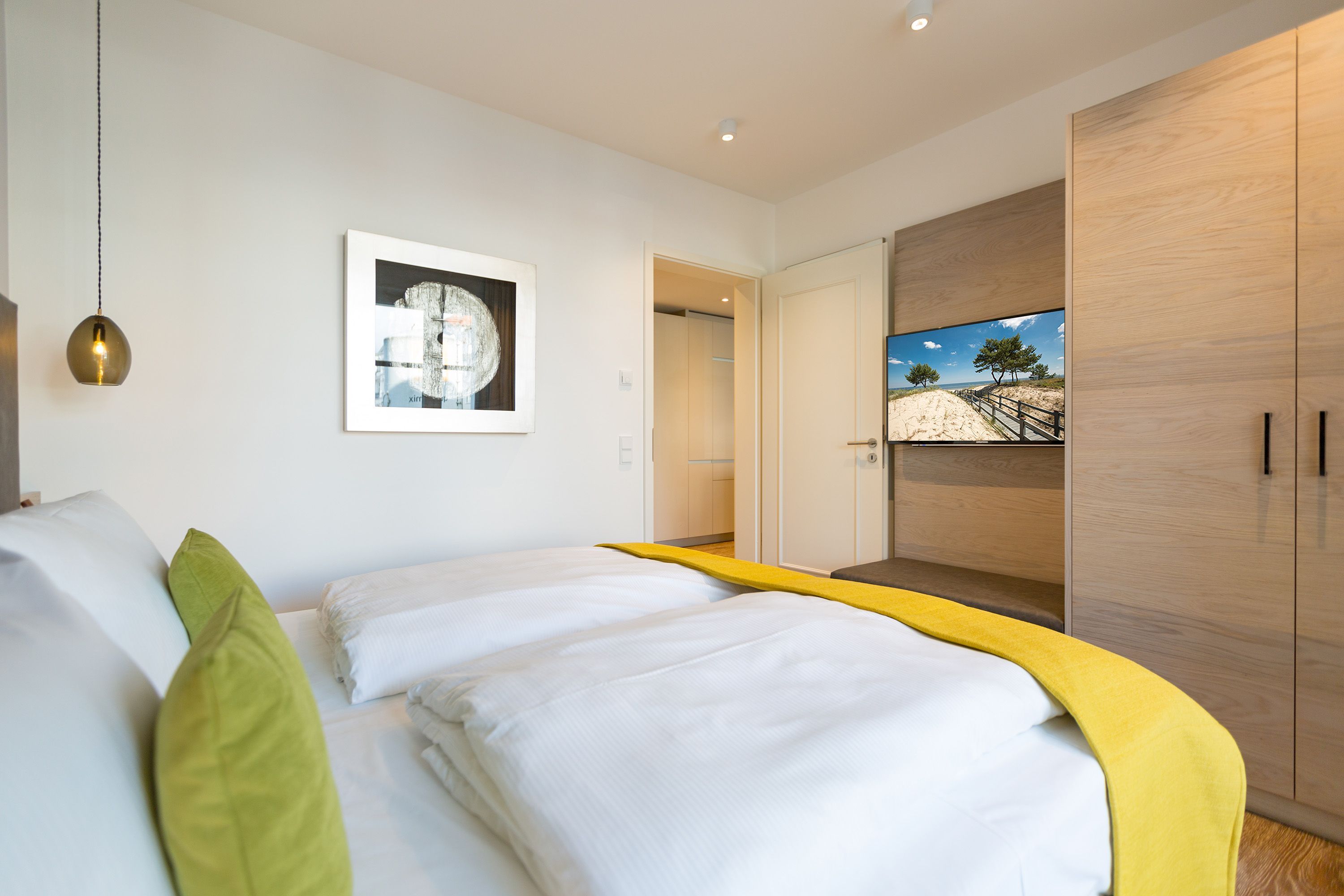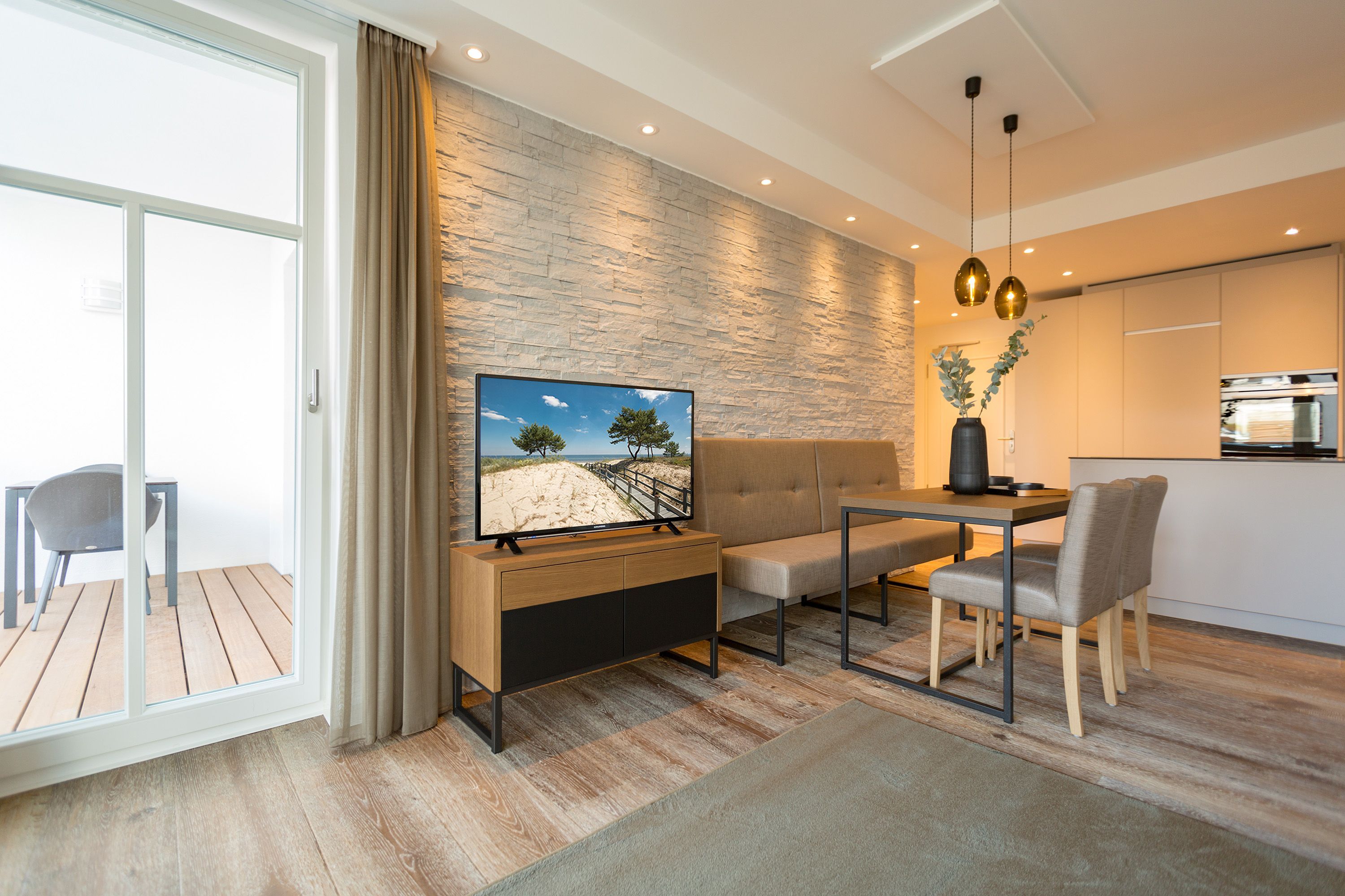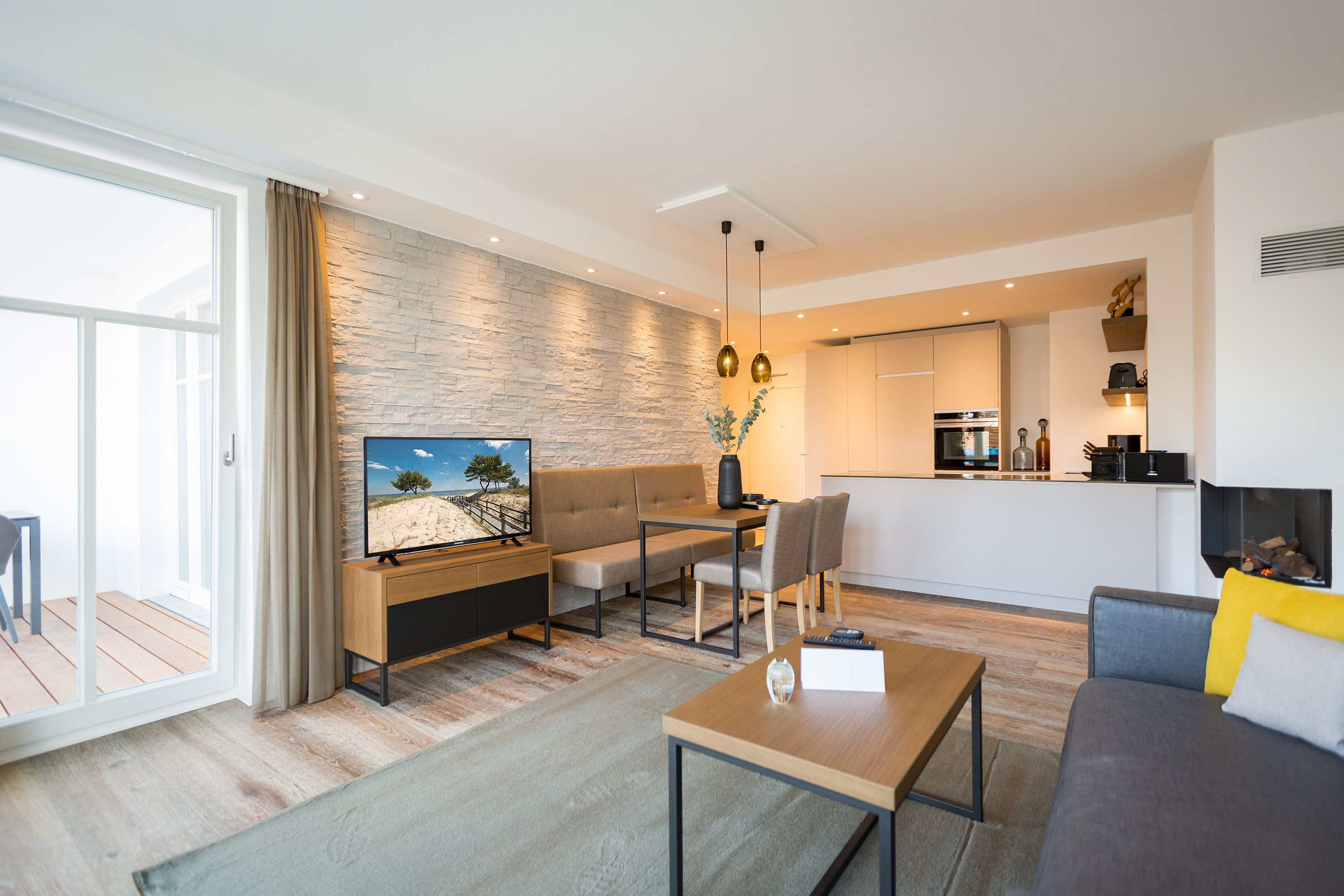 Exklusiv Urlauben, das können Sie in dem 51 Quadratmeter großen zwei-Raum-Appartement im 1. Obergeschoss des Beachhouses vis-à-vis zur Ostsee perfekt. Denn dieses wunderschöne, lichtdurchflutete Feriendomizil macht Auszeitträume wahr. Zwei Personen und ein geliebter Vierbeiner können hier eine entspannte Zeit miteinander verbringen, Alltagssorgen und Stress vergessen und sich am Strand einmal so richtig den Kopf von der frischen Ostseebrise frei pusten lassen. Vom Balkon (6 Quadratmeter) Ihrer Ferienwohnung aus können Sie aufs Meer hinaus schauen. Genießen Sie beim Frühstück oder bei einem Sundowner den endlosen Blick über die blaue Weite. Legen Sie die Füße hoch auf der bequemen Couch im luftig geräumigen und großzügigen Wohn-Esszimmer. Hochwertige Materialien, eine aufeinander abgestimmte Gestaltung und Einrichtung sowie stylische Accessoires verleihen dem Appartement Stil und Eleganz. Ein Gas-Kamin lädt zu romantischen Stunden vor dem Flammenspiel ein. Ein schöner Esstisch mit Stühlen und einer Sitzbank ist der perfekte Platz für lauschige Essen und Plauderstunden. Eine Hi-Fi-Anlage mit Bluetooth sorgt für die passende Musik, ein großer Flat-TV für spannendes Home-Entertainment. Sie kochen gern? Die vollausgestattete, offene Küchenzeile eignet sich dazu ideal. In den Schränken finden Sie edles Design-Geschirr und für diverse Brat- oder Back-Aktionen stehen Ihnen Markengeräte zur Verfügung. Zu einem erholsamen Urlaub gehört auch ein vergnüglicher Schlaf. Den finden Sie garantiert im gemütlichen Schlafzimmer mit dem großen Boxspringdoppelbett (1,80 m x 2,00 m). Von hier aus haben Sie ebenfalls einen Zugang auf den Balkon. So können Sie direkt nach dem Aufwachen Ihre Meersehnsucht stillen. Auch in diesem Zimmer haben Sie einen Flat-TV. Große Schränke im Schlafzimmer und im Flur bieten ausreichend Platz für die Urlaubsgarderobe. In einem Safe können Sie Ihre Wertgegenstände verstauen. Das Bad ist eine echte Wohlfühlzone mit großer, ebenerdiger Regendusche, geräumigem Waschtisch mit beleuchtetem Spiegel, WC und einer Finnischen Sauna, die Sie kostenfrei nutzen können. In einem kleinen Hauswirtschaftsraum befindet sich ein Wasch-Trockner. Für Ihren Komfort sind die Betten bezogen und Handtücher liegen bereit. Das WLAN ist ebenfalls kostenfrei. In der modernen Tiefgarage ist für Sie der Stellplatz Nr. 8 im Doppelparker oben (max. Höhe 2,00m, max. Länge 5,10 m, max. Breite 2,50 m, max. Last 2.600 kg) reserviert.