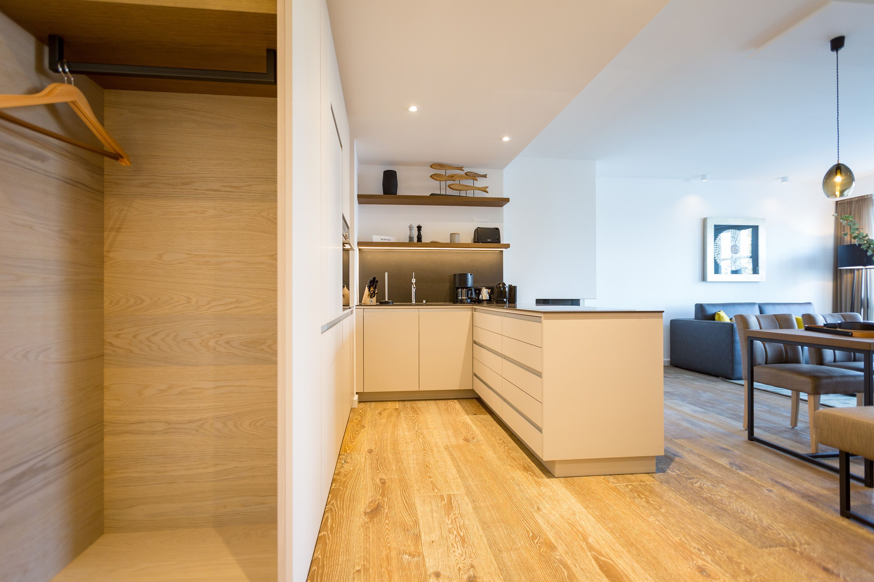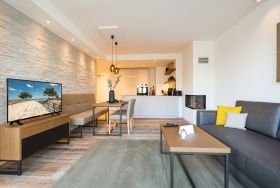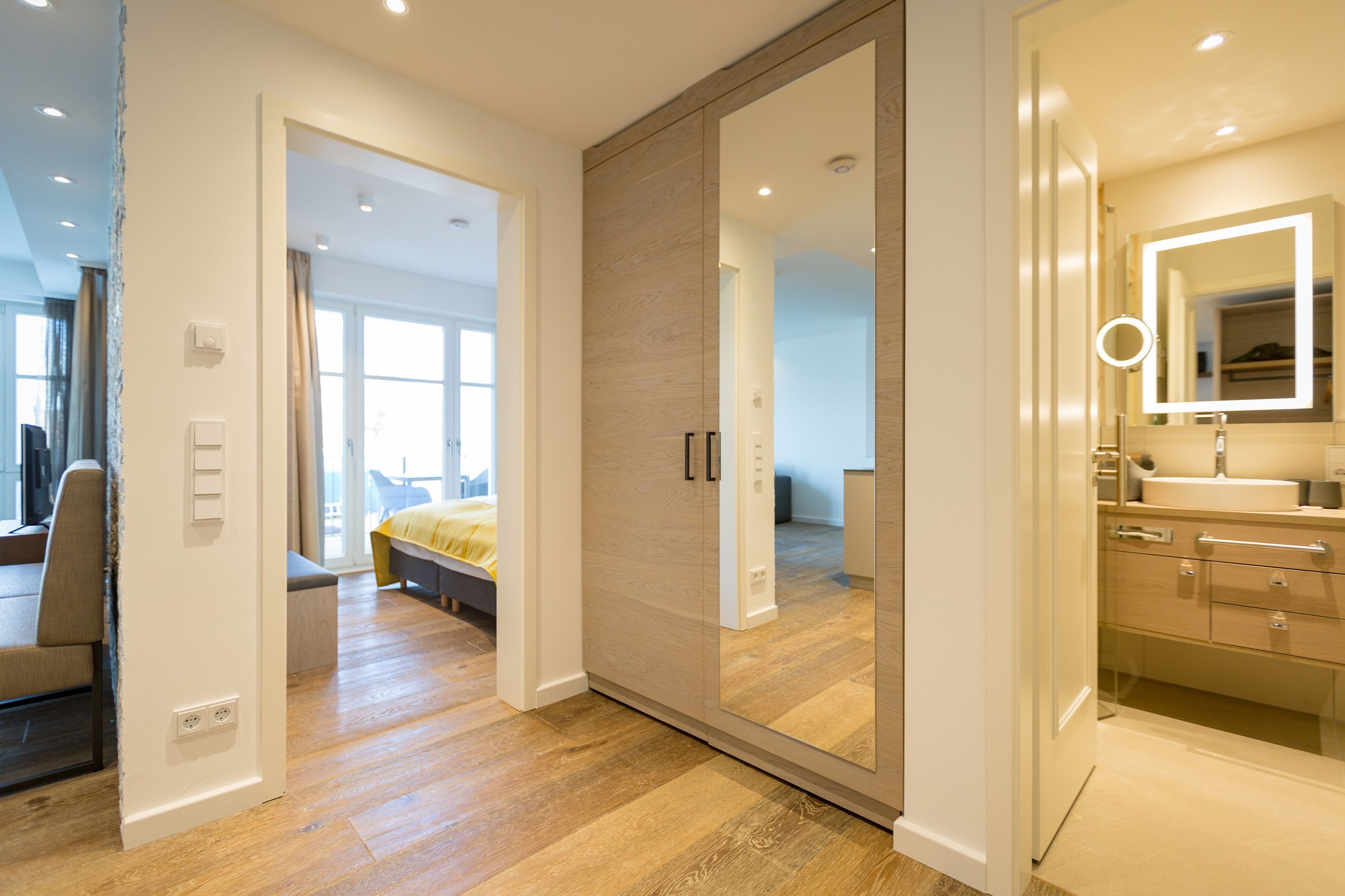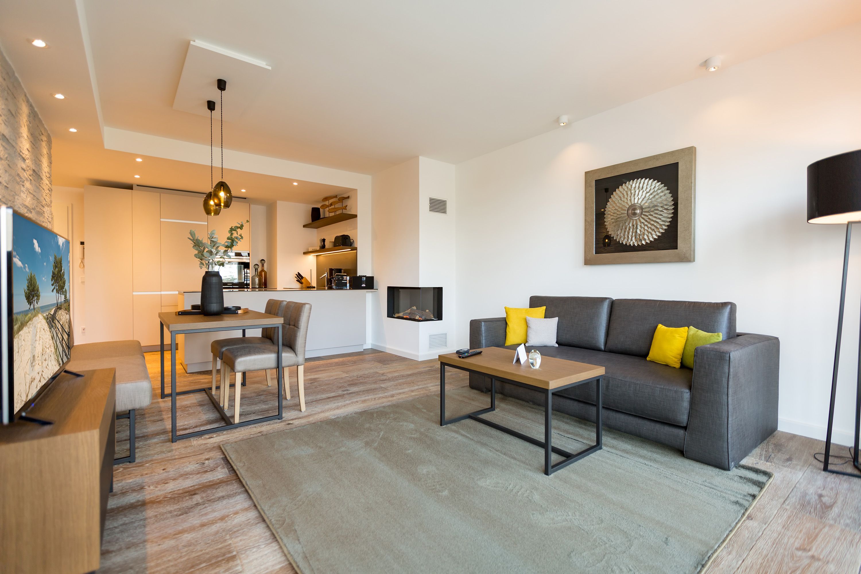 Exklusiv Urlauben, das können Sie in dem 51 Quadratmeter großen zwei-Raum-Appartement im 1. Obergeschoss des Beachhouses vis-à-vis zur Ostsee perfekt. Denn dieses wunderschöne, lichtdurchflutete Feriendomizil macht Auszeitträume wahr. Zwei Personen und ein geliebter Vierbeiner können hier eine entspannte Zeit miteinander verbringen, Alltagssorgen und Stress vergessen und sich am Strand einmal so richtig den Kopf von der frischen Ostseebrise frei pusten lassen. Vom Balkon (6 Quadratmeter) Ihrer Ferienwohnung aus können Sie aufs Meer hinaus schauen. Genießen Sie beim Frühstück oder bei einem Sundowner den endlosen Blick über die blaue Weite. Legen Sie die Füße hoch auf der bequemen Couch im luftig geräumigen und großzügigen Wohn-Esszimmer. Hochwertige Materialien, eine aufeinander abgestimmte Gestaltung und Einrichtung sowie stylische Accessoires verleihen dem Appartement Stil und Eleganz. Ein Gas-Kamin lädt zu romantischen Stunden vor dem Flammenspiel ein. Ein schöner Esstisch mit Stühlen und einer Sitzbank ist der perfekte Platz für lauschige Essen und Plauderstunden. Eine Hi-Fi-Anlage mit Bluetooth sorgt für die passende Musik, ein großer Flat-TV für spannendes Home-Entertainment. Sie kochen gern? Die vollausgestattete, offene Küchenzeile eignet sich dazu ideal. In den Schränken finden Sie edles Design-Geschirr und für diverse Brat- oder Back-Aktionen stehen Ihnen Markengeräte zur Verfügung. Zu einem erholsamen Urlaub gehört auch ein vergnüglicher Schlaf. Den finden Sie garantiert im gemütlichen Schlafzimmer mit dem großen Boxspringdoppelbett (1,80 m x 2,00 m). Von hier aus haben Sie ebenfalls einen Zugang auf den Balkon. So können Sie direkt nach dem Aufwachen Ihre Meersehnsucht stillen. Auch in diesem Zimmer haben Sie einen Flat-TV. Große Schränke im Schlafzimmer und im Flur bieten ausreichend Platz für die Urlaubsgarderobe. In einem Safe können Sie Ihre Wertgegenstände verstauen. Das Bad ist eine echte Wohlfühlzone mit großer, ebenerdiger Regendusche, geräumigem Waschtisch mit beleuchtetem Spiegel, WC und einer Finnischen Sauna, die Sie kostenfrei nutzen können. In einem kleinen Hauswirtschaftsraum befindet sich ein Wasch-Trockner. Für Ihren Komfort sind die Betten bezogen und Handtücher liegen bereit. Das WLAN ist ebenfalls kostenfrei. In der modernen Tiefgarage ist für Sie der Stellplatz Nr. 8 im Doppelparker oben (max. Höhe 2,00m, max. Länge 5,10 m, max. Breite 2,50 m, max. Last 2.600 kg) reserviert.