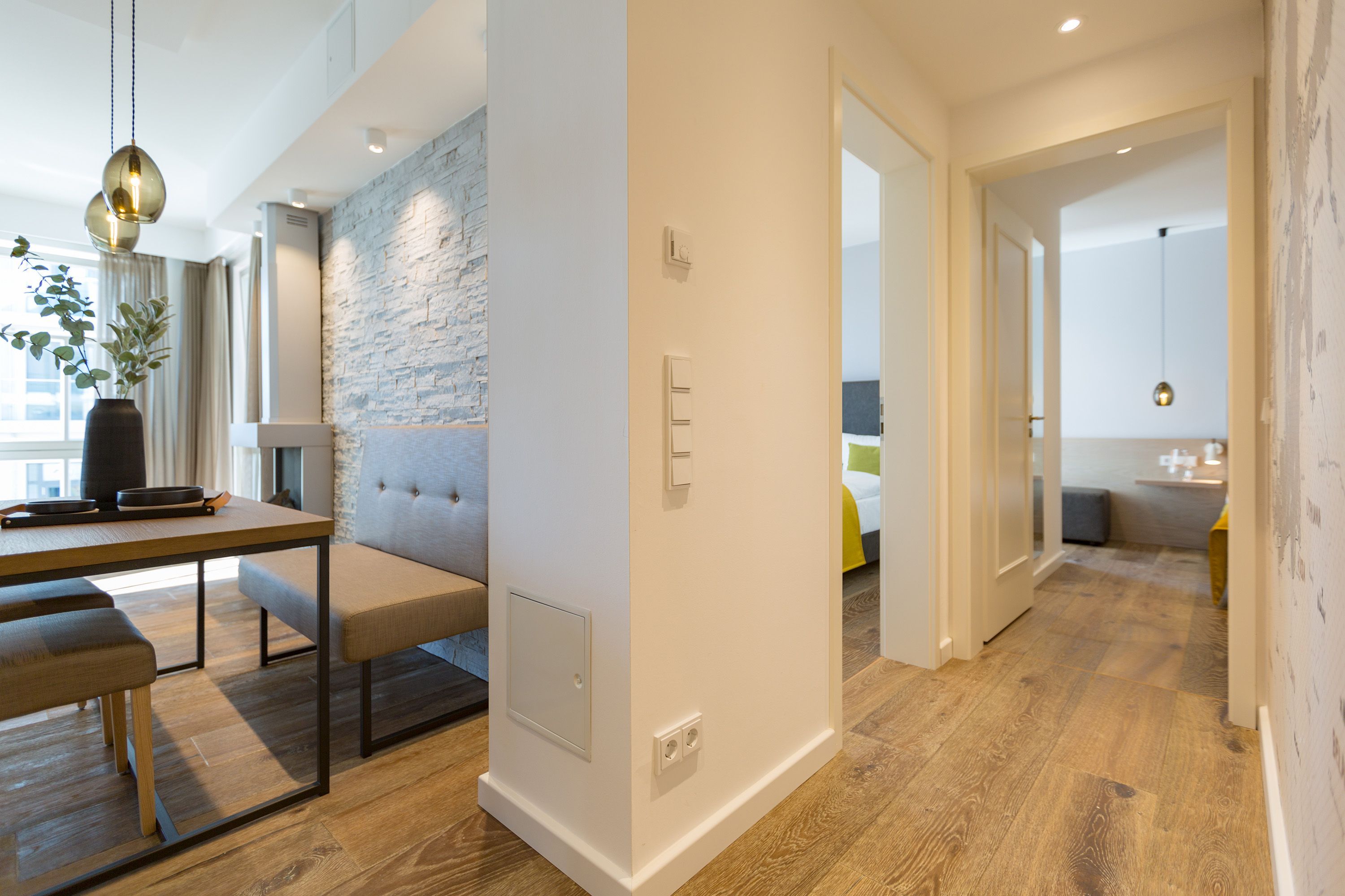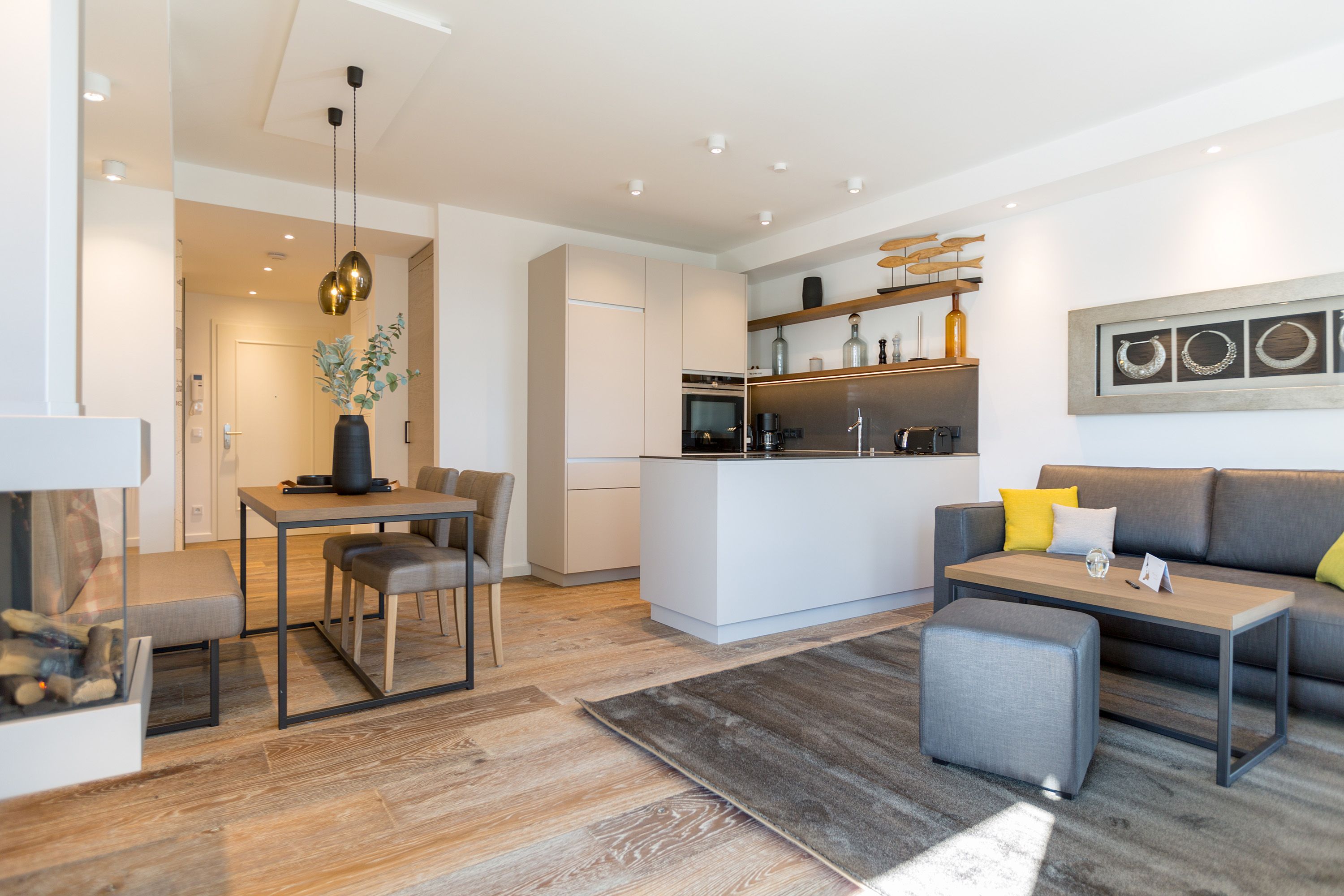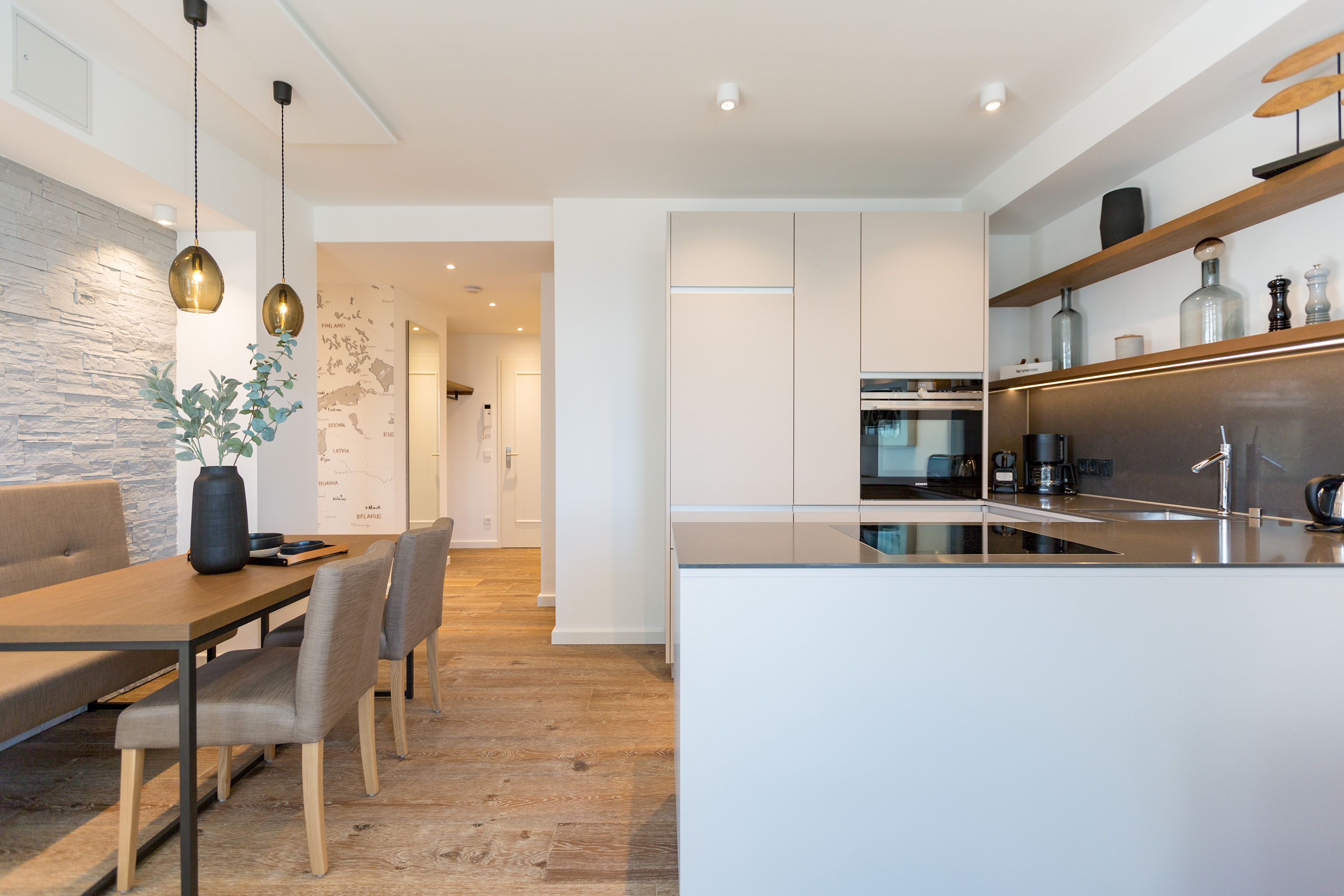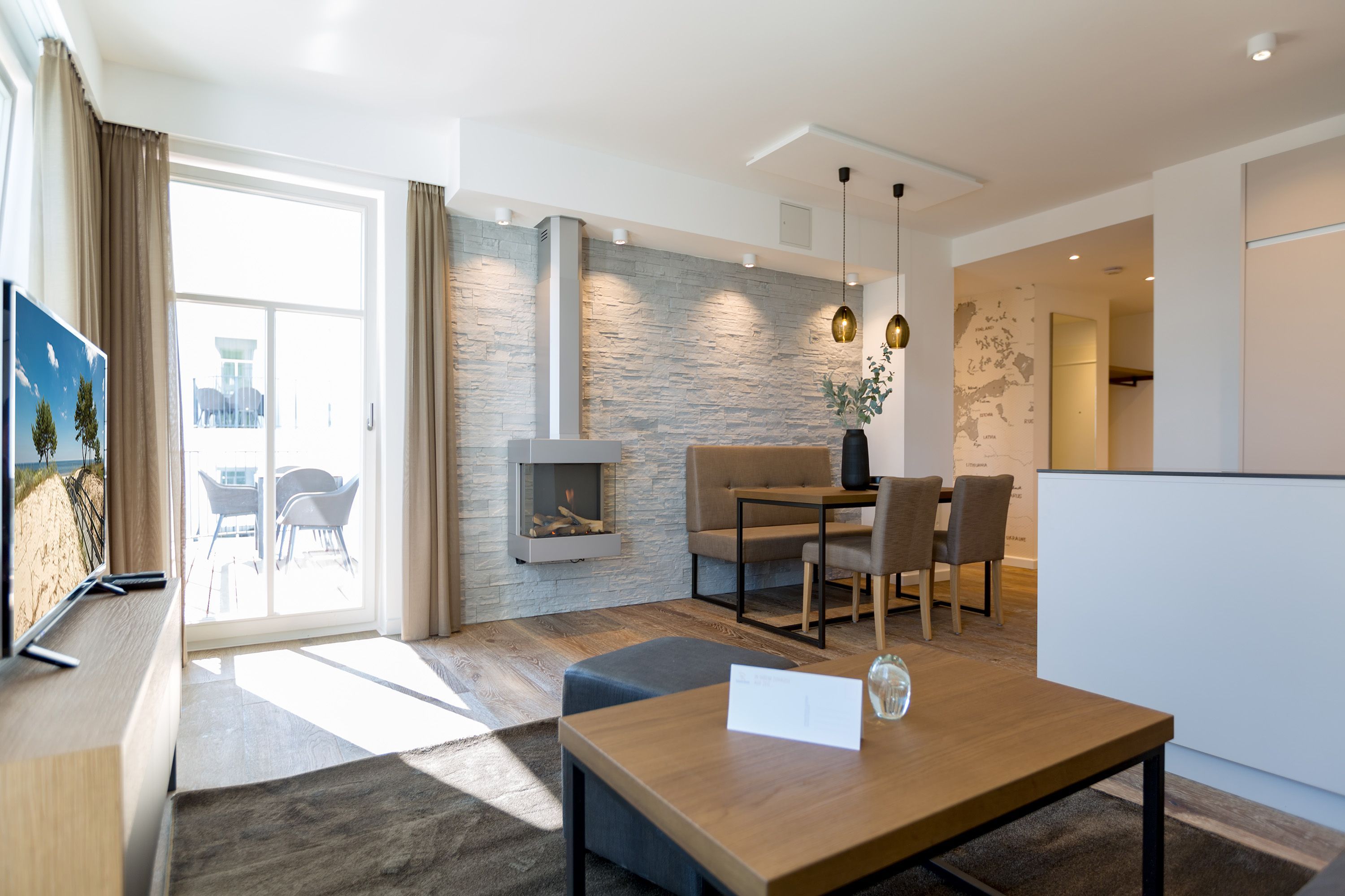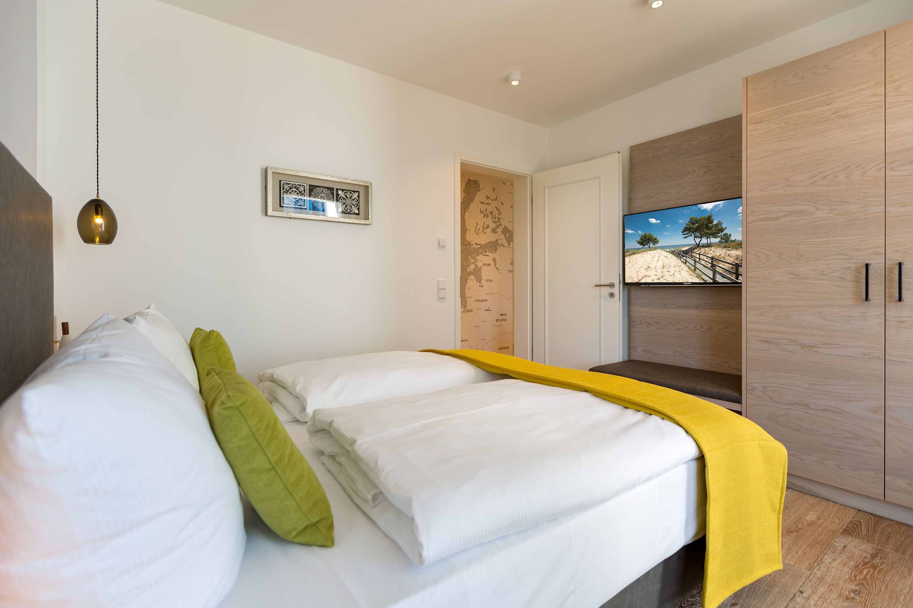 Modern, offen, lichtdurchflutet dieses 66 Quadratmeter große Feriendomizil im 1. Obergeschoss macht Ihren Urlaub zu einer Ostsee-Auszeit der exklusiven Art. Vier Personen, ein Kleinkind bis drei Jahre (im Kinderreisebett) und der geliebte Vierbeiner werden sich hier so pudelwohl fühlen, dass sie gar nicht wieder nach Hause wollen. Das Drei-Zimmer-Appartement bietet allen Komfort, den man sich nur vorstellen kann. Dazu modernste Technik und ein ausgewählt stylisches Interieur. Das großzügige und offene Wohn-Esszimmer bildet den Mittelpunkt der Wohnung. Bodentiefe Fenster lassen viel Licht ins Innere. Ein wunderschöner Gas-Kamin sorgt für Behaglichkeit. Ebenso die harmonisch aufeinander abgestimmten Naturmaterialien Holz und Stein. Und immer im Blick das Wasser der Ostsee. Denn vom Balkon (9 Quadratmeter groß) aus haben Sie seitlichen Meerblick. Dieser ist übrigens von allen drei Zimmern aus begehbar. Im Wohnzimmer wartet eine bequeme Couch nur darauf, dass Sie sich einfach fallen und verwöhnen lassen. Ein großer Flat-TV und eine Hi-Fi-Anlage mit Bluetooth sorgen für qualitativ hochwertige Unterhaltung. Ein schöner Essplatz mit zwei Stühlen und einer Sitzbank lädt zum ausgiebigen Dinieren ein. Das Essen können Sie in der vollausgestatteten und in den Wohnraum integrierten Küche zubereiten. Die freistehende Kochinsel eignet sich ideal als Raumteiler. In den Schränken finden Sie ausgewähltes Design-Geschirr. Etwas, was man vor allem im Urlaub sich sehnlichst wünscht, ist ein erholsamer Schlaf. In den bequemen Boxspringdoppelbetten (1,60 m x 2,00 m) werden diese Träume in den beiden Schlafzimmern Realität. Das angenehme Farbkonzept und die anheimelnde Atmosphäre der Einrichtung machen es Ihnen leicht. Das Appartement verfügt über zwei Bäder. Bad Nummer 1 ist nur über eines der beiden Schlafzimmer zugänglich. Beide Bäder jedoch sind mit einer ebenerdigen und großen Regendusche, einem Waschtisch und einem WC ausgestattet. Ein absolutes Highlight erwartet Sie zudem im 2. Bad: Eine Finnische Sauna. Was gibt es Schöneres, als einen entspannten Urlaubstag mit einem noch entspannenderem Saunagang abzuschließen? Handtücher finden Sie natürlich vor Ort. Ebenso sind die Betten bei Ihrer Anreise bereits bezogen. Wenn Sie ins Internet gehen wollen, können Sie das über das kostenfreie WLAN tun. In der Wohnung gibt es einen kleinen Hauswirtschaftsraum, in dem ein Waschtrockner steht. In der modernen Tiefgarage ist für Sie der Stellplatz Nr. 3 im Doppelparker oben (max. Höhe 1,90m, max. Länge 5,10 m, max. Breite 2,50 m, max. Last 2.600 kg) reserviert.