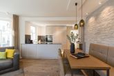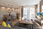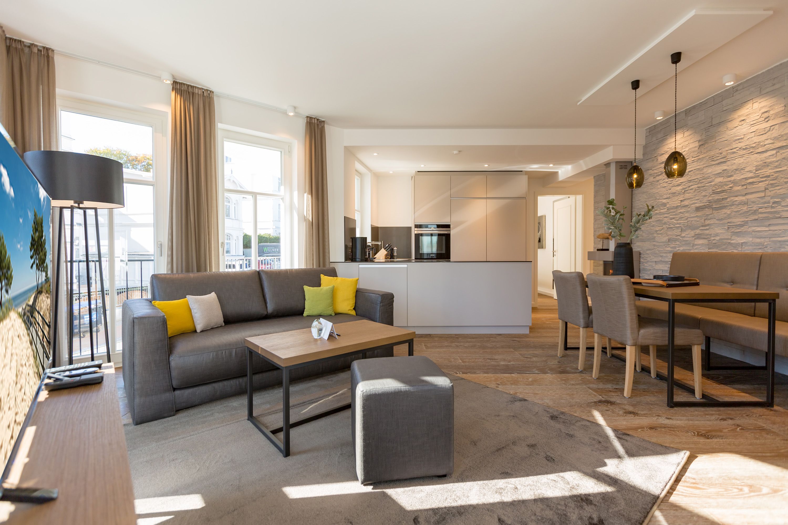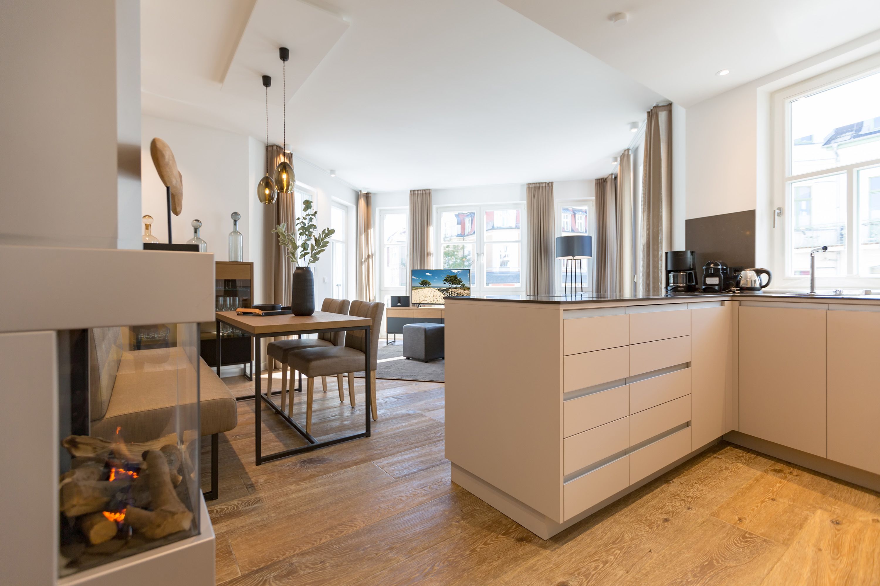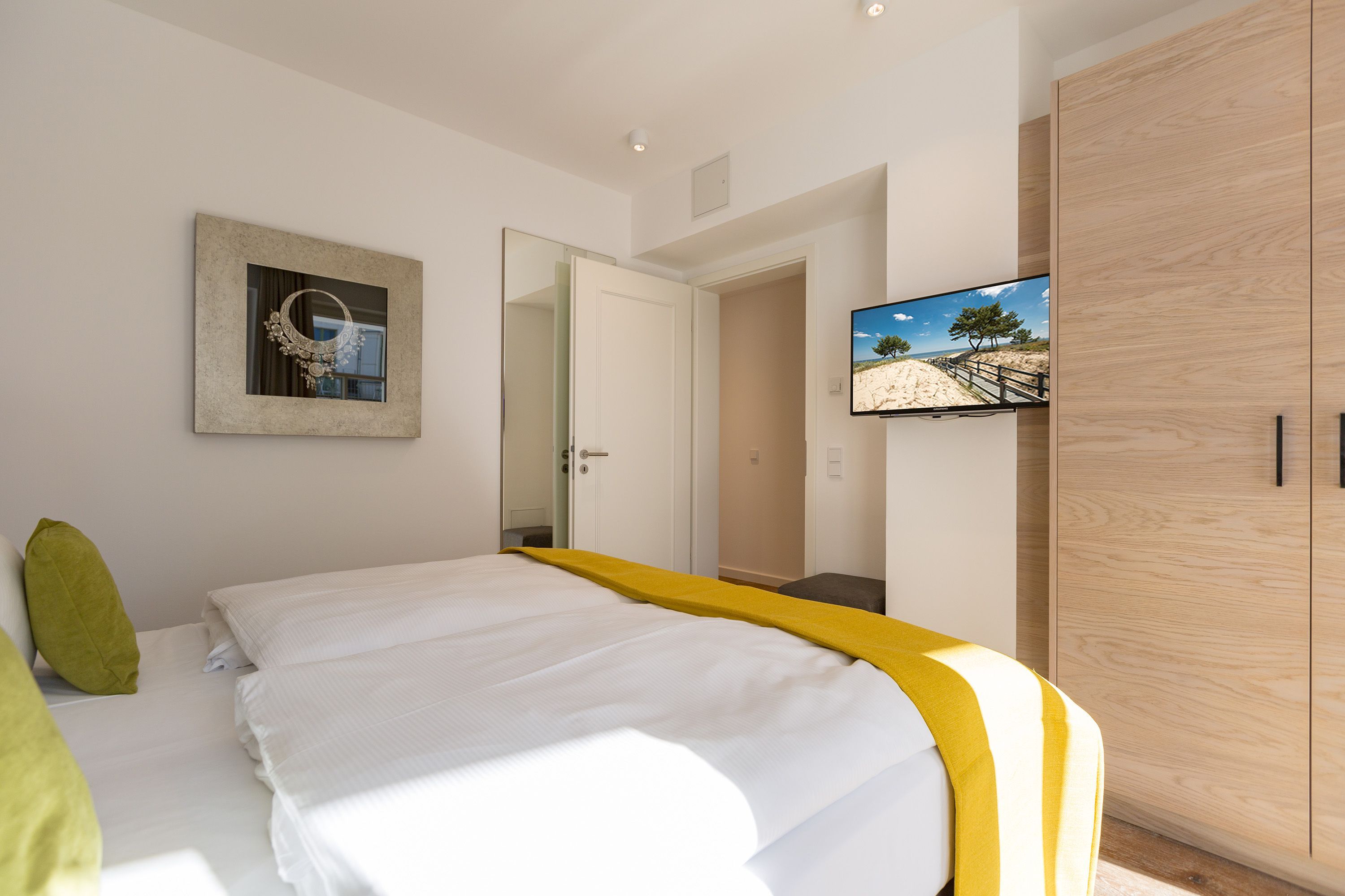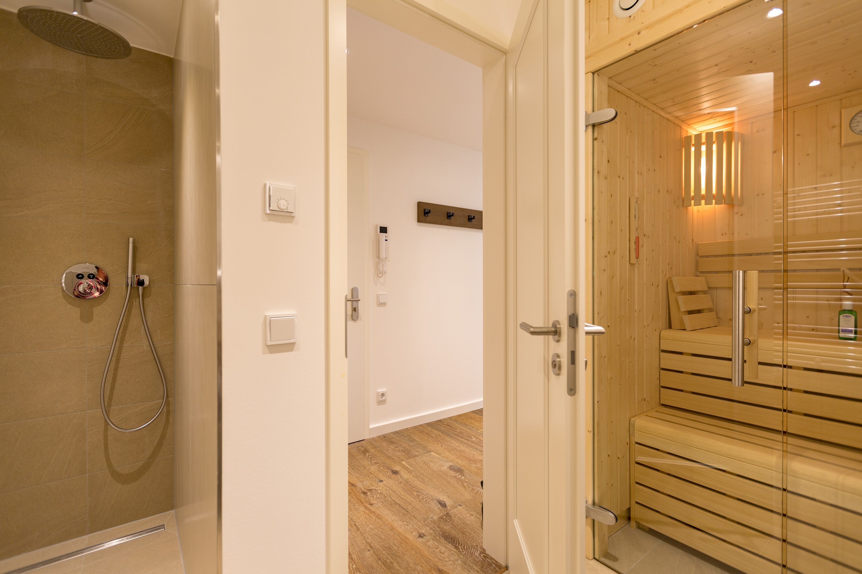 Zwei Balkone, zwei Schlafzimmer, zwei Bäder und ein großzügiges Wohnzimmer Schon beim Eintreten sagt die Seele: Hier will ich verweilen und zur Ruhe kommen. In diesem modernen und wunderschön eingerichteten Drei-Zimmer-Appartement in der 1. Etage empfängt Sie auf 69 Quadratmetern ein echtes Wohlfühlreich. Mitten im Herzen des quirligen Seebades mit Blick auf die alten Bädervillen der berühmten Bansiner Bergstraße und die Einkaufsstraße können Sie hier mit bis zu vier Personen, einem Kleinkind (bis drei Jahre im Kinderreisebett) und Ihrem Hund urlauben, entspannen und die Ostsee genießen. Die liegt nämlich direkt vor der Haustür. Treten Sie hinaus auf einen der beiden Balkone (8 und 9 Quadratmeter groß) und lauschen Sie dem Rauschen der Wellen, während Ihnen die Morgensonne oder die Nachmittagssonne wärmend ins Gesicht scheint. Vom Wohnzimmer aus haben Sie zu beiden Balkonen Zugang. Bodentiefe Fenster verleihen den Räumen eine lichte Leichtigkeit. Lassen Sie sich auf das gemütliche Sofa fallen oder plauschen Sie bei einem leckeren Essen am schönen Esstisch mit den bequemen Stühlen und der Sitzbank. Ein gläserner Gas-Kamin sorgt für wohlige Wärme und eine romantische Stimmung an ungemütlichen Tagen und Abenden. Gibt es etwas Entspannenderes als dem Spiel der Flammen zuzuschauen und sich dabei so richtig schön einzukuscheln? Mit dem großen Flat-TV und der Hifi-Anlage mit Bluetooth-Funktion können Sie das Wohnzimmer in ein Kino verwandeln. High-End finden Sie auch in der offenen Wohnküche. Sie ist mit hochwertigen Markengeräten wie Geschirrspüler oder Mikrowelle und edlem Geschirr voll ausgestattet. Schließlich soll es Ihnen an nichts fehlen. In den beiden Schlafzimmern erwartet Sie Schlafvergnügen vom Feinsten. In den Boxspringdoppelbetten (1,60 m x 2,00 m und 1,80 m x 2,00 m) werden Sie schlafen wie auf Wolken. Jedes der beiden Schlafzimmer verfügt außerdem über einen Flat-TV, einen geräumigen Schrank und einen Zugang zu einem Balkon. Vom Süd-Ost-Balkon aus haben Sie sogar Blick aufs Meer. In diesem Feriendomizil gibt es alles in doppelter Ausführung so auch das Bad. In beiden Bädern finden Sie eine Regendusche, ein Waschtisch mit beleuchtetem Spiegel und ein WC. Eine kleine Überraschung lädt Sie in einem der beiden Badezimmer noch zu einem zusätzlichen Entspannungserlebnis ein: eine eigene Finnische Sauna, die Sie kostenfrei nutzen können. Kostenfrei ist übrigens auch das WLAN sowie die Nutzung des Waschtrockners in der Küche. Bei Ihrer Anreise sind die Betten bezogen und Handtücher liegen für Sie bereit. In der modernen Tiefgarage ist für Sie der Stellplatz Nr. 5 im Doppelparker oben (max. Höhe 2,00 m, max. Länge 5,10 m, max. Breite 2,50 m, max. Last 2.600 kg) reserviert.