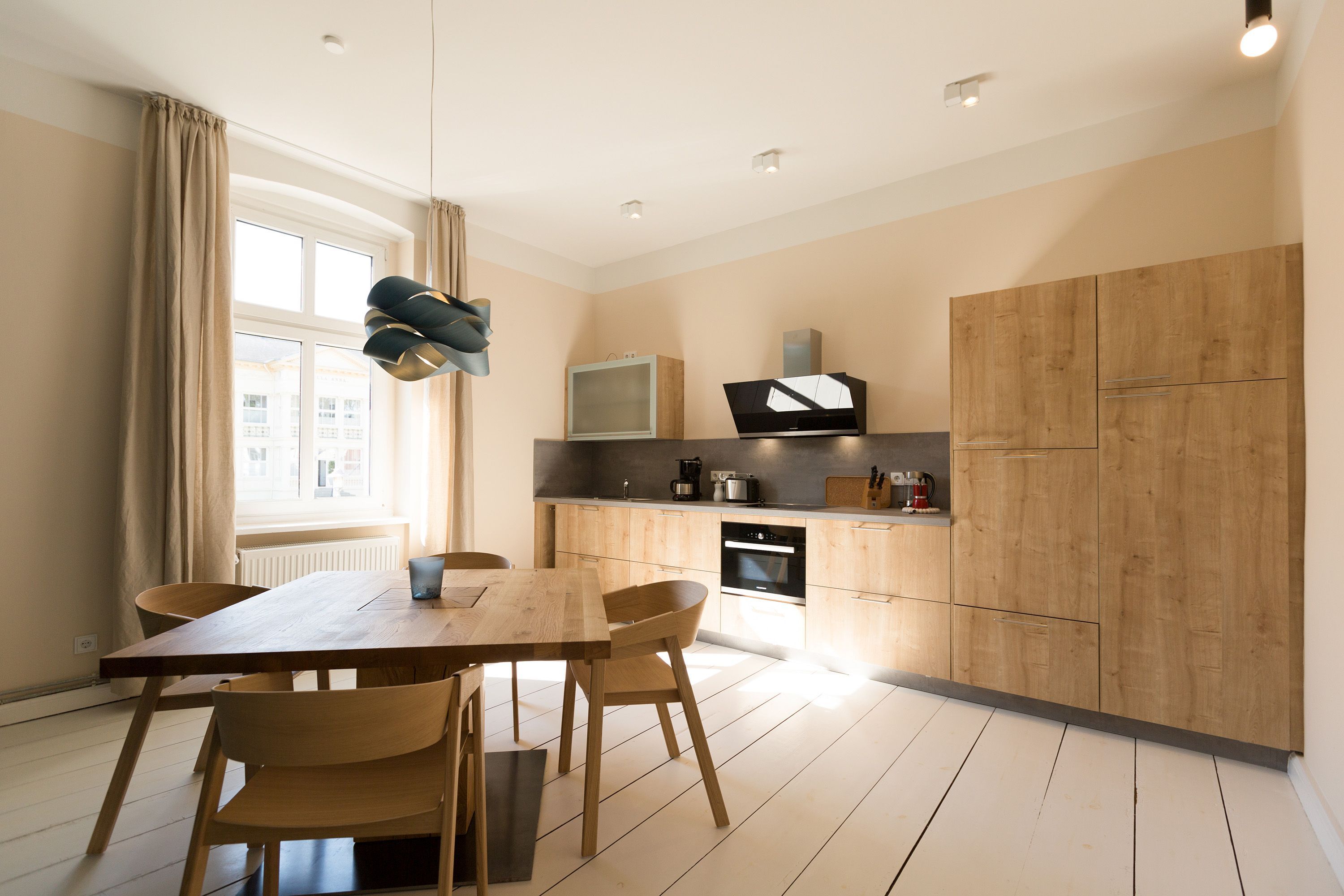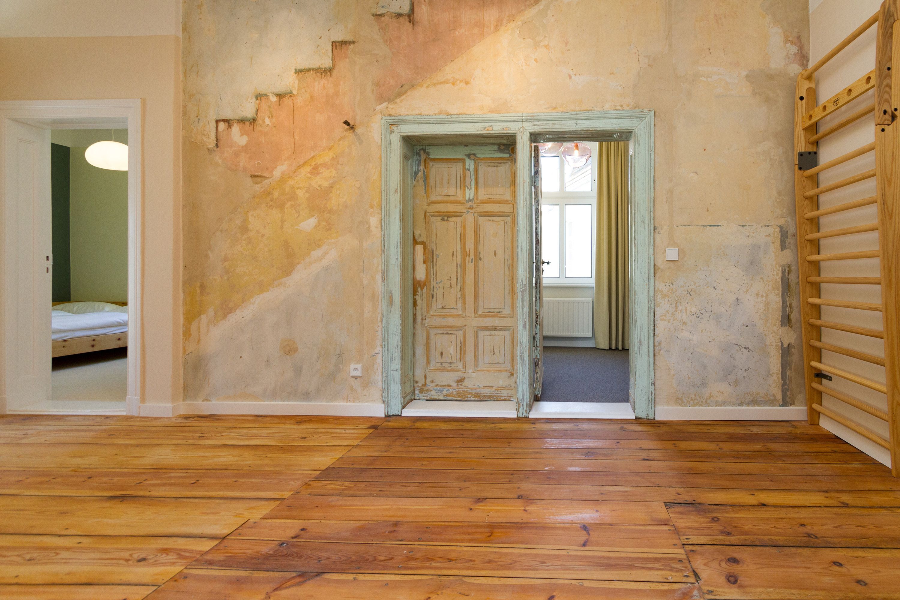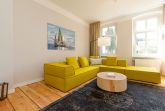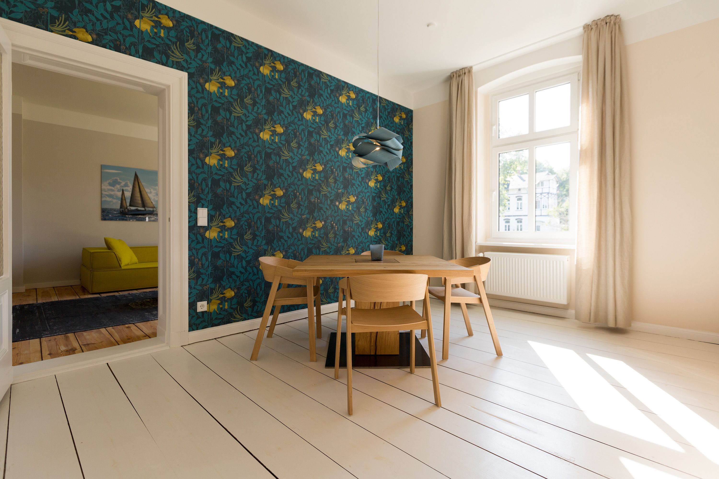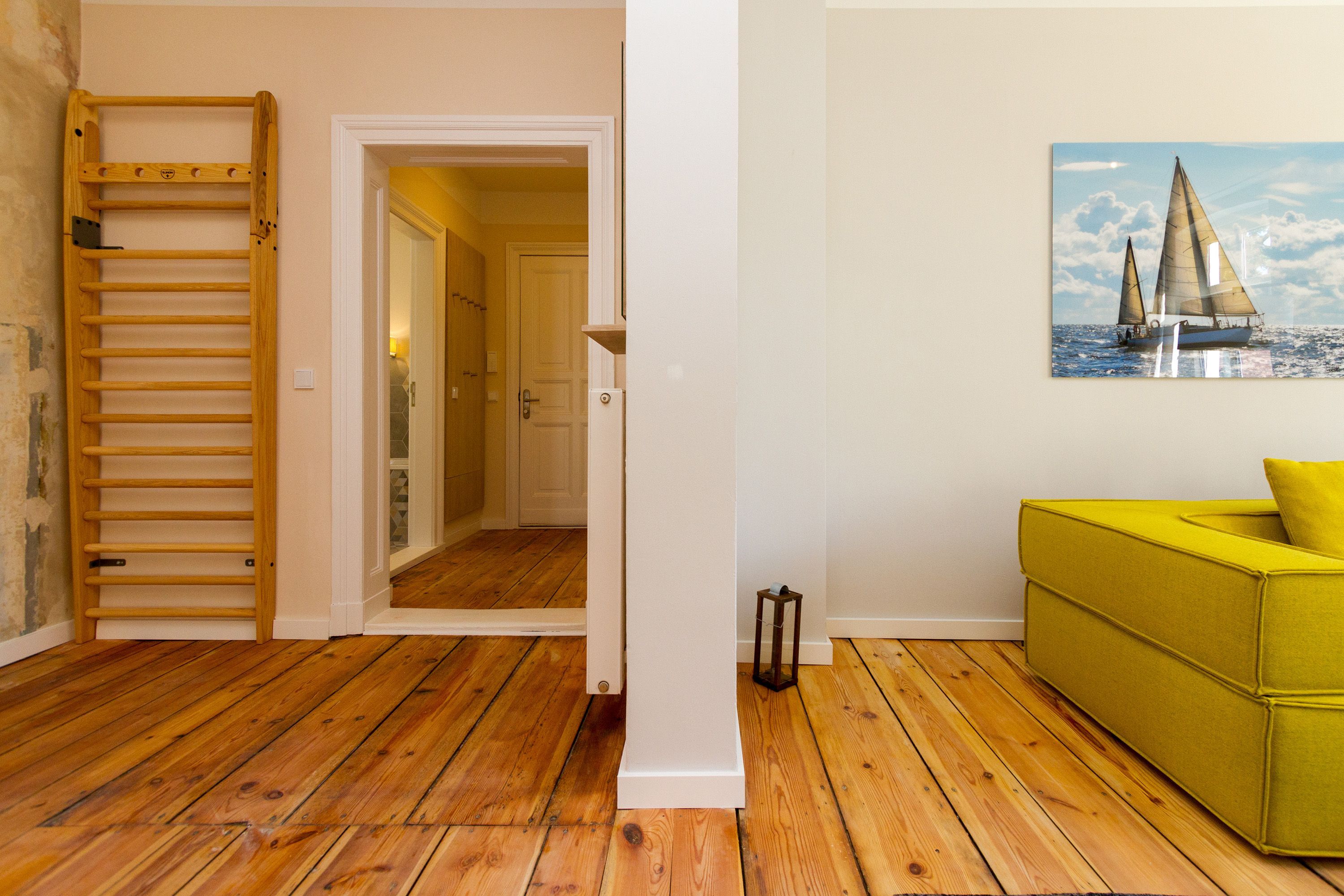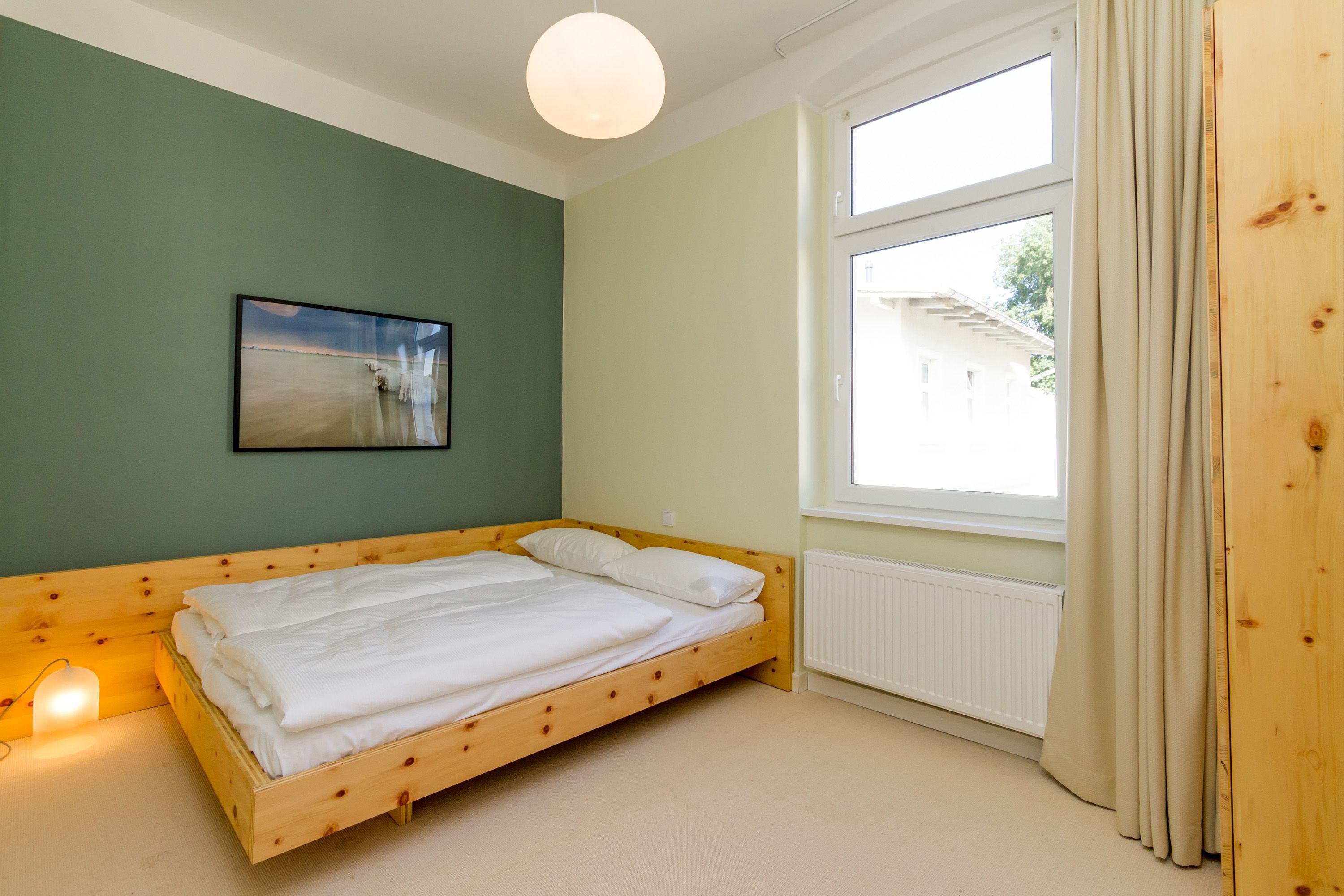 Urlauben 2.0 – In der Wohnung 03 ist außergewöhnliches und extravagantes Wohndesign Standard. Der Wohntraum ist eine gelungene Vereinigung von alter Bäderarchitektur und modernstem, vor allem ökologisch wertvollem Design. Auf den 93 Quadratmetern im ersten Obergeschoss können sich vier Erwachsene und ein Kind (im Kinderreisebett) im wahrsten Sinne austoben. Denn im großzügigen Entree des Appartements verführen die Original-Sprossenwand und die Ballettstange nicht nur zum Aufhängen der Kleidung. Bei Bewegungslust halten sie, was sie versprechen. Auch eine Yoga-Matte und eine Faszienrolle gehören zur Ausstattung dazu. Ein Hingucker ist die originale Wandgestaltung der alten Kaiserzeitvilla, die ganz bewusst sichtbar belassen wurde und dem Feriendomizil ein exklusives Flair verleiht. Auch die aufgearbeiteten und wiederverwendeten Türen und der rustikale Dielenboden gehören dazu. Die Wohnung trägt das Motto „gesunde Leichtigkeit“ und genau diese ist es, die den Bewohner in den drei luftig hellen Räumen und der separaten Küche umfängt. Die Innenarchitektin von Green Living hat in diesem Paradies dafür gesorgt, dass jeder Raum anders gestaltet ist und dennoch nachhaltigen Luxus bietet. Green Living verwendet nur schadstoffgeprüfte Materialien und Möbel und sorgt so für eine gesunde, unbelastete Raumluft, die auch für Allergiker geeignet ist. Die riesige Wohnlandschaft in sehr modernem senfgelbem Schurwollstoff und der große Flat-TV laden zum ausgiebigen Chillen ein. Ein besonderes Highlight ist der Vintage-Teppich im Wohnzimmer. Die Küche ist vollausgestattet mit hochwertigen Blaupunkt-Küchengeräten, den keramischen Wohnaccessoires von ASA Sellection sowie einem Bialetti-Espressokocher. Der massive Echtholztisch bietet Platz für gutes Essen und gute Gespräche. Die beiden Doppelbetten (1,60 m x 2,00 m) in den Schlafzimmern sind Einzelanfertigungen. Ebenso die großen Kleiderschränke, die reichlich Ablagemöglichkeiten bieten. Jedes Schlafzimmer ist lichtdurchflutet und mit wunderschönen Mosaikfliesen ausgestaltet sind die beiden zur Wohnung gehörenden Bäder. Das Masterbad besitzt eine Badewanne. Darüber hinaus verfügen beide über eine Tropendusche, Waschtisch und Toilette. Für das Rundum-Wohlfühl-Urlaubspaket sind die Betten bereits bezogen und Handtücher liegen bereit. Es gibt einen gekennzeichneten Außenstellplatz.