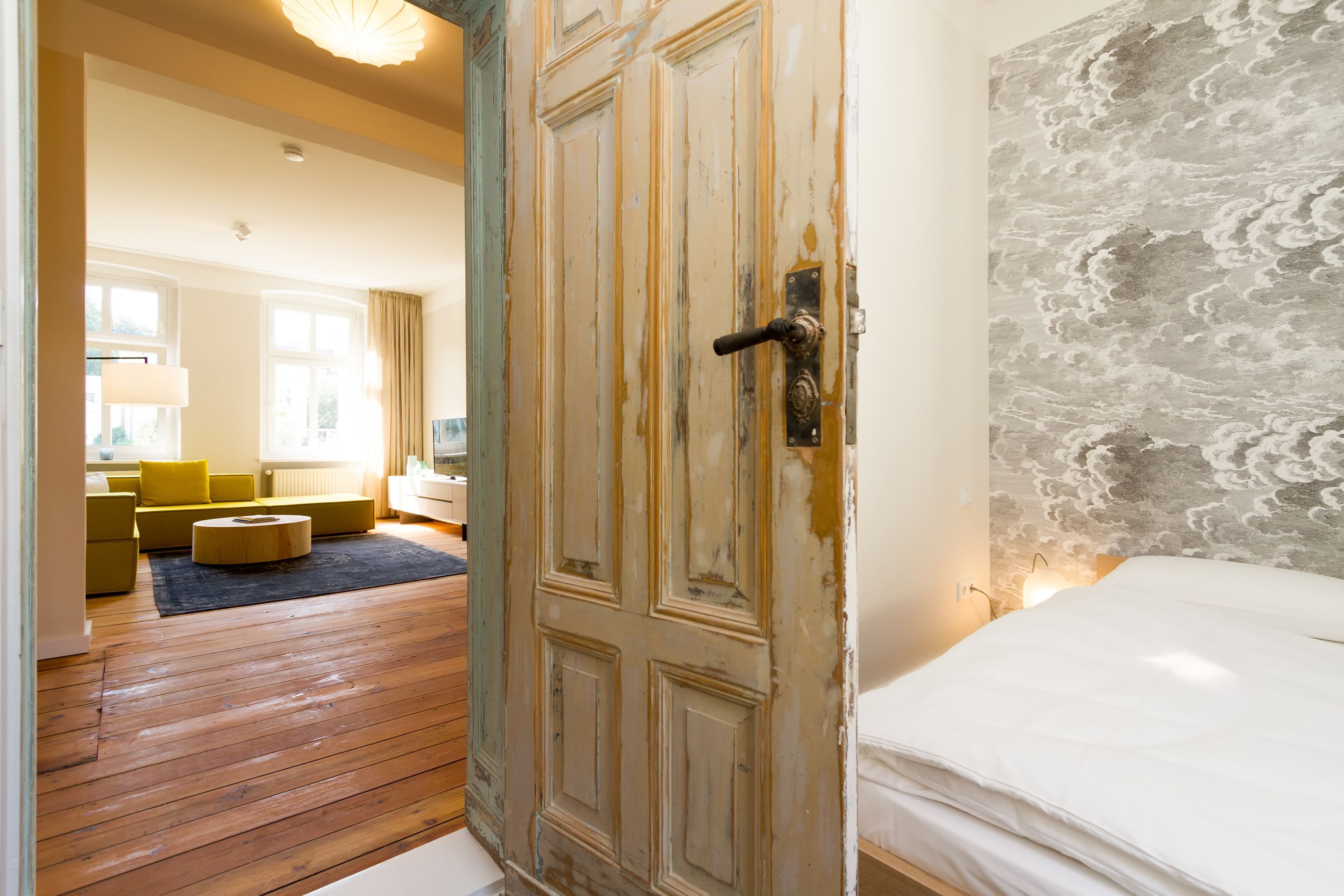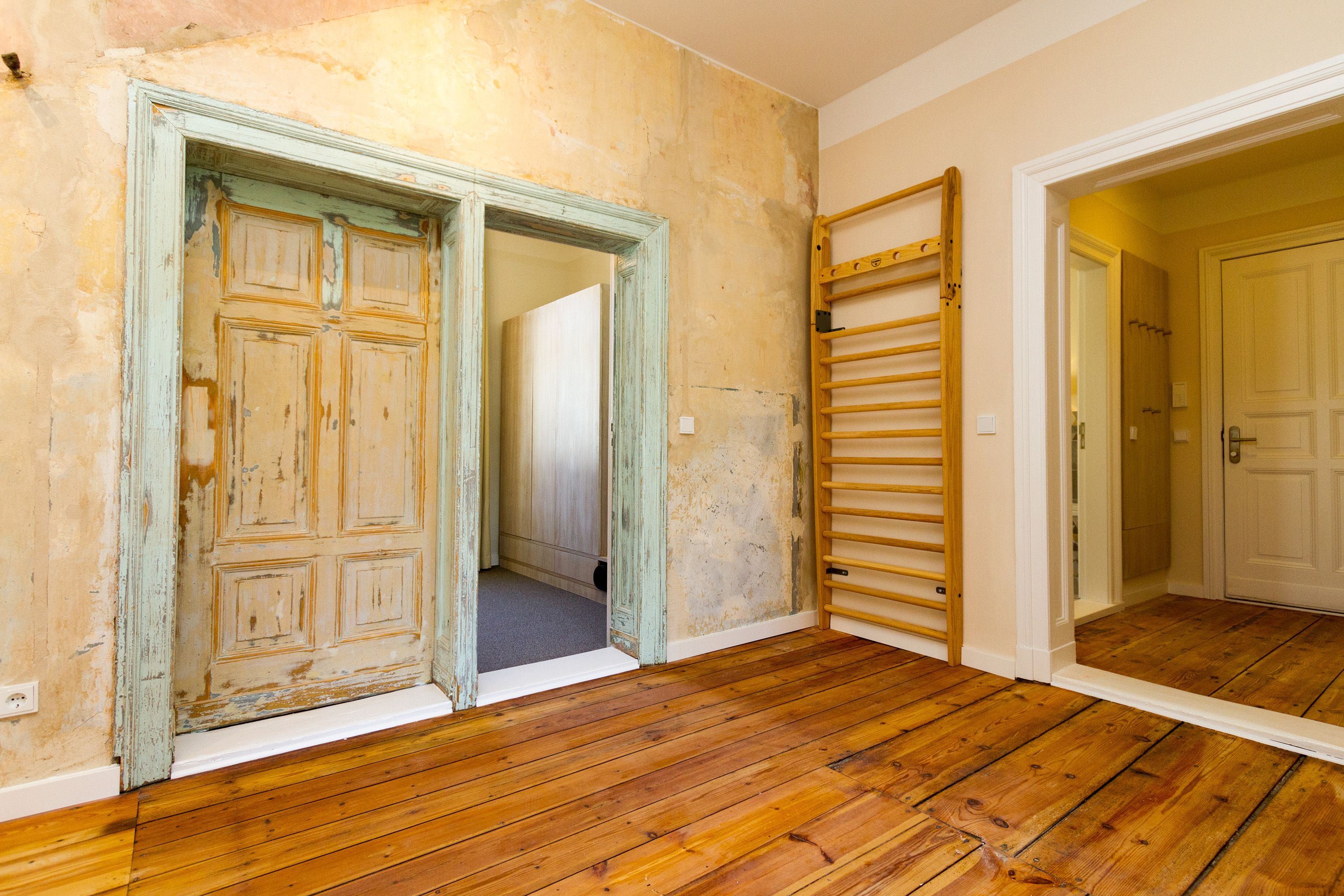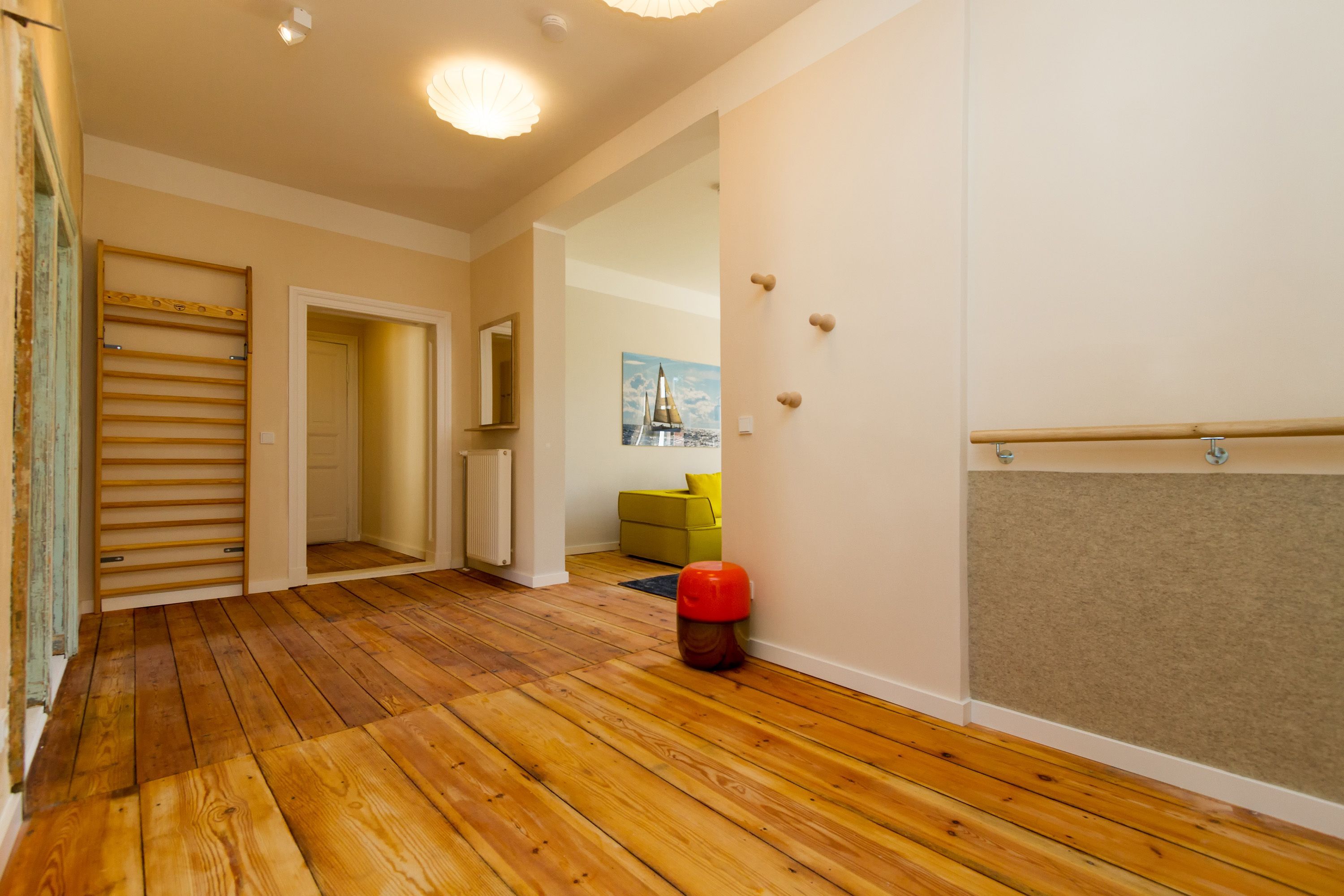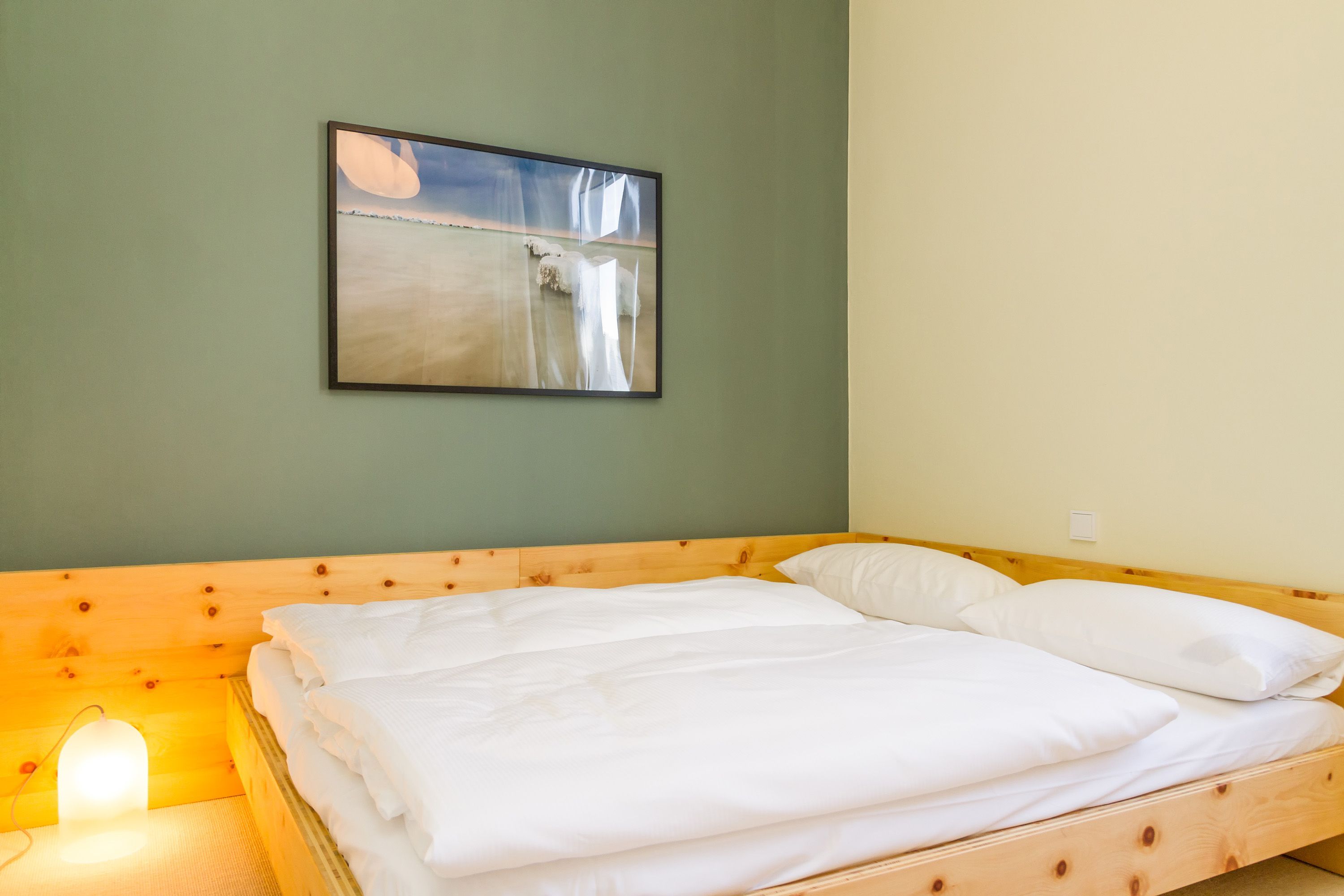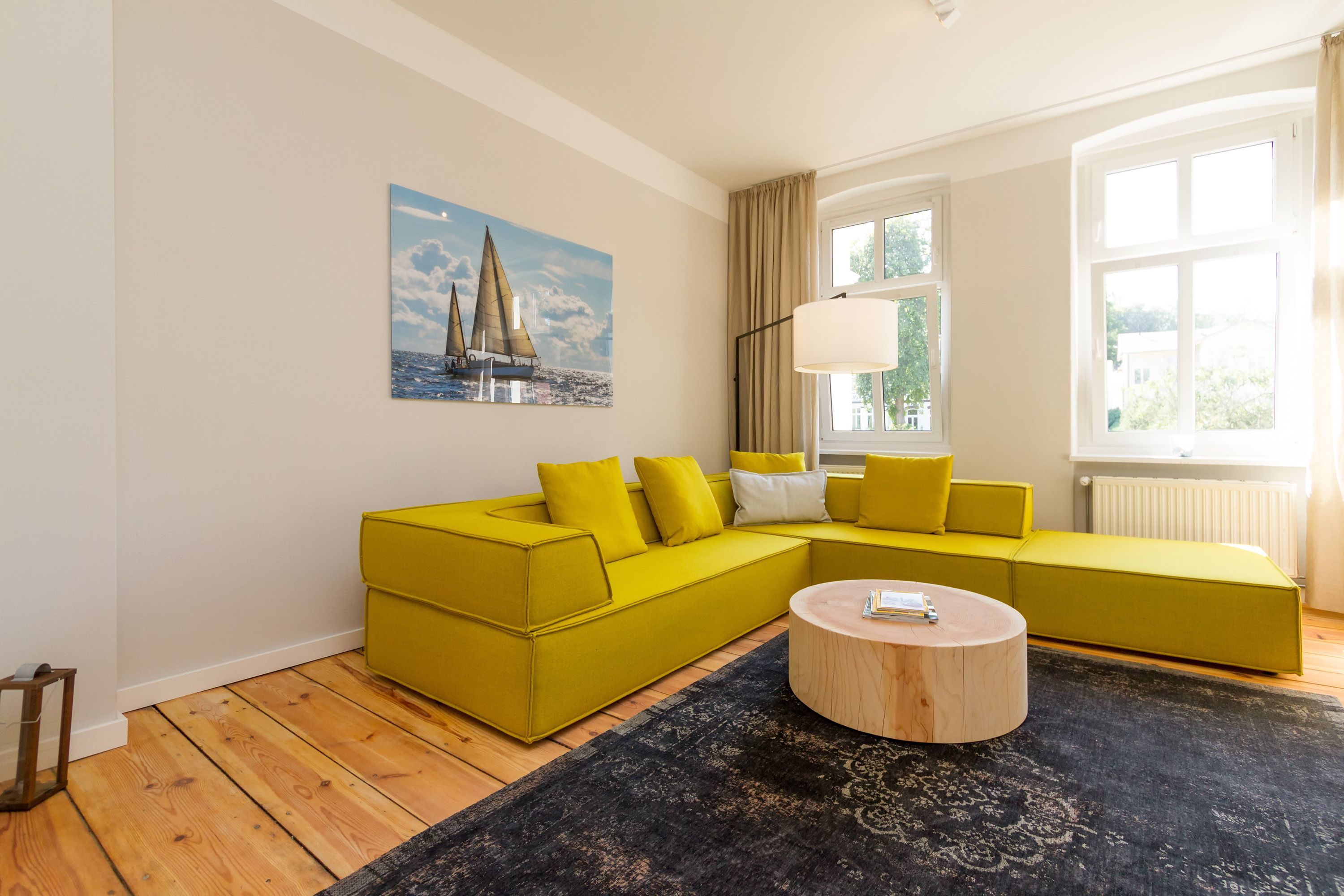 Urlauben 2.0 – In der Wohnung 03 ist außergewöhnliches und extravagantes Wohndesign Standard. Der Wohntraum ist eine gelungene Vereinigung von alter Bäderarchitektur und modernstem, vor allem ökologisch wertvollem Design. Auf den 93 Quadratmetern im ersten Obergeschoss können sich vier Erwachsene und ein Kind (im Kinderreisebett) im wahrsten Sinne austoben. Denn im großzügigen Entree des Appartements verführen die Original-Sprossenwand und die Ballettstange nicht nur zum Aufhängen der Kleidung. Bei Bewegungslust halten sie, was sie versprechen. Auch eine Yoga-Matte und eine Faszienrolle gehören zur Ausstattung dazu. Ein Hingucker ist die originale Wandgestaltung der alten Kaiserzeitvilla, die ganz bewusst sichtbar belassen wurde und dem Feriendomizil ein exklusives Flair verleiht. Auch die aufgearbeiteten und wiederverwendeten Türen und der rustikale Dielenboden gehören dazu. Die Wohnung trägt das Motto „gesunde Leichtigkeit“ und genau diese ist es, die den Bewohner in den drei luftig hellen Räumen und der separaten Küche umfängt. Die Innenarchitektin von Green Living hat in diesem Paradies dafür gesorgt, dass jeder Raum anders gestaltet ist und dennoch nachhaltigen Luxus bietet. Green Living verwendet nur schadstoffgeprüfte Materialien und Möbel und sorgt so für eine gesunde, unbelastete Raumluft, die auch für Allergiker geeignet ist. Die riesige Wohnlandschaft in sehr modernem senfgelbem Schurwollstoff und der große Flat-TV laden zum ausgiebigen Chillen ein. Ein besonderes Highlight ist der Vintage-Teppich im Wohnzimmer. Die Küche ist vollausgestattet mit hochwertigen Blaupunkt-Küchengeräten, den keramischen Wohnaccessoires von ASA Sellection sowie einem Bialetti-Espressokocher. Der massive Echtholztisch bietet Platz für gutes Essen und gute Gespräche. Die beiden Doppelbetten (1,60 m x 2,00 m) in den Schlafzimmern sind Einzelanfertigungen. Ebenso die großen Kleiderschränke, die reichlich Ablagemöglichkeiten bieten. Jedes Schlafzimmer ist lichtdurchflutet und mit wunderschönen Mosaikfliesen ausgestaltet sind die beiden zur Wohnung gehörenden Bäder. Das Masterbad besitzt eine Badewanne. Darüber hinaus verfügen beide über eine Tropendusche, Waschtisch und Toilette. Für das Rundum-Wohlfühl-Urlaubspaket sind die Betten bereits bezogen und Handtücher liegen bereit. Es gibt einen gekennzeichneten Außenstellplatz.