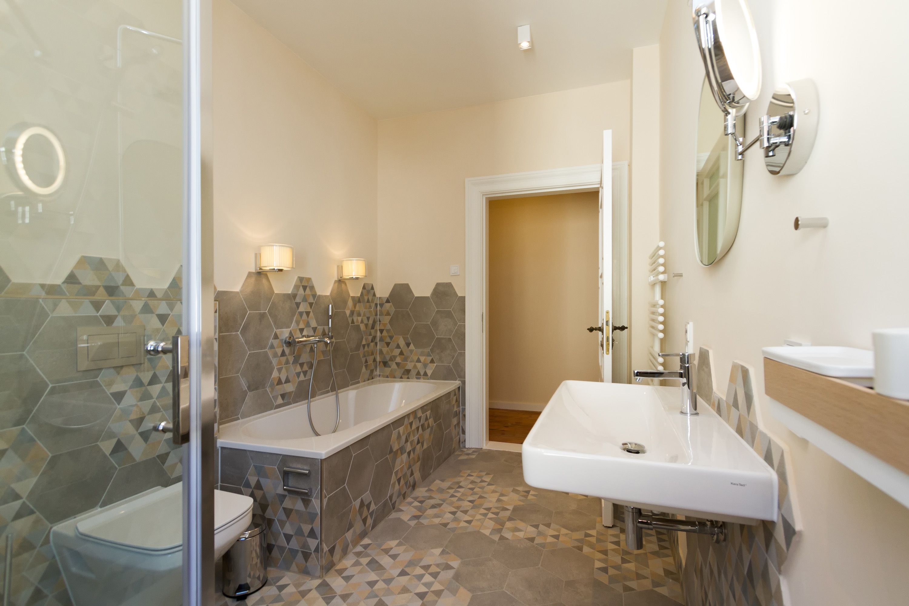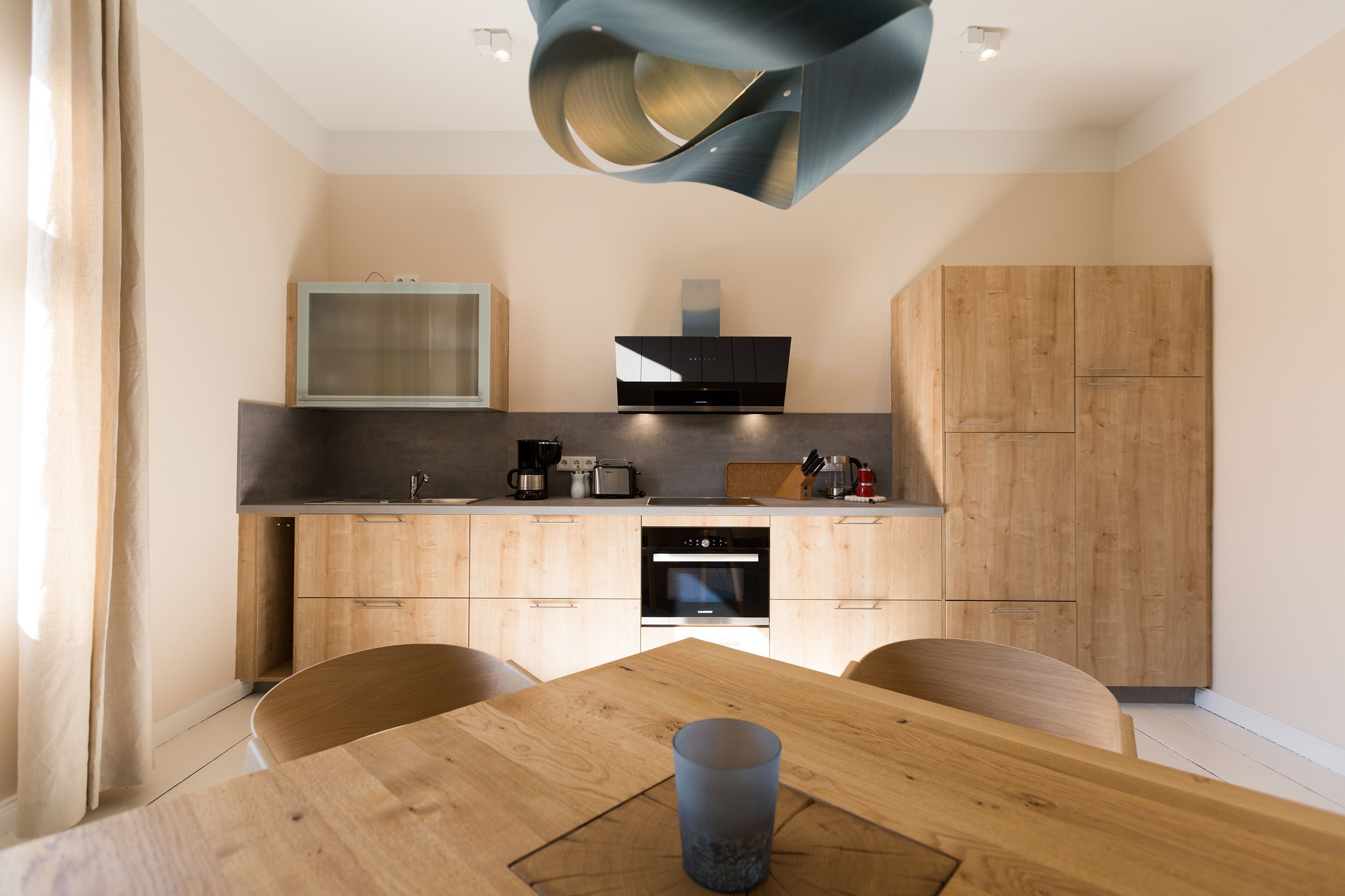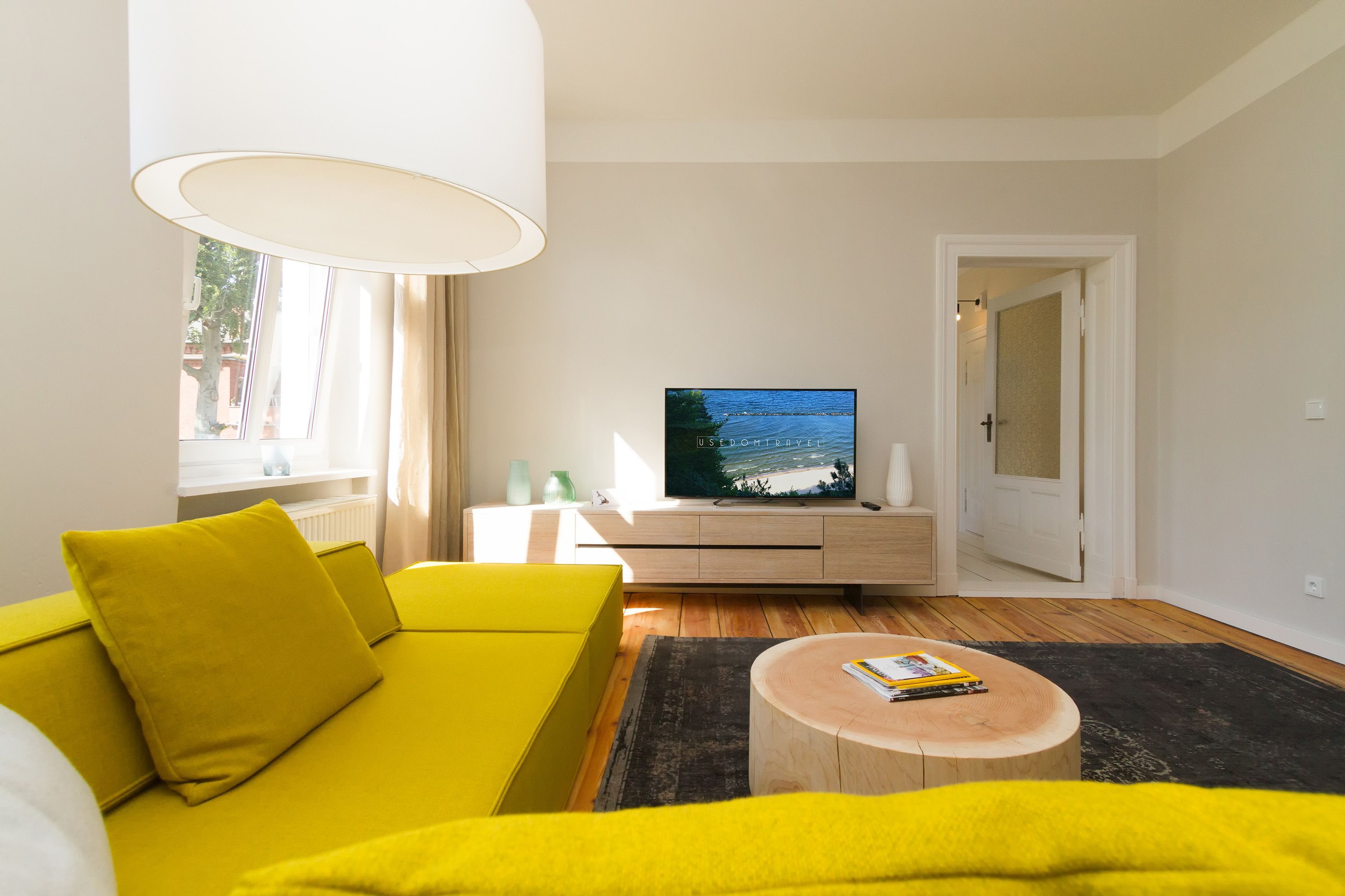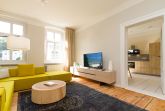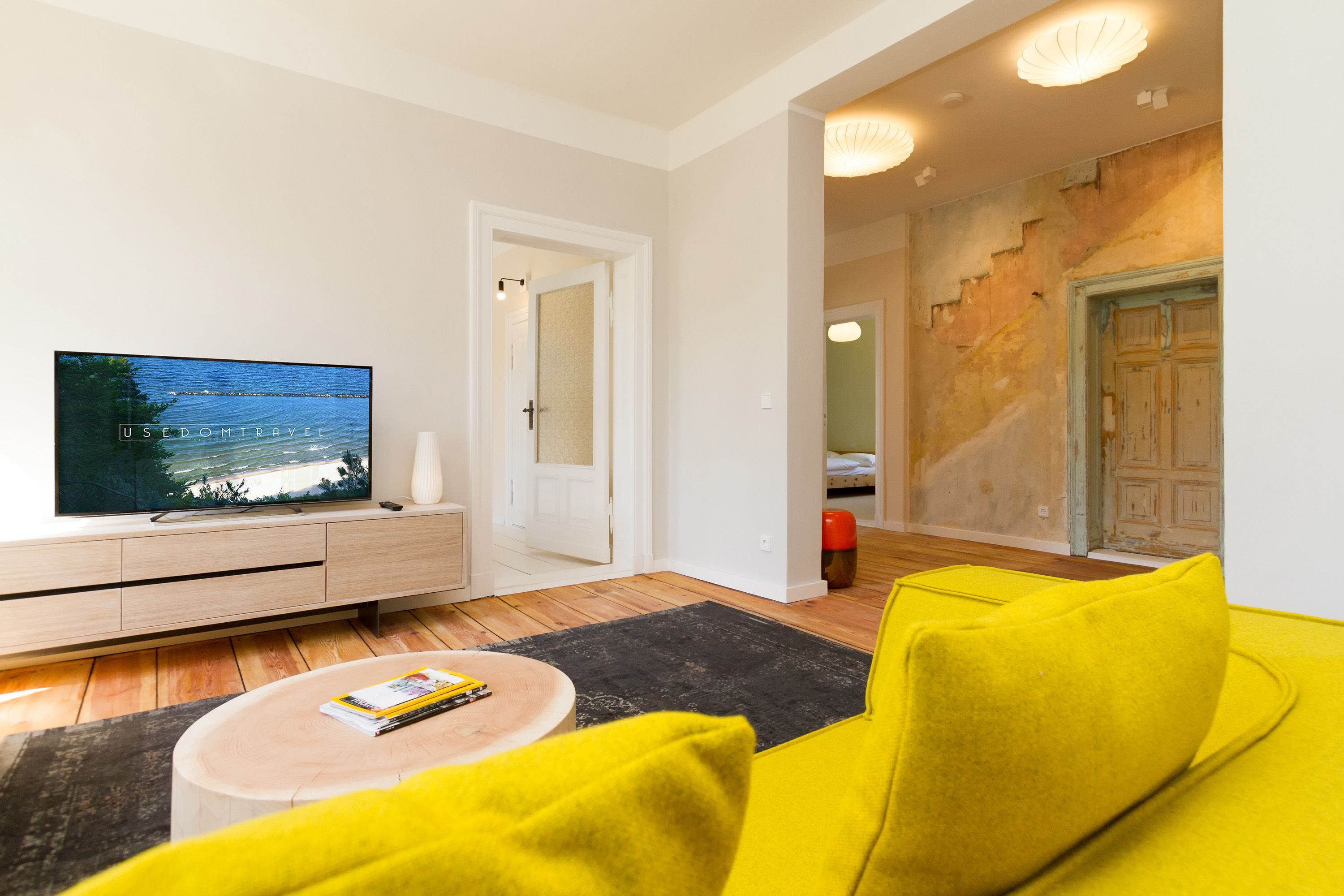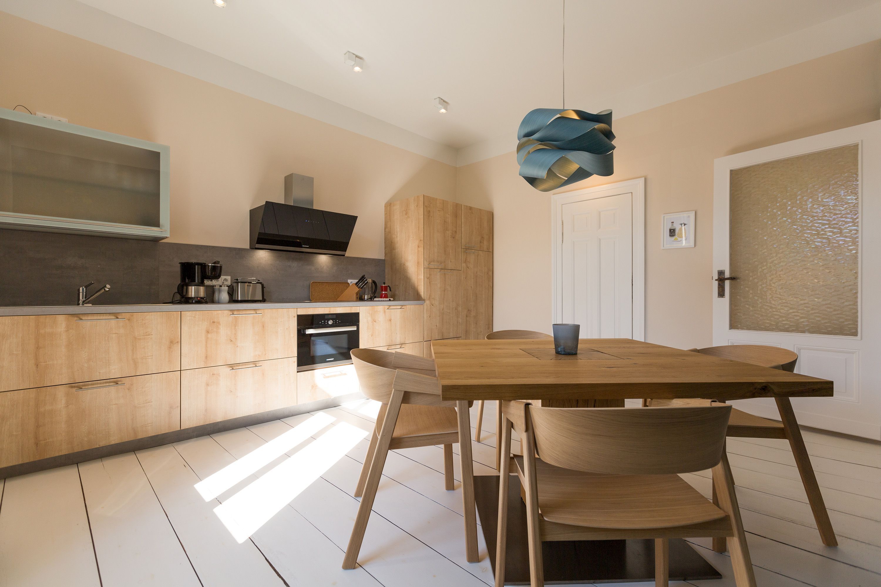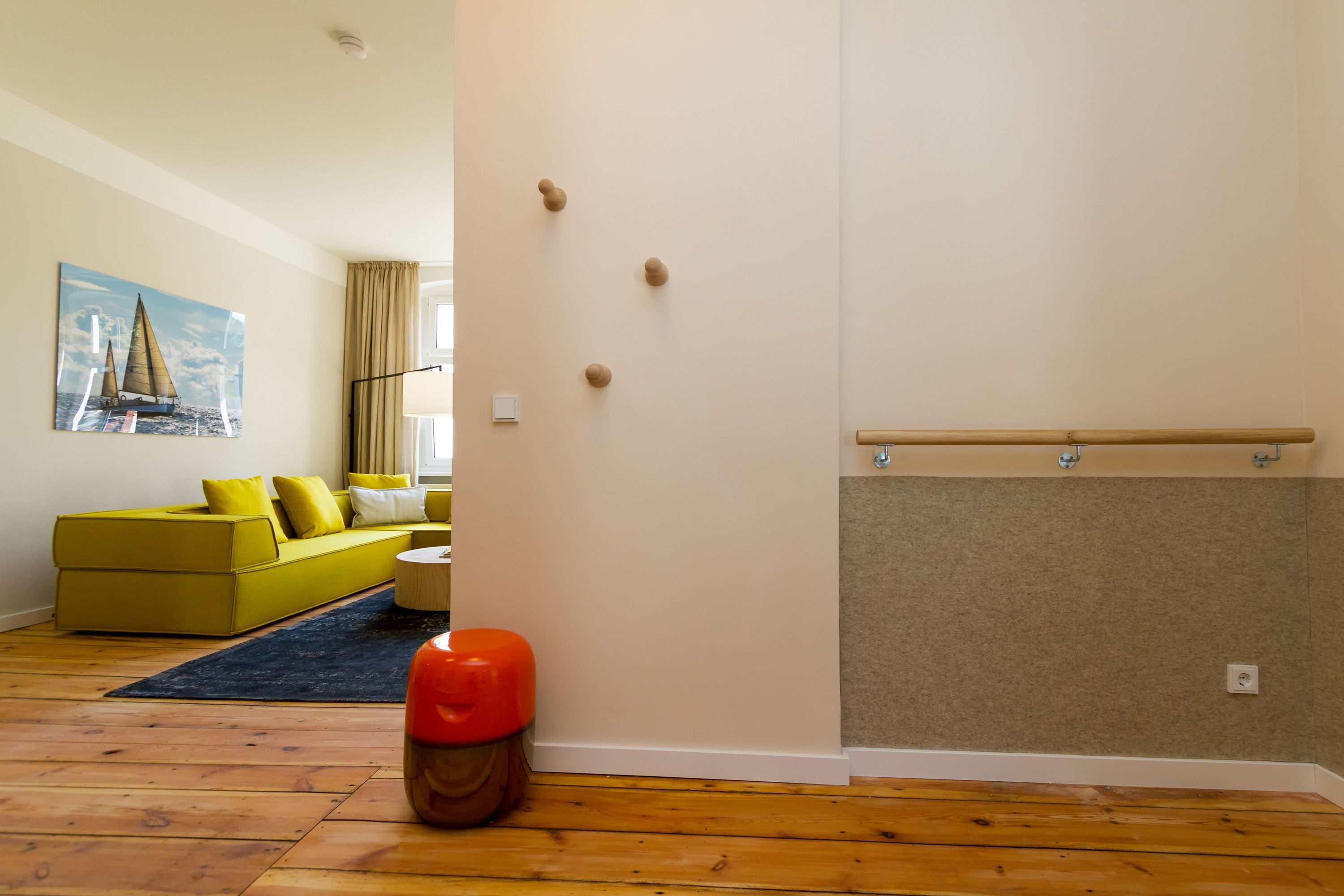 Urlauben 2.0 – In der Wohnung 03 ist außergewöhnliches und extravagantes Wohndesign Standard. Der Wohntraum ist eine gelungene Vereinigung von alter Bäderarchitektur und modernstem, vor allem ökologisch wertvollem Design. Auf den 93 Quadratmetern im ersten Obergeschoss können sich vier Erwachsene und ein Kind (im Kinderreisebett) im wahrsten Sinne austoben. Denn im großzügigen Entree des Appartements verführen die Original-Sprossenwand und die Ballettstange nicht nur zum Aufhängen der Kleidung. Bei Bewegungslust halten sie, was sie versprechen. Auch eine Yoga-Matte und eine Faszienrolle gehören zur Ausstattung dazu. Ein Hingucker ist die originale Wandgestaltung der alten Kaiserzeitvilla, die ganz bewusst sichtbar belassen wurde und dem Feriendomizil ein exklusives Flair verleiht. Auch die aufgearbeiteten und wiederverwendeten Türen und der rustikale Dielenboden gehören dazu. Die Wohnung trägt das Motto „gesunde Leichtigkeit“ und genau diese ist es, die den Bewohner in den drei luftig hellen Räumen und der separaten Küche umfängt. Die Innenarchitektin von Green Living hat in diesem Paradies dafür gesorgt, dass jeder Raum anders gestaltet ist und dennoch nachhaltigen Luxus bietet. Green Living verwendet nur schadstoffgeprüfte Materialien und Möbel und sorgt so für eine gesunde, unbelastete Raumluft, die auch für Allergiker geeignet ist. Die riesige Wohnlandschaft in sehr modernem senfgelbem Schurwollstoff und der große Flat-TV laden zum ausgiebigen Chillen ein. Ein besonderes Highlight ist der Vintage-Teppich im Wohnzimmer. Die Küche ist vollausgestattet mit hochwertigen Blaupunkt-Küchengeräten, den keramischen Wohnaccessoires von ASA Sellection sowie einem Bialetti-Espressokocher. Der massive Echtholztisch bietet Platz für gutes Essen und gute Gespräche. Die beiden Doppelbetten (1,60 m x 2,00 m) in den Schlafzimmern sind Einzelanfertigungen. Ebenso die großen Kleiderschränke, die reichlich Ablagemöglichkeiten bieten. Jedes Schlafzimmer ist lichtdurchflutet und mit wunderschönen Mosaikfliesen ausgestaltet sind die beiden zur Wohnung gehörenden Bäder. Das Masterbad besitzt eine Badewanne. Darüber hinaus verfügen beide über eine Tropendusche, Waschtisch und Toilette. Für das Rundum-Wohlfühl-Urlaubspaket sind die Betten bereits bezogen und Handtücher liegen bereit. Es gibt einen gekennzeichneten Außenstellplatz.