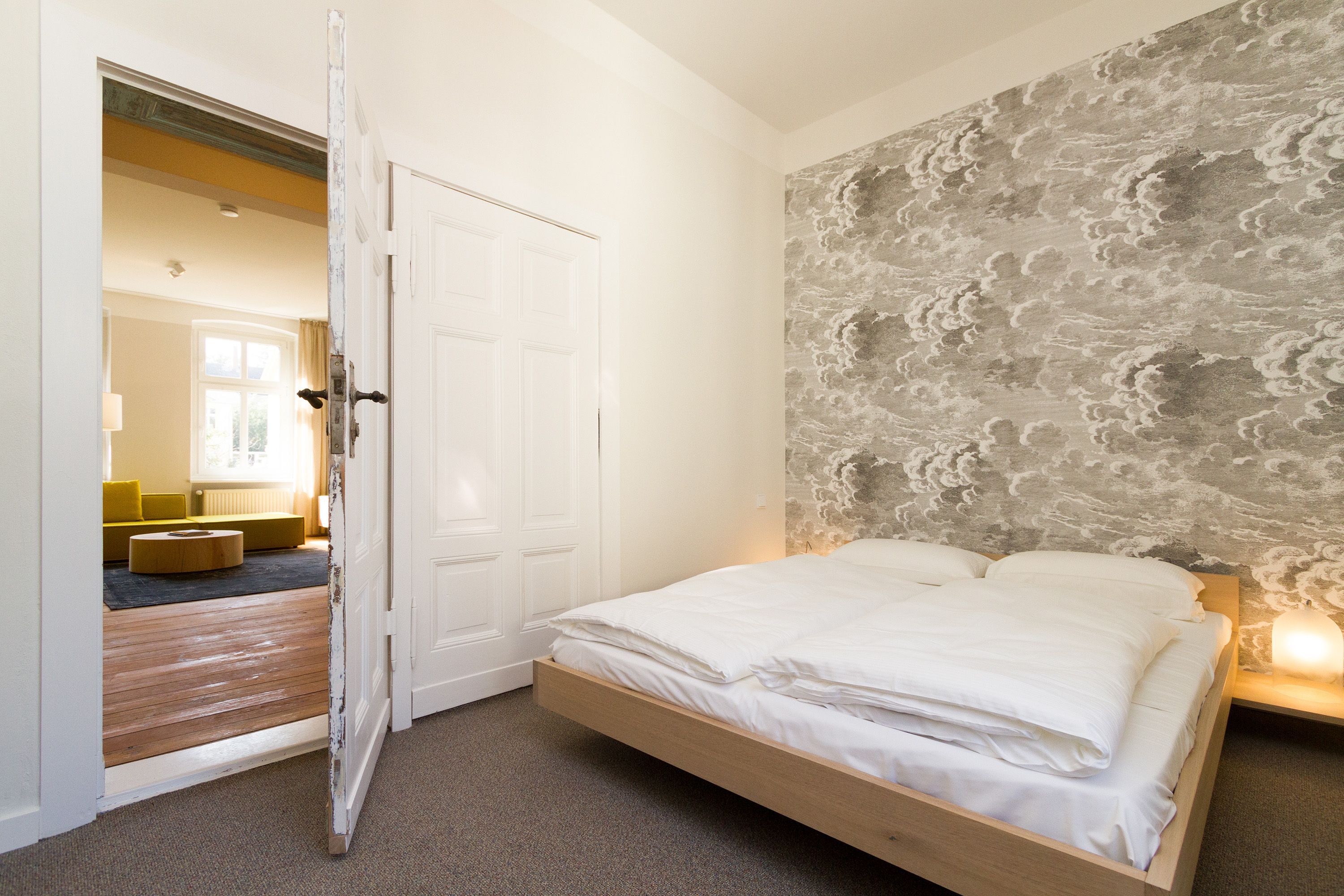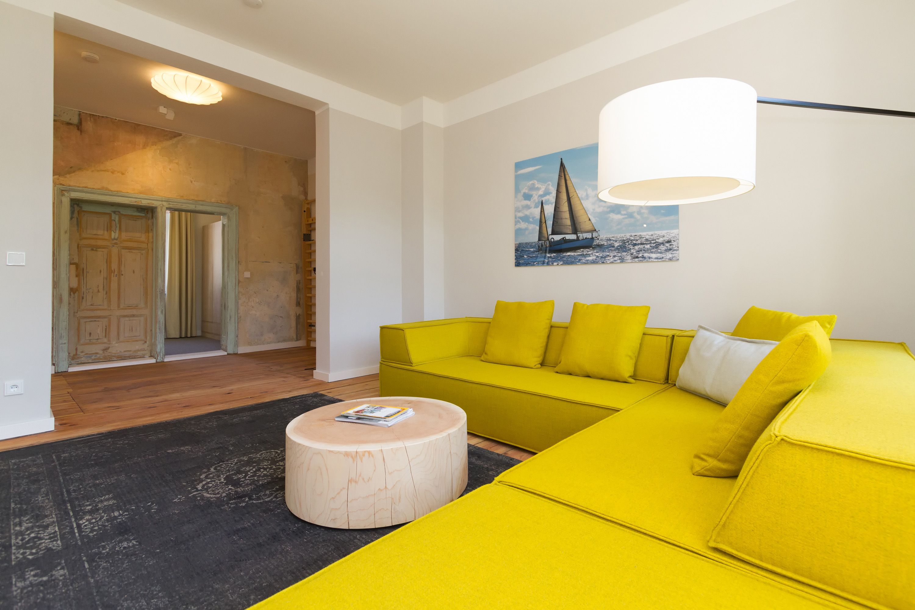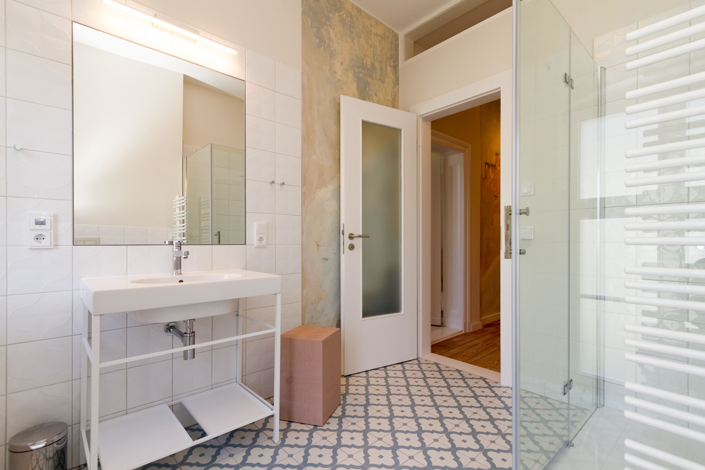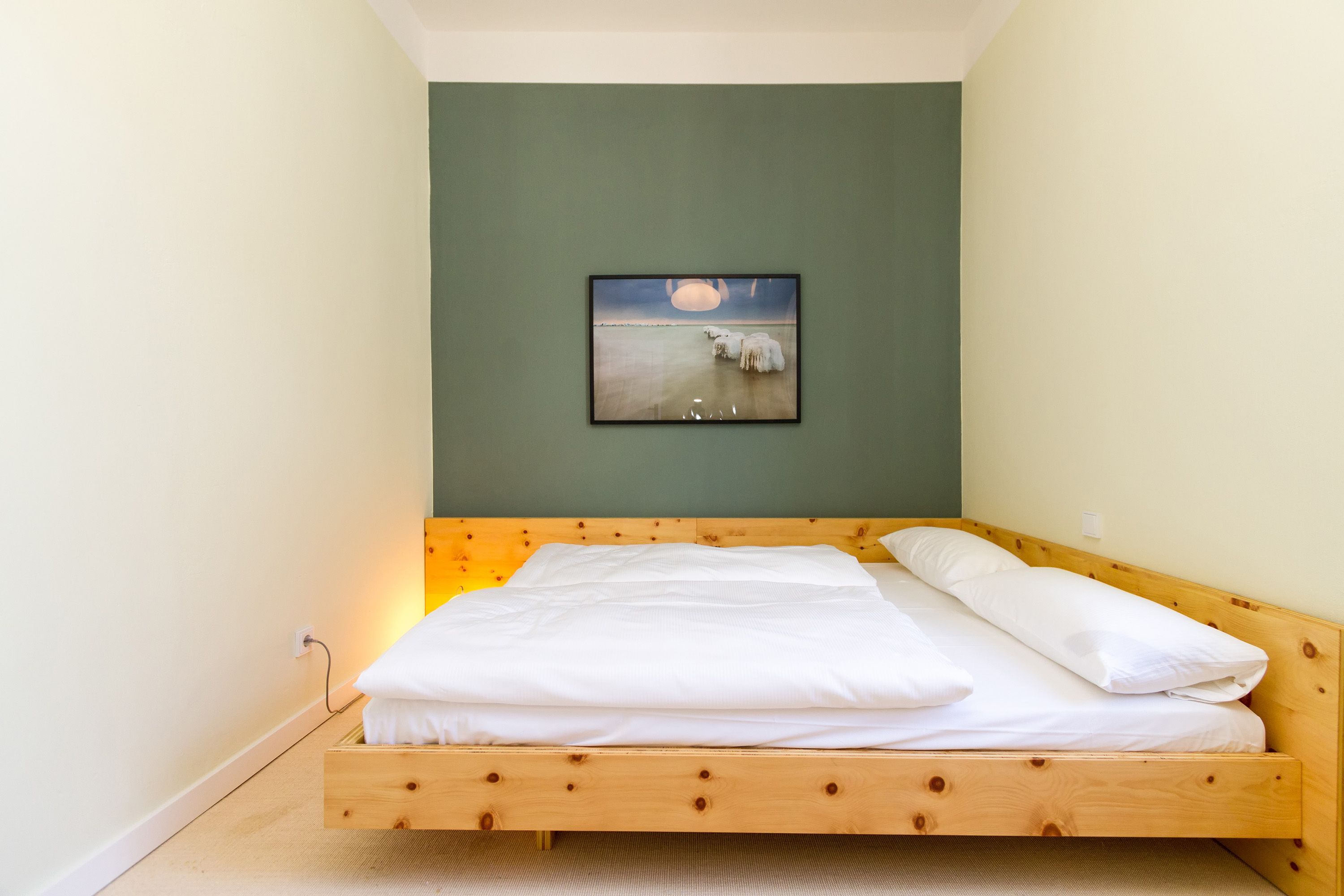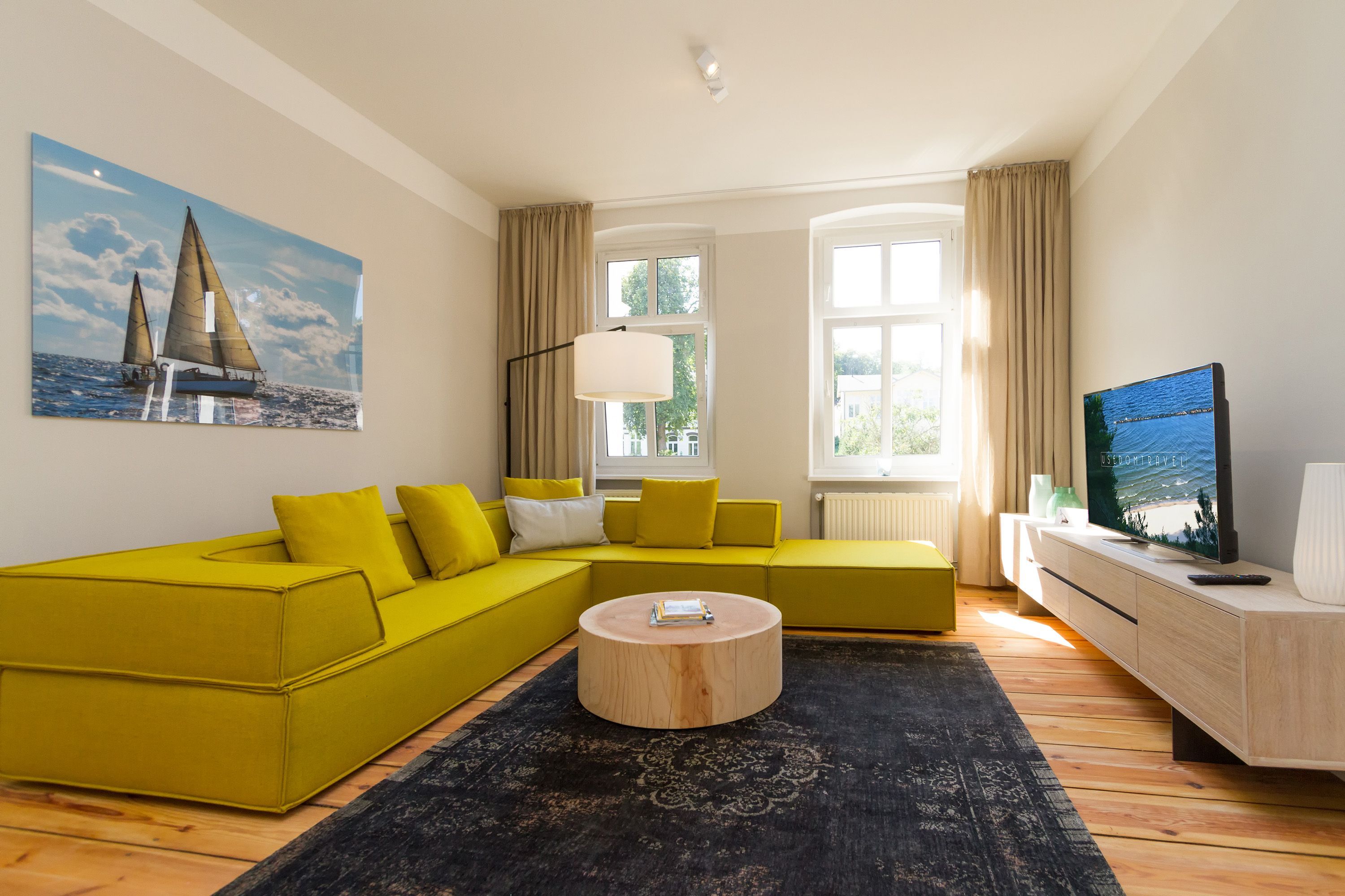Urlauben 2.0 – In der Wohnung 03 ist außergewöhnliches und extravagantes Wohndesign Standard. Der Wohntraum ist eine gelungene Vereinigung von alter Bäderarchitektur und modernstem, vor allem ökologisch wertvollem Design. Auf den 93 Quadratmetern im ersten Obergeschoss können sich vier Erwachsene und ein Kind (im Kinderreisebett) im wahrsten Sinne austoben. Denn im großzügigen Entree des Appartements verführen die Original-Sprossenwand und die Ballettstange nicht nur zum Aufhängen der Kleidung. Bei Bewegungslust halten sie, was sie versprechen. Auch eine Yoga-Matte und eine Faszienrolle gehören zur Ausstattung dazu. Ein Hingucker ist die originale Wandgestaltung der alten Kaiserzeitvilla, die ganz bewusst sichtbar belassen wurde und dem Feriendomizil ein exklusives Flair verleiht. Auch die aufgearbeiteten und wiederverwendeten Türen und der rustikale Dielenboden gehören dazu. Die Wohnung trägt das Motto „gesunde Leichtigkeit“ und genau diese ist es, die den Bewohner in den drei luftig hellen Räumen und der separaten Küche umfängt. Die Innenarchitektin von Green Living hat in diesem Paradies dafür gesorgt, dass jeder Raum anders gestaltet ist und dennoch nachhaltigen Luxus bietet. Green Living verwendet nur schadstoffgeprüfte Materialien und Möbel und sorgt so für eine gesunde, unbelastete Raumluft, die auch für Allergiker geeignet ist. Die riesige Wohnlandschaft in sehr modernem senfgelbem Schurwollstoff und der große Flat-TV laden zum ausgiebigen Chillen ein. Ein besonderes Highlight ist der Vintage-Teppich im Wohnzimmer. Die Küche ist vollausgestattet mit hochwertigen Blaupunkt-Küchengeräten, den keramischen Wohnaccessoires von ASA Sellection sowie einem Bialetti-Espressokocher. Der massive Echtholztisch bietet Platz für gutes Essen und gute Gespräche. Die beiden Doppelbetten (1,60 m x 2,00 m) in den Schlafzimmern sind Einzelanfertigungen. Ebenso die großen Kleiderschränke, die reichlich Ablagemöglichkeiten bieten. Jedes Schlafzimmer ist lichtdurchflutet und mit wunderschönen Mosaikfliesen ausgestaltet sind die beiden zur Wohnung gehörenden Bäder. Das Masterbad besitzt eine Badewanne. Darüber hinaus verfügen beide über eine Tropendusche, Waschtisch und Toilette. Für das Rundum-Wohlfühl-Urlaubspaket sind die Betten bereits bezogen und Handtücher liegen bereit. Es gibt einen gekennzeichneten Außenstellplatz.