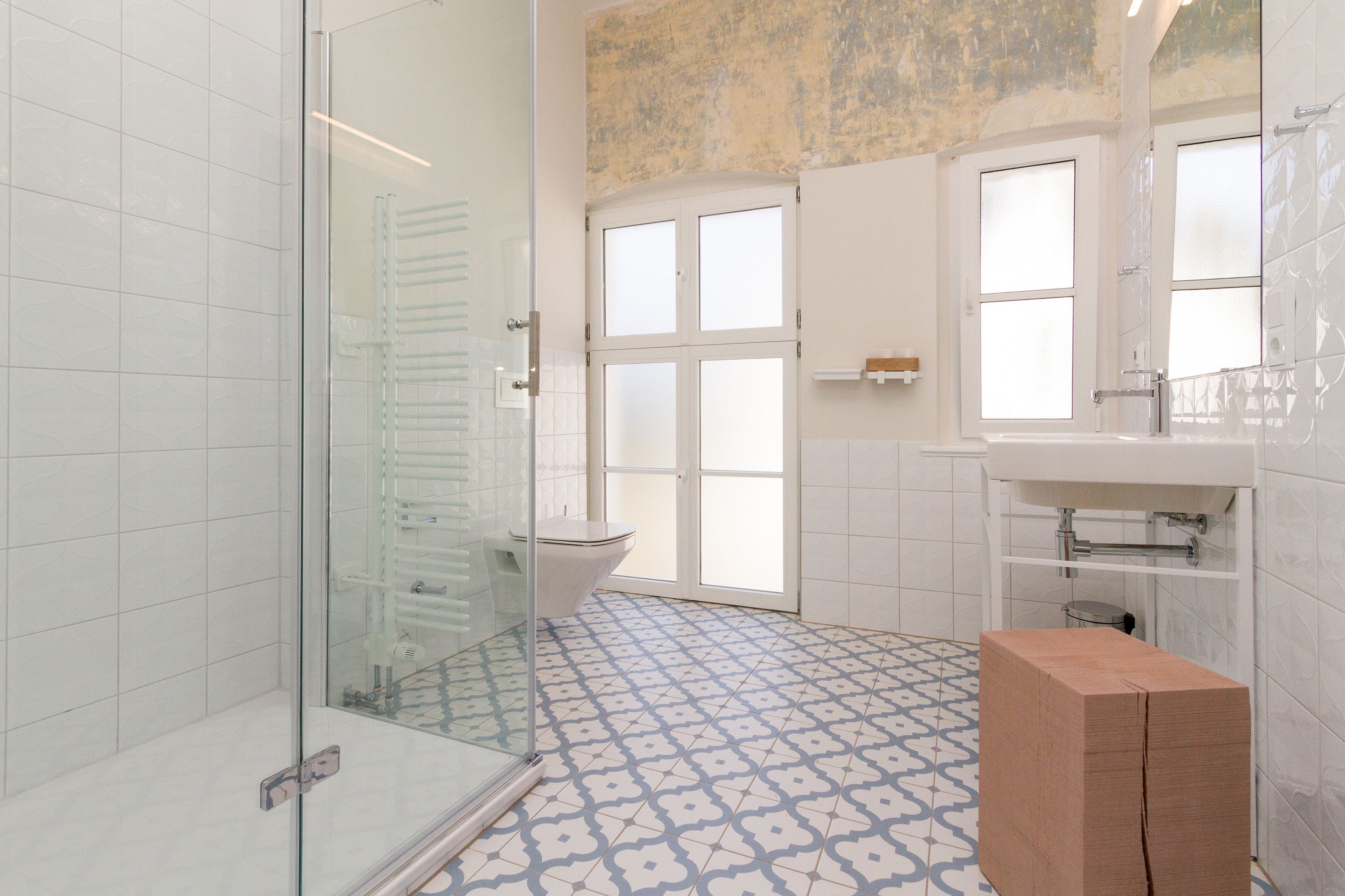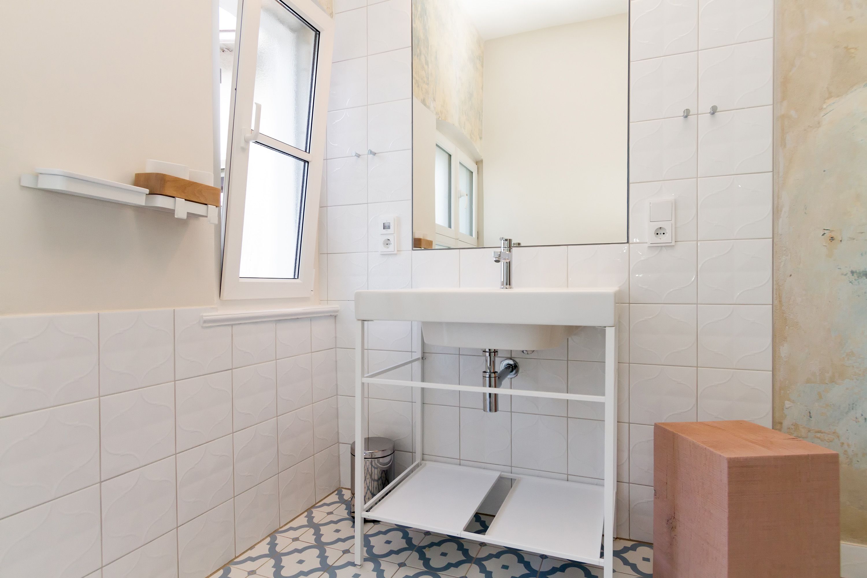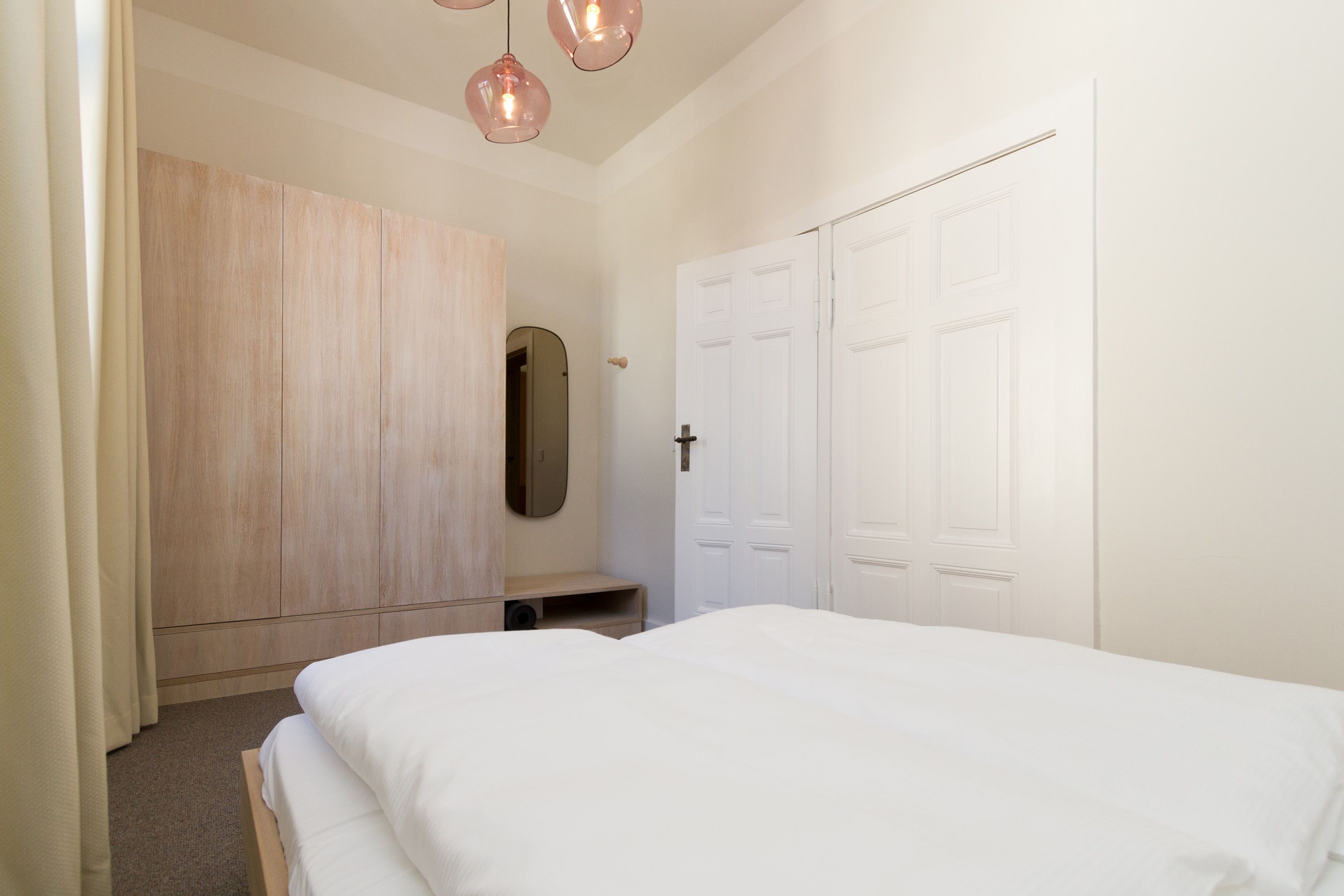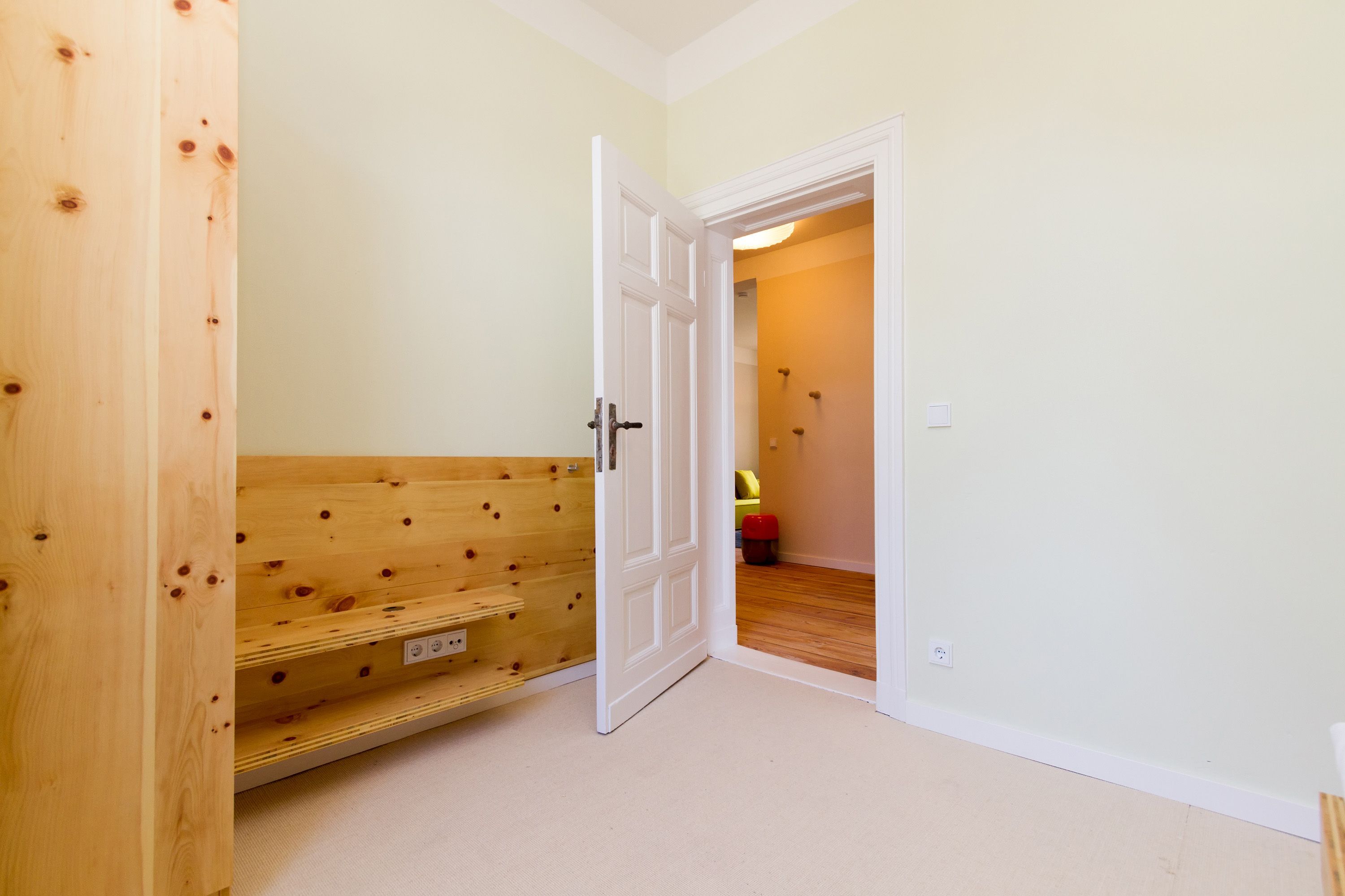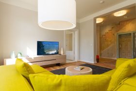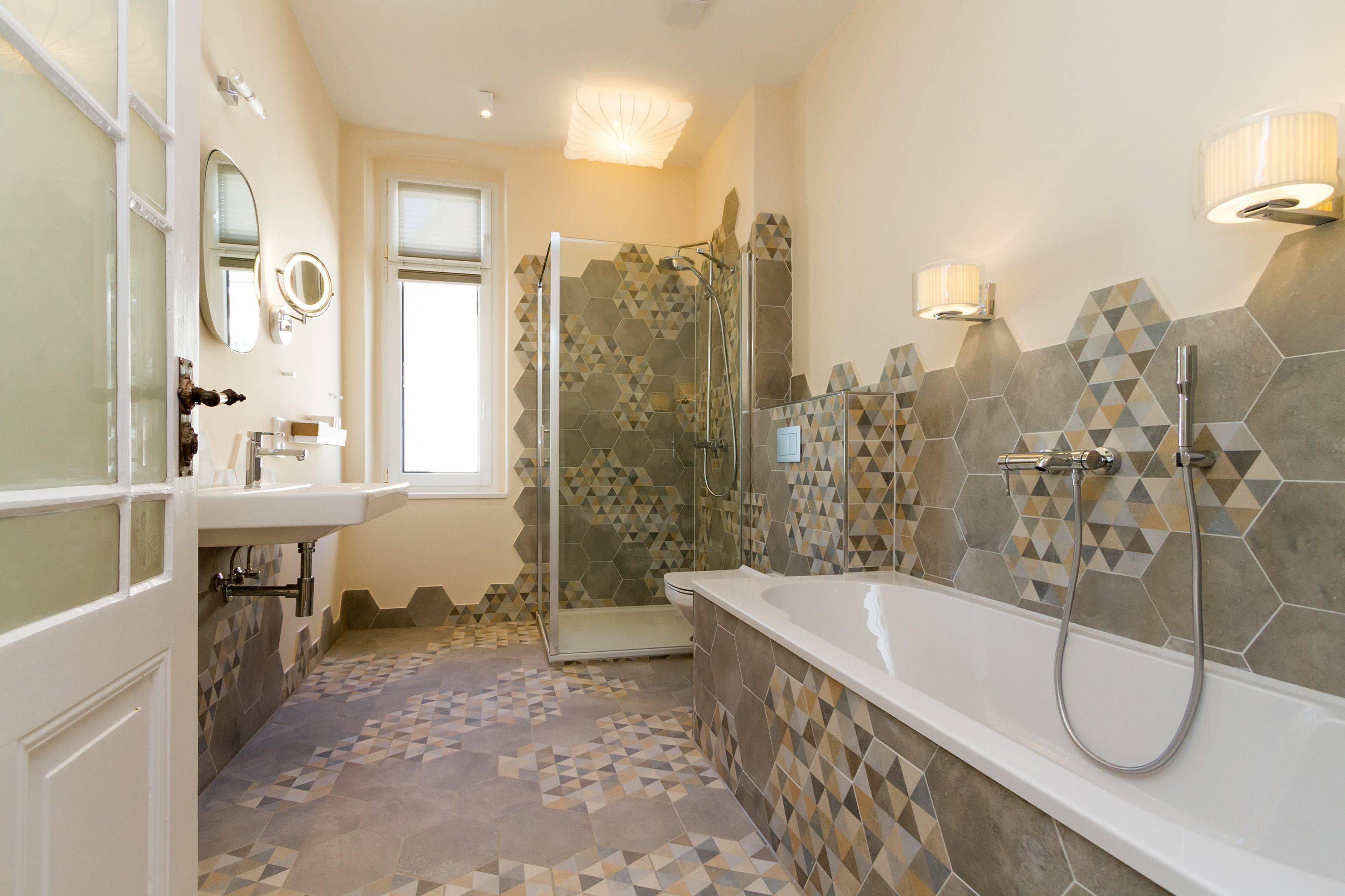Urlauben 2.0 – In der Wohnung 03 ist außergewöhnliches und extravagantes Wohndesign Standard. Der Wohntraum ist eine gelungene Vereinigung von alter Bäderarchitektur und modernstem, vor allem ökologisch wertvollem Design. Auf den 93 Quadratmetern im ersten Obergeschoss können sich vier Erwachsene und ein Kind (im Kinderreisebett) im wahrsten Sinne austoben. Denn im großzügigen Entree des Appartements verführen die Original-Sprossenwand und die Ballettstange nicht nur zum Aufhängen der Kleidung. Bei Bewegungslust halten sie, was sie versprechen. Auch eine Yoga-Matte und eine Faszienrolle gehören zur Ausstattung dazu. Ein Hingucker ist die originale Wandgestaltung der alten Kaiserzeitvilla, die ganz bewusst sichtbar belassen wurde und dem Feriendomizil ein exklusives Flair verleiht. Auch die aufgearbeiteten und wiederverwendeten Türen und der rustikale Dielenboden gehören dazu. Die Wohnung trägt das Motto „gesunde Leichtigkeit“ und genau diese ist es, die den Bewohner in den drei luftig hellen Räumen und der separaten Küche umfängt. Die Innenarchitektin von Green Living hat in diesem Paradies dafür gesorgt, dass jeder Raum anders gestaltet ist und dennoch nachhaltigen Luxus bietet. Green Living verwendet nur schadstoffgeprüfte Materialien und Möbel und sorgt so für eine gesunde, unbelastete Raumluft, die auch für Allergiker geeignet ist. Die riesige Wohnlandschaft in sehr modernem senfgelbem Schurwollstoff und der große Flat-TV laden zum ausgiebigen Chillen ein. Ein besonderes Highlight ist der Vintage-Teppich im Wohnzimmer. Die Küche ist vollausgestattet mit hochwertigen Blaupunkt-Küchengeräten, den keramischen Wohnaccessoires von ASA Sellection sowie einem Bialetti-Espressokocher. Der massive Echtholztisch bietet Platz für gutes Essen und gute Gespräche. Die beiden Doppelbetten (1,60 m x 2,00 m) in den Schlafzimmern sind Einzelanfertigungen. Ebenso die großen Kleiderschränke, die reichlich Ablagemöglichkeiten bieten. Jedes Schlafzimmer ist lichtdurchflutet und mit wunderschönen Mosaikfliesen ausgestaltet sind die beiden zur Wohnung gehörenden Bäder. Das Masterbad besitzt eine Badewanne. Darüber hinaus verfügen beide über eine Tropendusche, Waschtisch und Toilette. Für das Rundum-Wohlfühl-Urlaubspaket sind die Betten bereits bezogen und Handtücher liegen bereit. Es gibt einen gekennzeichneten Außenstellplatz.