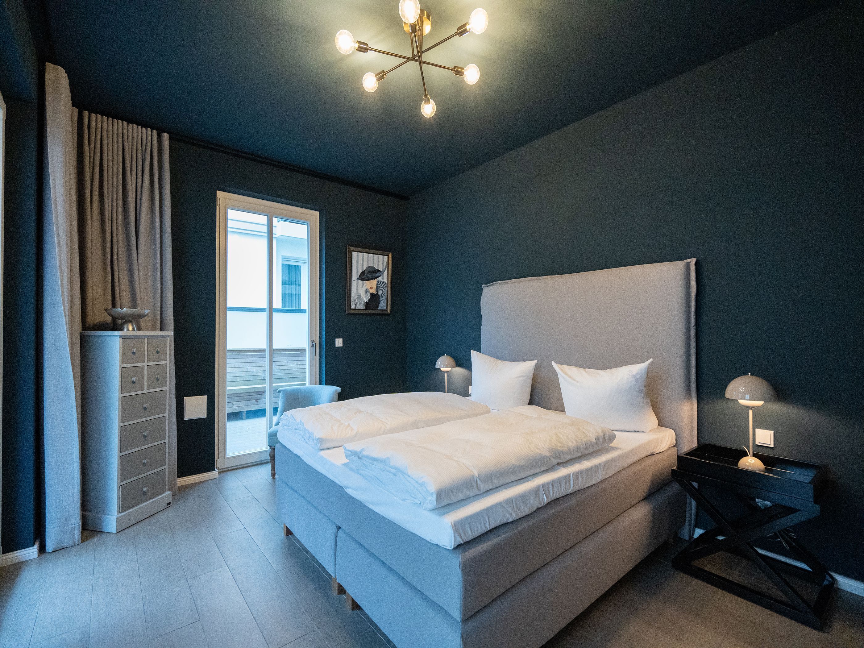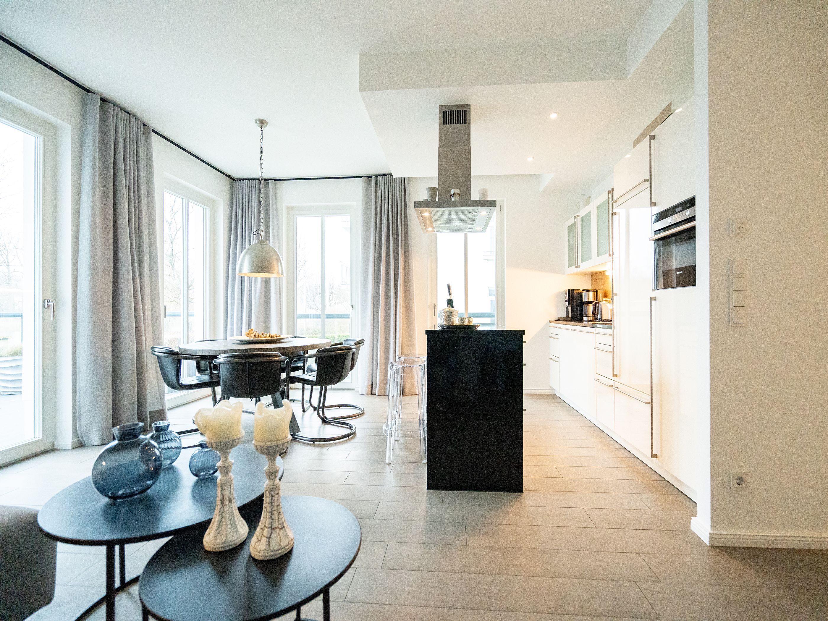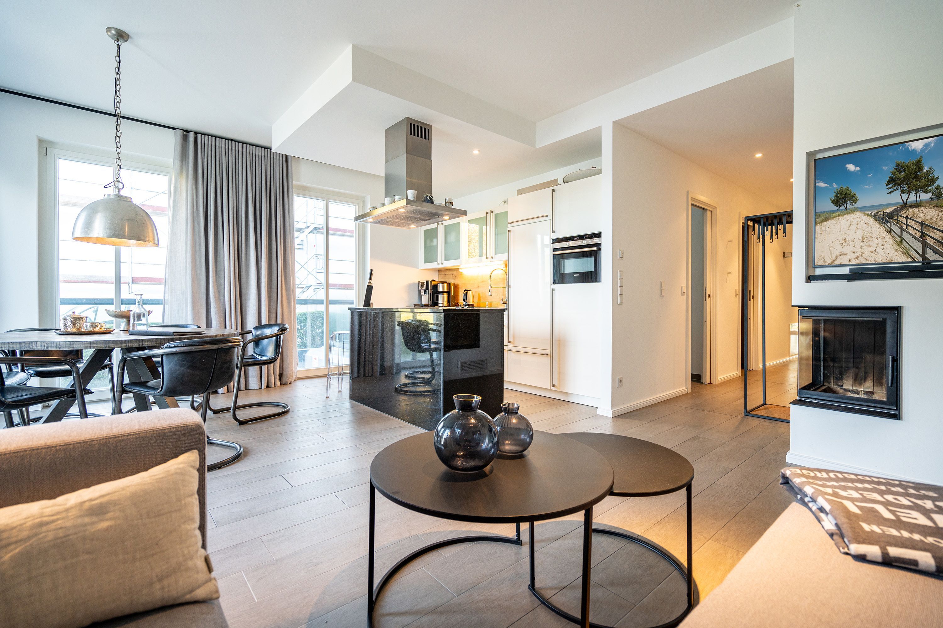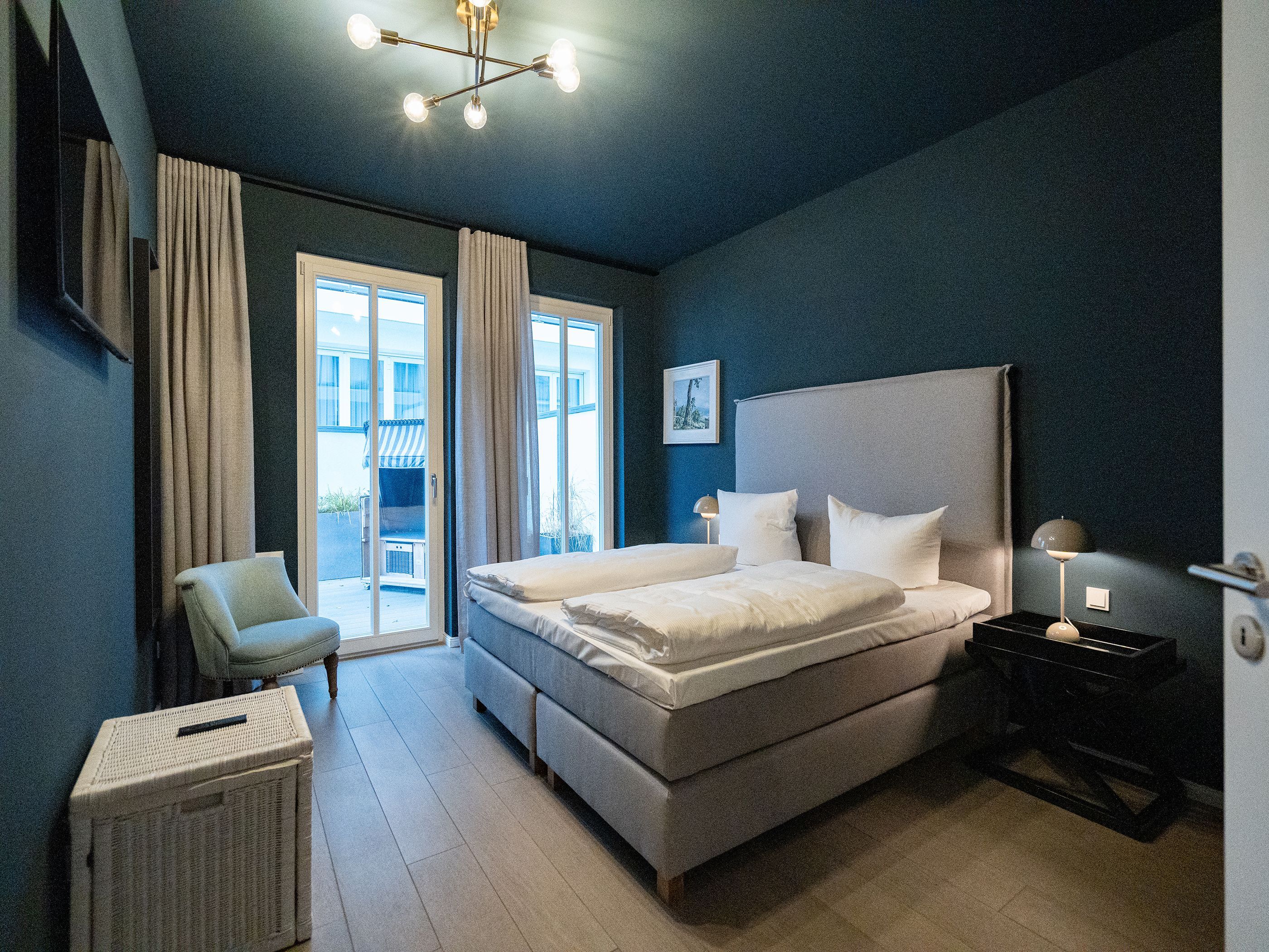 Gemütlicher Lifestyle, eine riesige Sonnenterrasse und ein wunderschöner Ausblick auf den Schloonsee! Unsere neue 4-Raum-Ferienwohnung im Erdgeschoss der Strandresidenzen bietet auf großzügigen 120 Quadratmetern (buchbar für 5 Personen & 2 Kleinkinder bis 3 Jahre im Kinderreisebett) ein perfektes Urlaubsdomizil. Freuen Sie sich auf zeitgemäßes Design, kombiniert mit wohnlichen Accessories und abgestimmten Farben und Stoffen. Der helle Wohnbereich mit lässiger Sitzgruppe, Flat-TV und schönem Kamin schließt sich die komplett ausgestattete, offene Küche und an den sonnigen Essplatz an. Der schöne Blick auf den Schloonsee und der großzügige Südbalkon versetzen Sie sicher gleich in Urlaubslaune. Zwei große Schlafzimmer sind mit je einem Doppelboxspringbett (1,80 m x 2,00m) ausgestattet, die für einen erholsamen Schlaf sorgen. Das 3. kleinere Schlafzimmer verfügt über ein Einzelboxspringbett (0,90m x 2,00m) und einen Einbaukleiderschrank. In allen Zimmern kann ein zusätzliches Kinderreisebett (zubuchbar) aufgestellt werden. Ergänzt wird die Wohnung durch ein Bad mit Badewanne und ein Bad mit Dusche, die hier integrierte Sauna lädt zum Relaxen ein. Ein besonderes Highlight ist die riesige 50 qm große, halbumlaufende Südwest-Terrasse. Ausgestattet mit schönen Gartenmöbeln, Strandkorb und Blick auf den Schloonsee wird sie in den wärmeren Jahreszeiten sicher schnell zu Ihrem Lieblingsplatz. Für Ihren Komfort sind die Betten bei der Anreise bezogen und Handtücher liegen bereit. Zwei Pkw-Stellplätze stehen in der Tiefgarage zur Verfügung. Auf Wunsch stellen wir ein Kinderreisebett und einen Kinderhochstuhl gegen Aufpreis zur Verfügung. Das WLAN-Netz in der Wohnung steht kostenfrei zur Verfügung - bitte fragen Sie an unserer Rezeption danach. Für den Tag am Meer steht Ihnen als besonderes Bonbon von Mitte Mai bis Ende September (je nach Witterung) zusätzlich ein Strandkorb am Strand und auf der Terrasse kostenlos zur Verfügung.