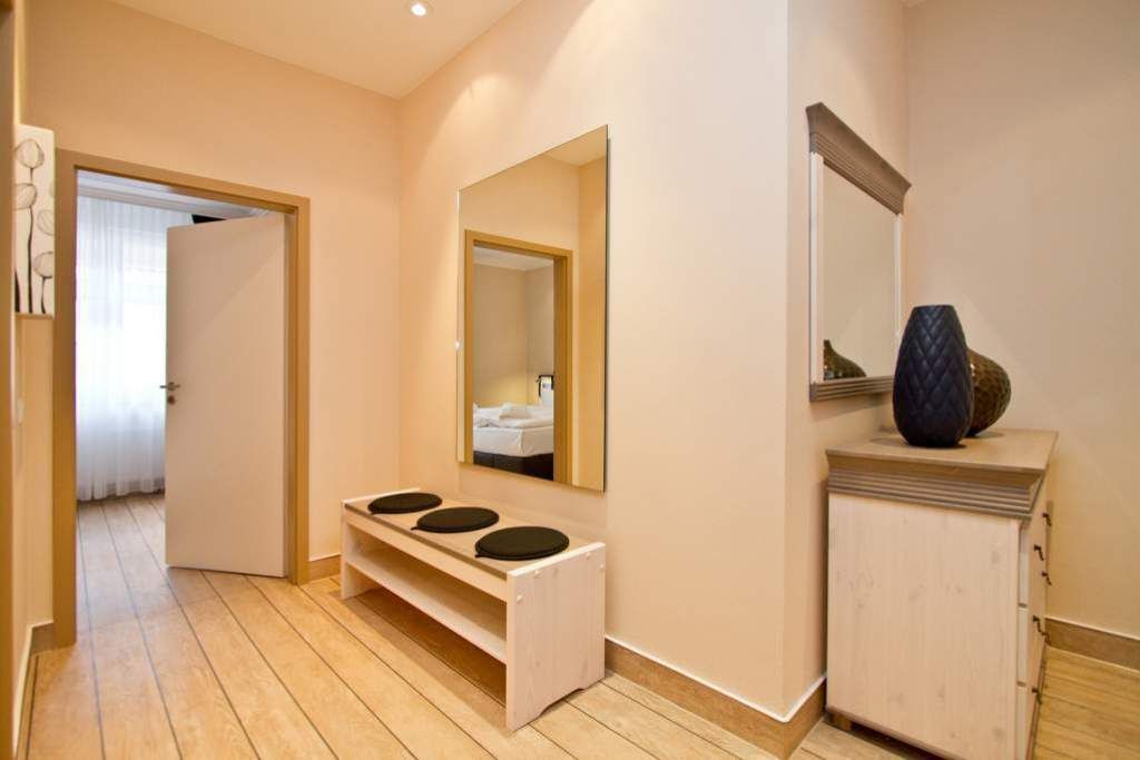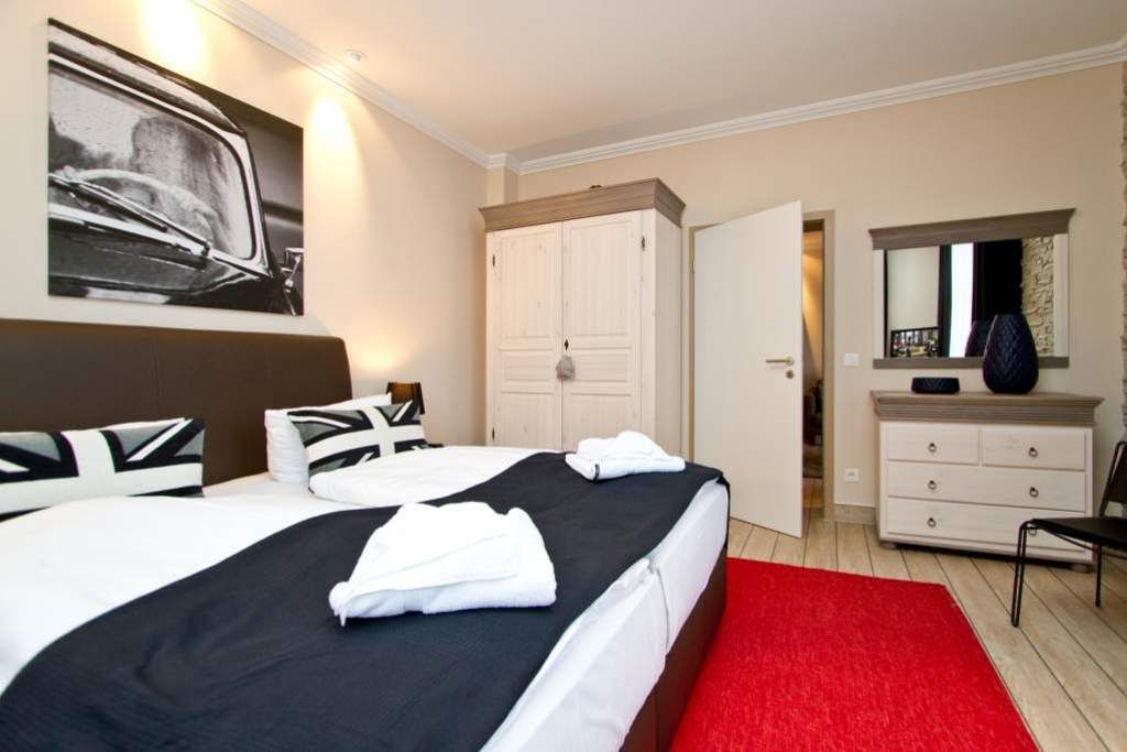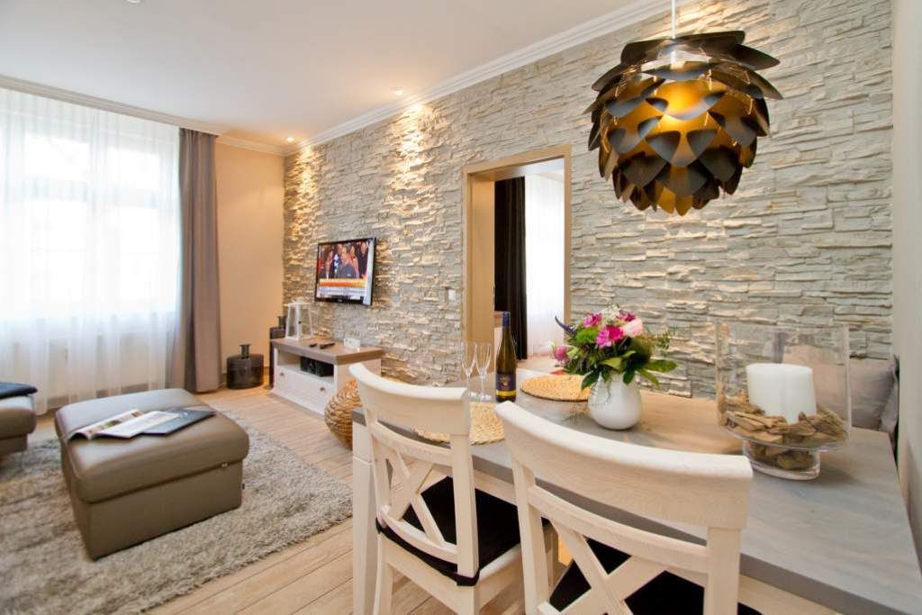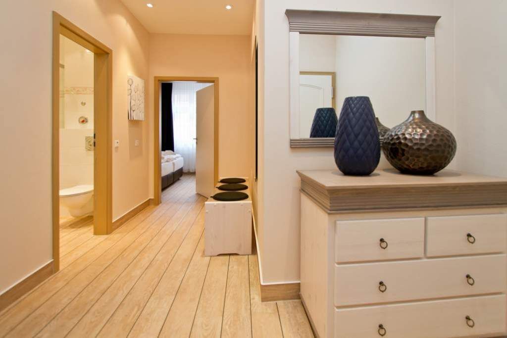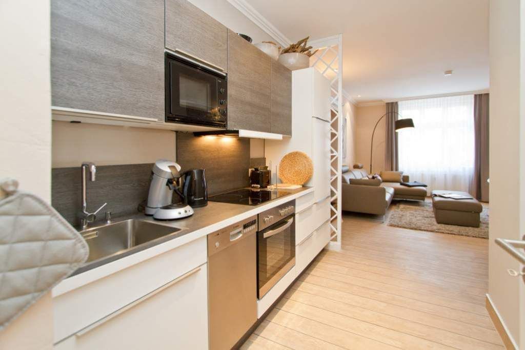 Im Frühjahr 2014 komplett renoviert und umgestaltet, empfängt Sie jetzt eine wunderschön gestaltete 3-Raum-Ferienwohnung im Hochparterre ( 68 qm für 4 Erwachsene und ein Kleinkind bis 3 Jahre im Kinderreisebett). Die moderne, stylische Einrichtung und die geschmackvoll abgestimmten Farben, Stoffe und Dekorationen lassen keine Urlaubswünsche offen. Das Wohnzimmer ist mit einer Ledersitzgruppe und Flat-TV ausgestattet, die offene Küche wird durch den gemütlichen Essplatz ergänzt. 2 Schlafzimmer mit Boxspringbetten 1,80 m x 2,00 m ( 1x mit zusätzlichem Flat-TV) und ein Bad mit Dusche und WC komplettieren das schöne Appartement. Pkw-Stellplatz (Nr.16) in der Doppelparker Garage unten (max. PKW-Höhe 1,50 m, PKW Länge max. 5,00m/ Gewicht max. 2t). Auf Wunsch stellen wir für unsere kleinen Gäste ein Kinderreisebett (ohne zusätzliche Matratze & Bettzeug) und einen Kinderhochstuhl ( gegen einen Aufpreis) zur Verfügung. Für Ihren Komfort sind die Betten bei der Anreise bezogen und Handtücher liegen bereit.