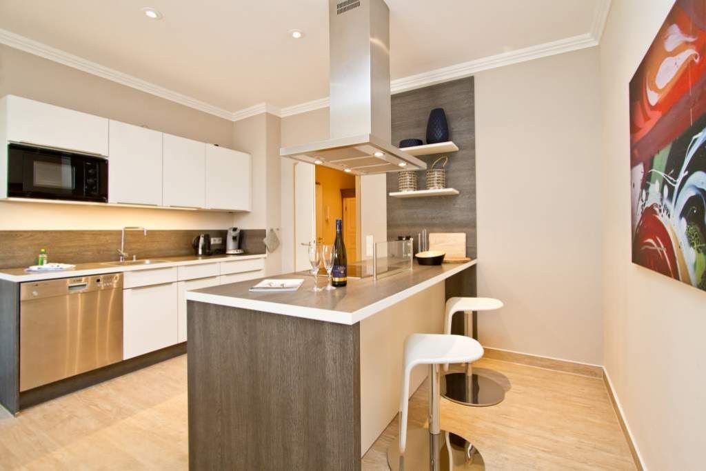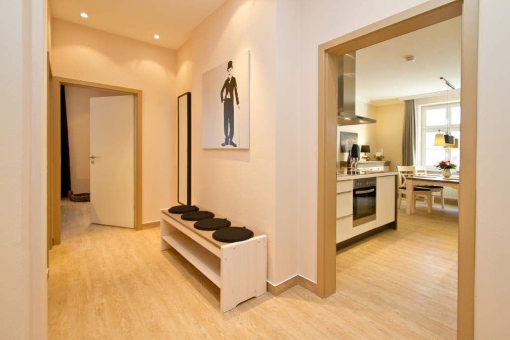 Gekonnt, modern, stylisch - die neu gestaltete 2-Raum-Ferienwohnung im Hochparterre (64 qm für 2 Erwachsene und 1 Kleinkind bis 3 Jahre) wird Sie sicher begeistern. Die hochwertige neue Einrichtung lässt keine Urlaubswünsche offen. Ein großzügiges Wohnzimmer mit Ledersitzgruppe und Flat-TV, eine separate Küche mit schönem Essplatz und das Schlafzimmer mit Doppelboxspringbett (1,80m x 2,00 m) und Flat-TV werden durch ein Bad mit Dusche und WC ergänzt. Pkw-Stellplatz Nr. 25 (nur für PKW - kein Kombi!) in der Doppelparker Garage oben (max. PKW-Höhe 1,50 m, PKW Länge max. 5,00m/ Gewicht max. 2t). Auf Wunsch stellen wir für unsere kleinen Gäste ein Kinderreisebett (ohne zusätzliche Matratze & Bettzeug) und einen Kinderhochstuhl ( gegen einen Aufpreis) zur Verfügung. Für Ihren Komfort sind die Betten bei der Anreise bezogen und Handtücher liegen bereit.