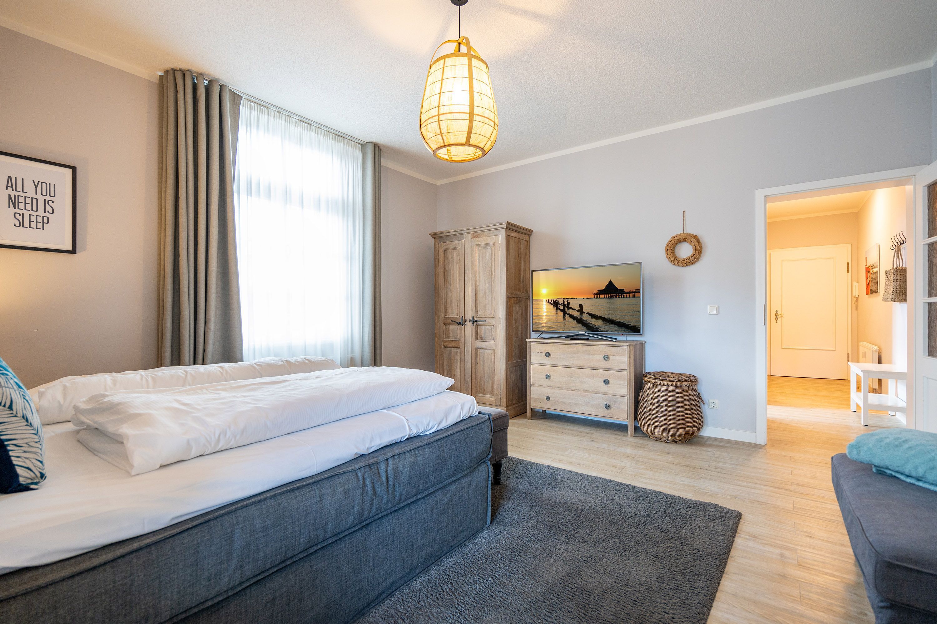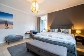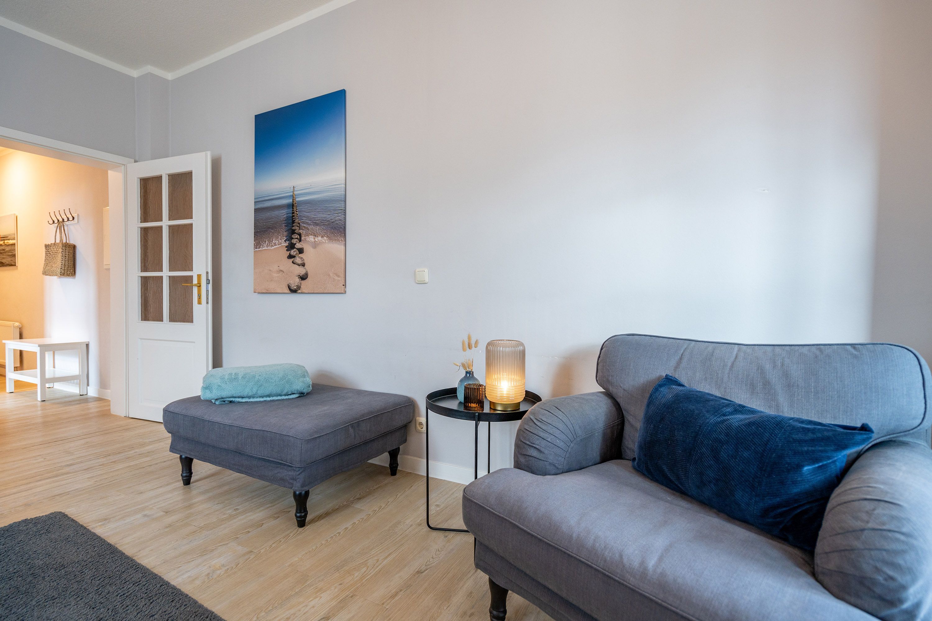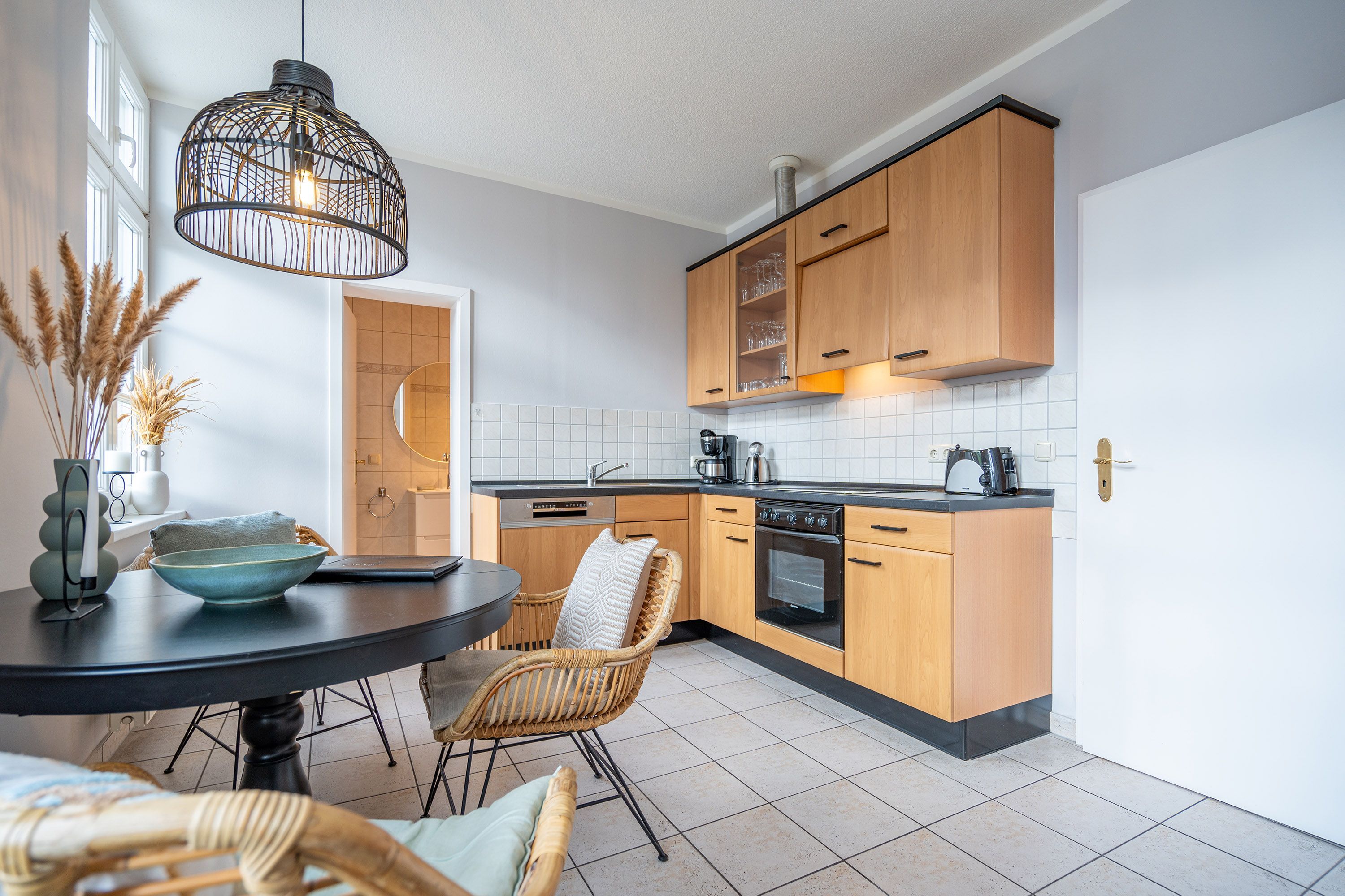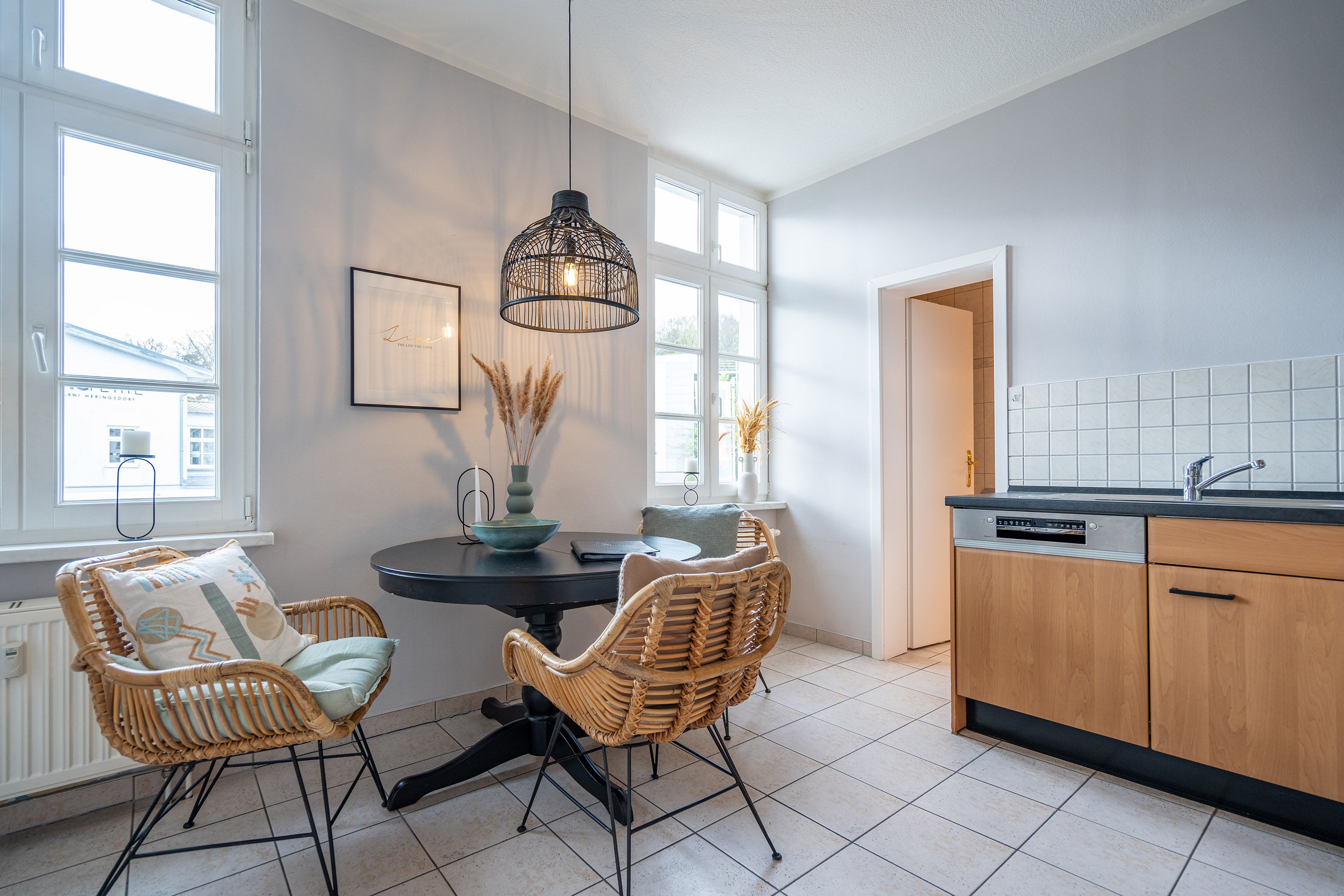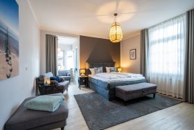 Modern, stylisch & trotzdem gemütlich - im 1. Obergeschoss der Villa Brunnenstraße erwartet Sie unser neues 1-Raum-Appartement mit Platz für 2 Personen & 1 Kleinkind ( im Kinderreisebett). Der kombinierte Wohn-Schlafbereich ist mit einem komfortablen Doppelboxspringbett ( 1,80m x 2,00m) und einer bequemen Couch ausgestattet, von beiden hat man Blick auf den Flat-TV. Die kleine, lichtdurchflutete Loggia lädt zum Relaxen im gemütlichen Sessel ein, von hier hat man einen schönen Blick auf die Villen der Brunnenstraße. Eine separate, komplett ausgestattete Küche mit Essplatz und ein Duschbad ergänzen die Wohnung. Ein PKW-Stellplatz steht auf dem Innenhof zur Verfügung.