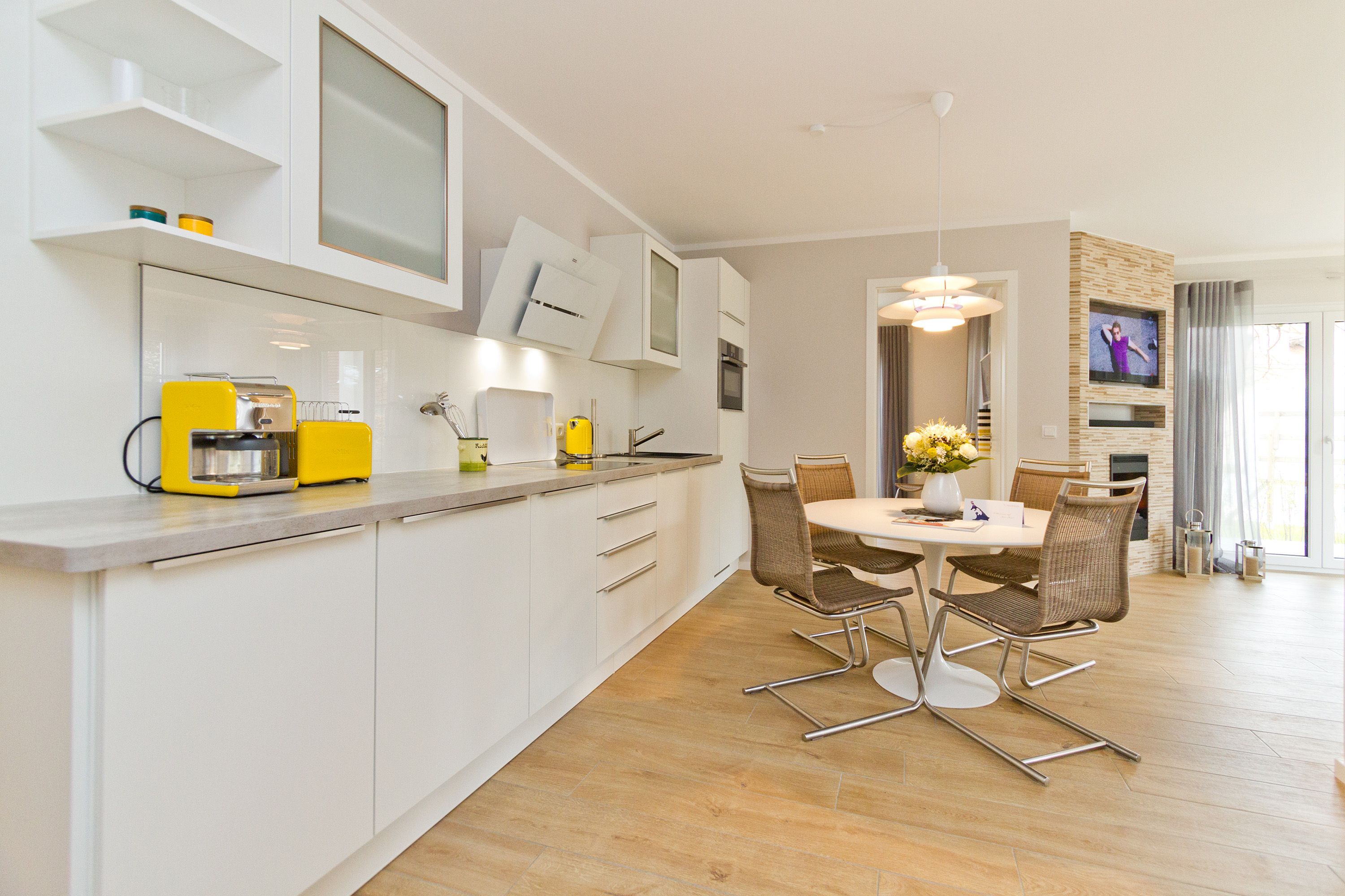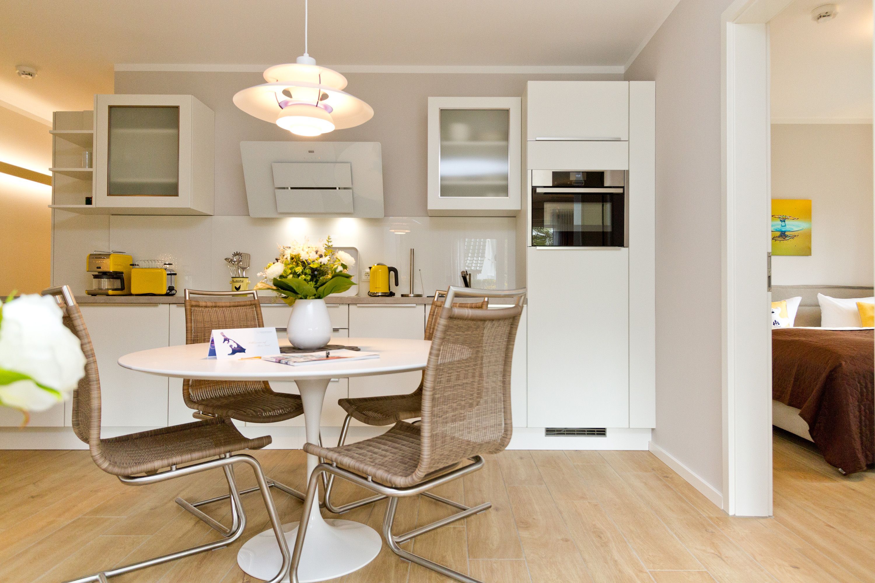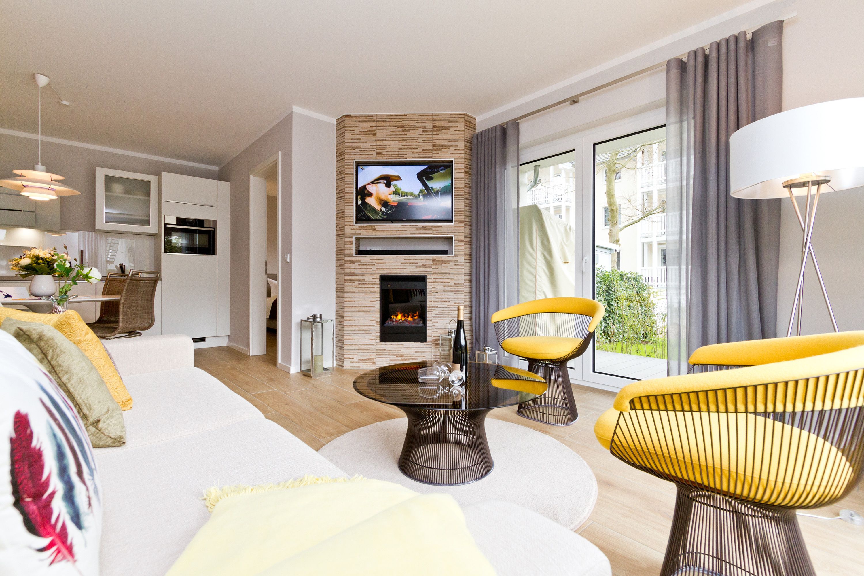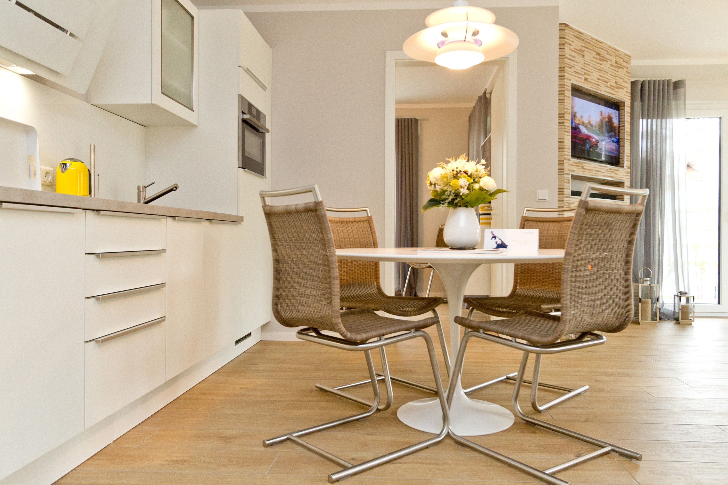Seine dekorativen und anmutigen Stahlmöbelkonstruktionen gehören zu den Ikonen des Wohndesigns der 1960er Jahre. In dieser stylischen Ferienwohnung Nummer 5 im Erdgeschoss der Dünenresidenz steht nichts Geringeres als eine Warren Plattner-Sitzgruppe mit Armlehnsesseln und Couchtisch im Mittelpunkt des schönen und weiträumigen Wohnbereichs. In den 72 Quadratmetern können bis zu vier Personen nebst einem Kleinkind bis drei Jahre (im Kinderreisebett) mit Stil Urlauben. Und mit jeder Menge Wohlfühlkomfort. So sorgt ein Elektrokamin im Wohnzimmer für eine gemütliche und kuschelige Atmosphäre. Die Wohnung ist geprägt vom Retrolook, der sich auch in der offenen Wohnküche fortsetzt. Ob der große Tulip-Esstisch oder die retroanmutenden Küchengeräte wie Toaster, Kaffeemaschine oder Wasserkocher in diesem Feriendomizil tauchen sie ein in eine andere und absolut trendige Zeit. Herausgenommen aus dem Alltag können Sie sich hier eine ganz besondere Auszeit gönnen. Von der sonnigen Südost-Terrasse aus können Sie die Ostsee rauschen hören. Und nicht nur dort. Sanft legt sie sich auch in den beiden Schlafzimmern in die Träume. Lassen Sie sich fallen in die komfortablen Boxspringbetten (1,80 m x 2,00 m). In jedem Schlafzimmer wie auch im Wohnzimmer gibt es Flat-TVs. Ein ganz besonderes Highlight dieses Appartements ist die Panorama-Sauna im Bad. Waschtisch, Toilette und eine geräumige Dusche gehören genauso zur Ausstattung wie Bettwäsche und Handtücher, die für Sie bereit liegen. Die Wohnung hat einen Pkw-Stellplatz in der Tiefgarage (max. Einfahrtshöhe 1,93 m).