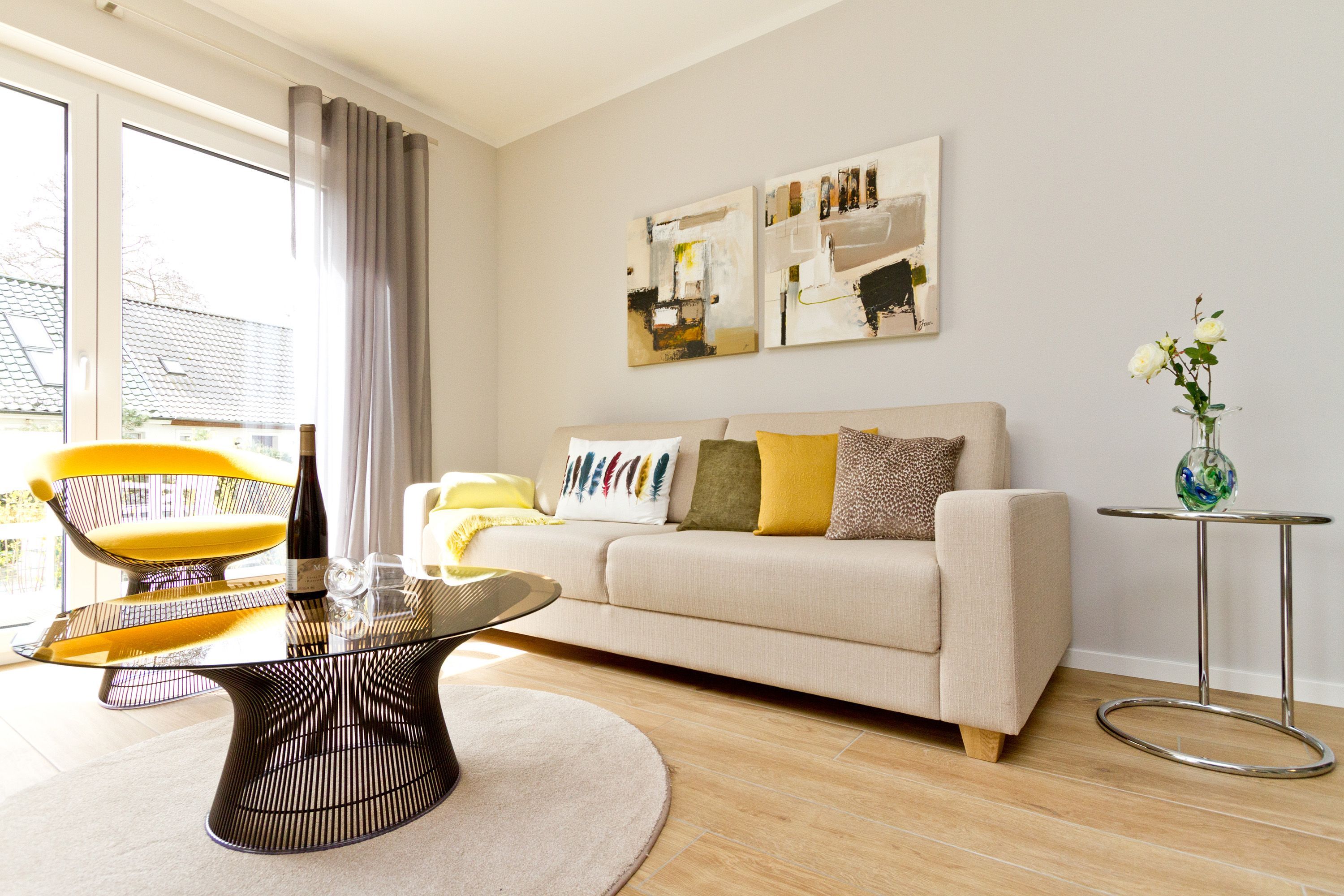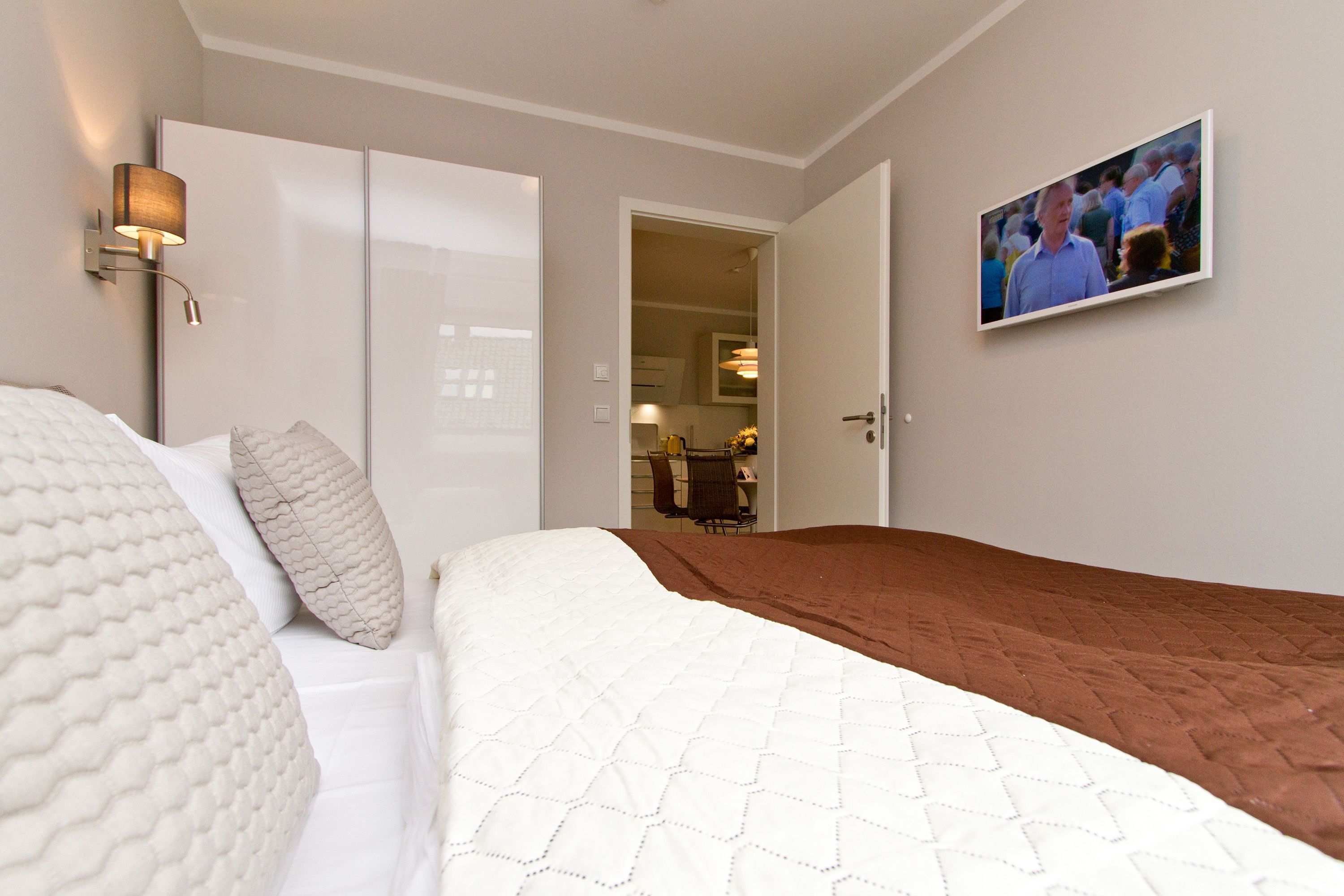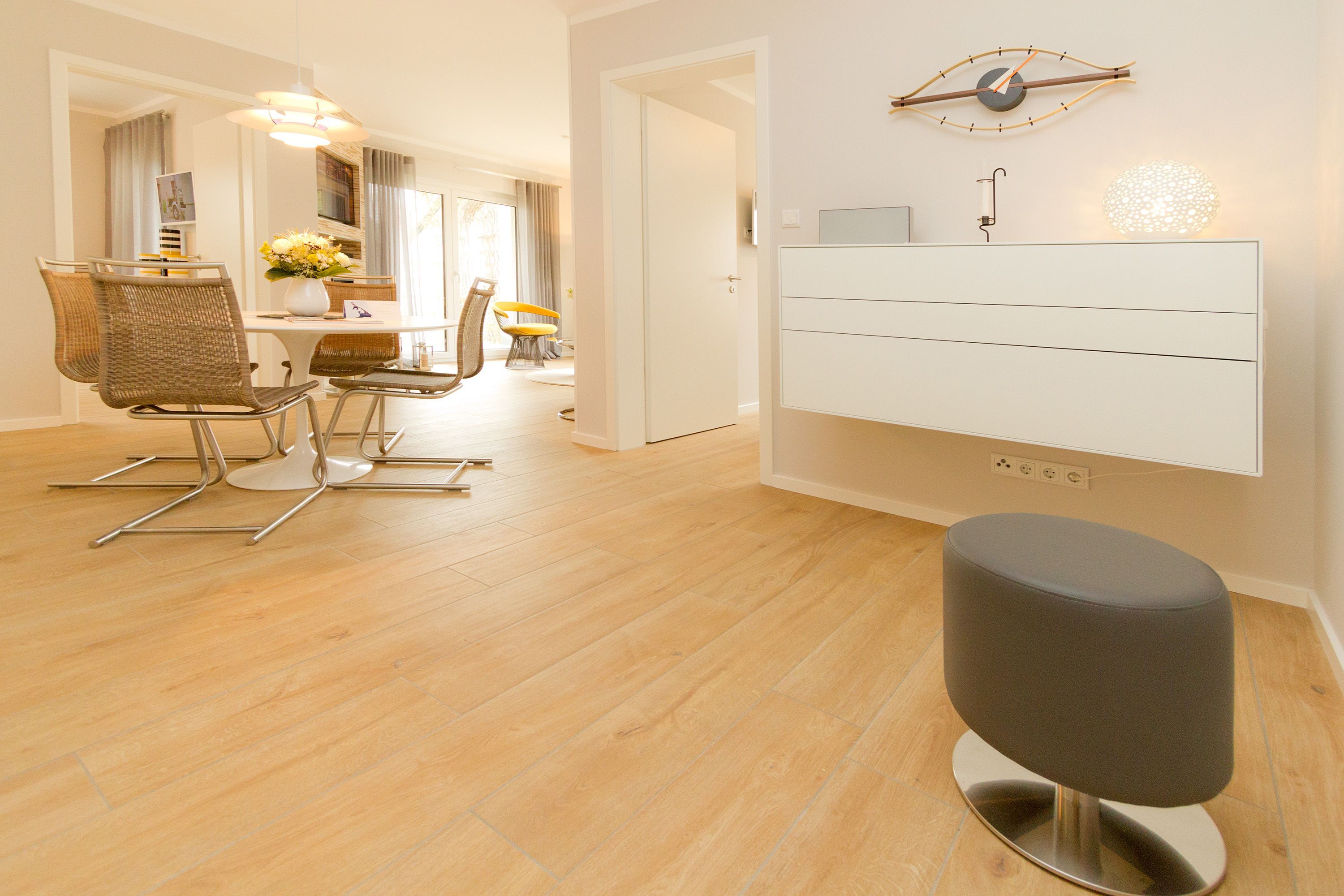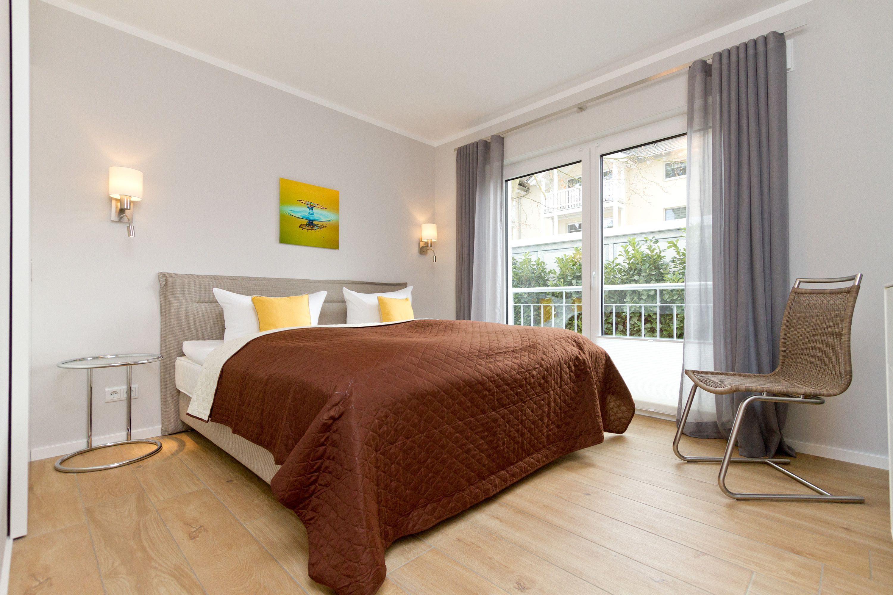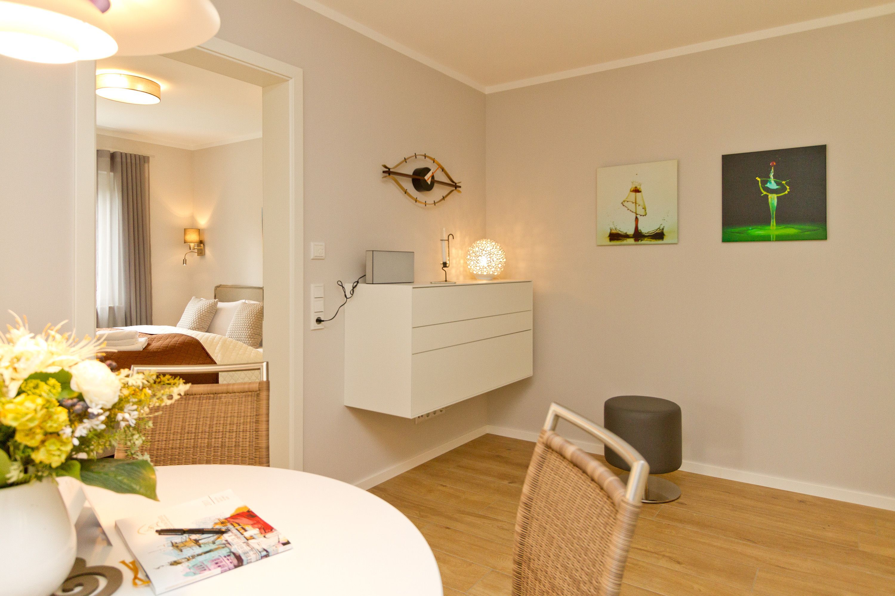 Seine dekorativen und anmutigen Stahlmöbelkonstruktionen gehören zu den Ikonen des Wohndesigns der 1960er Jahre. In dieser stylischen Ferienwohnung Nummer 5 im Erdgeschoss der Dünenresidenz steht nichts Geringeres als eine Warren Plattner-Sitzgruppe mit Armlehnsesseln und Couchtisch im Mittelpunkt des schönen und weiträumigen Wohnbereichs. In den 72 Quadratmetern können bis zu vier Personen nebst einem Kleinkind bis drei Jahre (im Kinderreisebett) mit Stil Urlauben. Und mit jeder Menge Wohlfühlkomfort. So sorgt ein Elektrokamin im Wohnzimmer für eine gemütliche und kuschelige Atmosphäre. Die Wohnung ist geprägt vom Retrolook, der sich auch in der offenen Wohnküche fortsetzt. Ob der große Tulip-Esstisch oder die retroanmutenden Küchengeräte wie Toaster, Kaffeemaschine oder Wasserkocher in diesem Feriendomizil tauchen sie ein in eine andere und absolut trendige Zeit. Herausgenommen aus dem Alltag können Sie sich hier eine ganz besondere Auszeit gönnen. Von der sonnigen Südost-Terrasse aus können Sie die Ostsee rauschen hören. Und nicht nur dort. Sanft legt sie sich auch in den beiden Schlafzimmern in die Träume. Lassen Sie sich fallen in die komfortablen Boxspringbetten (1,80 m x 2,00 m). In jedem Schlafzimmer wie auch im Wohnzimmer gibt es Flat-TVs. Ein ganz besonderes Highlight dieses Appartements ist die Panorama-Sauna im Bad. Waschtisch, Toilette und eine geräumige Dusche gehören genauso zur Ausstattung wie Bettwäsche und Handtücher, die für Sie bereit liegen. Die Wohnung hat einen Pkw-Stellplatz in der Tiefgarage (max. Einfahrtshöhe 1,93 m).