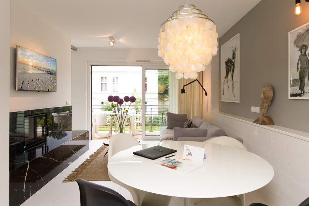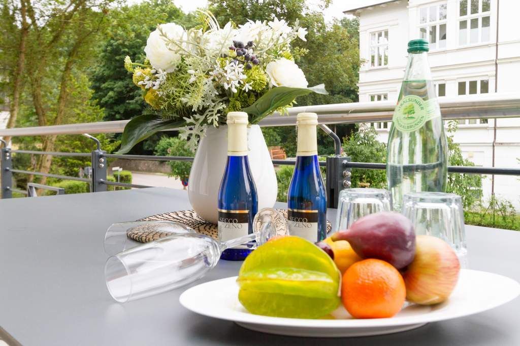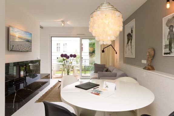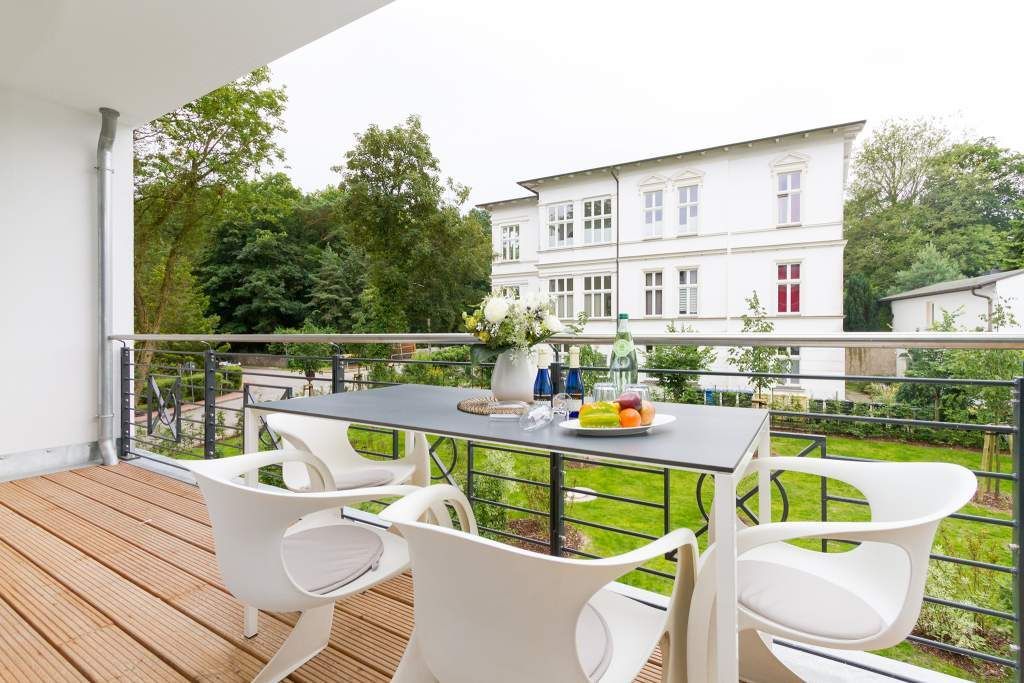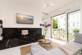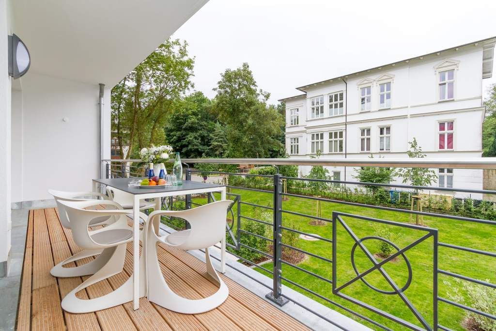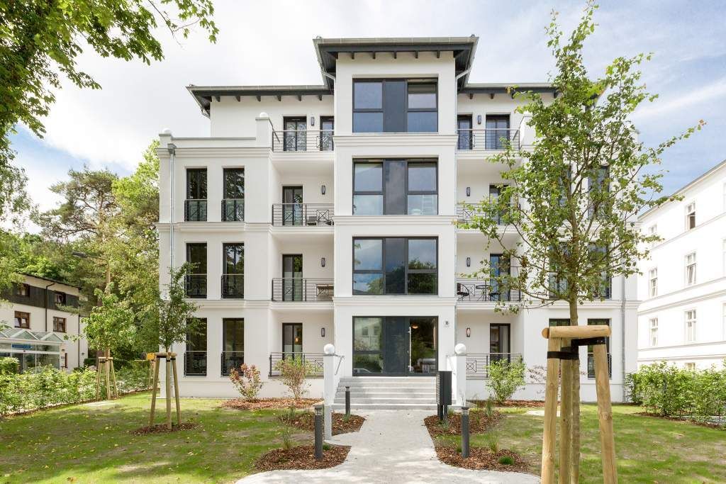 Vogelzwitschern und das sanfte Rauschen der Ostsee: Umgeben von wunderschönen, alten Bäumen atmet die 2017 fertig gestellte Villa Strandgrün das Flair der sie umgebenden Bädervillen. Mit seinen Balkonen und Erkern, die die Fassade untergliedern und auflockern, passt sich das strandnahe (100 Meter) Urlaubsdomizil angenehm in das Bild der aufwendig sanierten Villen um sie herum ein und wirkt selbst wie eine Weiterführung der einst mondänen Architektur des 19. Jahrhunderts. Das stilvolle Äußere setzt sich im exklusiven und eleganten Wohndesign im Inneren fort. Jede Ferienwohnung verfügt über eine Sonnenterrasse oder mehrere Balkone. Besondere Highlights eines jeden Appartements sind der Kamin, eine Sauna und je zwei Bäder bzw. ein zusätzliches Gäste WC. Die großzügigen 3- und 4-Raum-Suiten wurden mit allem Komfort konzipiert und ausgestattet. Vom ASA-Geschirr bis zu den hochwertigen Designmöbeln steht das Wohlfühlen an erster Stelle. In der Tiefgarage gibt es für jedes Appartement einen Stellplatz. Außerdem steht für jede Wohnung ein Briefkasten am Haus zur Verfügung.