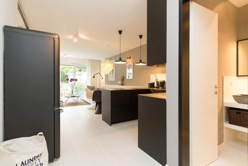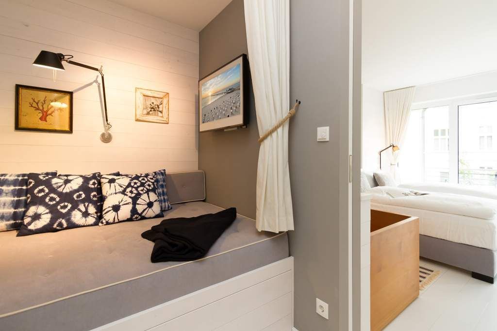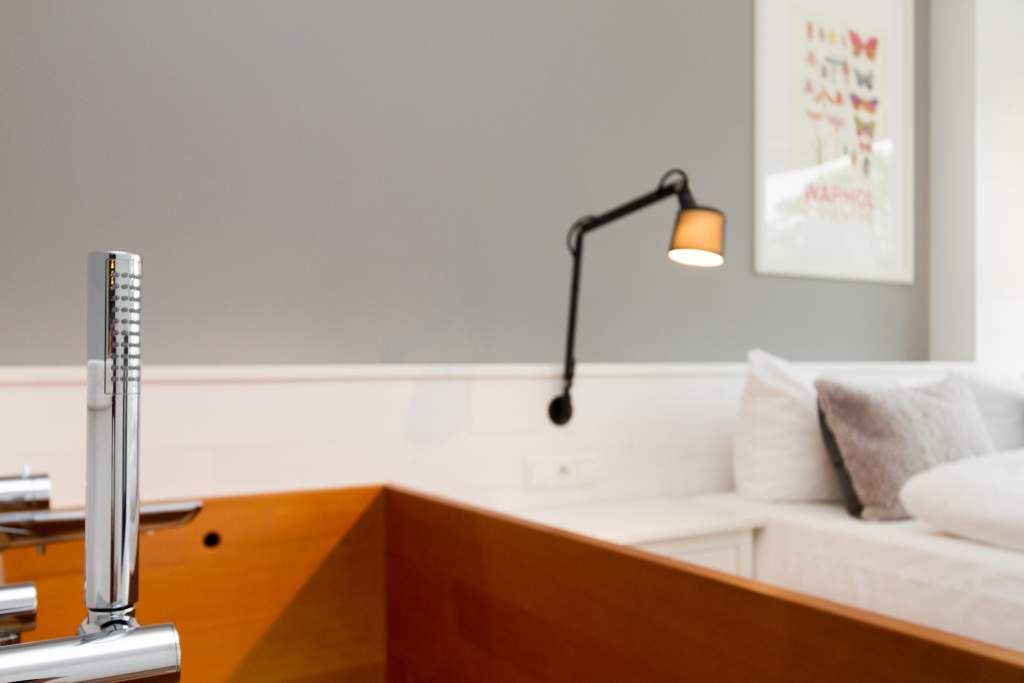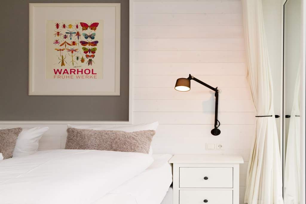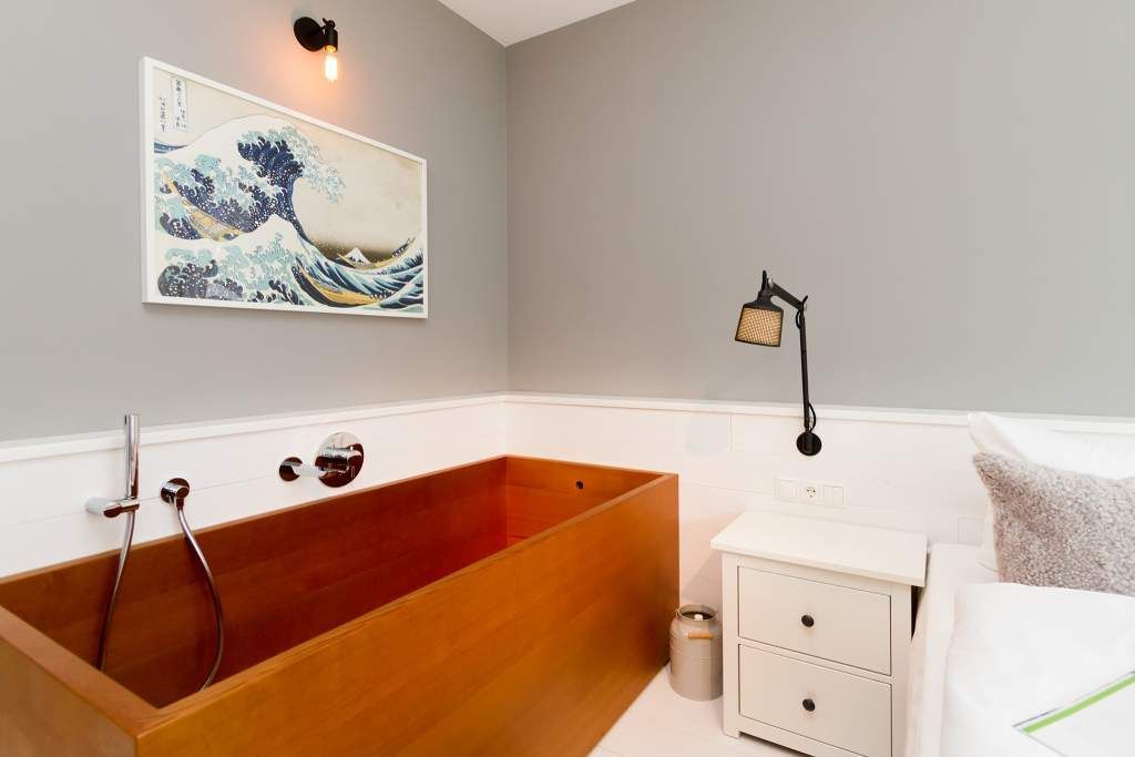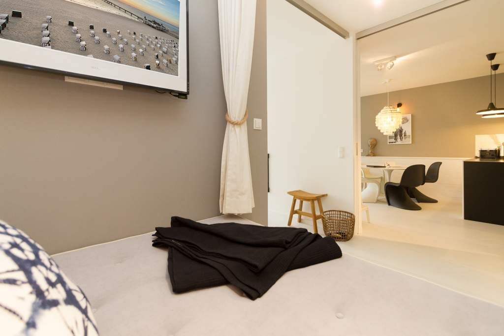 Der Urlaub ist die schönste Zeit des Jahres. Und die verbringt man natürlich gern in einer ganz besonders schönen Umgebung. Ein echter Wohlfühlort für eine solche Auszeit ist die Design-Wohnung Nummer 05 im ersten Obergeschoss der Villa Strandgrün in Heringsdorf. Drei bis vier Personen bieten die 68 Quadratmeter Platz zum Abschalten und Energietanken. Ein stilvolles Designkonzept durchzieht hier jeden Raum. Stimmig und harmonisch bis ins Detail der Lampen und Wohn-Accessoires. Das wunderschöne Wohn-Esszimmer mit der offenen, mit hochwertigen Geräten ausgestatteten und in modernem Anthrazit gehaltenen Küche ist eine absolute Wohlfühlzone. Ein Hingucker ist der große, freistehende Vintage-Kühlschrank. Exklusive und komfortable Designmöbel wie der Esstisch mit seinen vier Stühlen oder das große Sofa, das auch als Schlafmöglichkeit für eine Person fungieren kann, verleihen dem Zimmer ein elegantes Flair. Zur besonderen Atmosphäre trägt auch das Marmorboard mit dem Kamin bei. Der so genannte Tunnelkamin kann auch vom Schlafzimmer aus betrachtet werden. Außergewöhnlich und extravagant ist die freistehende Badewanne aus Zedernholz im Schlafzimmer. So können Sie vom entspannten Im-Wasser-Liegen nahtlos zur Entspannung ins große Doppelbett (1,80 m x 2,00 m) überwechseln. Eine kuschelige Schlafkoje (1,47 m x 1,97 m) grenzt unmittelbar an das Schlafzimmer, kann aber durch einen Vorhang und Schiebetüren verschlossen werden. Wohn- und Schlafzimmer sind mit Flat-TVs ausgestattet. Sowohl vom Schlafzimmer als auch vom Wohnzimmer gelangt man auf den geräumigen Süd-West-Balkon mit Schalenstühlen und einem Esstisch. Beim Blick in den begrünten Garten und auf die benachbarten wunderschön sanierten Bädervillen sind Alltagsstress und Hektik schnell vergessen. Die Wohnung verfügt über ein großes Bad mit Dusche, Waschtisch, WC und Panoramasauna. Handtücher, die Ausstattung mit Bettwäsche und kostenfreies WLAN sind in dieser Urlaubsauszeit inklusive. Die Wohnung hat einen Pkw-Stellplatz in der Tiefgarage.