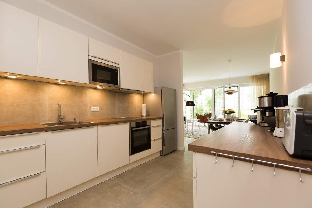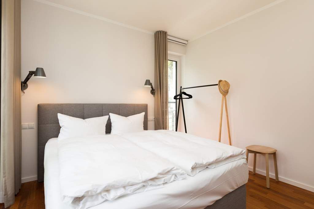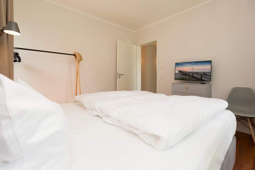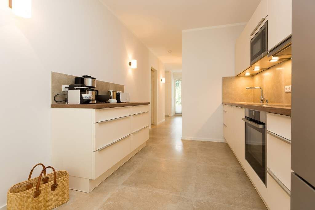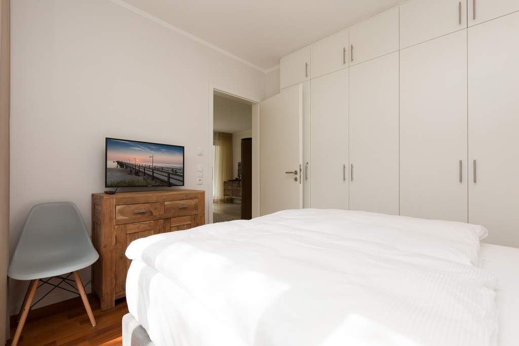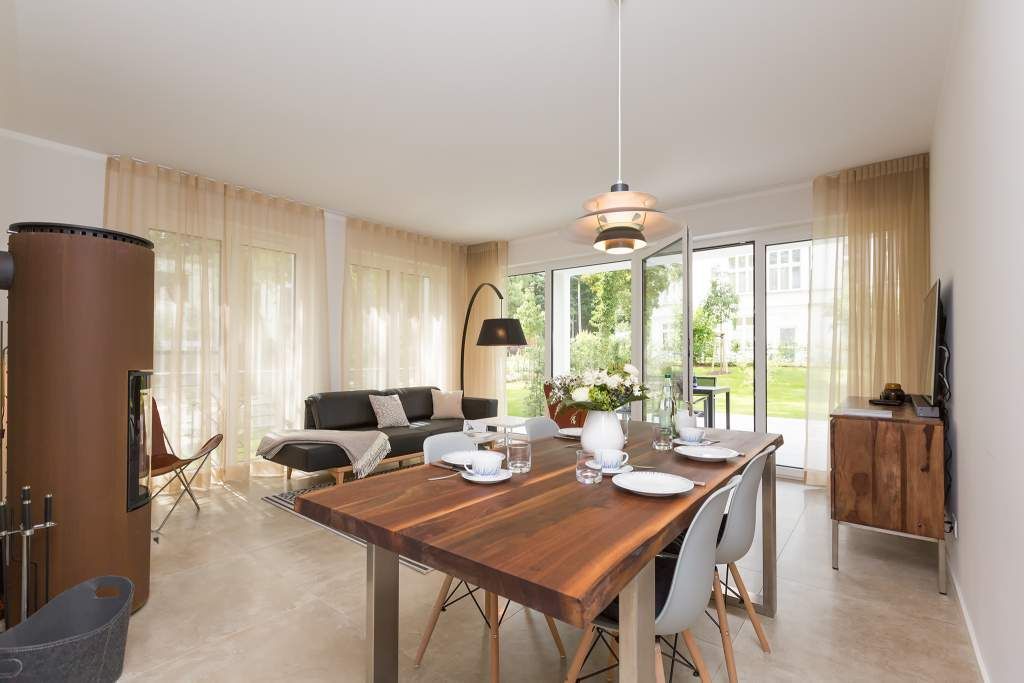 Zurücklehnen, die Beine ausstrecken, ein kühles Getränk vor sich auf dem Tisch, den Blick über das üppige Grün des Gartens schweifen lassen. Urlaub für die Seele. In der Wohnung Nummer 3 in der Villa Strandgrün ist das möglich. Egal ob auf der 30 Quadratmeter großen Gartenterrasse, im lichtdurchfluteten und mit Design-Möbeln eingerichteten Wohnzimmer oder der wohnungseigenen Panorama-Sauna in den 80 Quadratmetern dieses Ferienappartements wird das Wohlfühlen und Entspannen leicht gemacht. Vier Personen und ein Kleinkind (im Kinderreisebett) haben hier viel Platz zum Durchatmen. Schlicht, aber nobel ist Ihr Urlaubsdomizil vom Ledersofa, über die beiden Butterfly Sessel, die ausgefallene Bogenlampe bis hin zum behaglichen Musterteppich geprägt vom skandinavischen Design. Der Kaminofen sorgt an kühlen Tagen für wohlige Behaglichkeit. Der 49 Zoll-Flat-TV mit Blue Ray-Player ist ein echter Hingucker. Ein Highlight des Wohnzimmers, an das sich eine offene und hochwertig ausgestattete Küche anschließt, ist der große Echtholztisch mit den Vintage-Schalenstühlen. Für einen erholsamen und traumreichen Schlaf sorgen in den beiden Schlafzimmern die komfortablen Doppelboxspringbetten (1,60m x 2,00 m). In einem Schlafzimmer gibt es in den eigens angefertigten Einbauschränken reichlich Ablagemöglichkeiten. Beide Schlafzimmer verfügen ebenfalls über Flat-TVs. Eine Panoramasauna in einem der beiden geräumigen Bäder sorgt für den absoluten Wellnessgenuss. Beide Bäder haben darüber hinaus jeweils Dusche, Waschtisch und WC. Sogar eine Waschmaschine mit Trockner ist hier zu finden. Damit Sie sich so richtig entspannen können, sind die Betten bezogen und Handtücher liegen für Sie bereit. In der Tiefgarage ist ein Stellplatz reserviert. Für den Tag am Meer steht Ihnen ein Strandkorb am Strand von Mitte Mai bis September (je nach Witterung) zur Verfügung.