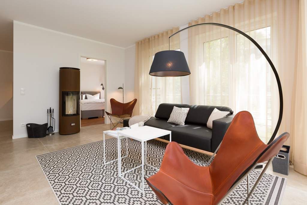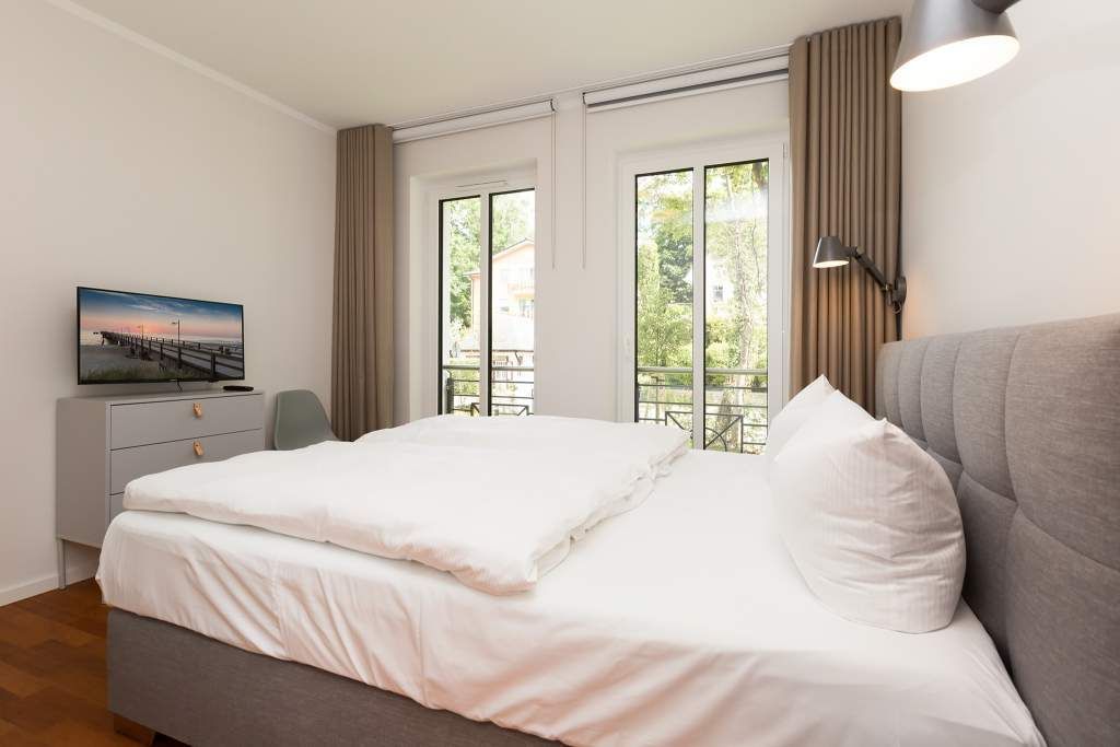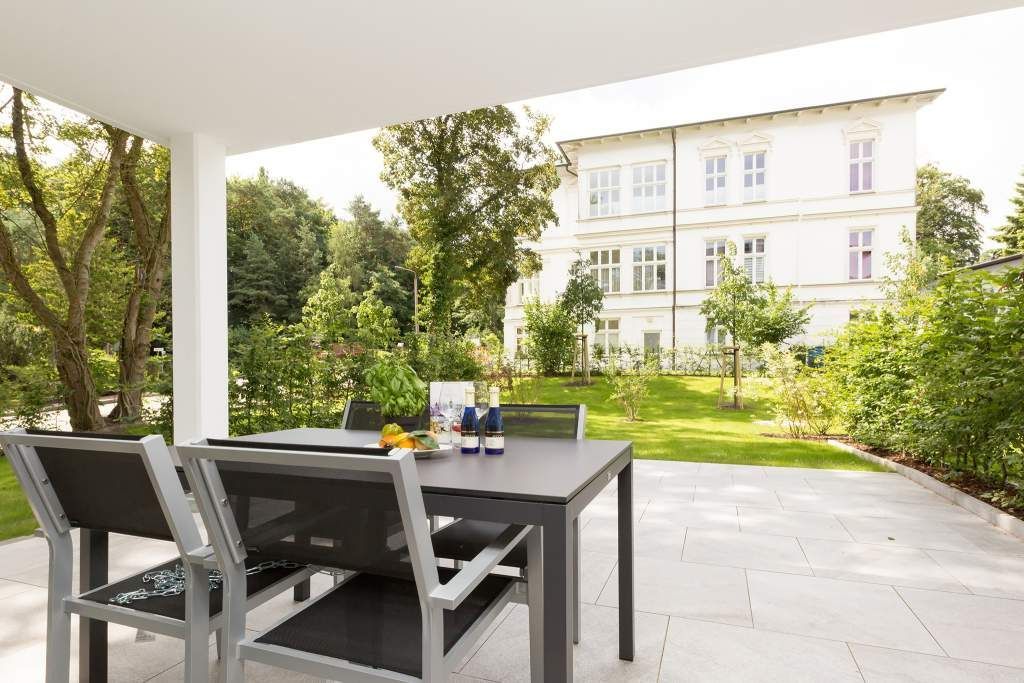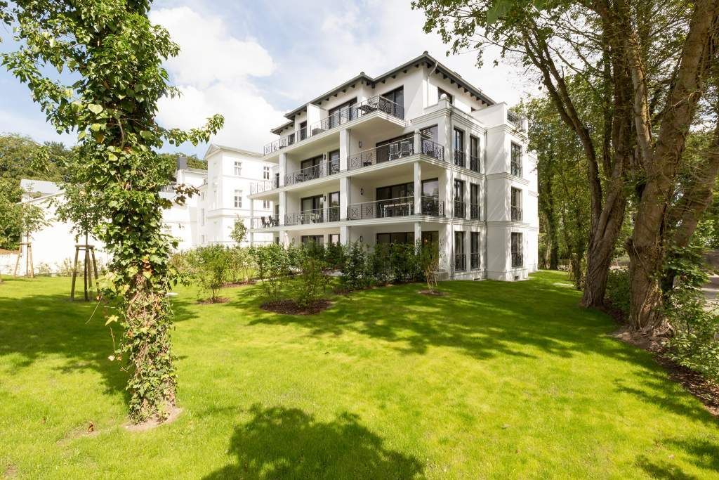 Vogelzwitschern und das sanfte Rauschen der Ostsee: Umgeben von wunderschönen, alten Bäumen atmet die 2017 fertig gestellte Villa Strandgrün das Flair der sie umgebenden Bädervillen. Mit seinen Balkonen und Erkern, die die Fassade untergliedern und auflockern, passt sich das strandnahe (100 Meter) Urlaubsdomizil angenehm in das Bild der aufwendig sanierten Villen um sie herum ein und wirkt selbst wie eine Weiterführung der einst mondänen Architektur des 19. Jahrhunderts. Das stilvolle Äußere setzt sich im exklusiven und eleganten Wohndesign im Inneren fort. Jede Ferienwohnung verfügt über eine Sonnenterrasse oder mehrere Balkone. Besondere Highlights eines jeden Appartements sind der Kamin, eine Sauna und je zwei Bäder bzw. ein zusätzliches Gäste WC. Die großzügigen 3- und 4-Raum-Suiten wurden mit allem Komfort konzipiert und ausgestattet. Vom ASA-Geschirr bis zu den hochwertigen Designmöbeln steht das Wohlfühlen an erster Stelle. In der Tiefgarage gibt es für jedes Appartement einen Stellplatz. Außerdem steht für jede Wohnung ein Briefkasten am Haus zur Verfügung.