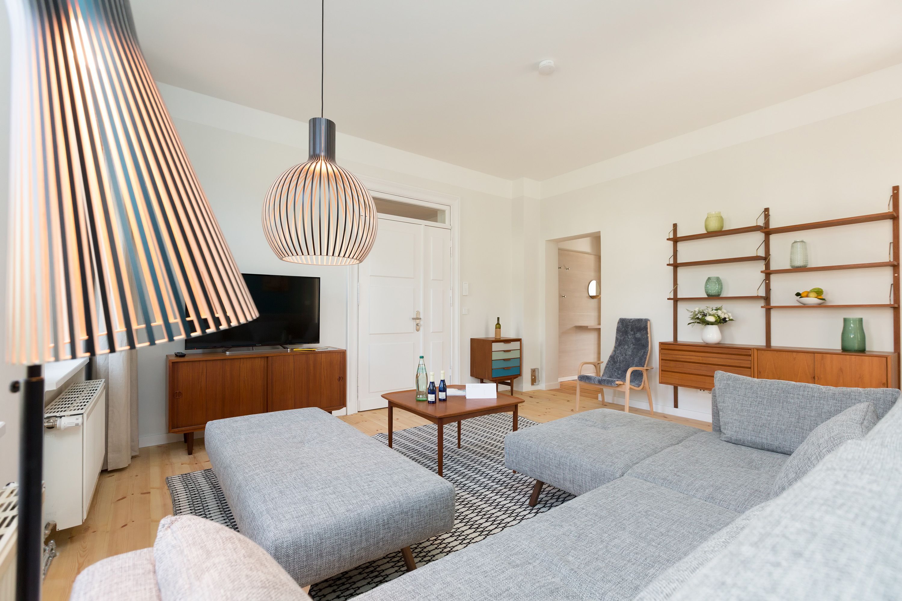 Ganz im angesagten Midcentury-Stil skandinavischer Klassiker ist die Wohnung 2 des Baltischen Hauses im Erdgeschoss gestaltet. Und das vom Feinsten. Ob Sideboards, Kommoden, Lampen, der große Wohnzimmer-Teppich mit geometrischem Muster, Regale und Wohnaccessoires in den 68 Quadratmetern, in denen zwei, maximal fünf Personen Platz haben, umgibt Sie stylisches Wohlfühldesign aus einem der architektonisch derzeit angesagtesten Jahrzehnte des 20. Jahrhunderts. Und das auf nachhaltige Art mit schadstoffgeprüften und hochwertigen Materialien. Nicht umsonst trägt das Appartement den Namen „die gute alte Zeit“. Denn die Innenarchitektin von Green Living hat das gesamte Appartement auf ein natürliches und ökologisch wertvolles Konzept hin abgestimmt. Keine schädlichen Lacke und Leime verpesten hier die Luft. Auch Allergiker können in diesem Urlaubsdomizil auf der gemütlichen Wohnlandschaft entspannend tief durchatmen. Ein großer Flat-TV gehört zur Ausstattung des großen und wunderbar hellen Wohnzimmers dazu. Ein absolutes Highlight der Wohnung ist die helle Veranda mit der offenen Küche und einem schönen Essbereich. Ausgestattet mit hochwertigen Blaupunkt-Geräten macht das Kochen und Dinieren in dieser Atmosphäre gleich noch einmal so viel Freude. Von hier aus geht es nicht nur auf die Außenterrasse mit Sitzmöglichkeit und Blick in den begrünten Garten, sondern auch in ein Gästezimmer mit Ledercouch. Die Couch kann zum Schlafsofa umfunktioniert werden. Für das Aufschreiben der Urlaubsgedanken eignet sich das String-Regal mit integriertem Schreibtisch ideal. Das Hauptschlafzimmer wartet mit einem bequemen Doppelbett (1,60 m x 2,00 m) nur darauf, Ihnen einen erholsamen Schlaf zu schenken. Ein großer Schrank bietet viel Ablagefläche. Das Badezimmer verfügt über eine geräumige Dusche, Waschtisch und Toilette. Handtücher liegen natürlich für Sie bereit. Ebenso sind die Betten bei Ihrer Ankunft bezogen und Handtücher liegen bereit (als Erstausstattung). Zur Wohnung gehört außerdem ein Außenstellplatz.