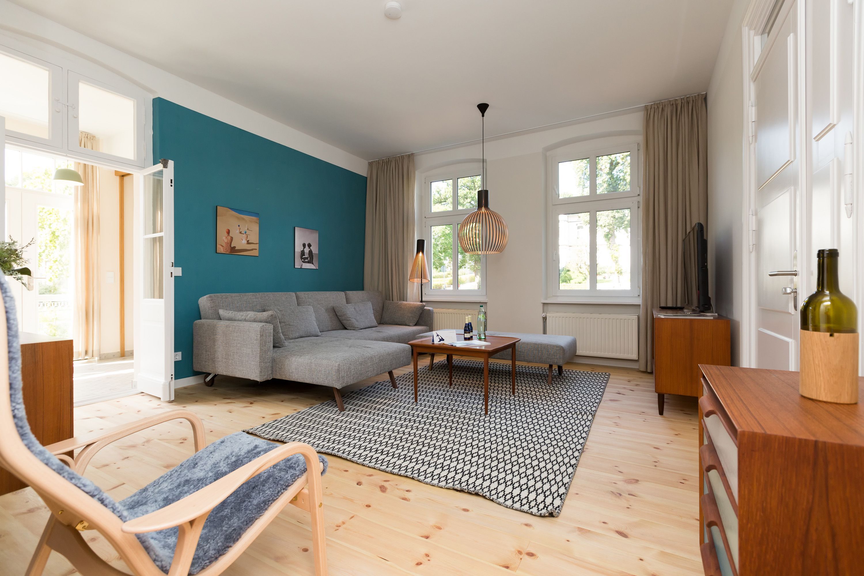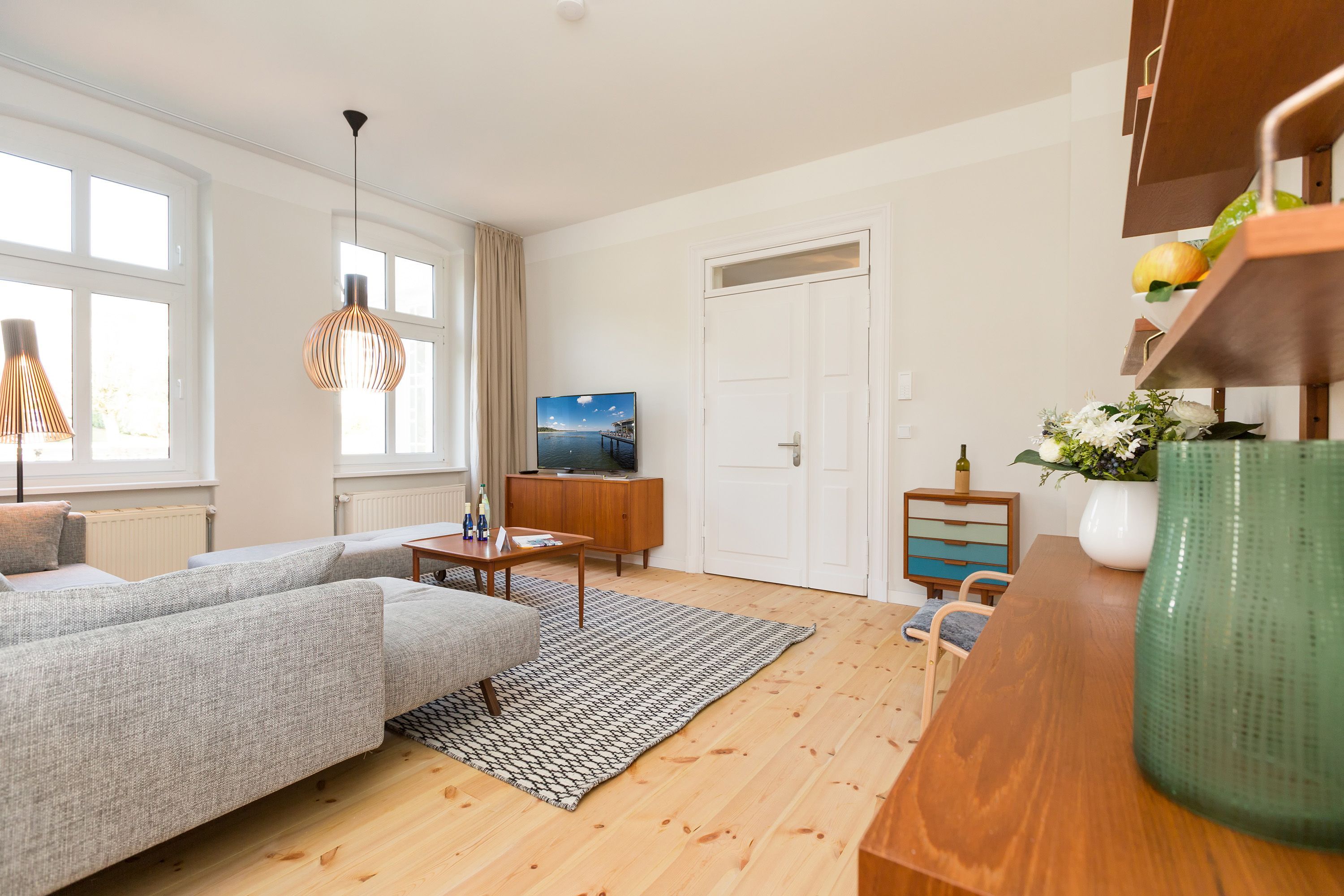 Ganz im angesagten Midcentury-Stil skandinavischer Klassiker ist die Wohnung 2 des Baltischen Hauses im Erdgeschoss gestaltet. Und das vom Feinsten. Ob Sideboards, Kommoden, Lampen, der große Wohnzimmer-Teppich mit geometrischem Muster, Regale und Wohnaccessoires in den 68 Quadratmetern, in denen zwei, maximal fünf Personen Platz haben, umgibt Sie stylisches Wohlfühldesign aus einem der architektonisch derzeit angesagtesten Jahrzehnte des 20. Jahrhunderts. Und das auf nachhaltige Art mit schadstoffgeprüften und hochwertigen Materialien. Nicht umsonst trägt das Appartement den Namen die gute alte Zeit. Denn die Innenarchitektin von Green Living hat das gesamte Appartement auf ein natürliches und ökologisch wertvolles Konzept hin abgestimmt. Keine schädlichen Lacke und Leime verpesten hier die Luft. Auch Allergiker können in diesem Urlaubsdomizil auf der gemütlichen Wohnlandschaft entspannend tief durchatmen. Ein großer Flat-TV gehört zur Ausstattung des großen und wunderbar hellen Wohnzimmers dazu. Ein absolutes Highlight der Wohnung ist die helle Veranda mit der offenen Küche und einem schönen Essbereich. Ausgestattet mit hochwertigen Blaupunkt-Geräten macht das Kochen und Dinieren in dieser Atmosphäre gleich noch einmal so viel Freude. Von hier aus geht es nicht nur auf die Außenterrasse mit Sitzmöglichkeit und Blick in den begrünten Garten, sondern auch in ein Gästezimmer mit Ledercouch. Die Couch kann zum Schlafsofa umfunktioniert werden. Für das Aufschreiben der Urlaubsgedanken eignet sich das String-Regal mit integriertem Schreibtisch ideal. Das Hauptschlafzimmer wartet mit einem bequemen Doppelbett (1,60 m x 2,00 m) nur darauf, Ihnen einen erholsamen Schlaf zu schenken. Ein großer Schrank bietet viel Ablagefläche. Das Badezimmer verfügt über eine geräumige Dusche, Waschtisch und Toilette. Handtücher liegen natürlich für Sie bereit. Ebenso sind die Betten bei Ihrer Ankunft bezogen und Handtücher liegen bereit (als Erstausstattung). Zur Wohnung gehört außerdem ein Außenstellplatz.