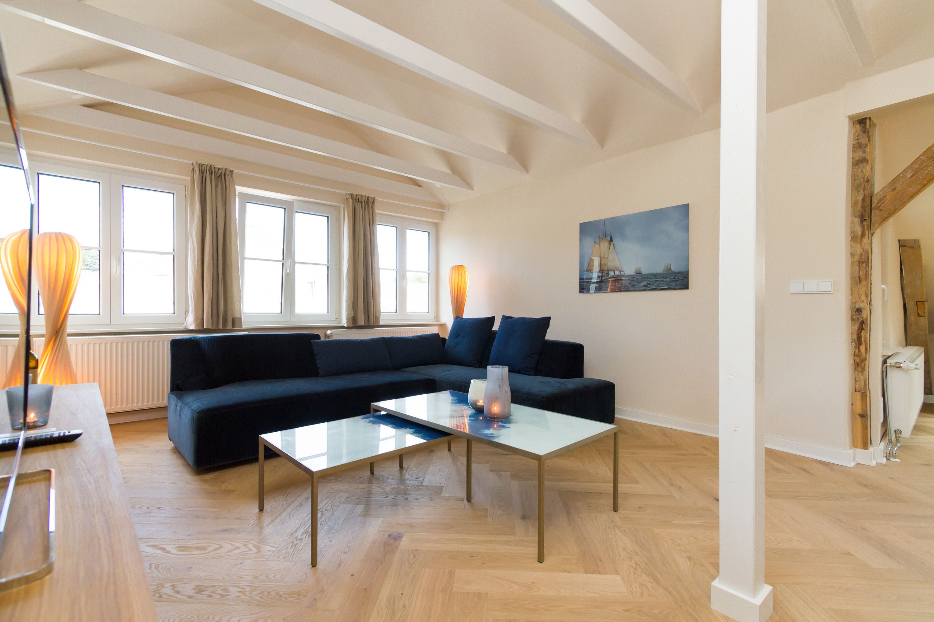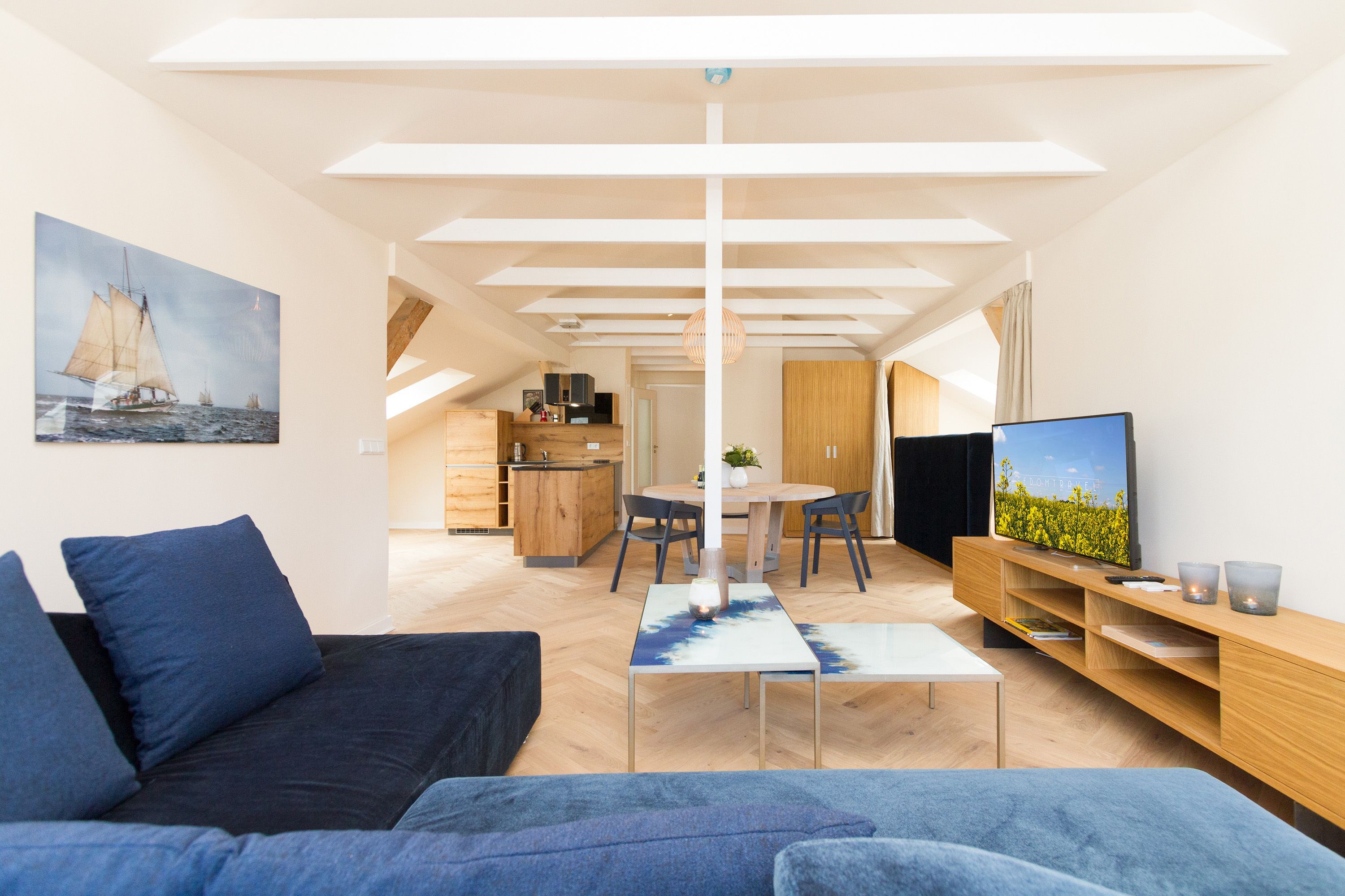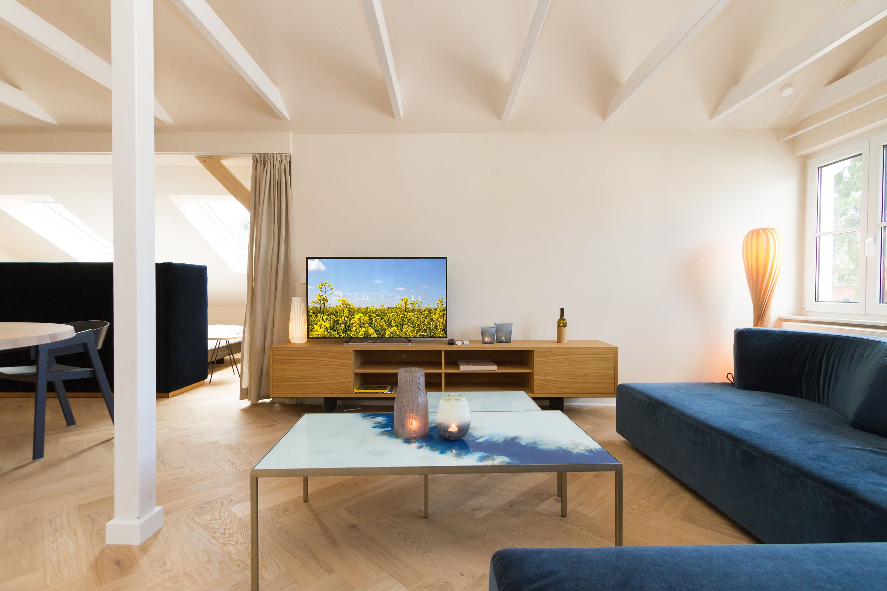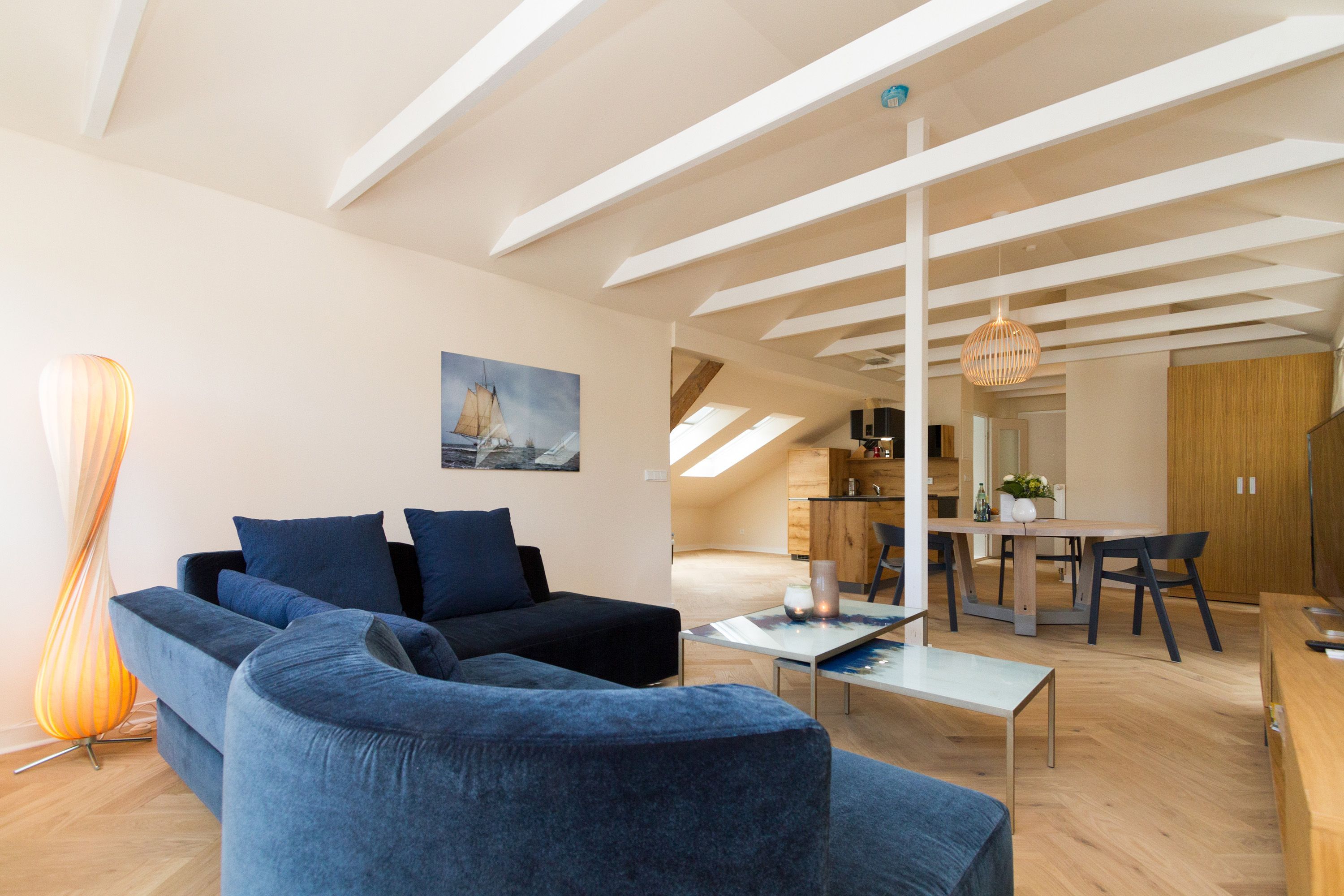 Grenzenlos frei - können Sie sich in der Wohnung Nummer 5 im Dachgeschoss des Baltischen Hauses fühlen. Das Loft außergewöhnlich und exklusiv bietet Ihnen auf 73 Quadratmetern einen Highclass-Urlaubstraum. Auch hier hat die Innenarchitektin von Green Living auf ein harmonisches Konzept aus modernstem und nachhaltigem Wohndesign gesetzt. Hochwertige Materialien wurden ohne schädliche Leime und Lacke zu edlen Design-Möbeln verarbeitet. Der Wohn-Essbereich mit dem offenen Dachstuhl ist geräumig und bietet viel Platz zum Entspannen. Lassen Sie sich auf die breite Wohnlandschaft fallen und genießen Sie Ihre Auszeit. Ein Flat-TV steht hier auf dem Sideboard. Besonders schön ist das Fischgrätenmuster des Eichenparketts. Der massive Echtholztisch mit den Design-Stühlen lädt zum gemütlichen Beisammensein und ausgiebigen Genießen ein. Die offene Küche ist mit allem ausgestattet, was des Hobbykochs Herz höher schlagen lässt. Nur eben einfach eine Spur stylischer. Denn in diesem Loft gibt es sogar für die Abzugshaube eine Fernbedienung. Ein urgemütliches Doppelbett (1,60 m x 2,00 m) sorgt für entspannte Urlaubsträume. Der Schlafbereich mit Kleiderschrank ist mittels eines Leinenvolants vom Wohnbereich abtrennbar. Das Appartement verfügt zusätzlich über ein großes Schlafsofa als Bett für zwei weitere Personen. Ein weiteres Daybed kann ebenfalls zum Übernachten genutzt werden. Zudem besteht die Möglichkeit ein Kinderreisebett unterzubringen. Moderne Metrokacheln und wunderschöne Mosaikbodenfliesen verleihen dem Bad ein exklusives Flair. Es ist mit einer geräumigen Dusche, Waschtisch und WC ausgestattet. Für die perfekte Auszeit, in der Sie sich um nichts kümmern müssen, liegen Handtücher für Sie bereit und das Bett ist bezogen (als Erstausstattung). In einem Hauswirtschaftsraum im Erdgeschoss, der vom gesamten Haus genutzt werden kann, steht eine Waschmaschine und ein Trockner zur Verfügung. Ein Pkw-Stellplatz im Parkhaus Heringsdorf (ca. 2 Gehminuten) ist im Preis enthalten.