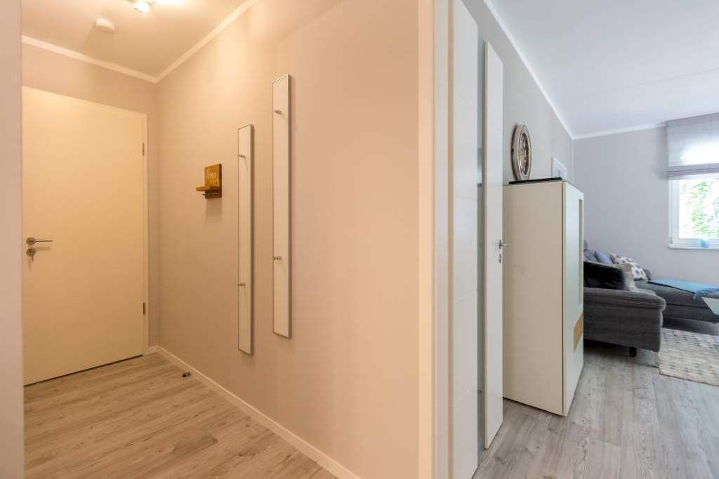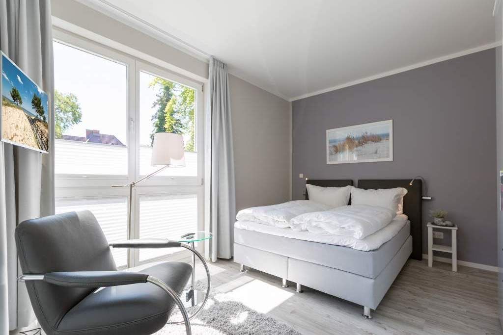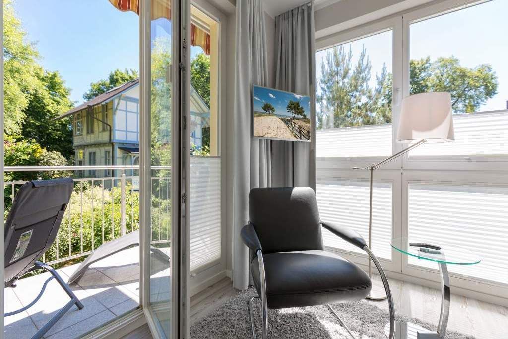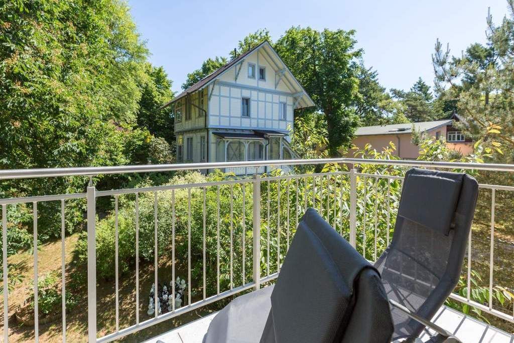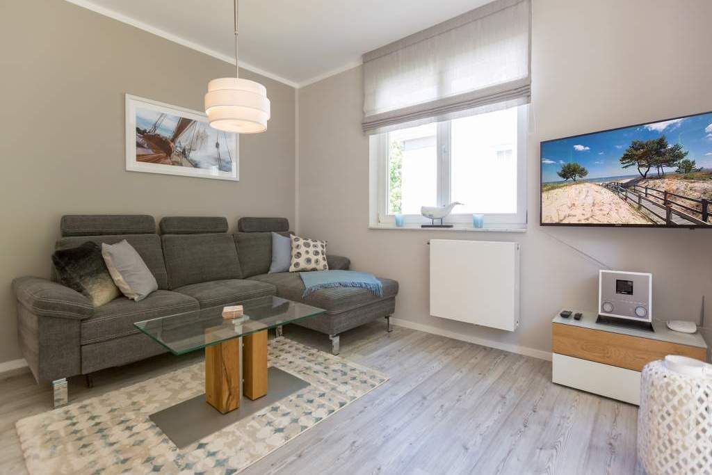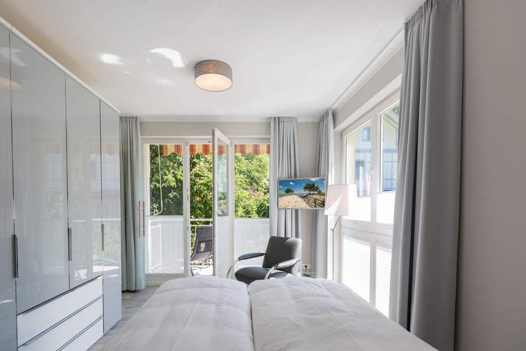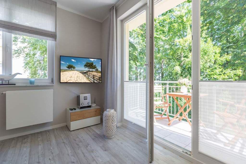 Durch das satte Grün der Bäume schimmert glitzernd blau die Ostsee hindurch. Morgens bei Sonnenschein auf dem Balkon zu sitzen, den Vögeln und dem Meeresrauschen zu lauschen, ist ein perfekter Start in den Urlaubstag. Ob allein oder zweit in diesem exklusiven und modernen Ferienappartement wird Ihre Erholung zum entspannten Genuss. Denn viel Platz, Leichtigkeit und Stil prägen die schick eingerichtete, 66 Quadratmeter große Wohnung. Hier gibt es nicht nur ein Highlight, das Ihre Ostseeauszeit zu etwas ganz Besonderem macht. Neben den beiden Balkonen vom Wohnzimmer aus und vom Schlafzimmer aus begehbar erwartet Sie hier eine kleine Wohlfühloase, die das ganze Jahr über ihre Reize hat. Gerade auch im Winter bietet dieses Urlaubsdomizil die Möglichkeit zur Entspannung. Wenn die Bäume kahl und starr vom kalten Nordost klirren und den Blick auf die schier endlose, in manchen Jahren sogar zugefrorene Ostsee frei geben, können Sie sich diese Landschaft aus dem Wohn- und dem Schlafzimmer, aber auch aus der kuschelig warmen Panorama-Sauna heraus anschauen. Denn auch die mit einem LED-Farblichtsystem versehene Sauna ( für finnischen Saunabetrieb und BIO-Betrieb mit Verdampfer) gehört zu der Wohnung Nummer 7 im 2. Obergeschoss der Villa Barbara dazu. Die unterschiedlichen Lichtstimmungen sorgen zusätzlich für Entspannung pur. Ruhe und Erholung finden Sie zudem in dem geräumigen Wohn-Esszimmer. Eine gemütliche Sofalandschaft lädt zum Relaxen vor dem großen Flat-TV ein. Eine Media-Anlage offeriert Internet Radio und Bluetooth Streaming. Das WLAN ist kostenfrei. Die offene Küche ist mit hochwertigen Geräten und Geschirr voll ausgestattet. Essen können Sie am schönen Echtholztisch. Die große, bodentiefe Fensterfront lässt viel Licht hinein. Echtes Schlafvergnügen gewährleistet im ebenso schönen Schlafzimmer ein komfortables Boxspringdoppelbett (1,60 m x 2,00 m). Viel Ablage bietet der große Kleiderschrank. Auch in diesem Zimmer befindet sich ein Flat-TV. Von hier aus haben Sie Zugang zu einem zweiten Balkon. Genießen Sie hier auf den Sonnenliegen den Sommer. Im Badezimmer steht Ihnen neben dem Zugang zur Sauna eine ebenerdige und sehr geräumige Regendusche, ein Waschtisch und ein WC zur Verfügung. Bei Ihrer Anreise liegen die Handtücher für Sie bereit und das Bett ist bezogen. Ein Pkw-Stellplatz befindet sich am Haus. Für den Tag am Strand steht Ihnen in den Sommermonaten ein Strandkorb (je nach Witterung) zur Verfügung.
