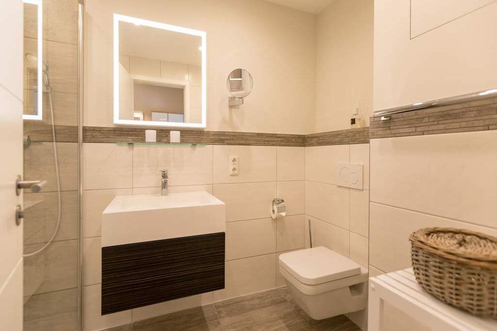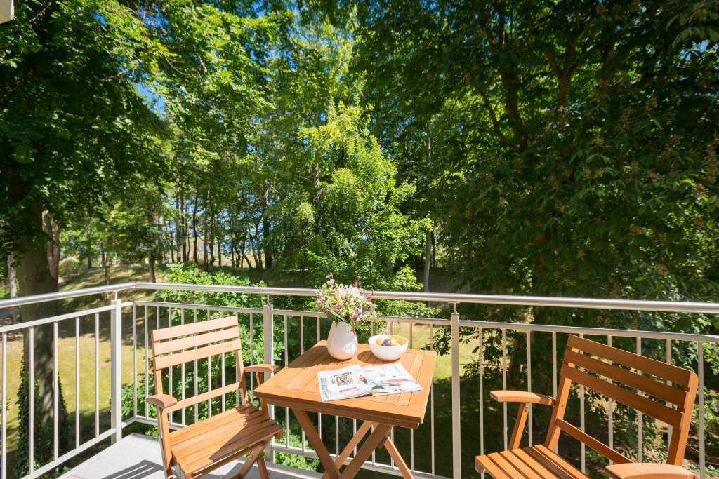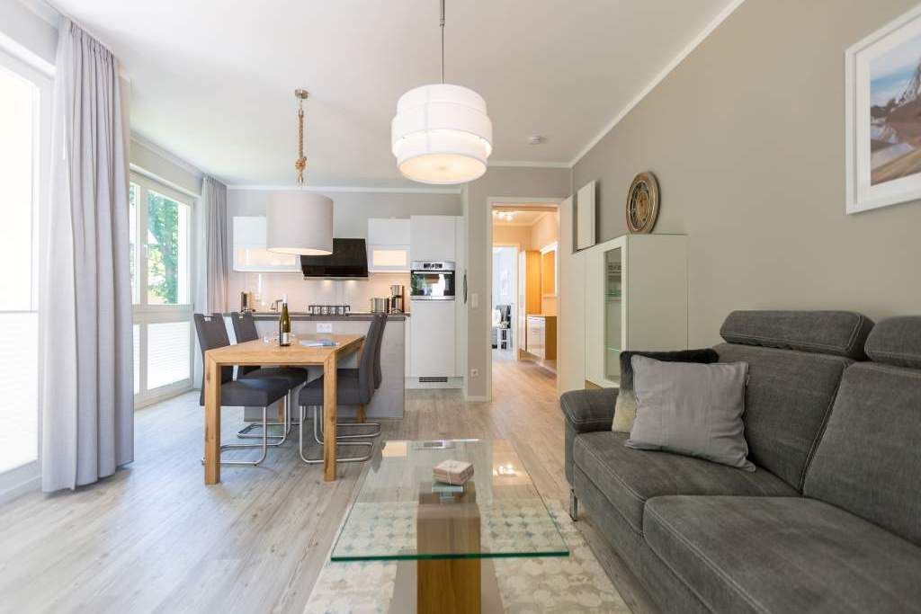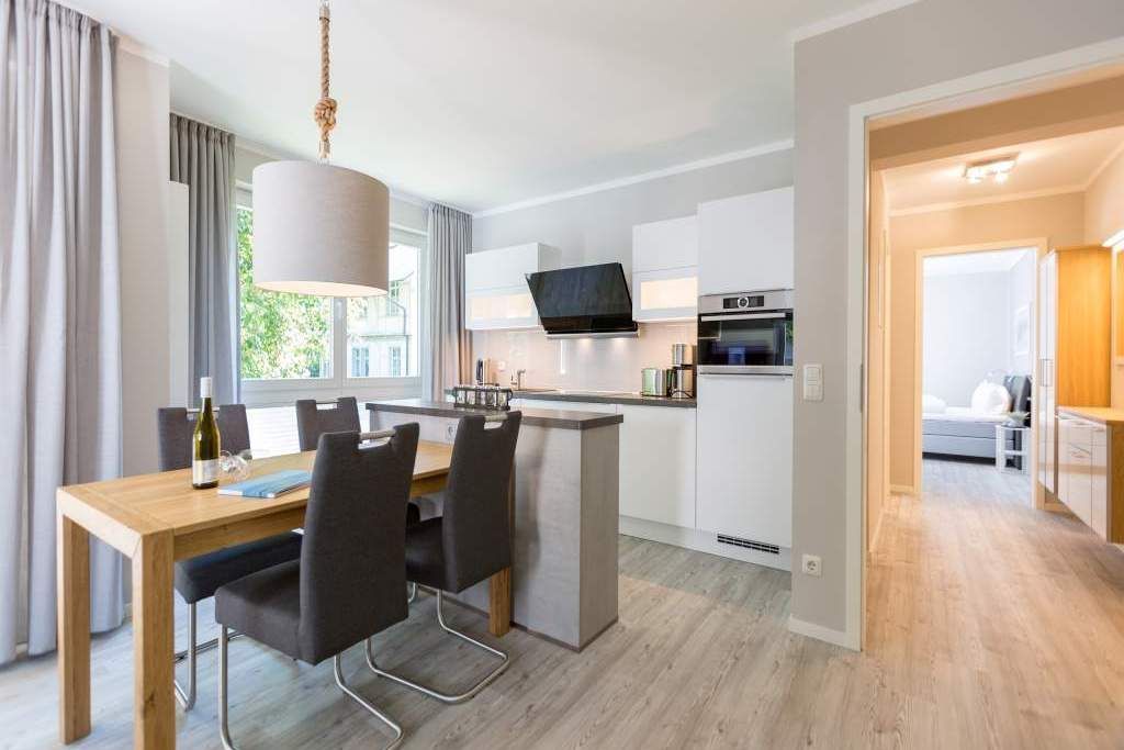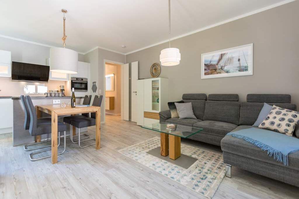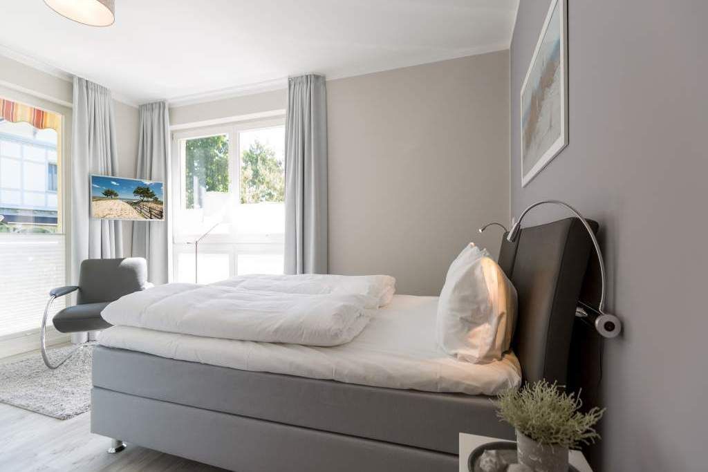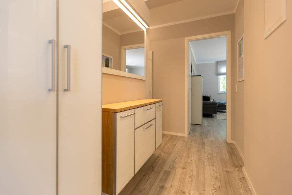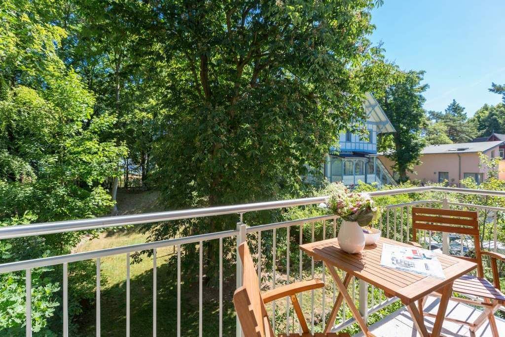 Durch das satte Grün der Bäume schimmert glitzernd blau die Ostsee hindurch. Morgens bei Sonnenschein auf dem Balkon zu sitzen, den Vögeln und dem Meeresrauschen zu lauschen, ist ein perfekter Start in den Urlaubstag. Ob allein oder zweit in diesem exklusiven und modernen Ferienappartement wird Ihre Erholung zum entspannten Genuss. Denn viel Platz, Leichtigkeit und Stil prägen die schick eingerichtete, 66 Quadratmeter große Wohnung. Hier gibt es nicht nur ein Highlight, das Ihre Ostseeauszeit zu etwas ganz Besonderem macht. Neben den beiden Balkonen vom Wohnzimmer aus und vom Schlafzimmer aus begehbar erwartet Sie hier eine kleine Wohlfühloase, die das ganze Jahr über ihre Reize hat. Gerade auch im Winter bietet dieses Urlaubsdomizil die Möglichkeit zur Entspannung. Wenn die Bäume kahl und starr vom kalten Nordost klirren und den Blick auf die schier endlose, in manchen Jahren sogar zugefrorene Ostsee frei geben, können Sie sich diese Landschaft aus dem Wohn- und dem Schlafzimmer, aber auch aus der kuschelig warmen Panorama-Sauna heraus anschauen. Denn auch die mit einem LED-Farblichtsystem versehene Sauna ( für finnischen Saunabetrieb und BIO-Betrieb mit Verdampfer) gehört zu der Wohnung Nummer 7 im 2. Obergeschoss der Villa Barbara dazu. Die unterschiedlichen Lichtstimmungen sorgen zusätzlich für Entspannung pur. Ruhe und Erholung finden Sie zudem in dem geräumigen Wohn-Esszimmer. Eine gemütliche Sofalandschaft lädt zum Relaxen vor dem großen Flat-TV ein. Eine Media-Anlage offeriert Internet Radio und Bluetooth Streaming. Das WLAN ist kostenfrei. Die offene Küche ist mit hochwertigen Geräten und Geschirr voll ausgestattet. Essen können Sie am schönen Echtholztisch. Die große, bodentiefe Fensterfront lässt viel Licht hinein. Echtes Schlafvergnügen gewährleistet im ebenso schönen Schlafzimmer ein komfortables Boxspringdoppelbett (1,60 m x 2,00 m). Viel Ablage bietet der große Kleiderschrank. Auch in diesem Zimmer befindet sich ein Flat-TV. Von hier aus haben Sie Zugang zu einem zweiten Balkon. Genießen Sie hier auf den Sonnenliegen den Sommer. Im Badezimmer steht Ihnen neben dem Zugang zur Sauna eine ebenerdige und sehr geräumige Regendusche, ein Waschtisch und ein WC zur Verfügung. Bei Ihrer Anreise liegen die Handtücher für Sie bereit und das Bett ist bezogen. Ein Pkw-Stellplatz befindet sich am Haus. Für den Tag am Strand steht Ihnen in den Sommermonaten ein Strandkorb (je nach Witterung) zur Verfügung.