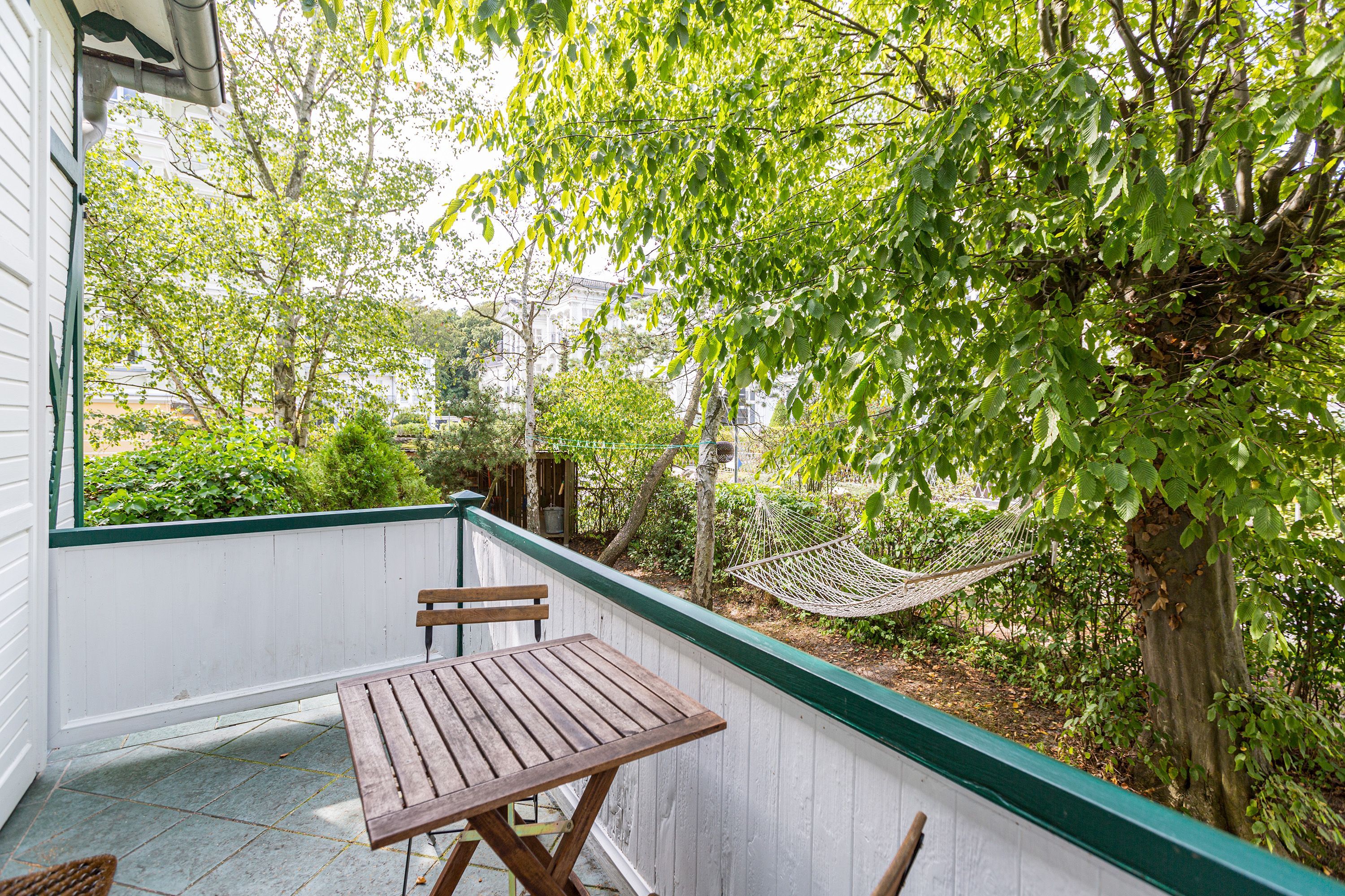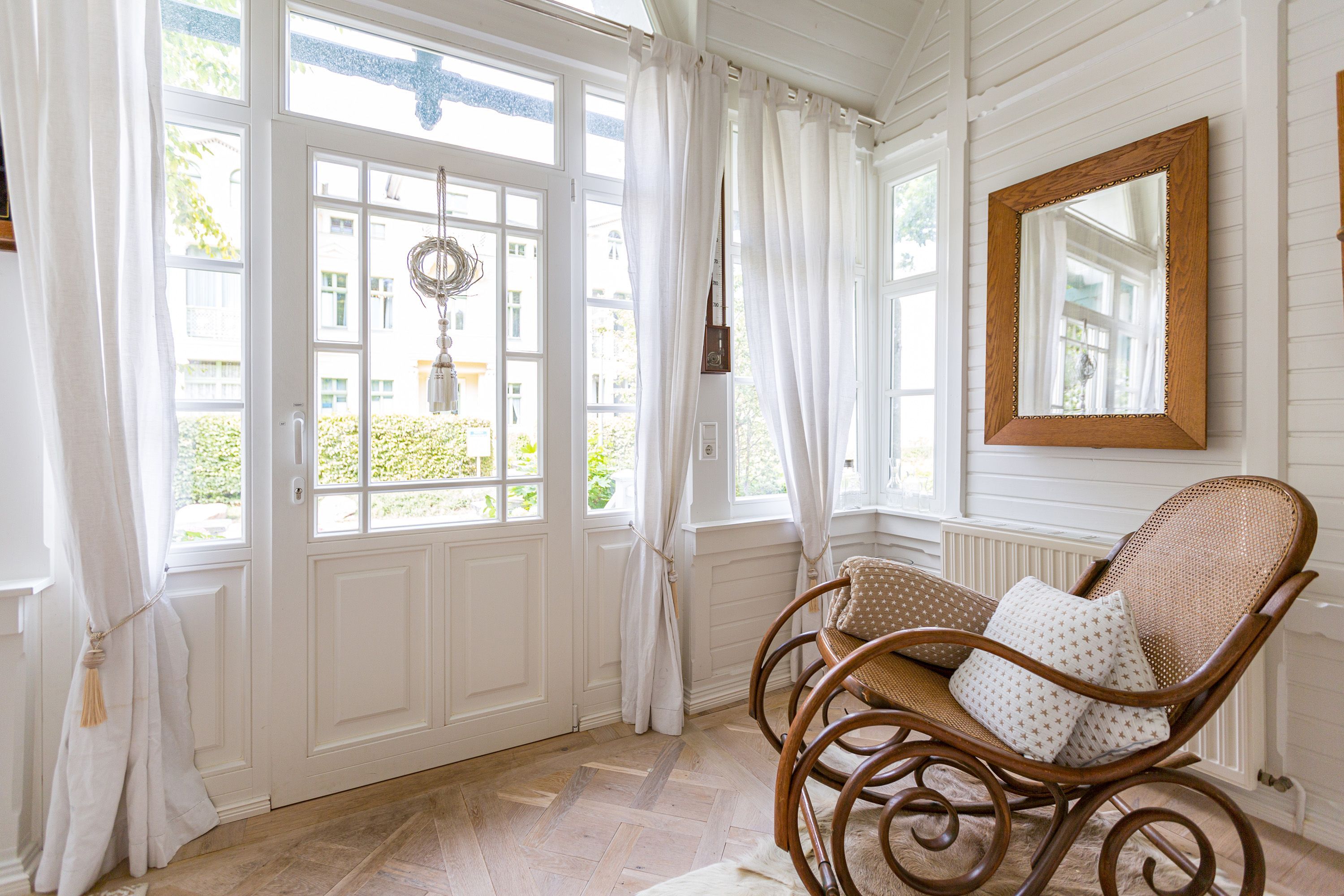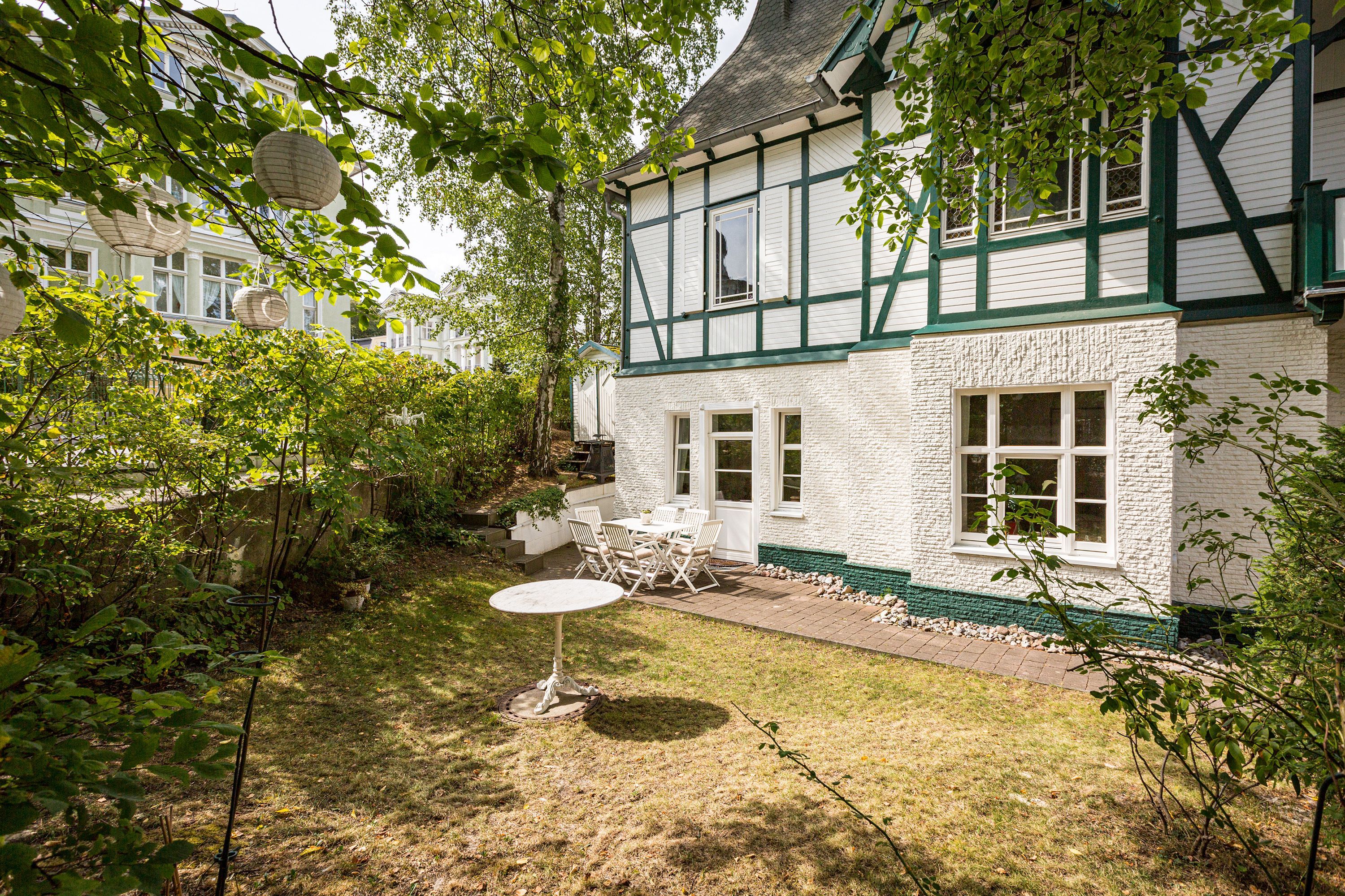 Wohnen in einem kleinen Schlösschen ganz dicht am Meer - das können Sie im idyllischen Strandschlösschen mit seinen 3 Schlafzimmern ideal. Das rundum sanierte Schmuckstück der Bäderarchitektur aus Holz vom Ende des 19. Jahrhunderts bietet über drei Etagen viel Platz für bis zu 6 Personen und zwei Kleinkinder * bis zwei Jahre (im Kinderreisebett). Die Haustür auf der Gartenetage öffnet sich und Sie werden sich fühlen wie in eine andere Zeit versetzt. Alles genügt natürlich mondernstem Wohnkomfort. Und dennoch ist es, als wandle man durch die Räume einer längst vergangenen und luxuriös glamourösen Epoche. Tauchen Sie ein in dieses „Zur Sommerfrische an die Ostsee - Urlaubsgefühl“. Auf dieser unteren Etage finden Sie die beiden charmanten Schlafzimmer, die mit Doppelbetten (1,60 m breit) ausgestattet sind. Das hintere Schlafzimmer (1x Durchgangszimmer) verfügt über einen Zugang zur Terrasse. Kommoden und ein geräumiger Einbauschrank auf dem Flur bieten hier Stauraum. Ein kleines Gäste-WC und ein außergewöhnliches Bad mit verspiegelter Wand, Glasdusche und traumhafter Löwenfuß-Badewanne ergänzen das untere Geschoss. Über eine schöne Holztreppe gelangt man in die mittlere Etage. Das wundervoll aufgearbeitete Parkett verleiht dieser Etage ein exklusives und warmes Flair. Nur die separate Küche ist mit einem alten Kachelboden versehenen und mit hochwertigen Markengeräten voll ausgestattet. In den großen, amerikanischen Kühlschrank von Smeg passt viel hinein, was den Magen erfreut. Auch sonst finden Sie dort alles, was zum Kochen und Speisen benötigt wird. Ganz besonders schön ist hier der kleine hölzerne Balkon zur Ostseite. Auf der kleinen Bank genießt man in Ruhe den ersten Kaffee. Gleich nebenan befindet sich das wunderschöne Esszimmer mit antikem Esstisch und einem eleganten, antiken Kachelofen. Das angrenzende Wohnzimmer, das mit seinen vielen Bücherregalen und der Sitzgruppe wie ein Salon aus Kaisers Zeiten anmutet, ist ein absoluter Ruhepol. Ein Flat TV mit DVD Player wurde hier gekonnt im Schrank versteckt. Vom kleinen Balkon mit Sitzmöbeln schaut man auf den umgebenden Garten mit Hängematte. Über eine kleine Veranda führt eine zweite Haustür direkt auf den Weg zum Strand. Ganz nach oben gelangt man über eine enge, steile Holztreppe. Aber der Aufstieg lohnt sich, denn direkt unter dem Dach mit offener und reich verzierter Balkendecke befindet sich ein kleines Studio mit zwei Einzelbetten. Der weiße, stylische Barcelona-Chair mit dazugehörigem Hocker ist eine kleine Ruhe Oase. Ein angrenzendes Bad mit Dusche und WC komplettiert diese Etage. Bei Anreise sind die Betten bereits bezogen und Handtücher liegen bereit. Zwei Außenstellplätze befinden sich am Haus. Das einzige, was Sie nun noch tun müssen, ist anzukommen und sich wohlzufühlen.