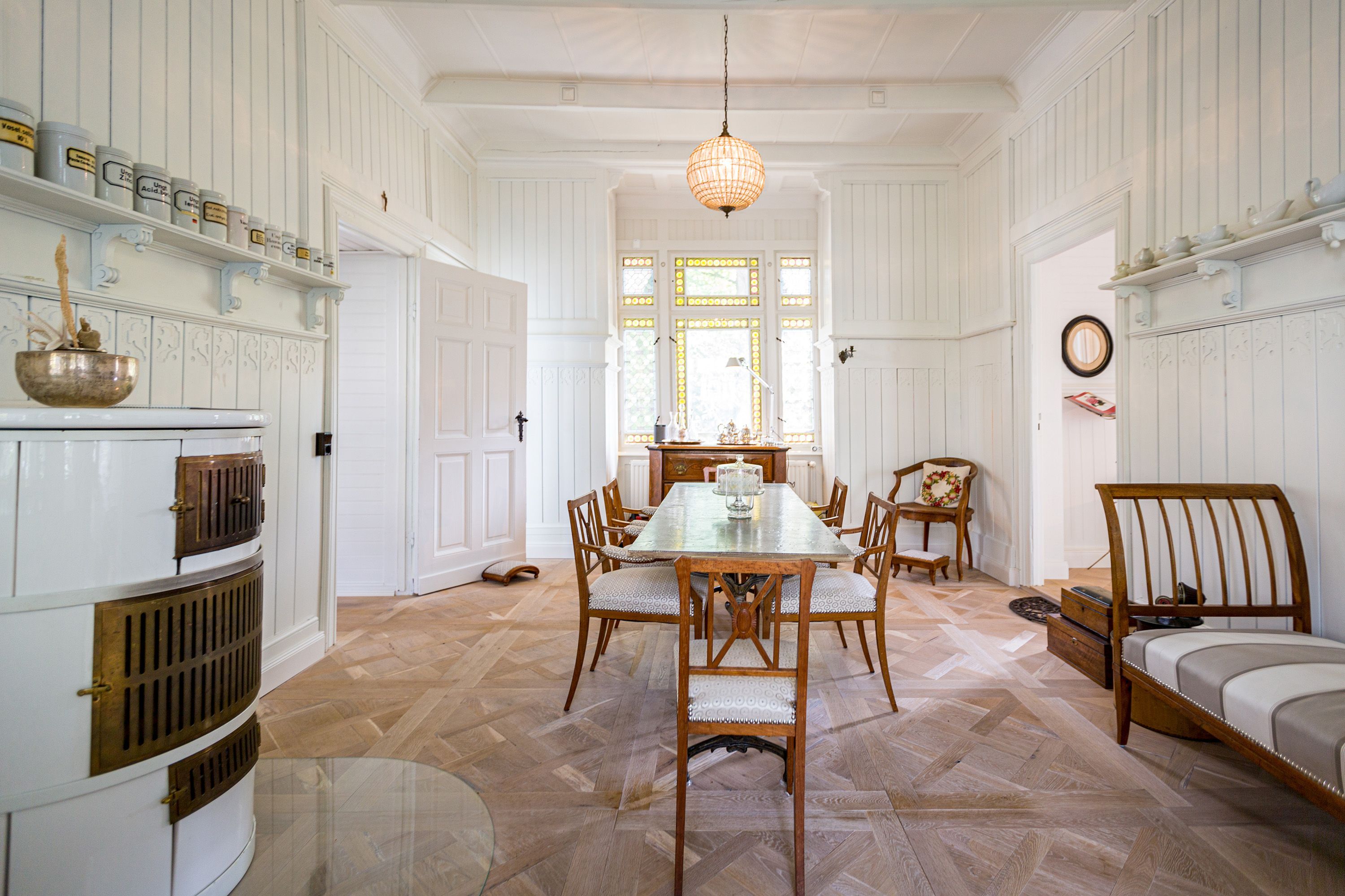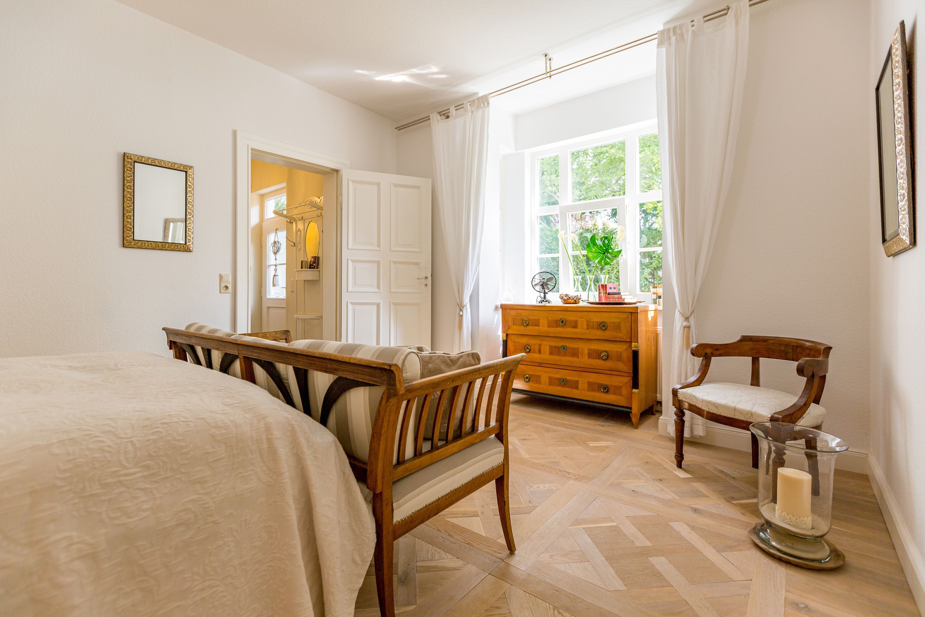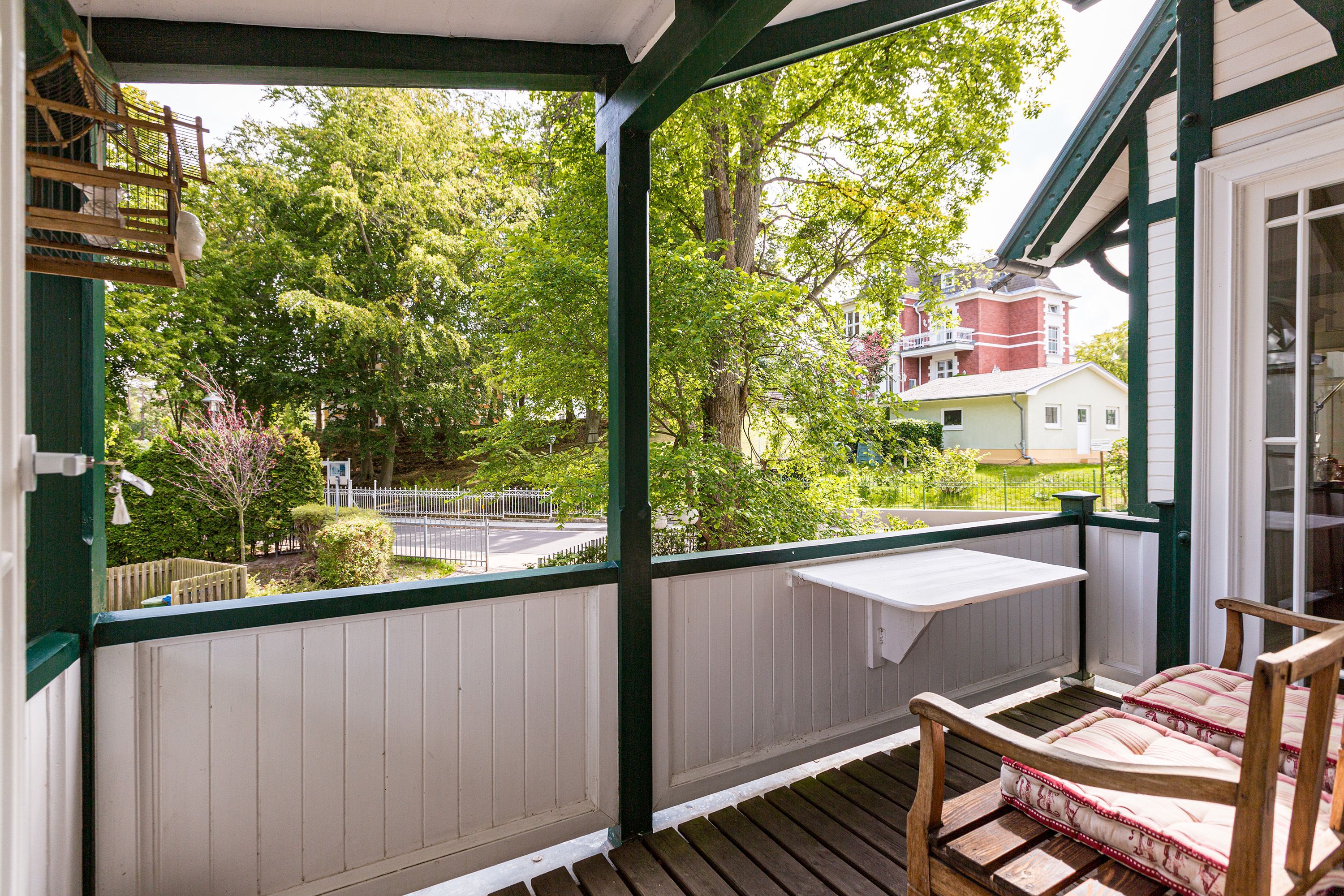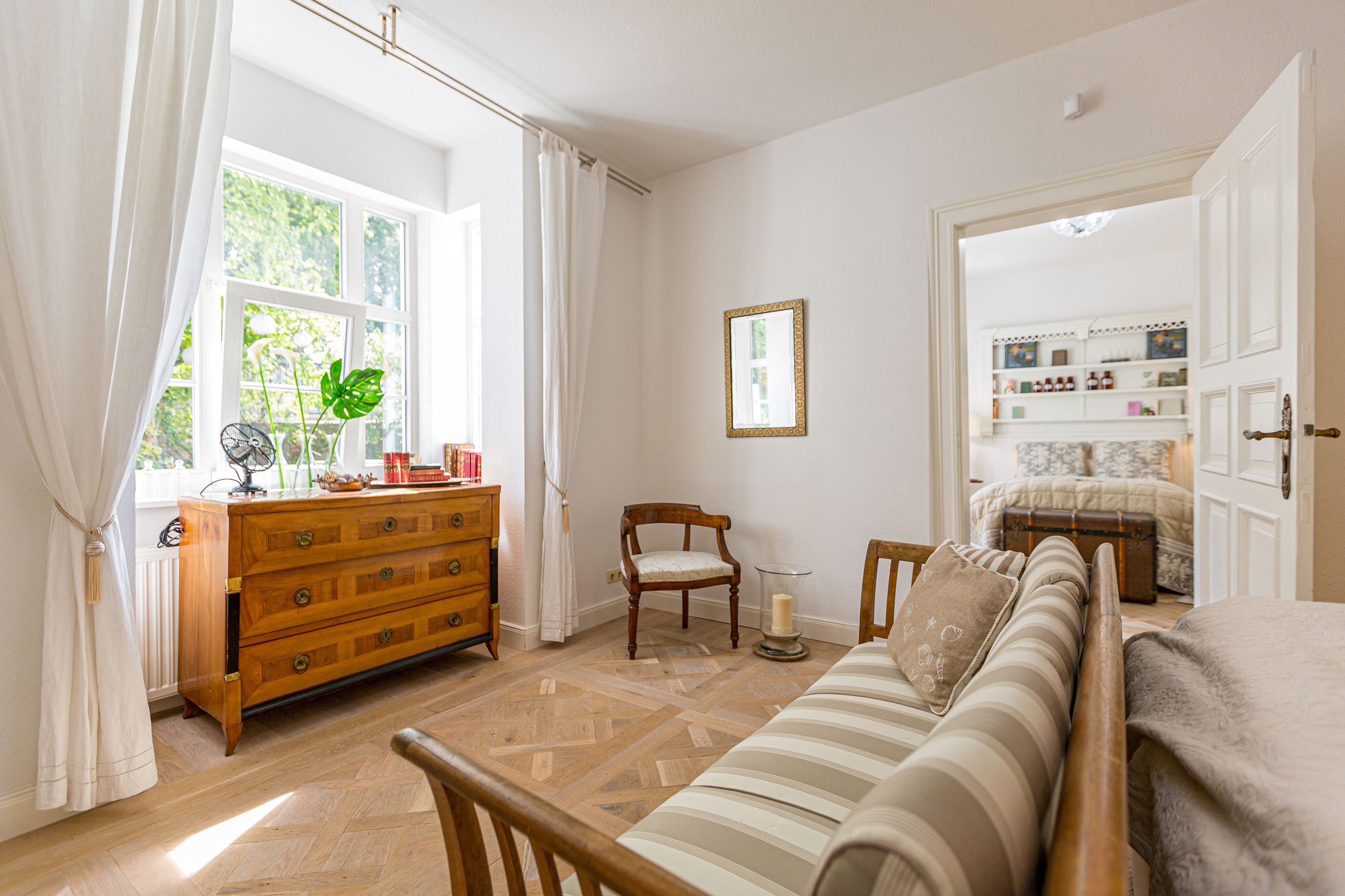 Wohnen in einem kleinen Schlösschen ganz dicht am Meer - das können Sie im idyllischen Strandschlösschen mit seinen 3 Schlafzimmern ideal. Das rundum sanierte Schmuckstück der Bäderarchitektur aus Holz vom Ende des 19. Jahrhunderts bietet über drei Etagen viel Platz für bis zu 6 Personen und zwei Kleinkinder * bis zwei Jahre (im Kinderreisebett). Die Haustür auf der Gartenetage öffnet sich und Sie werden sich fühlen wie in eine andere Zeit versetzt. Alles genügt natürlich mondernstem Wohnkomfort. Und dennoch ist es, als wandle man durch die Räume einer längst vergangenen und luxuriös glamourösen Epoche. Tauchen Sie ein in dieses „Zur Sommerfrische an die Ostsee - Urlaubsgefühl“. Auf dieser unteren Etage finden Sie die beiden charmanten Schlafzimmer, die mit Doppelbetten (1,60 m breit) ausgestattet sind. Das hintere Schlafzimmer (1x Durchgangszimmer) verfügt über einen Zugang zur Terrasse. Kommoden und ein geräumiger Einbauschrank auf dem Flur bieten hier Stauraum. Ein kleines Gäste-WC und ein außergewöhnliches Bad mit verspiegelter Wand, Glasdusche und traumhafter Löwenfuß-Badewanne ergänzen das untere Geschoss. Über eine schöne Holztreppe gelangt man in die mittlere Etage. Das wundervoll aufgearbeitete Parkett verleiht dieser Etage ein exklusives und warmes Flair. Nur die separate Küche ist mit einem alten Kachelboden versehenen und mit hochwertigen Markengeräten voll ausgestattet. In den großen, amerikanischen Kühlschrank von Smeg passt viel hinein, was den Magen erfreut. Auch sonst finden Sie dort alles, was zum Kochen und Speisen benötigt wird. Ganz besonders schön ist hier der kleine hölzerne Balkon zur Ostseite. Auf der kleinen Bank genießt man in Ruhe den ersten Kaffee. Gleich nebenan befindet sich das wunderschöne Esszimmer mit antikem Esstisch und einem eleganten, antiken Kachelofen. Das angrenzende Wohnzimmer, das mit seinen vielen Bücherregalen und der Sitzgruppe wie ein Salon aus Kaisers Zeiten anmutet, ist ein absoluter Ruhepol. Ein Flat TV mit DVD Player wurde hier gekonnt im Schrank versteckt. Vom kleinen Balkon mit Sitzmöbeln schaut man auf den umgebenden Garten mit Hängematte. Über eine kleine Veranda führt eine zweite Haustür direkt auf den Weg zum Strand. Ganz nach oben gelangt man über eine enge, steile Holztreppe. Aber der Aufstieg lohnt sich, denn direkt unter dem Dach mit offener und reich verzierter Balkendecke befindet sich ein kleines Studio mit zwei Einzelbetten. Der weiße, stylische Barcelona-Chair mit dazugehörigem Hocker ist eine kleine Ruhe Oase. Ein angrenzendes Bad mit Dusche und WC komplettiert diese Etage. Bei Anreise sind die Betten bereits bezogen und Handtücher liegen bereit. Zwei Außenstellplätze befinden sich am Haus. Das einzige, was Sie nun noch tun müssen, ist anzukommen und sich wohlzufühlen.