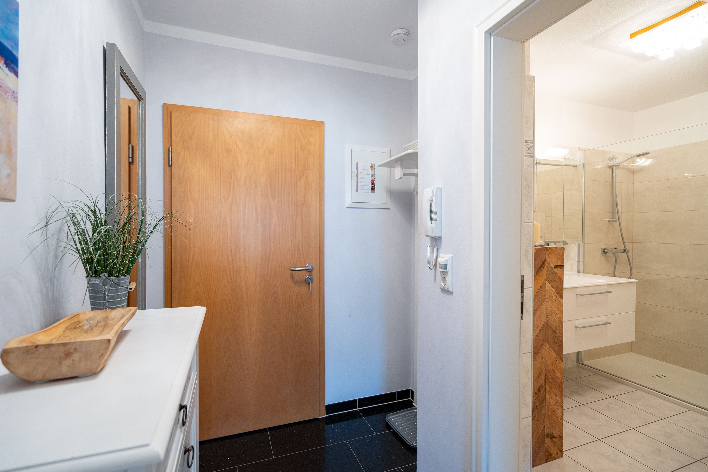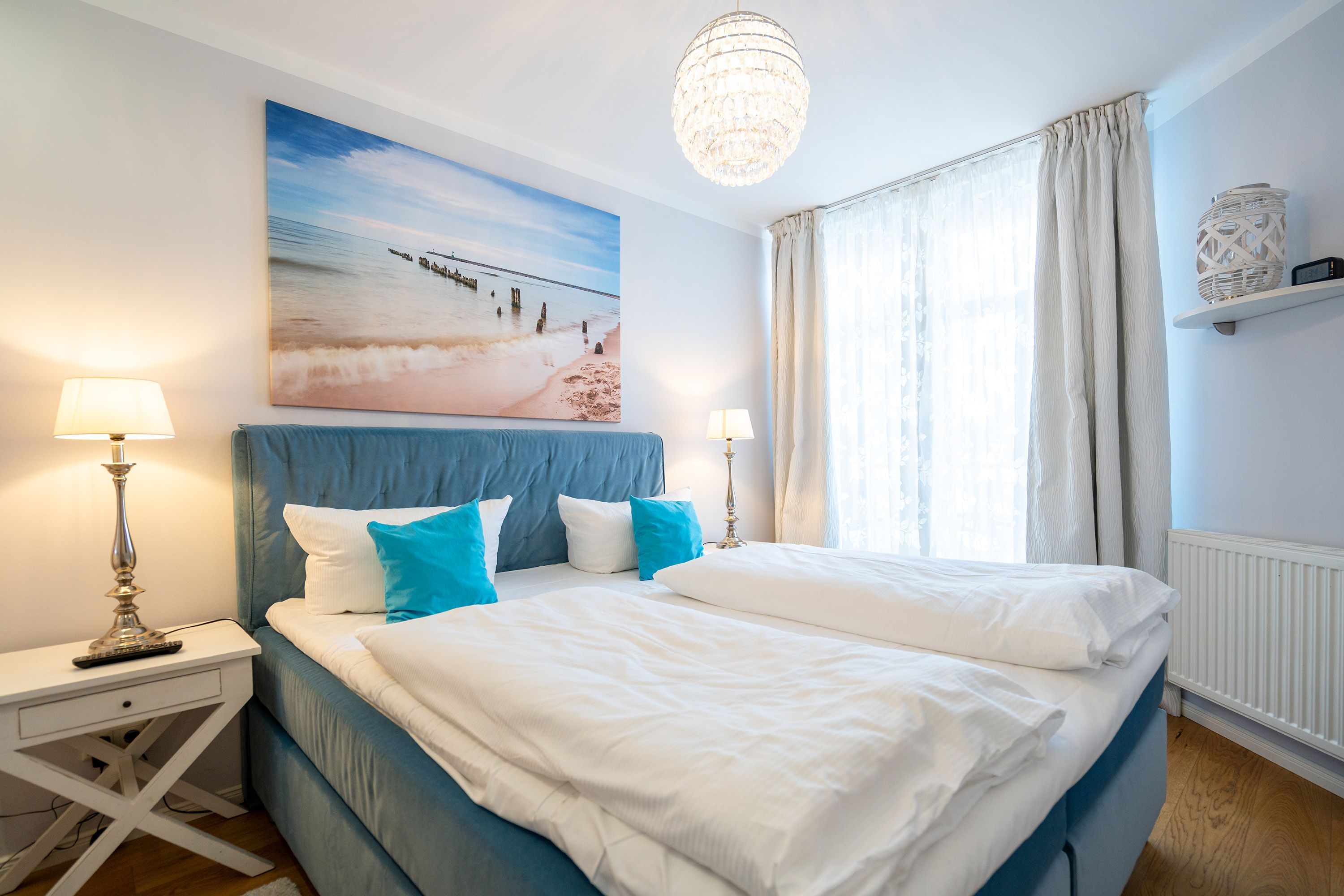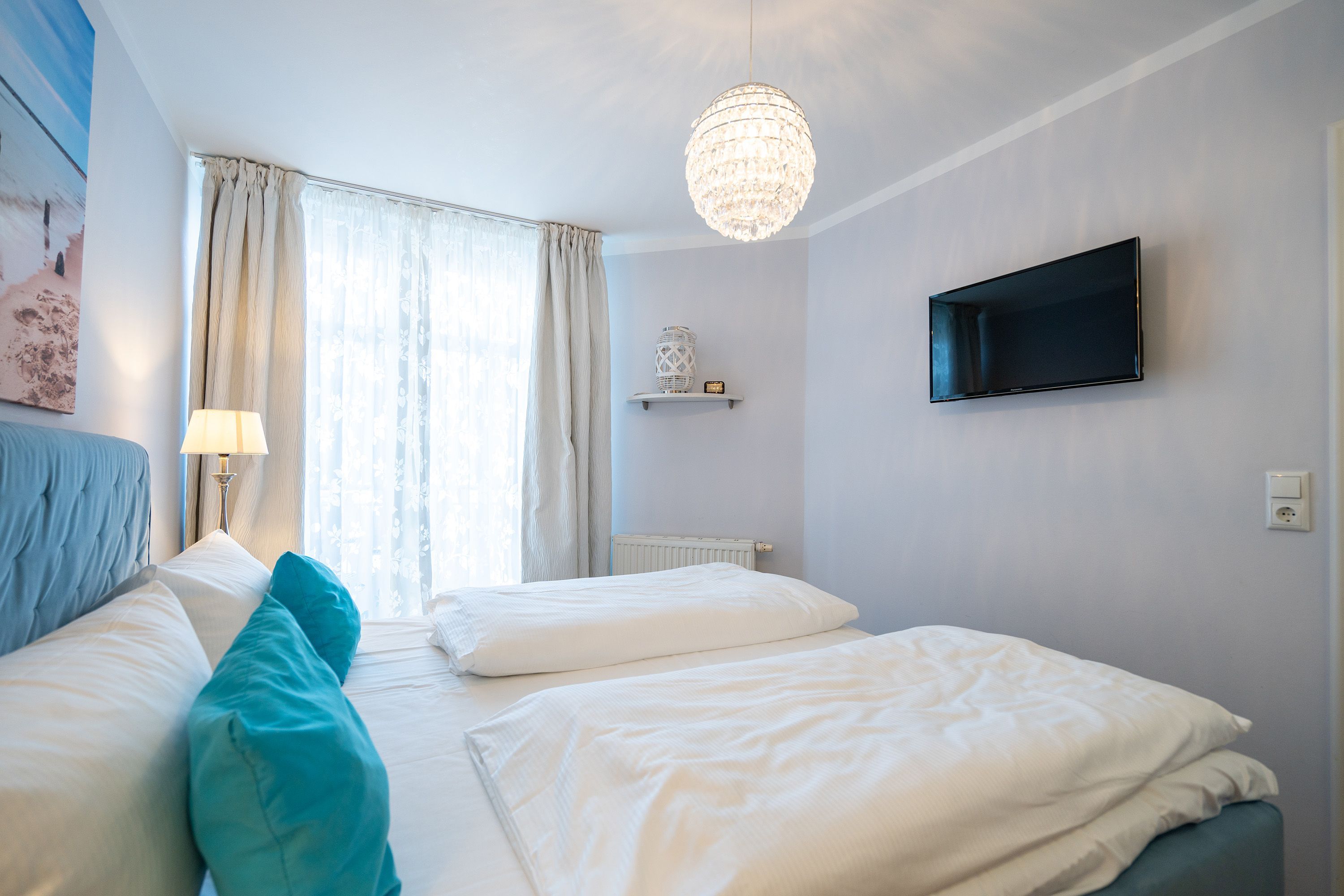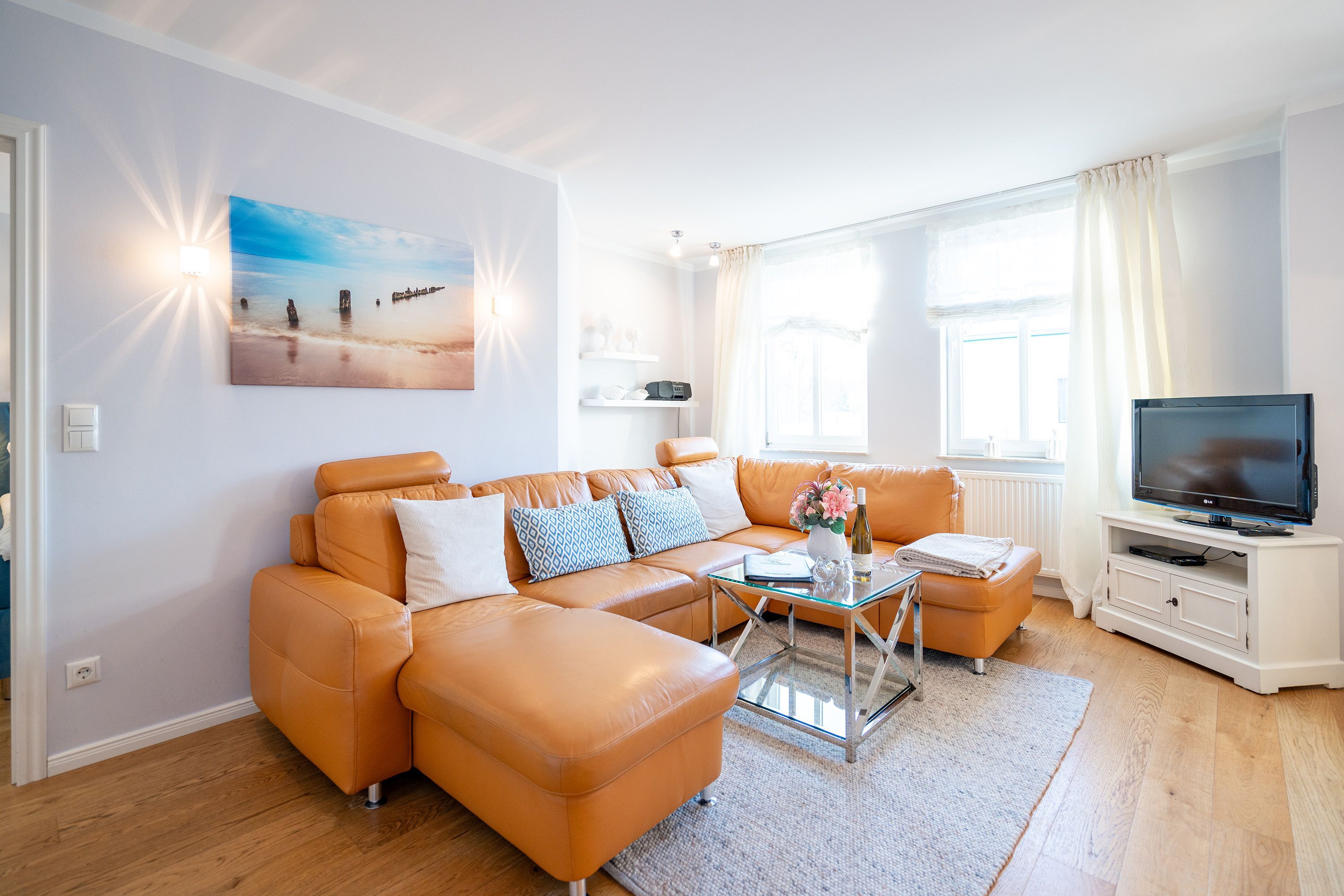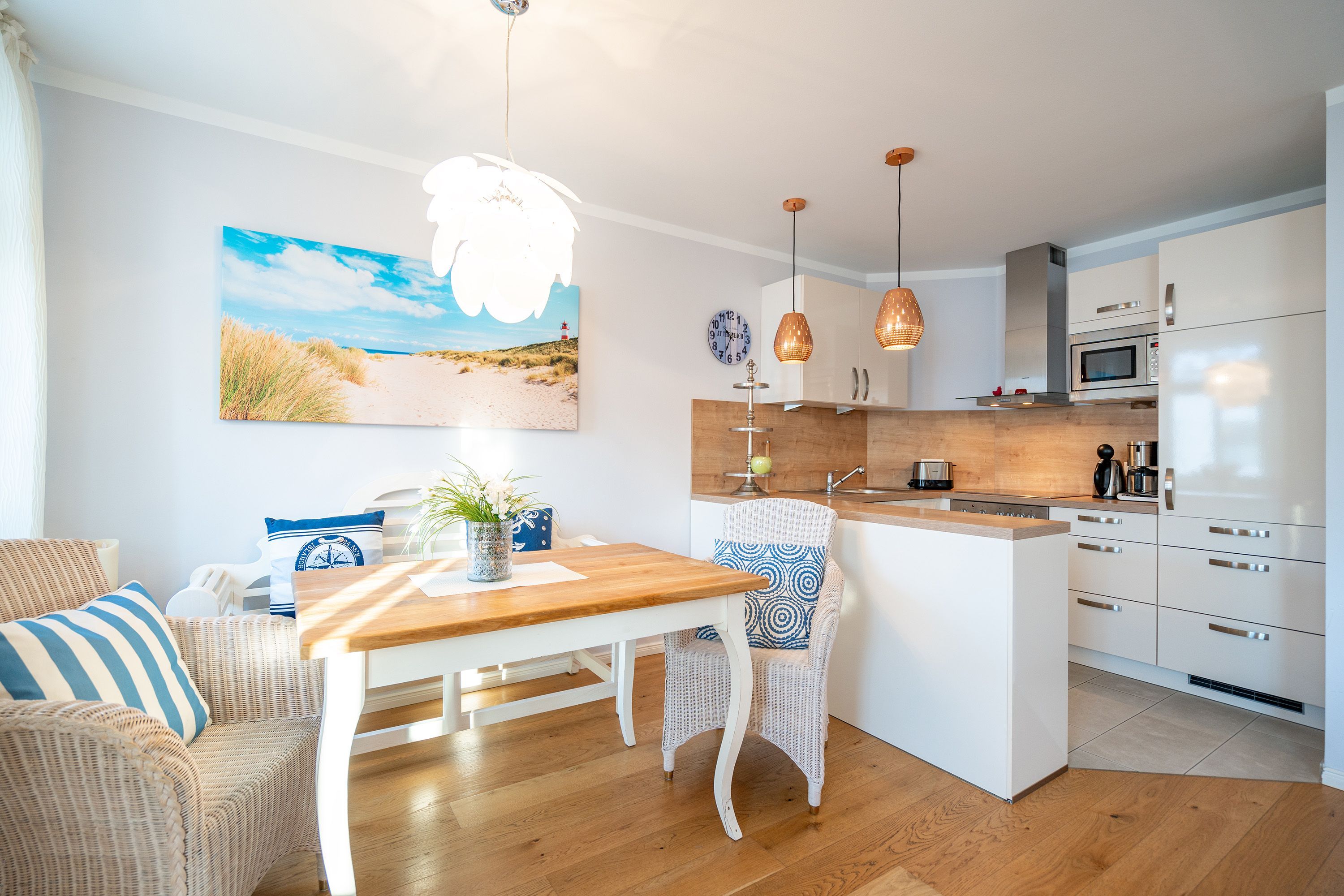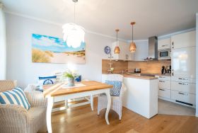 Eintreten und wohlfühlen! Dieses 2-Raumappartement (50 qm) im 1. Obergeschoss bietet für 2 Personen und ein 1 Kind (als Aufbettung auf der bequemen Schlafcouch im Wohnbereich) ein ideales Urlaubsdomizil. Liebevoll gestaltet und sehr wertig eingerichtet, sorgen abgestimmte Stoffe, Farben und Dekorationen für die richtige Urlaubsatmosphäre. Schon beim Eintreten offeriert sich durch die Glastür der schöne Wohnbereich. Eine großzügige Sitzgruppe lädt zum Relaxen vor dem Flat Smart TV ein. Neben der komplett ausgestatteten Küchenzeile lädt der liebevoll arrangierte Essplatz zum Verweilen ein. Erholung garantiert das Schlafzimmer, das mit komfortablen Doppelboxspringbett mit Talalay-Latex-Topper, wertigen großen Schiebeschrank und Flat-Smart-TV ausgestattet ist. Ein besonderes Highlight ist ein Sternenhimmel, den ein österreichischer Künstler an die Zimmerdecke gemalt hat. Tagsüber ist er nicht zu sehen, aber nachts, wenn sich Ihre Augen an die Dunkelheit gewöhnt haben, entfaltet er seine ganze dezente Pracht. Von hier hat man Zugang zum kleinen Südbalkon. Ein modernes Bad mit Dusche ergänzt das Appartement. Für Ihren Komfort sind die Betten bei Ihrer Anreise bezogen und die Erstausstattung Wäsche steht für Sie bereit. Das WLAN-Netz ist kostenfrei nutzbar.