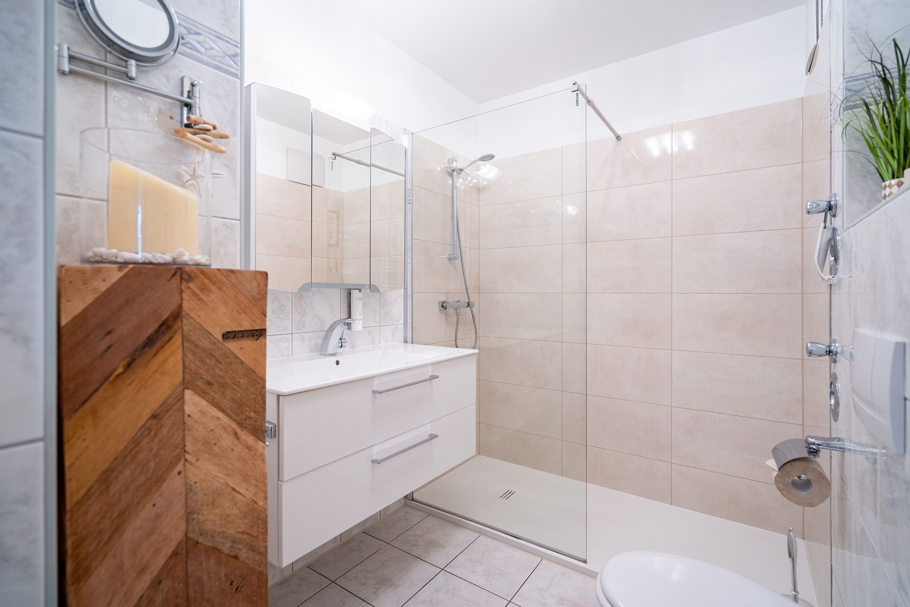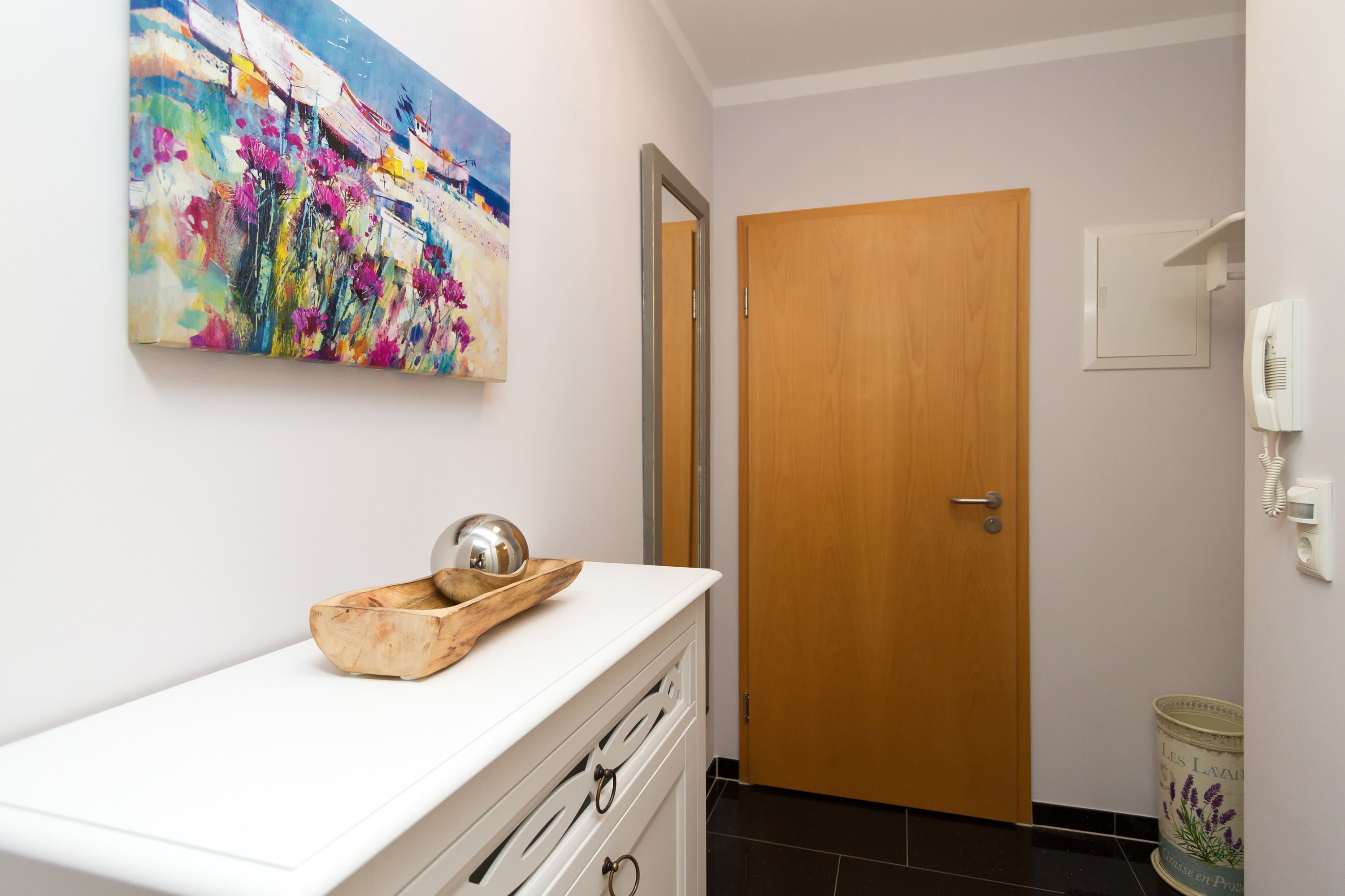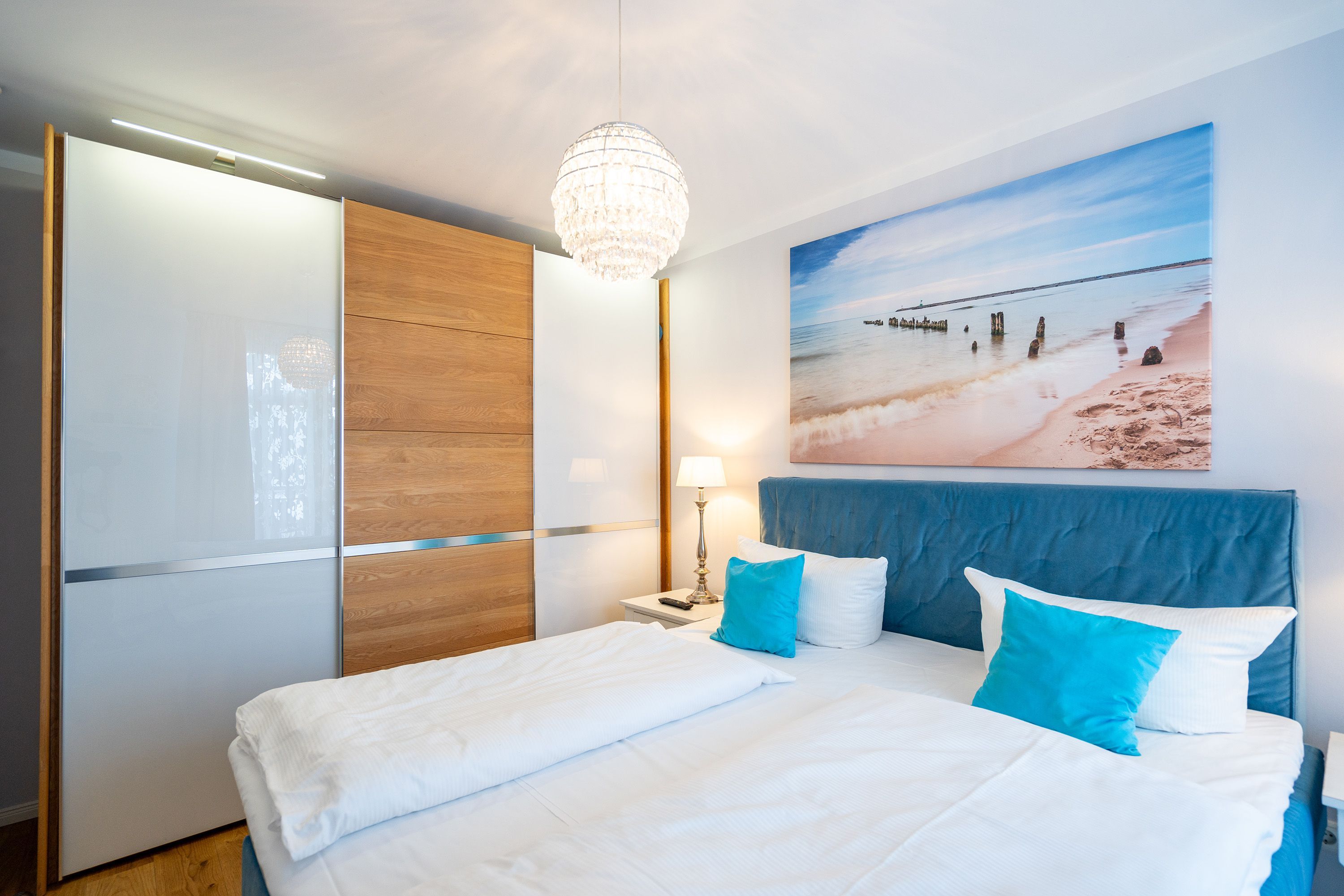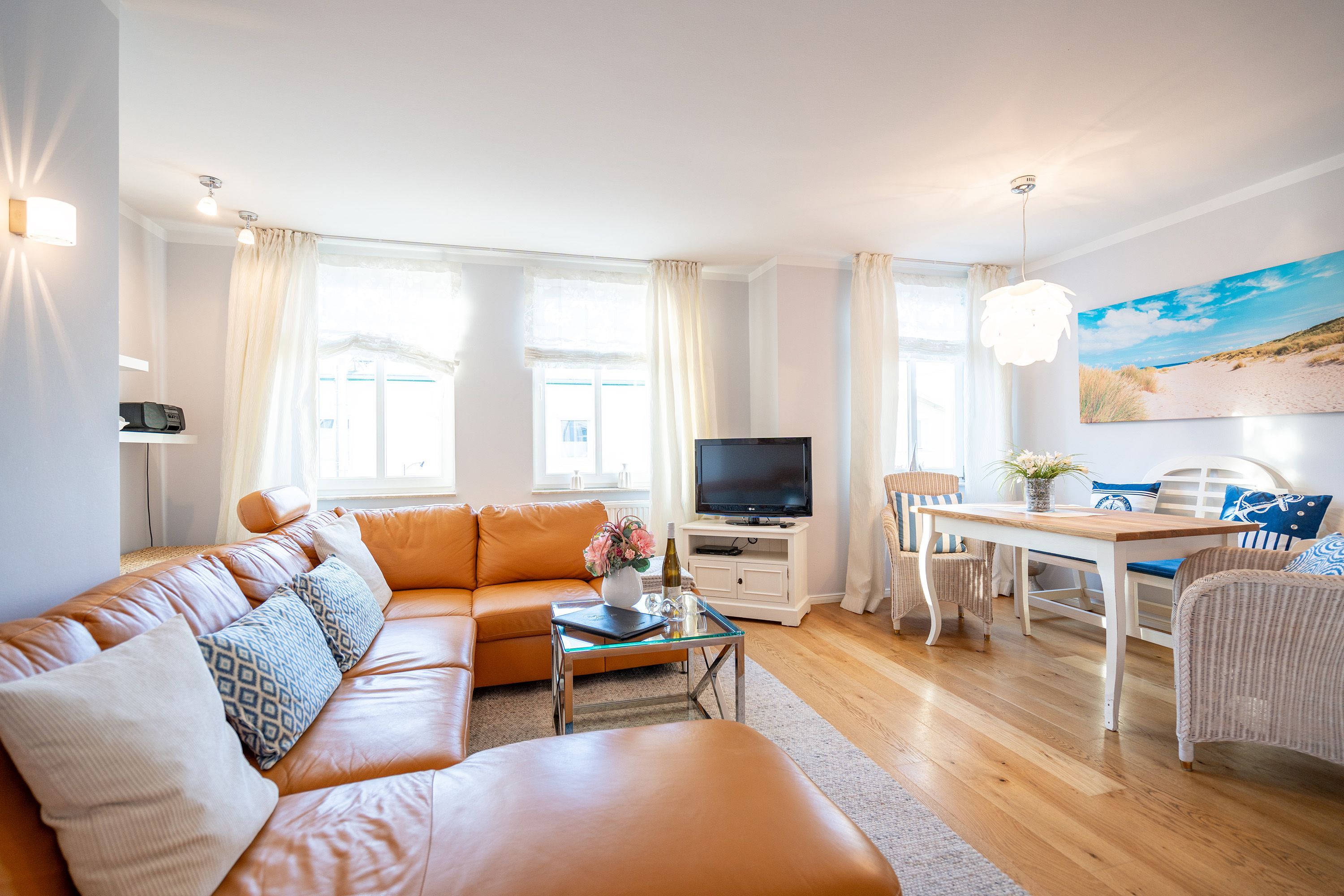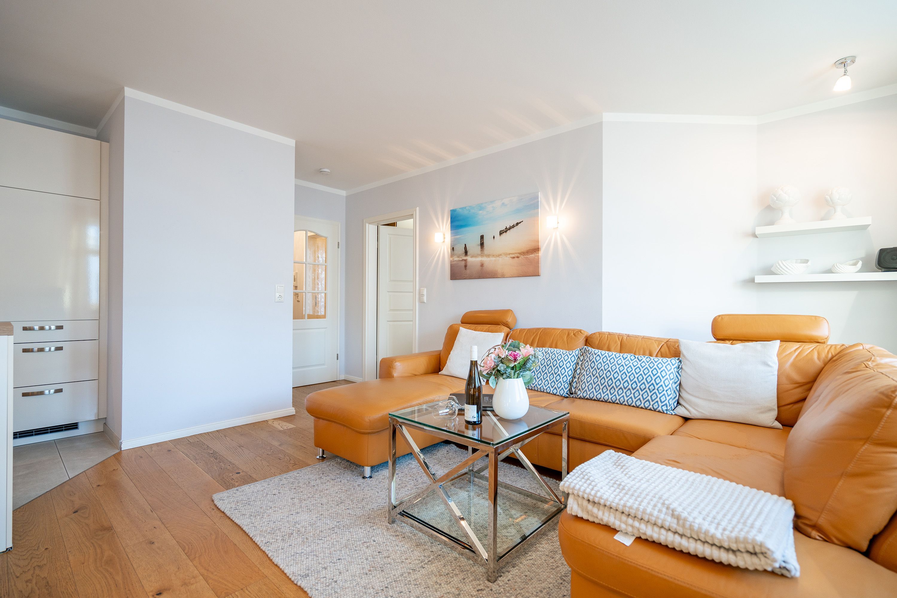 Eintreten und wohlfühlen! Dieses 2-Raumappartement (50 qm) im 1. Obergeschoss bietet für 2 Personen und ein 1 Kind (als Aufbettung auf der bequemen Schlafcouch im Wohnbereich) ein ideales Urlaubsdomizil. Liebevoll gestaltet und sehr wertig eingerichtet, sorgen abgestimmte Stoffe, Farben und Dekorationen für die richtige Urlaubsatmosphäre. Schon beim Eintreten offeriert sich durch die Glastür der schöne Wohnbereich. Eine großzügige Sitzgruppe lädt zum Relaxen vor dem Flat Smart TV ein. Neben der komplett ausgestatteten Küchenzeile lädt der liebevoll arrangierte Essplatz zum Verweilen ein. Erholung garantiert das Schlafzimmer, das mit komfortablen Doppelboxspringbett mit Talalay-Latex-Topper, wertigen großen Schiebeschrank und Flat-Smart-TV ausgestattet ist. Ein besonderes Highlight ist ein Sternenhimmel, den ein österreichischer Künstler an die Zimmerdecke gemalt hat. Tagsüber ist er nicht zu sehen, aber nachts, wenn sich Ihre Augen an die Dunkelheit gewöhnt haben, entfaltet er seine ganze dezente Pracht. Von hier hat man Zugang zum kleinen Südbalkon. Ein modernes Bad mit Dusche ergänzt das Appartement. Für Ihren Komfort sind die Betten bei Ihrer Anreise bezogen und die Erstausstattung Wäsche steht für Sie bereit. Das WLAN-Netz ist kostenfrei nutzbar.