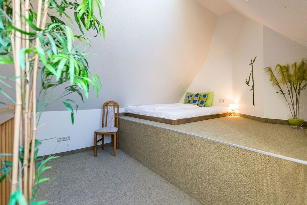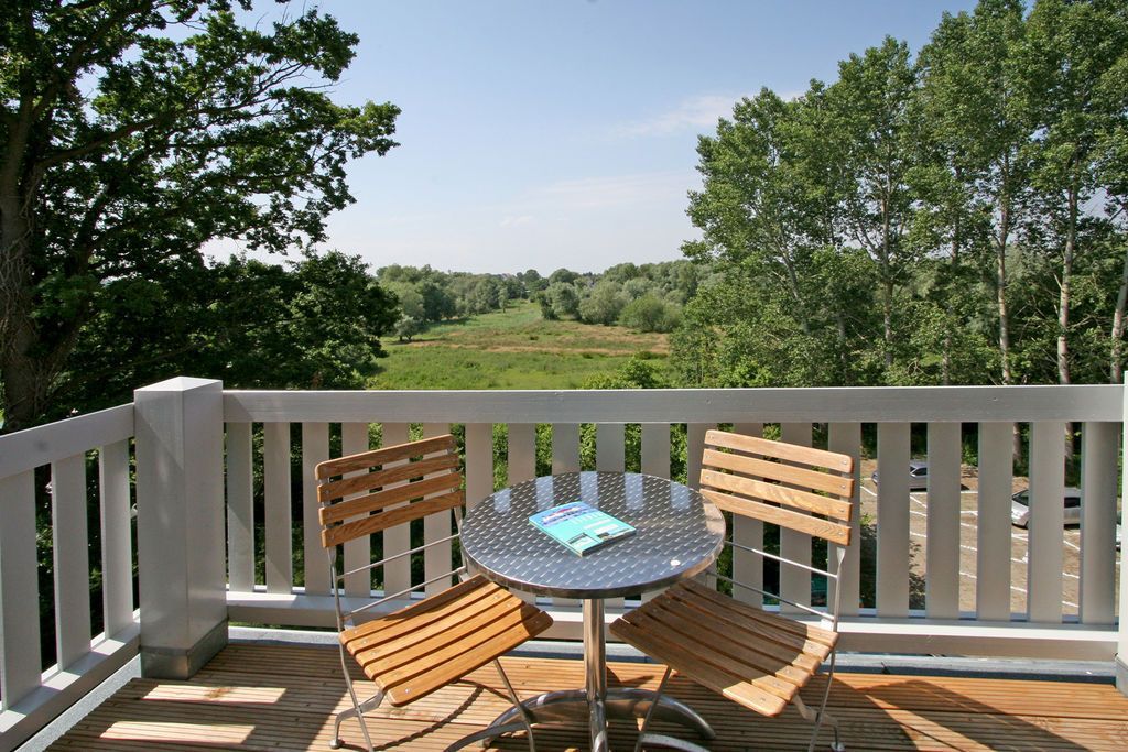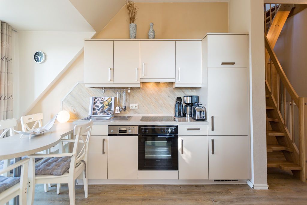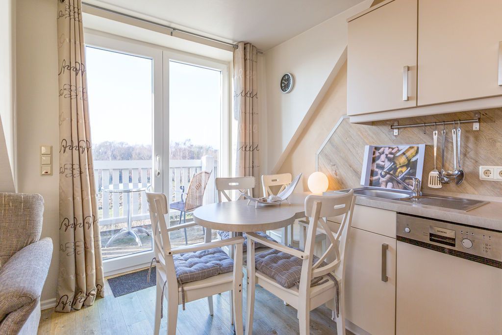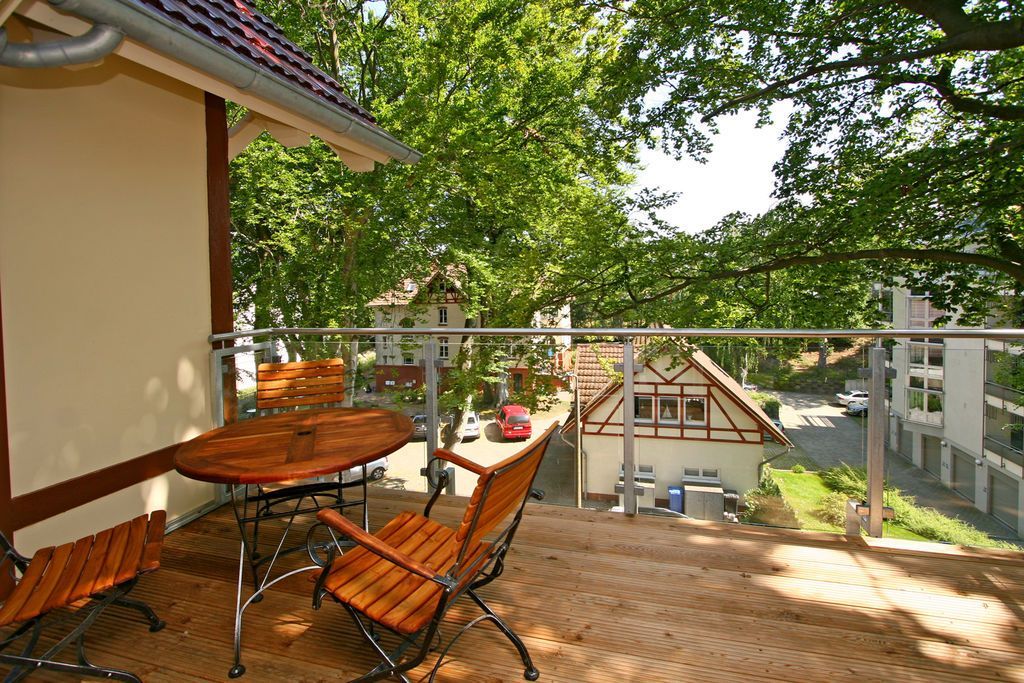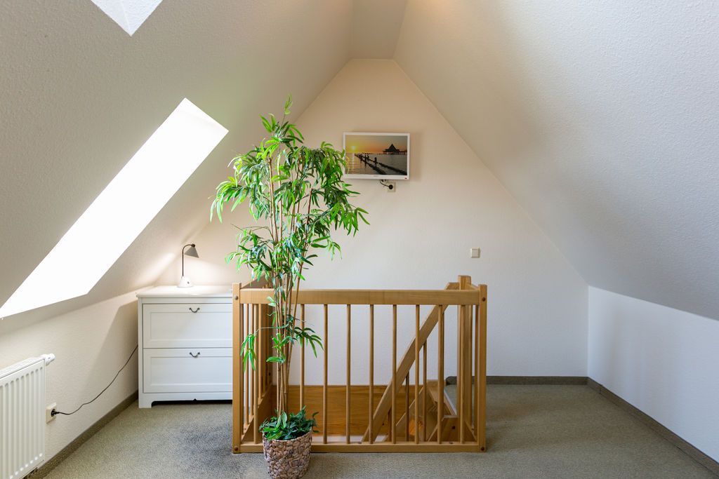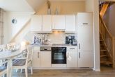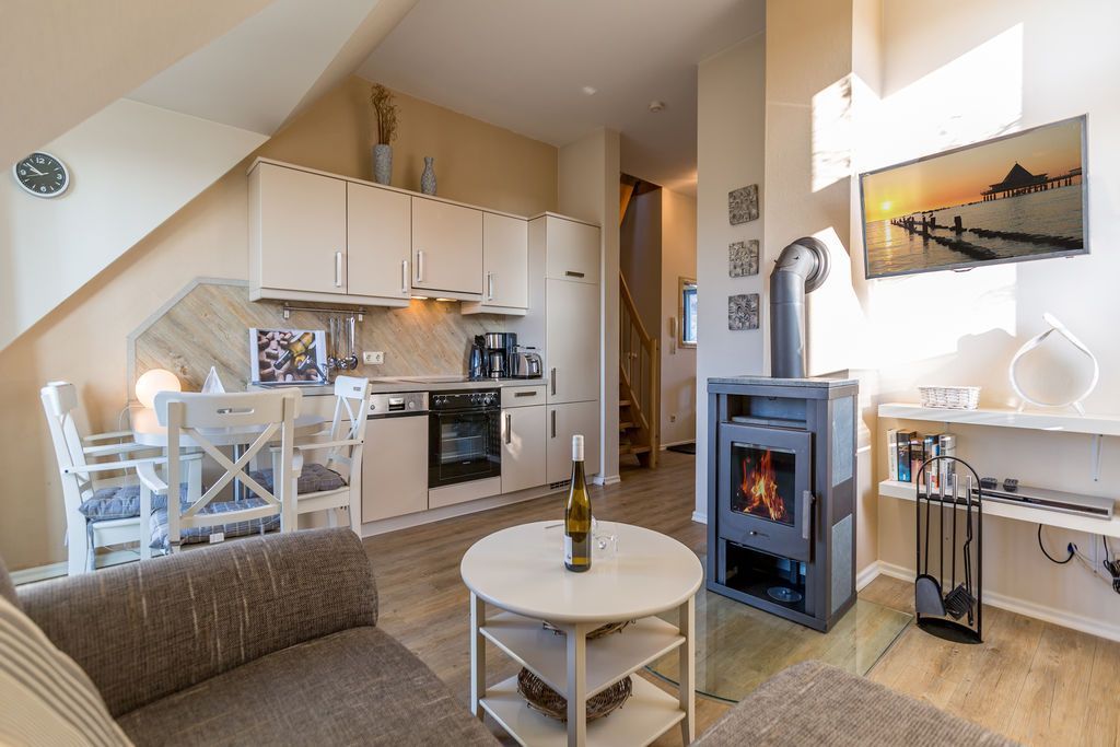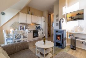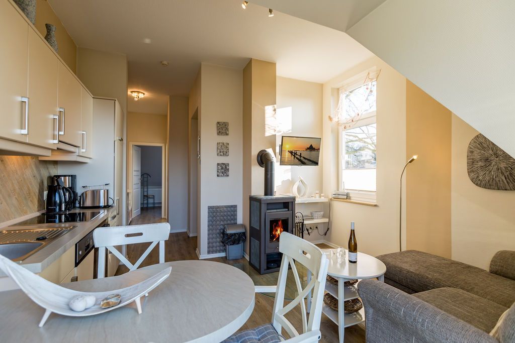 Modern. Lichtdurchflutet. Stilsicher - so empfängt Sie die Ferienwohnung (57qm) im Obergeschoss des Hauses für 2 Personen und ein Kleinkind (bis 3 Jahre). Sie fahren mit dem Fahrstuhl direkt in Ihre Wohnung. Hier ankommen erreichen Sie den Wohnbereich mit offener Küche und Kaminofen. Ein Schlafzimmer mit Boxspringdoppelbett (1,60m x 2,00m) und eigenem, großzügigen Balkon und ein Bad mit Dusche und WC befindet sich auf der gleichen Etage. Direkt unter dem Dach befindet sich eine Kuschelecke mit TV, die über eine kleine (aber steile) Treppe zu erreichen ist. Ein zweiter Balkon zur Südseite mit Blick ins Grüne lädt besonders in den Nachmittagsstunden zum Entspannen ein. Der Kaminofen verspricht besonders in der kalten Jahreszeit angenehme Stunden. Auf Wunsch stellen wir für unsere kleinen Gäste ein Kinderreisebett (ohne zusätzliche Matratze & Bettzeug) und einen Kinderhochstuhl ( gegen einen Aufpreis) zur Verfügung.