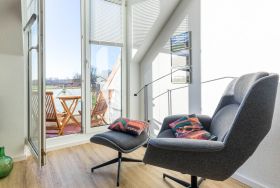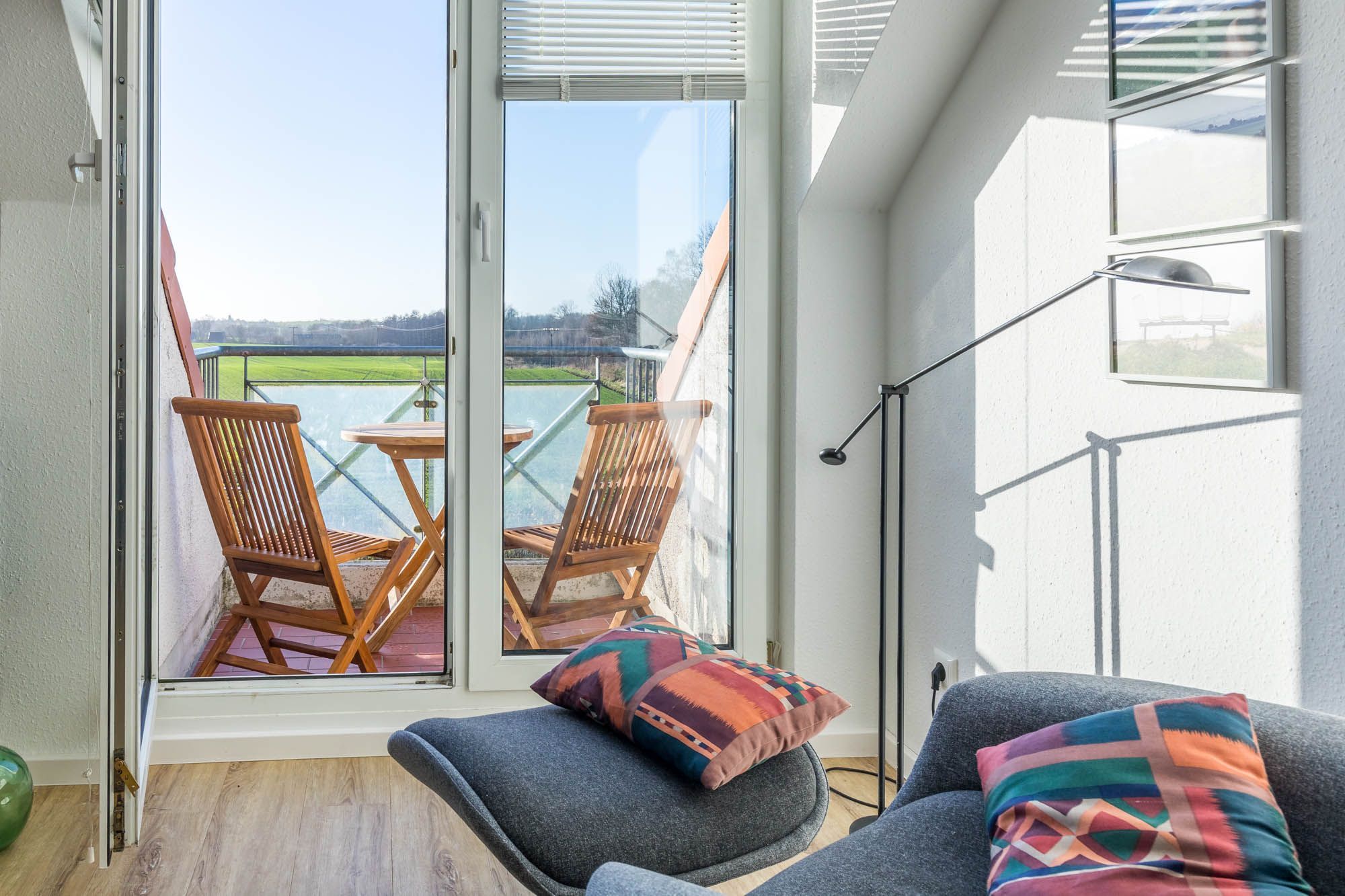 Vom Wohnbereich aus können Sie auf den kleinen möblierten Balkon gelangen. Das Sofa kann bei Bedarf ausgezogen werden.