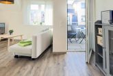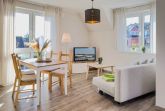 • Wohnbereich: Heller Wohnraum mit bequemer Sitzgruppe, Smart-TV und Zugang zum Balkon für entspannte Stunden.