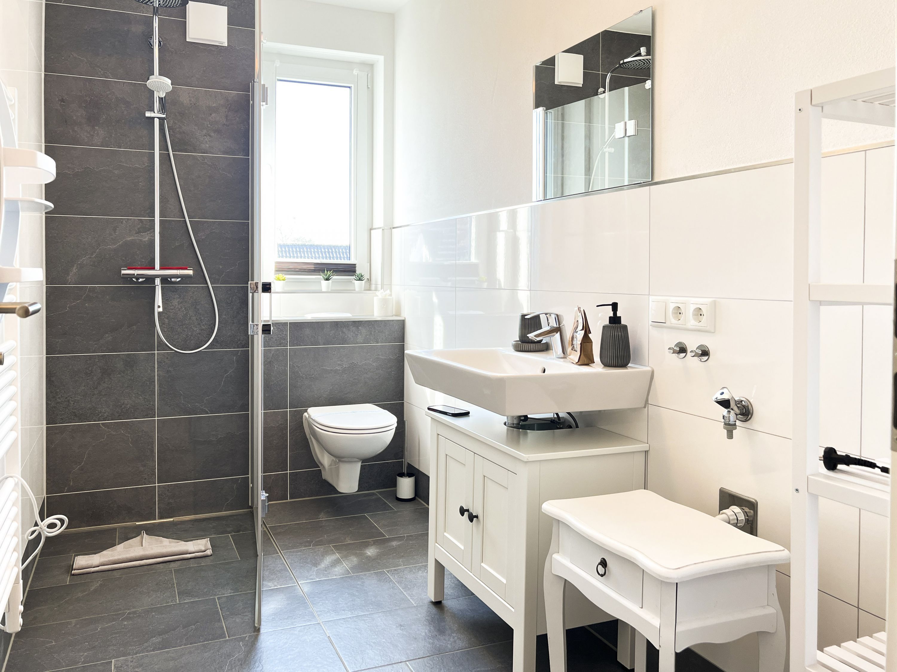 • Badezimmer: Modernes Bad mit bodentiefer Dusche, WC, Haartrockner und Fußbodenheizung für zusätzlichen Komfort.