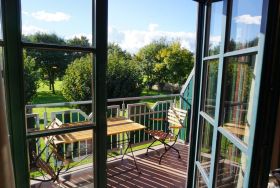 • Zugang zu einem Balkon mit Gartenmöbeln und weitem Blick auf den gepflegten Außenbereich mit altem Baumbestand