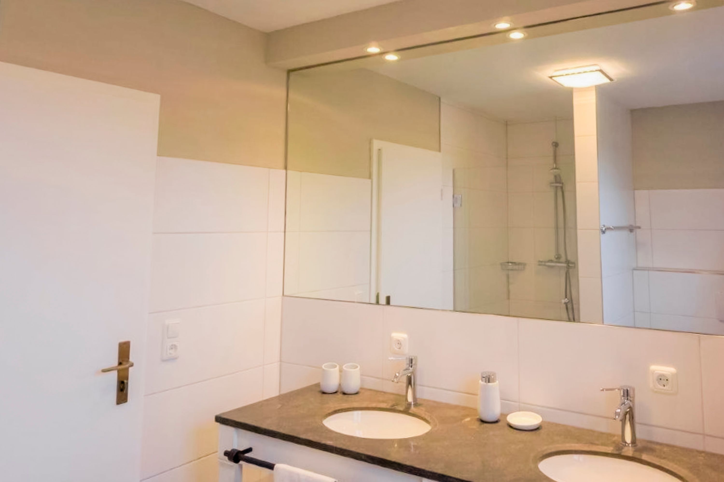 • Ein angrenzendes Badezimmer mit Dusche