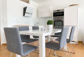Die Wohnung ist komplett mit Echtholzparkett und Fußbodenheizung ausgestattet. Sie verfügt über einen hellen, freundlichen Wohnraum mit gemütlicher Sitzecke, TV, Radio und WLAN sowie einer offenen, gut ausgestatteten Küche mit angrenzendem Essbereich. Ein Schlafzimmer mit Doppelbett sowie ein weiteres, kleines, innenliegendes Schlafzimmer mit Etagenbett stehen zur Verfügung. Das Bad ist modern und luxuriös. Die 30 qm große Terrasse ist zum Süden ausgerichtet und mit gemütlichen Lounge Möbeln und Essbereich ausgestattet und verfügt über eine elektrische Markise. Sämtliche Fenster sind bodentief und mit elektrischen Außenjalousien versehen. Ein PKW Stellplatz befindet sich in der hauseigenen Tiefgarage.