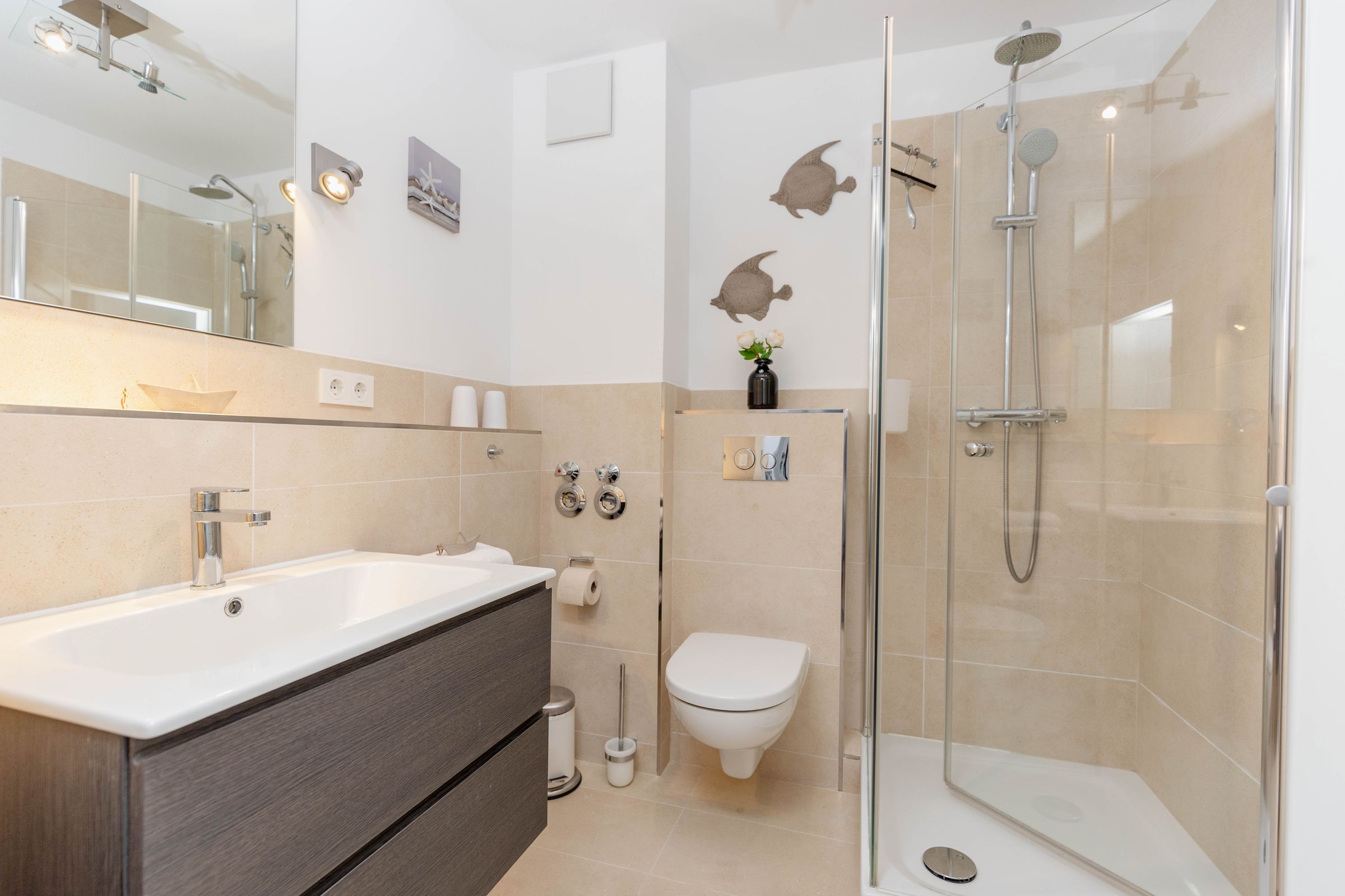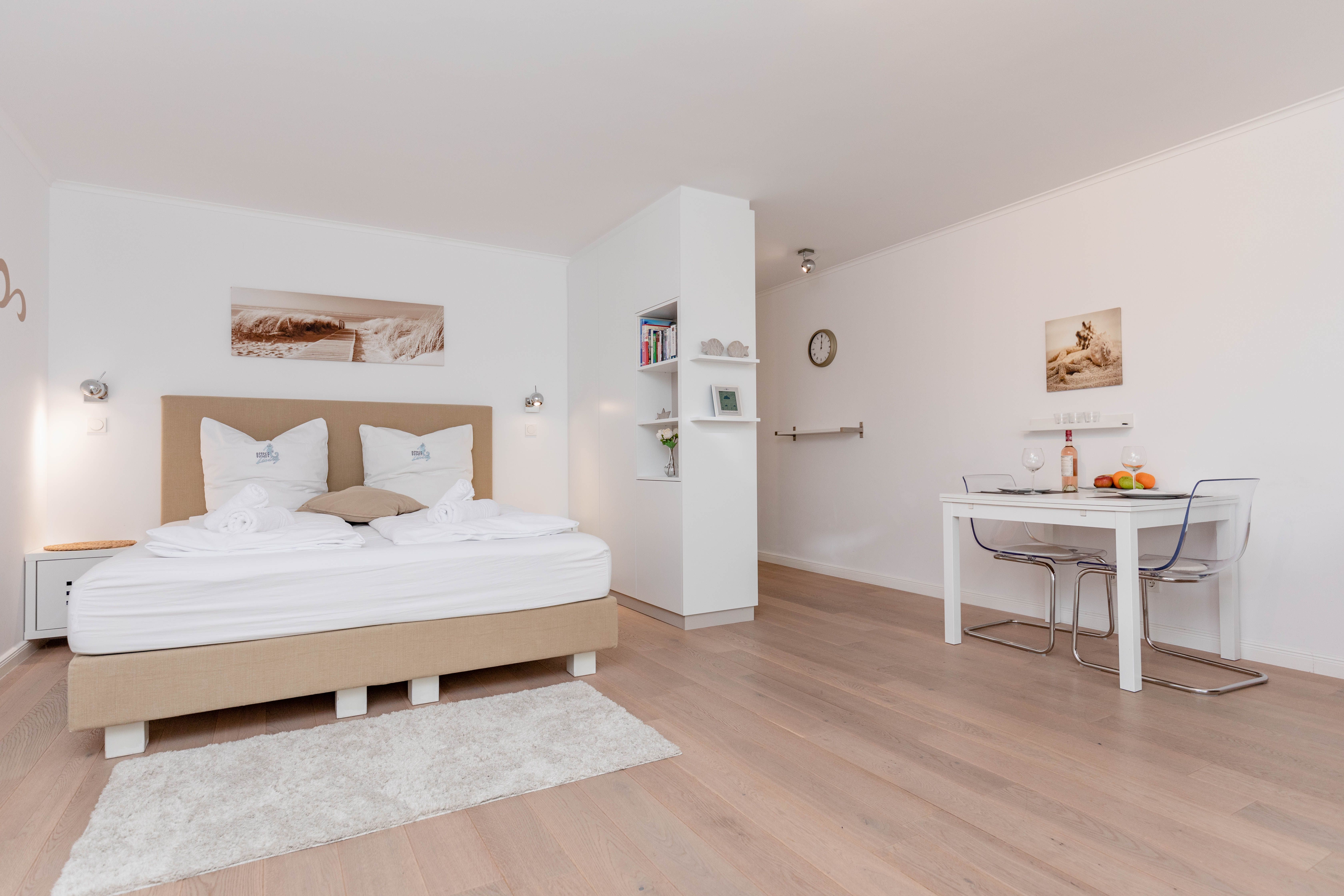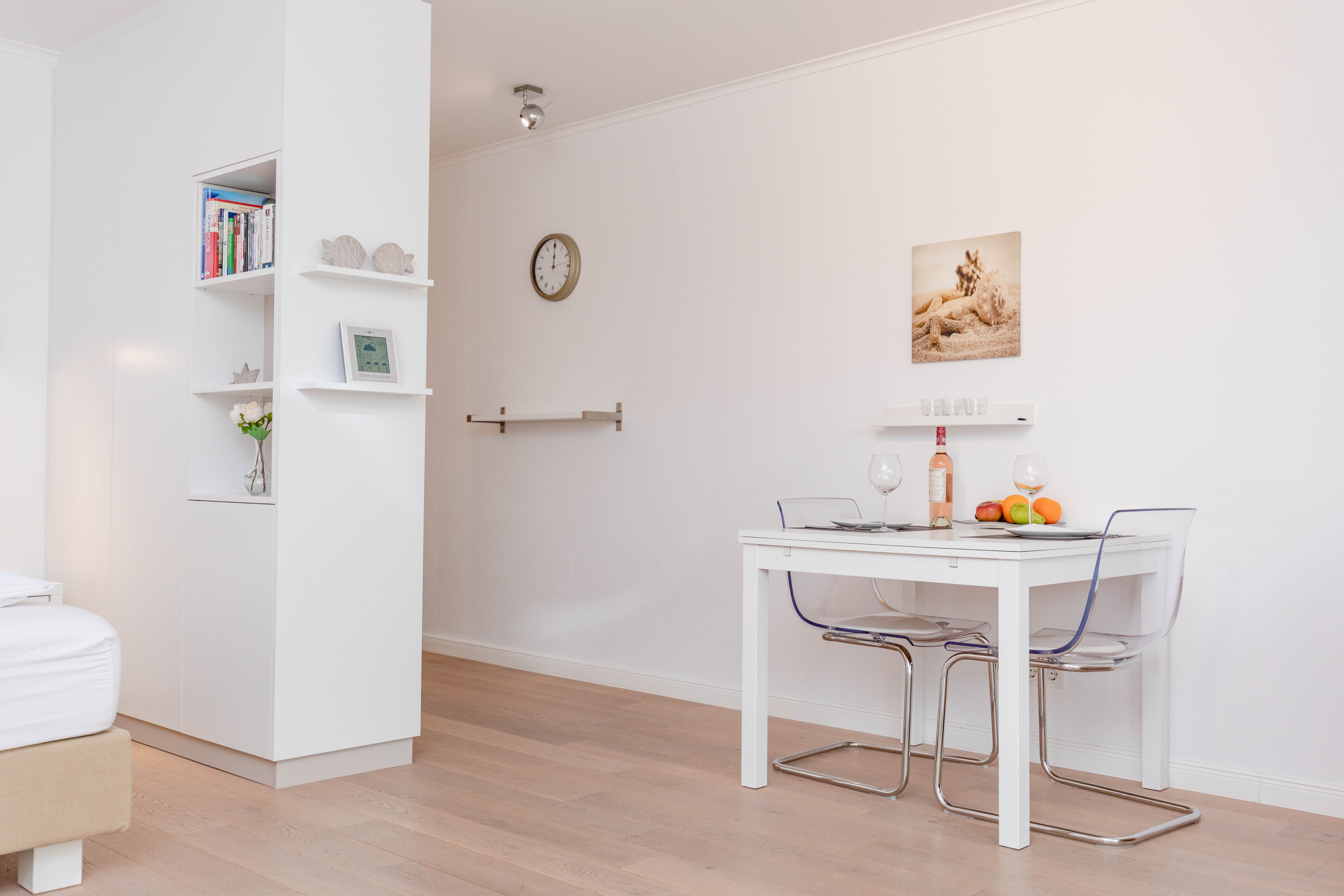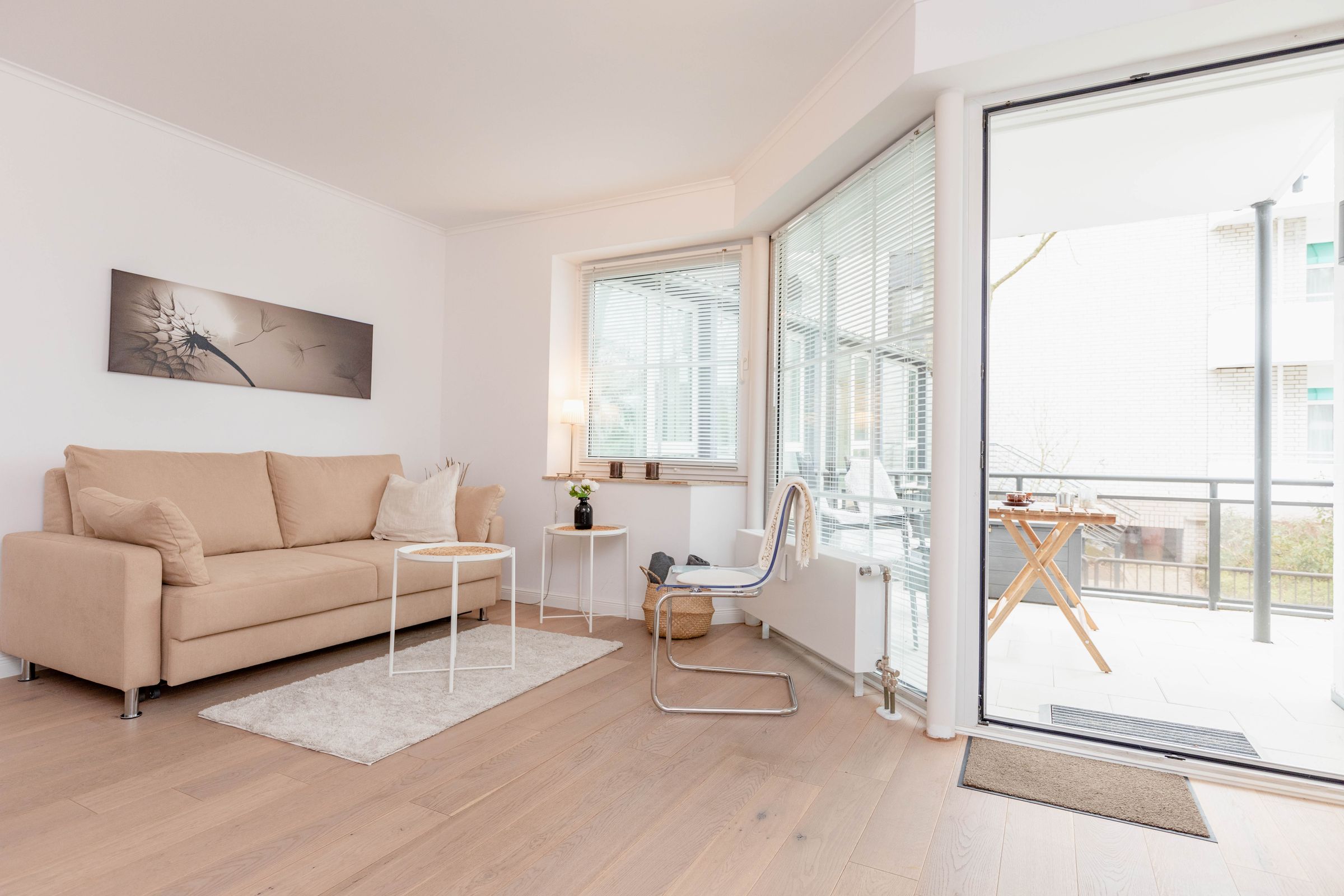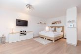 Bodentiefe Fensterelemente, Echtholzparkett und die hochwertige Einrichtung schaffen eine helle und freundliche Wohnatmosphäre. Die 42 qm wurden optimal genutzt und bieten ausreichend Platz für 2 Personen. Es steht ein geschmackvoller, großzügiger Wohn- Schlafbereich mit einem bequemen Sofa und ein Essbereich für 2 Personen zur Verfügung. Das hochwertige Luxusbett aus der Bettenmanufaktur Sleep&Dream superior in Hotelqualität (180x200) ist besonders hervorzuheben und Garant für einen erholsamen Schlaf. Unterhaltung bieten der Sony TV 50 Zoll (127 cm) schwenkbar mit USB Anschluß, Blue-Ray Player, Hifi-Anlage mit Bluetooth und kostenloser Internetzugang über WLAN. Die moderne individuell eingerichtete Küchenzeile ist bestens ausgestattet und verfügt über Geschirrspülmaschine und Mikrowelle mit Backfunktion. Das moderne, geräumige Bad verfügt über eine Dusche, Waschtisch, WC, Handtuchwärmer und Fön. Tiefgaragenstellplatz (Einfahrtshöhe 1,75 m), Aufzug, Fahrradkeller (eine Platzgarantie für Ihre Fahrräder besteht nicht) sowie Waschmaschine und Trockner (Münzgeräte) sind vorhanden.