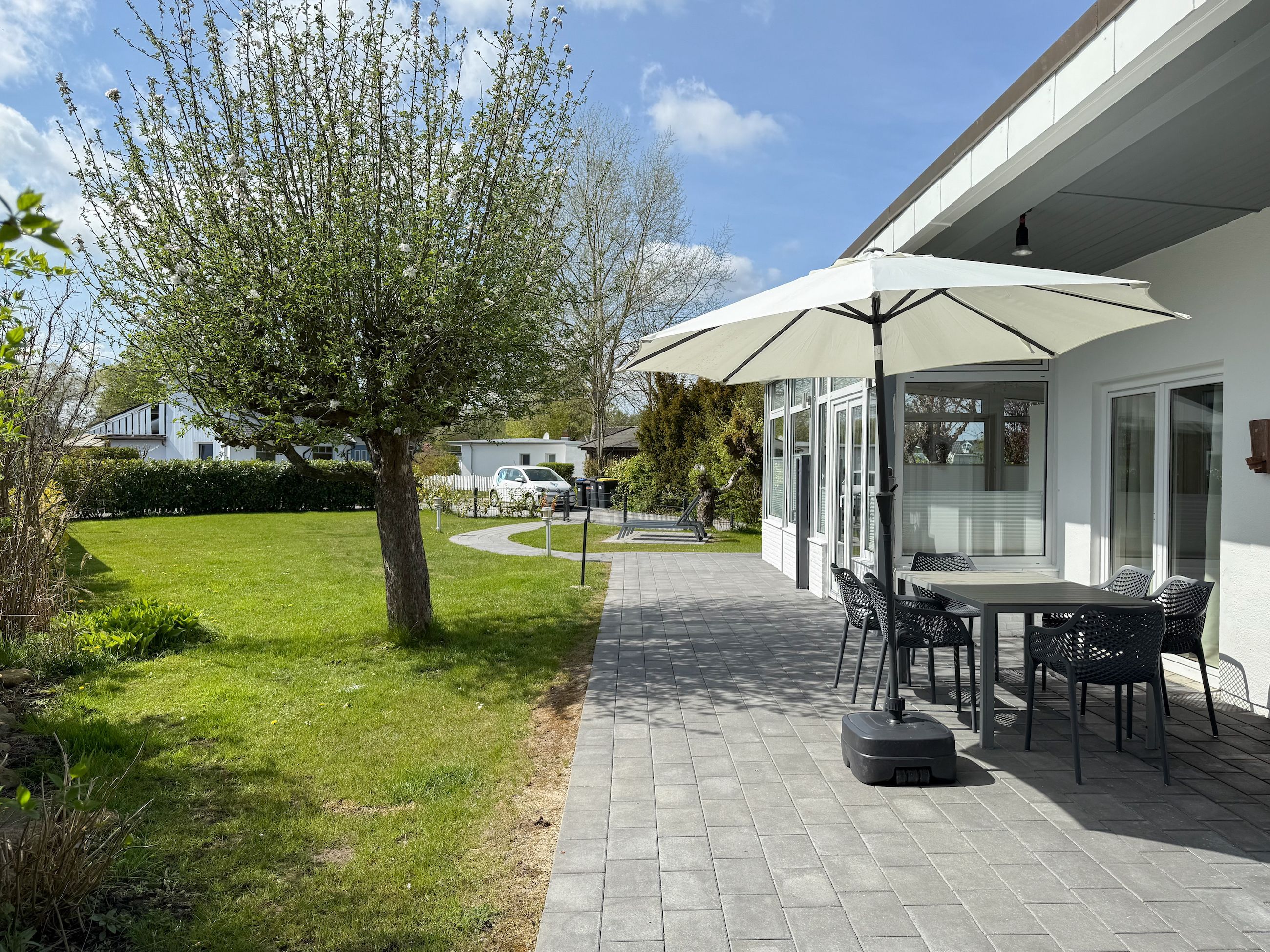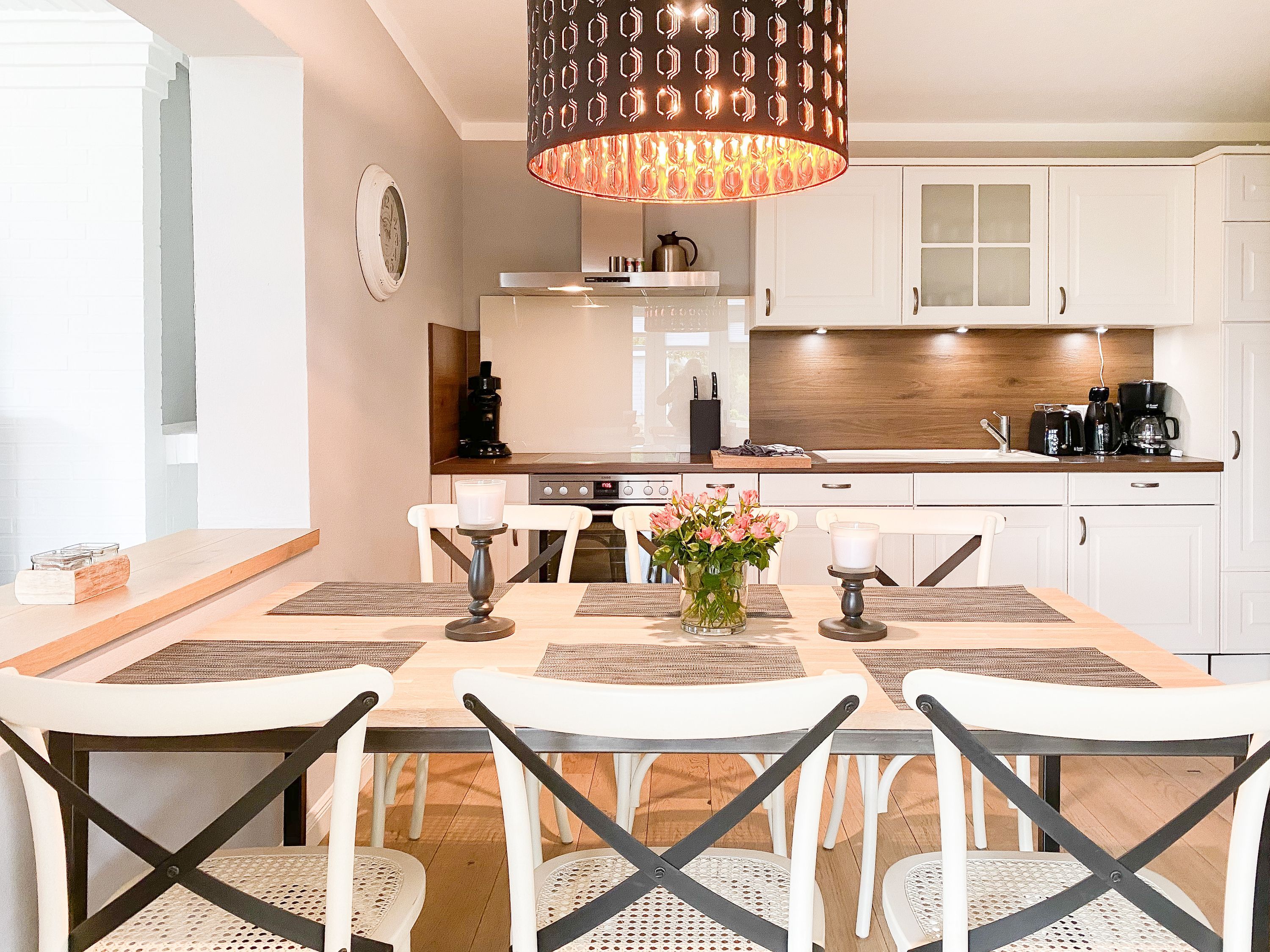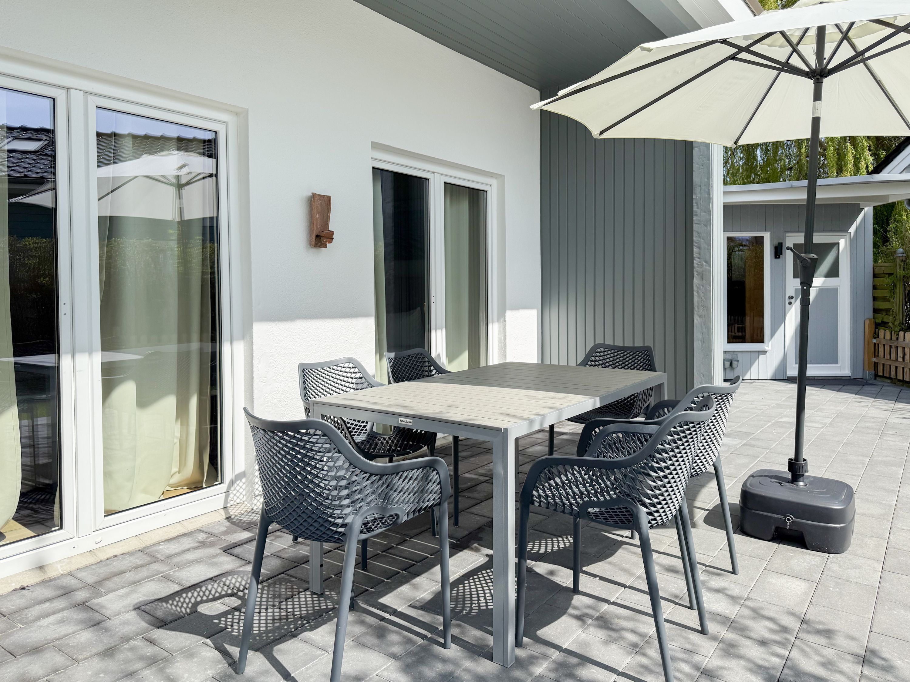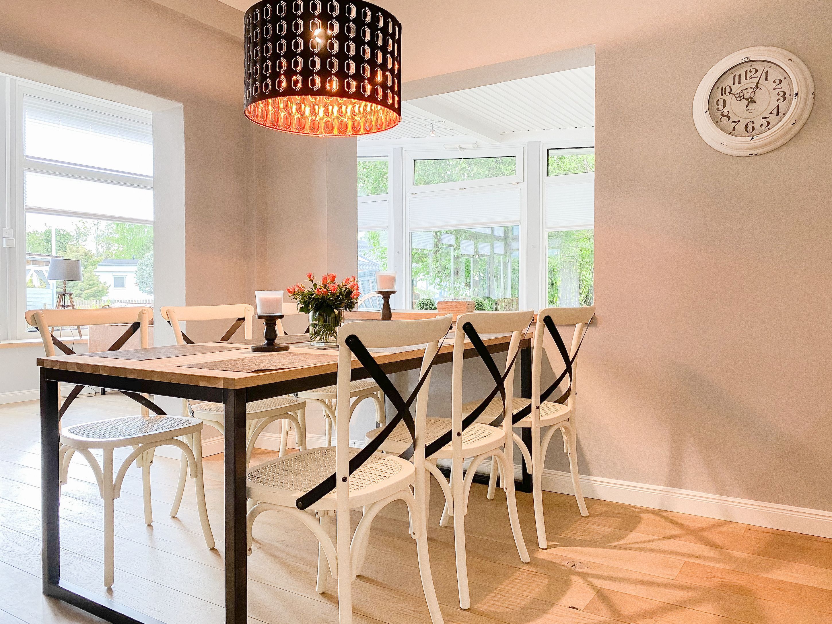 Mit circa 90 qm Wohnfläche, einem schönem eingewachsenem Garten in Südwestausrichtung, großer Terrasse und separatem Saunahaus, eignet es sich bestens für Familien und bietet ausreichend Platz für 5-6 Personen inklusive Kindern. Mittelpunkt des Hauses bildet der großzügige Wohnbereich mit riesigen Fensterflächen und wunderschönem Blick in den weitläufigen, eingezäunten Garten. Helle Räumlichkeiten, Echtholzböden und die geschmackvolle Einrichtung schaffen eine Atmosphäre zum Wohlfühlen. Es erwartet Sie eine hochwertige Wohnlandschaft, ein Kaminofen für gemütliche Abende und eine zeitgemäße Ausstattung wie TV, Bluetooth Lautsprecher, Radio und WLAN. Der großzügig angelegte Außenbereich verfügt über eine überdachte Terrasse in Südwest Ausrichtung mit reichlich Platz für gemütliche Stunden und einen schönen Garten mit Sonnenliegen und Gartenmöbeln. Erholung und Entspannung finden Sie im Saunahaus, das ebenfalls im Garten untergebracht ist. Die offene Einbauküche ist bestens ausgestattet(Geschirrspüler, Backofen, Mikrowelle) und der integrierte Essbereich bietet ausreichend Platz für 6 Personen. Das Haus verfügt über drei kleine Schlafzimmer mit Doppelbetten (160x200) und alle Fenster sind mit Plissees und Verdunkelungsvorhängen/Rollos versehen. Ein Schlafzimmer ist zusätzlich mit einem TV ausgestattet und verfügt über ein modernes Duschbad ensuite. Das zweite Duschbad ist über den Flur zu erreichen. Der vorhandene Stauraum für die Urlaubsgarderobe ist in zwei Schlafzimmern relativ gering.