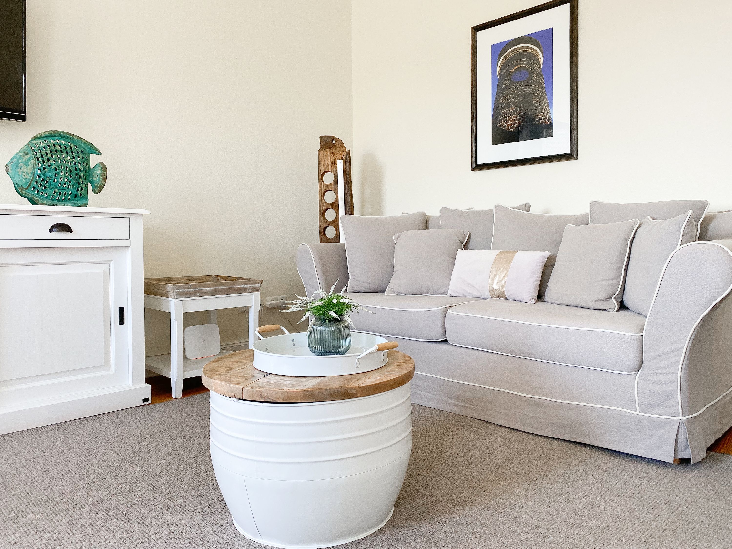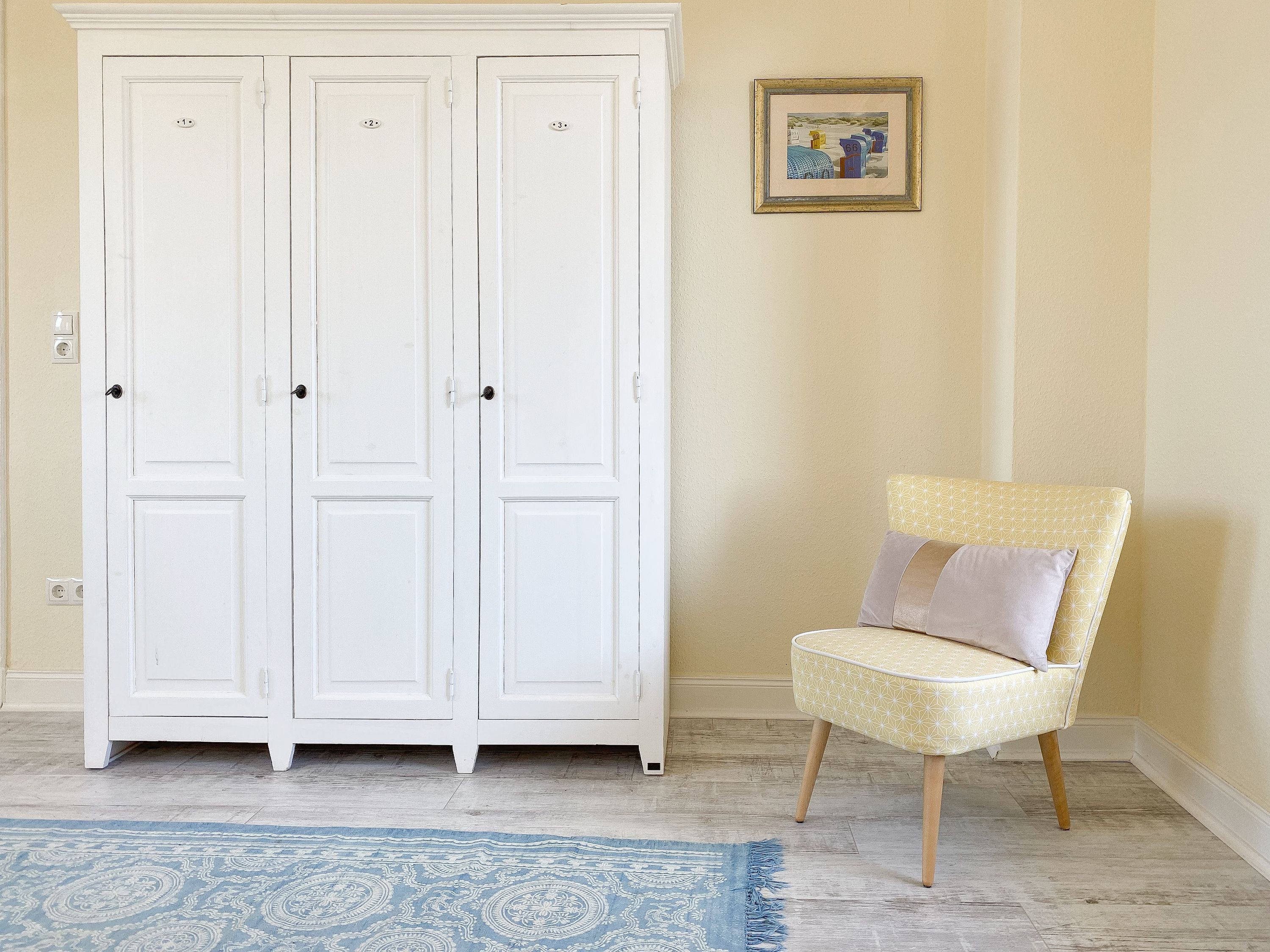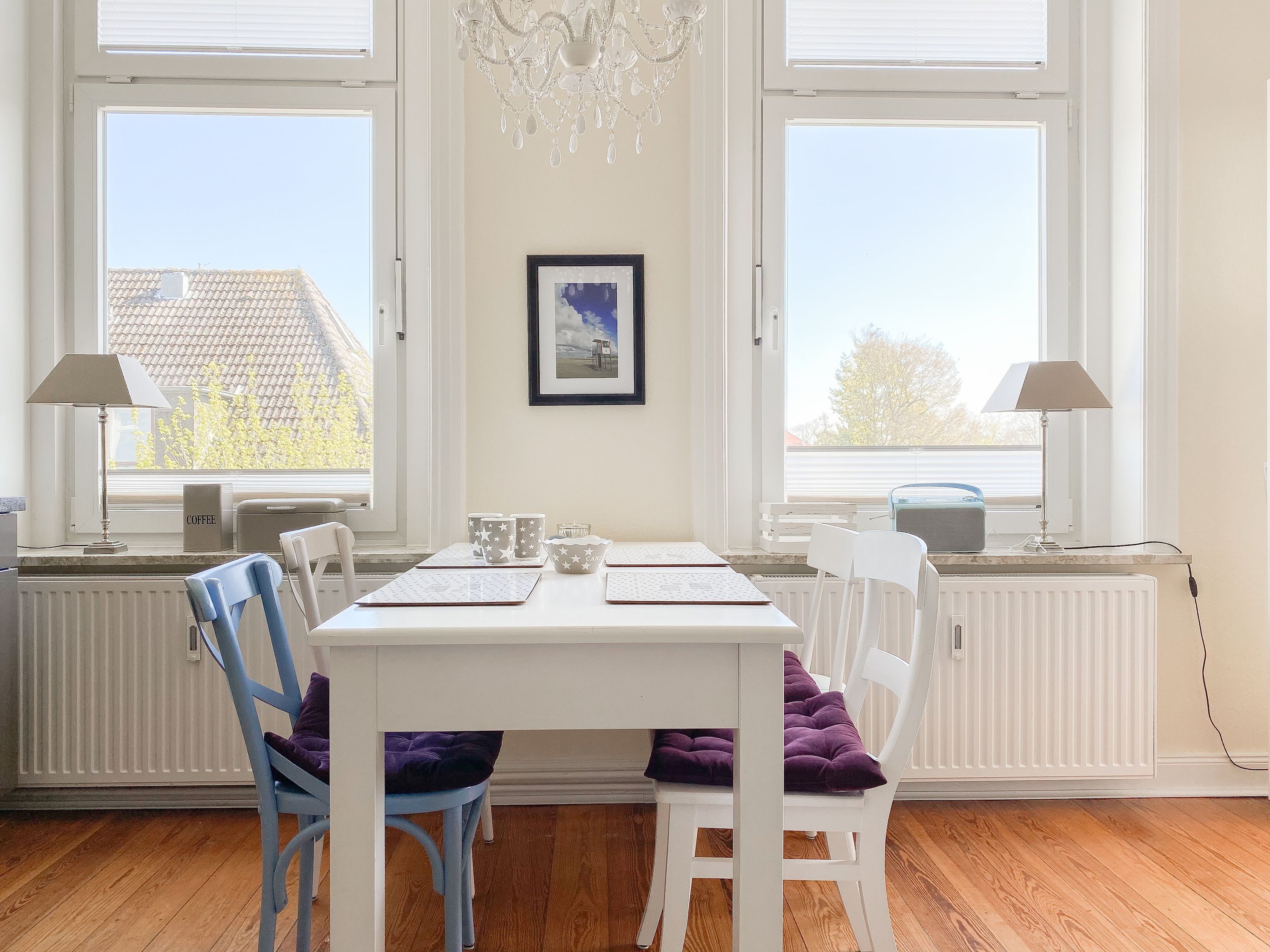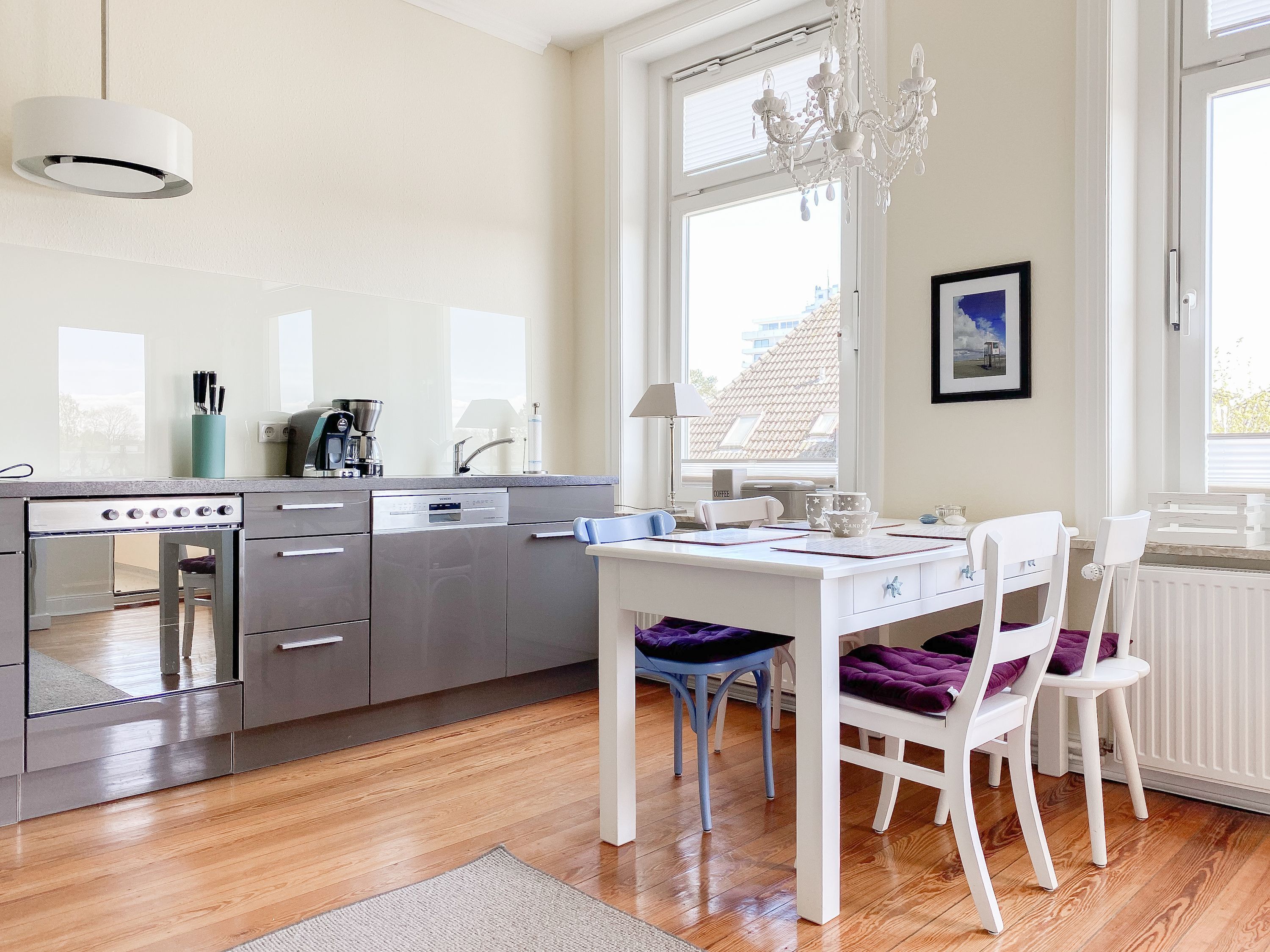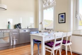 Die charmante Ferienwohnung im 3. OG wurde mit viel Liebe zum Detail saniert und eingerichtet. Die hohen Decken und großen Fenster schaffen eine helle, besondere Wohnatmosphäre. Ankommen und wohl fühlen! Die Wohnung verfügt über ein großes Schlafzimmer mit Doppelbett (180x200), TV und Zugang zur Loggia, über ein kleineres Schlafzimmer mit Einzelbett, das sich zu einem Doppelbett von 160x200 ausziehen lässt sowie ein hochwertiges, großes Duschbad mit viel Tageslicht. Das Zentrum bildet der Wohnbereich, ausgestattet mit einem gemütlichen Sofa , TV und kostenlosem Internetzugang über WLAN, die moderne Einbauküche mit allen notwendigen technischen Geräten und der Essbereich. Von hier ist auch die sonnige, geschützte Loggia zu betreten, die bei Sonne, Wind und Wetter zum Entspannen einlädt.