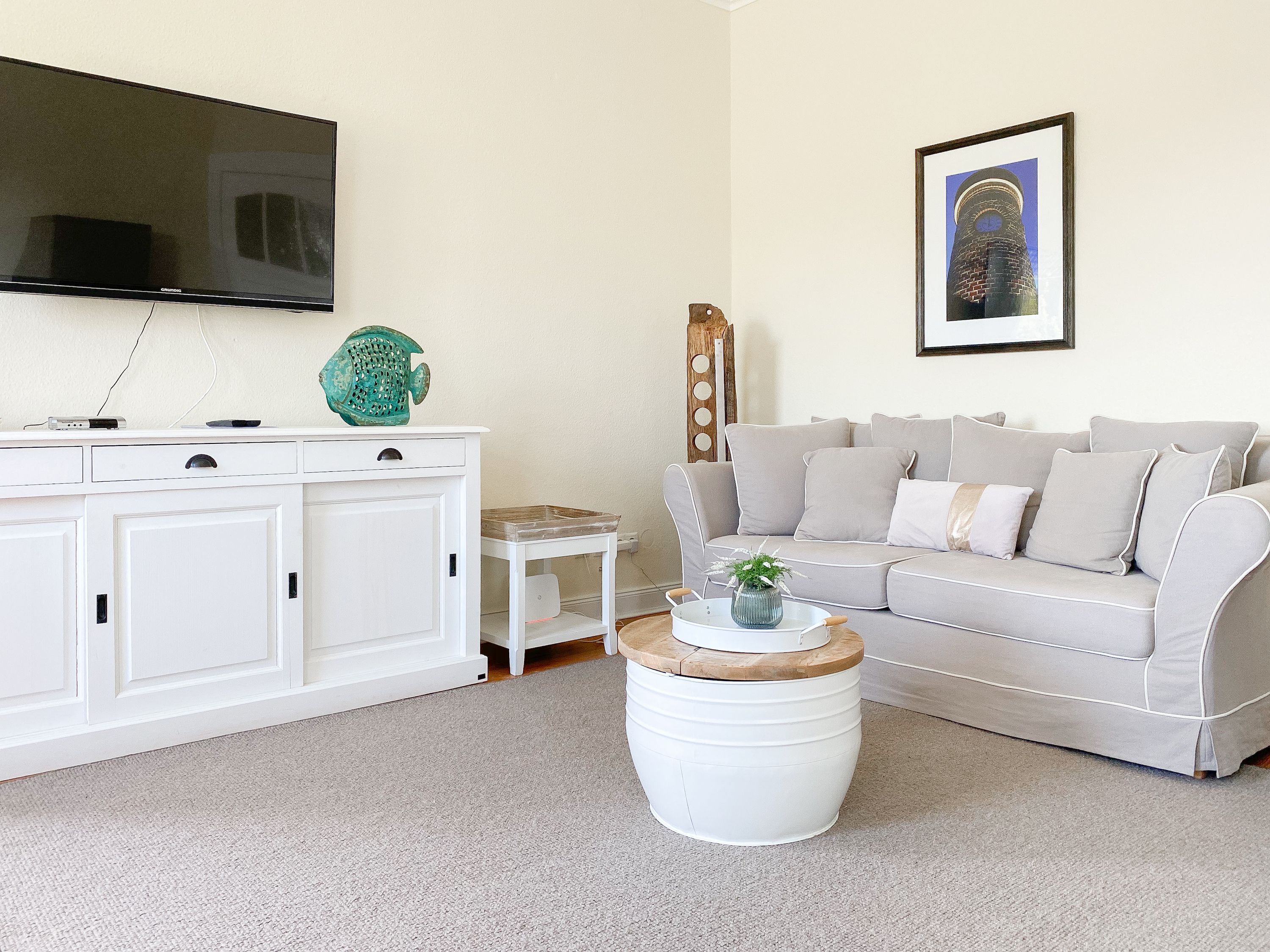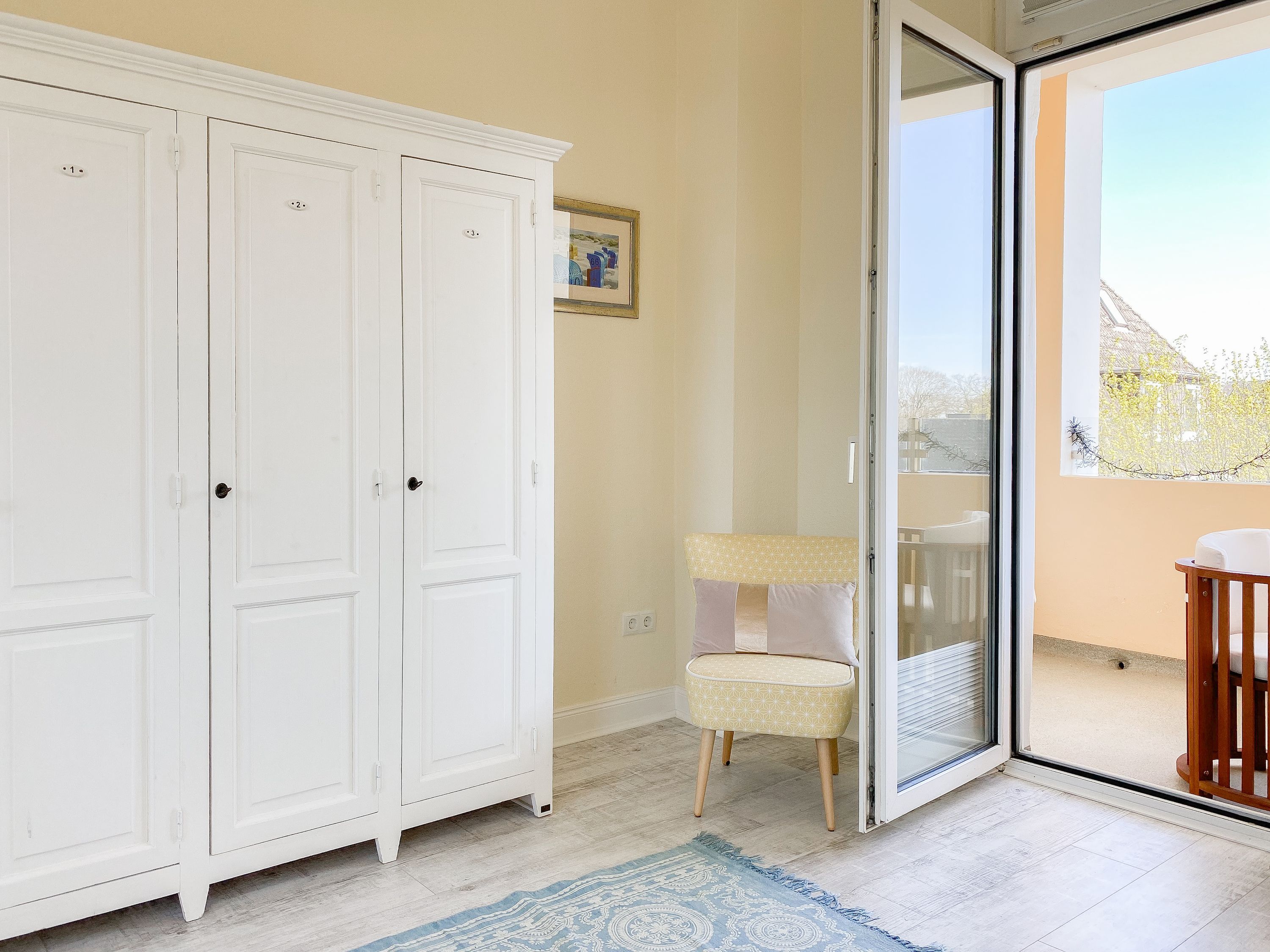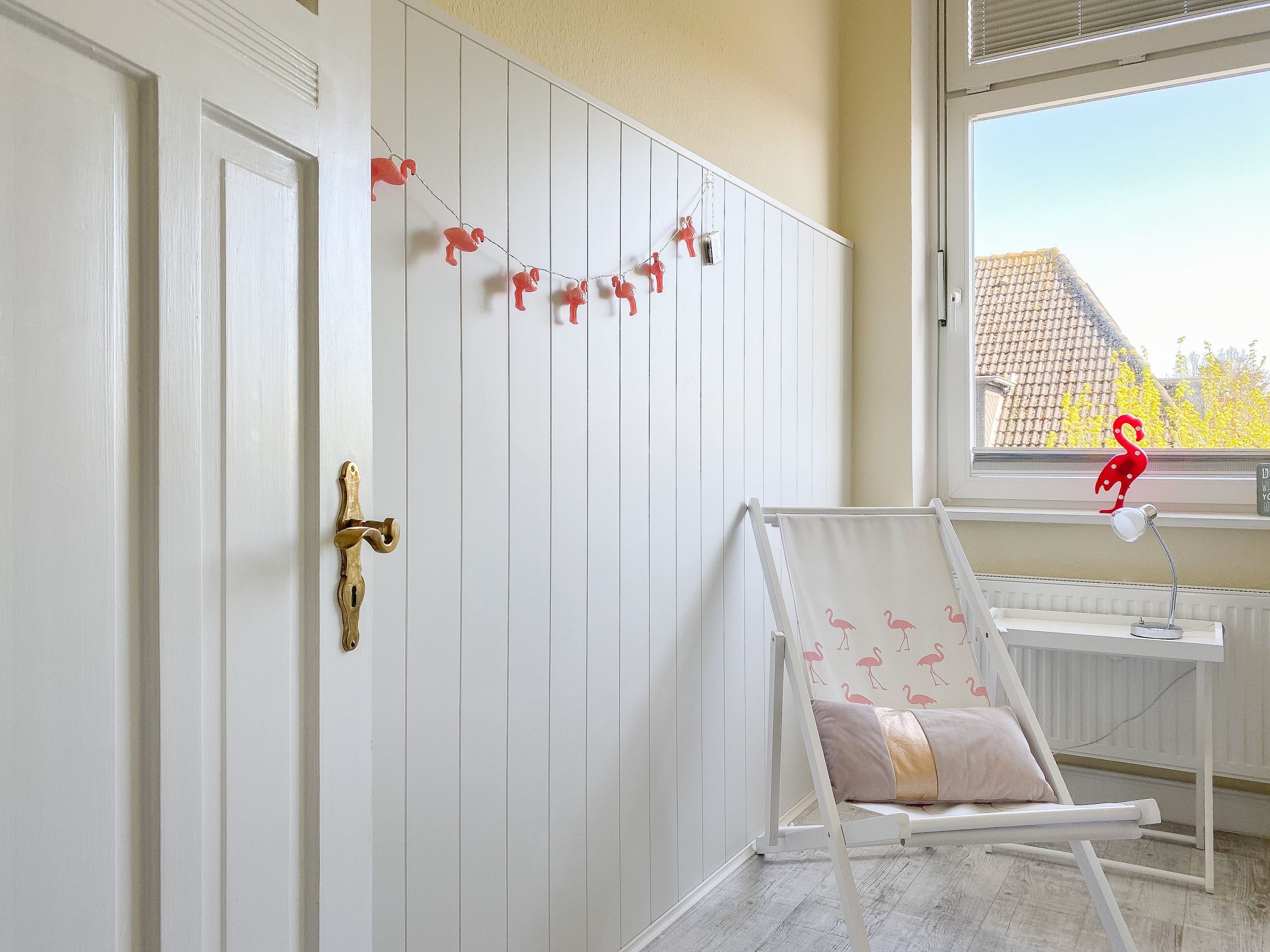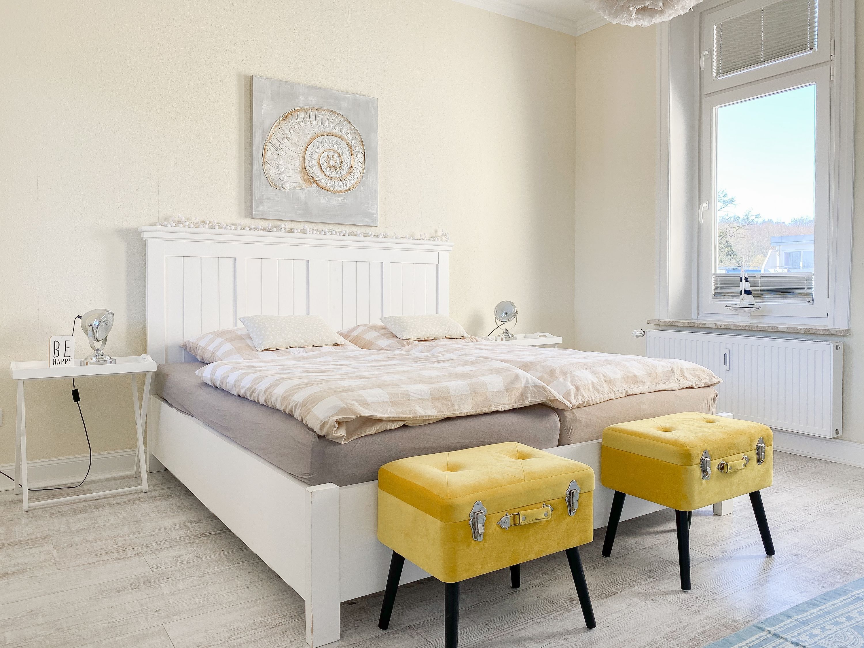 Die charmante Ferienwohnung im 3. OG wurde mit viel Liebe zum Detail saniert und eingerichtet. Die hohen Decken und großen Fenster schaffen eine helle, besondere Wohnatmosphäre. Ankommen und wohl fühlen! Die Wohnung verfügt über ein großes Schlafzimmer mit Doppelbett (180x200), TV und Zugang zur Loggia, über ein kleineres Schlafzimmer mit Einzelbett, das sich zu einem Doppelbett von 160x200 ausziehen lässt sowie ein hochwertiges, großes Duschbad mit viel Tageslicht. Das Zentrum bildet der Wohnbereich, ausgestattet mit einem gemütlichen Sofa , TV und kostenlosem Internetzugang über WLAN, die moderne Einbauküche mit allen notwendigen technischen Geräten und der Essbereich. Von hier ist auch die sonnige, geschützte Loggia zu betreten, die bei Sonne, Wind und Wetter zum Entspannen einlädt.
