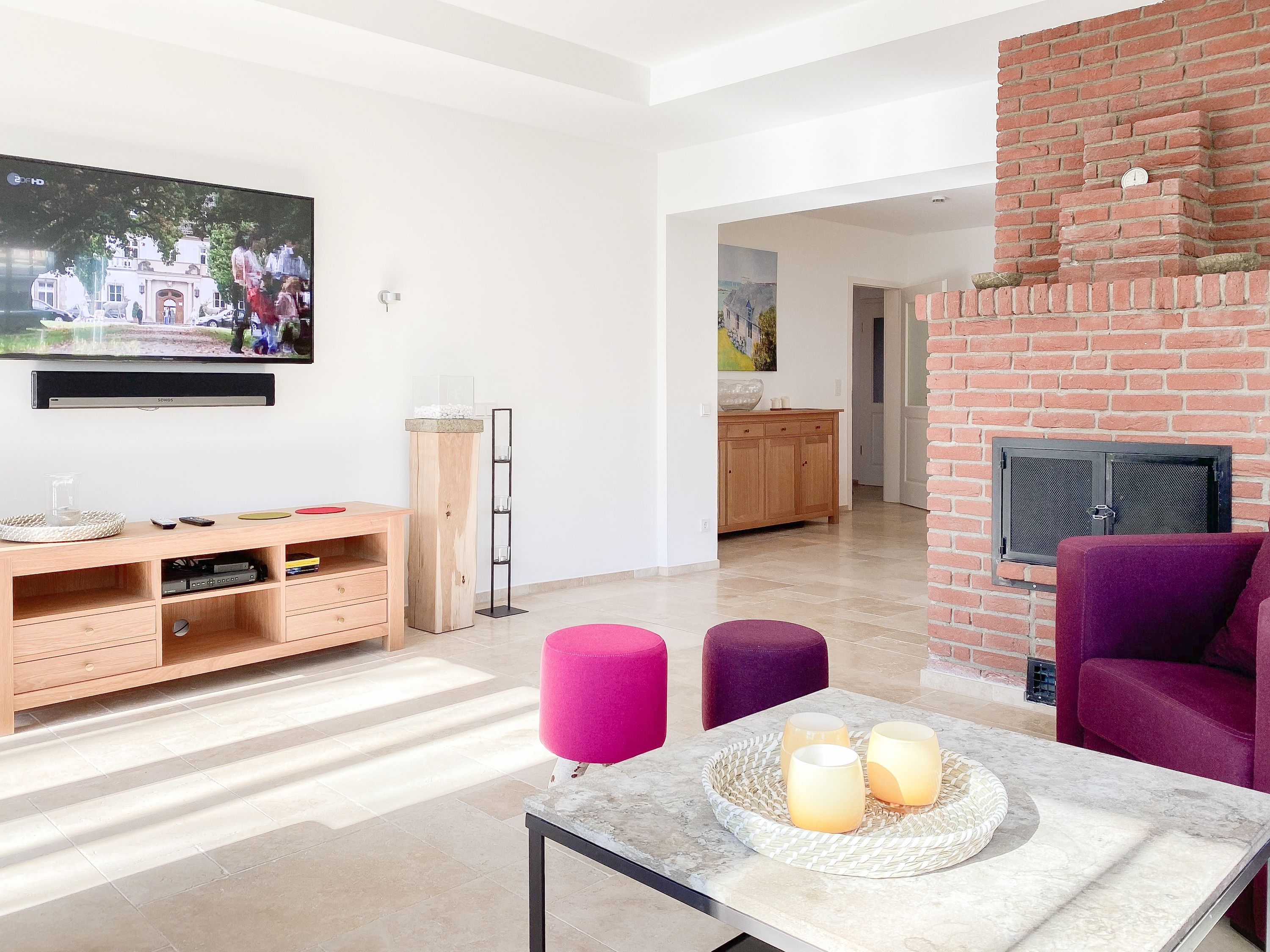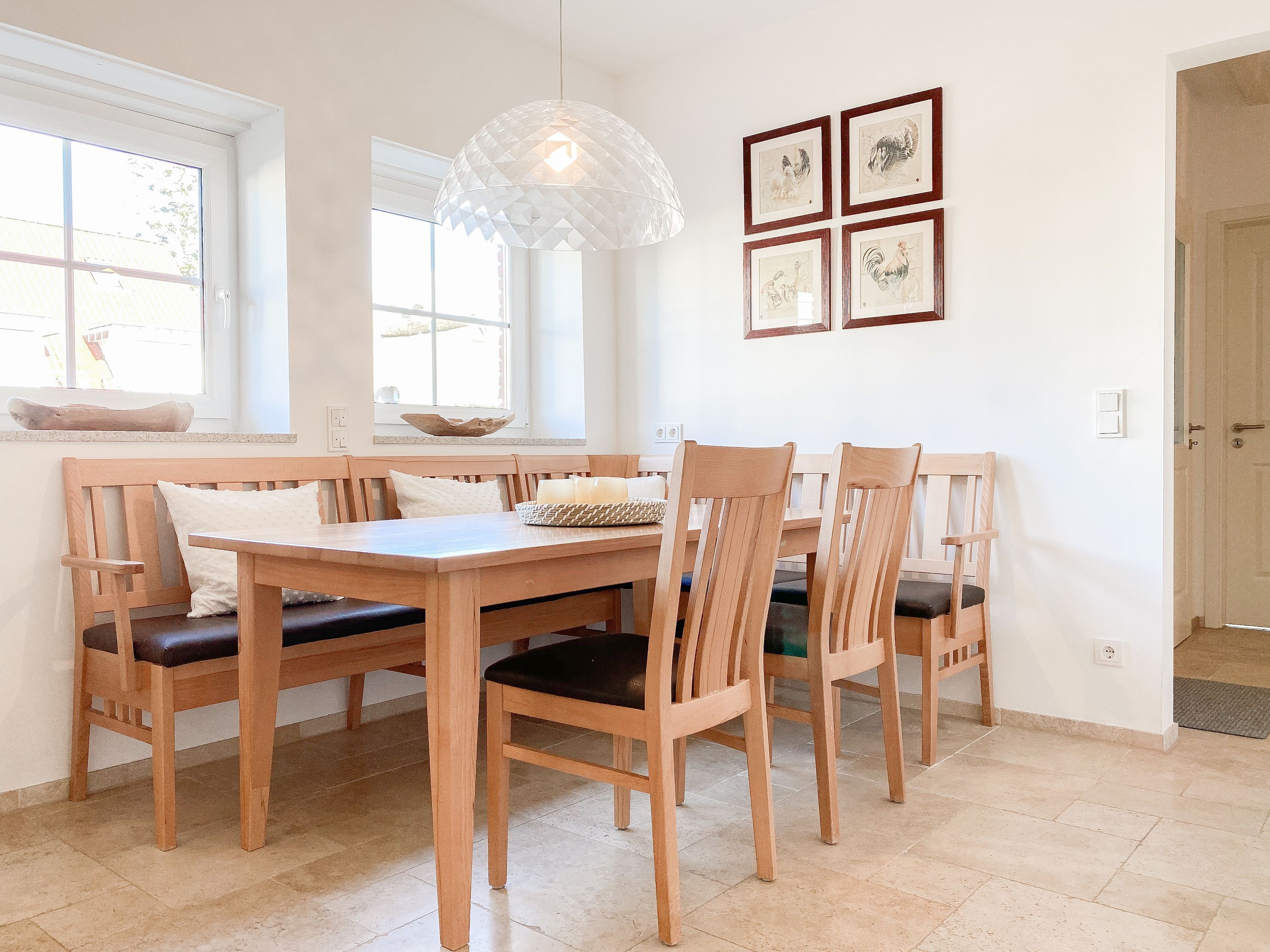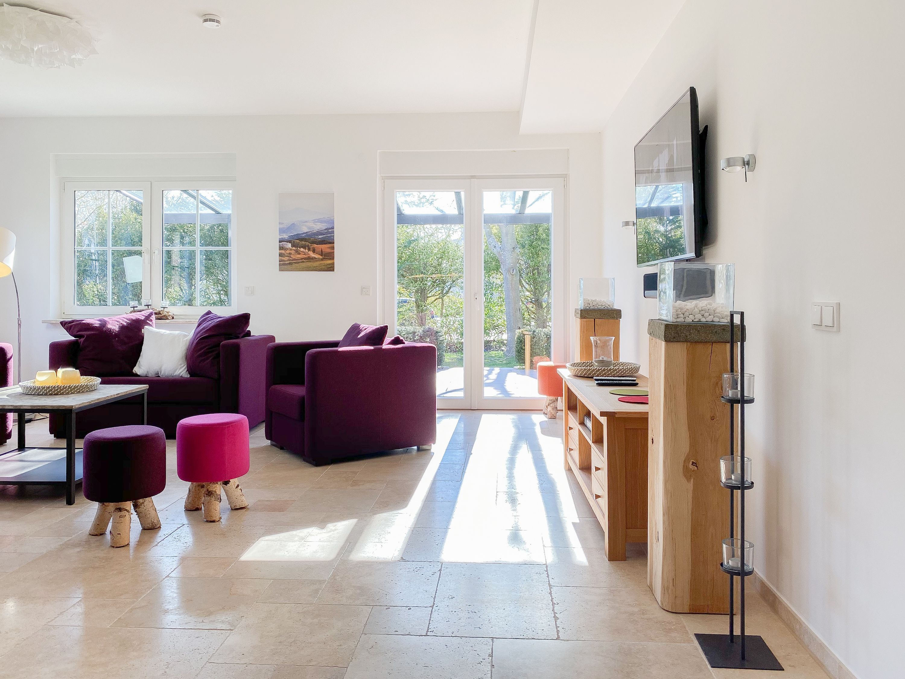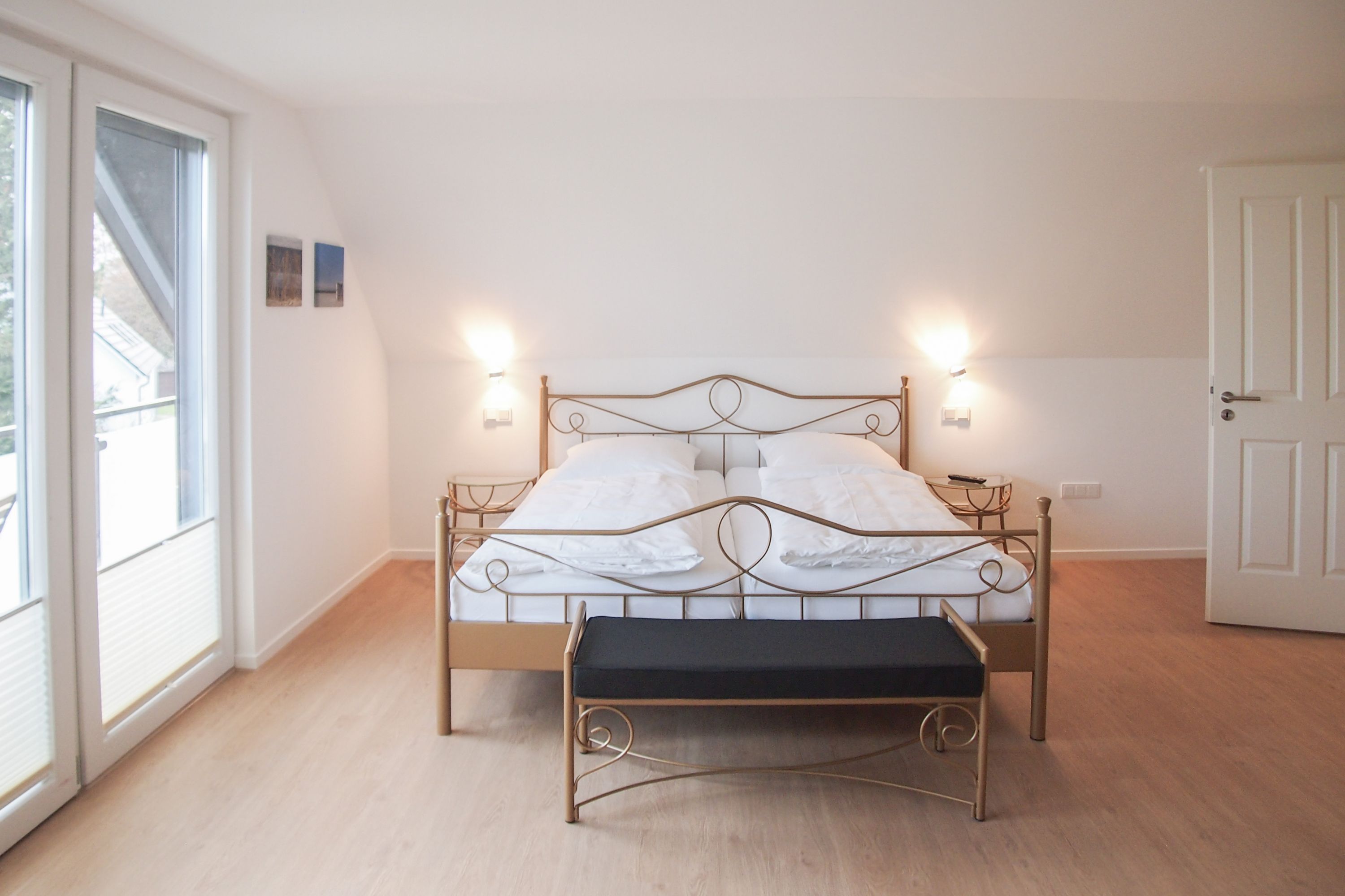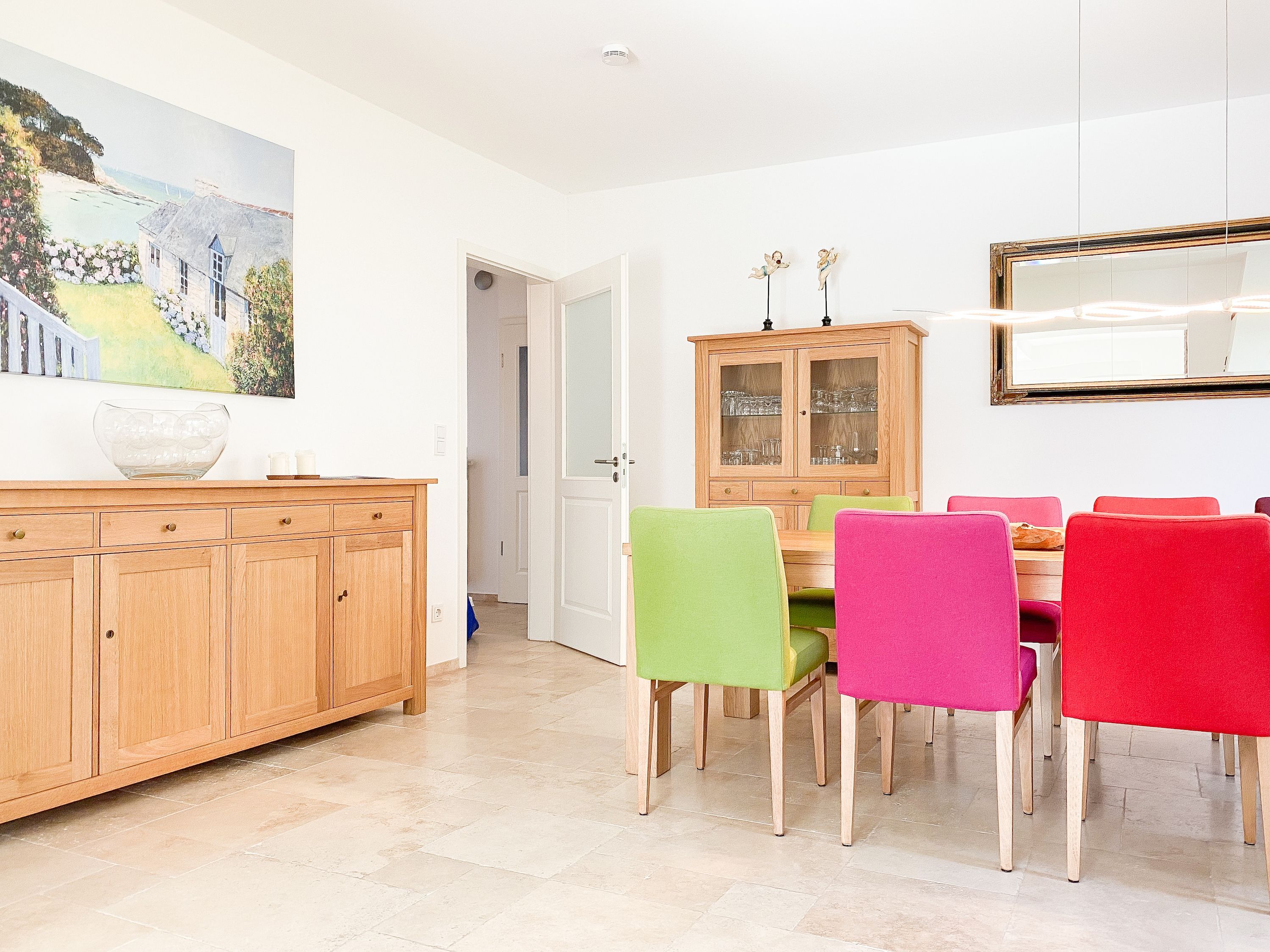 Im Erdgeschoss befinden sich zwei geräumige Schlafzimmer mit Doppelbetten und TV, zwei moderne Duschbäder sowie ein weiteres Schlafzimmer mit Einzelbett, Kinderbett und Wickelkommode für die Kleinsten. Weiter eine abgeschlossene, gut ausgestattete Küche mit gemütlichem Frühstücksbereich. Über den Flur ist das für 9 Personen ausgelegte Esszimmer sowie das großzügige, angeschlossene Wohnzimmer (TV, Sonosanlage, WLAN) zu erreichen. Im Obergeschoss sind zwei weitere große Schlafzimmer mit Doppelbetten, Balkon und TV sowie das Masterbad mit Badewanne, Dusche und integrierter Sauna. Alle Fenster sind mit elektrischen Außenjalousien versehen. Waschmaschine und Trockner sind im Keller untergebracht. Auf dem Grundstück befinden sich drei PKW Stellplätze. Am Haus befindet sich eine Wallbox zum Laden von E -Fahrzeugen (vorherige Anmeldung notwendig).