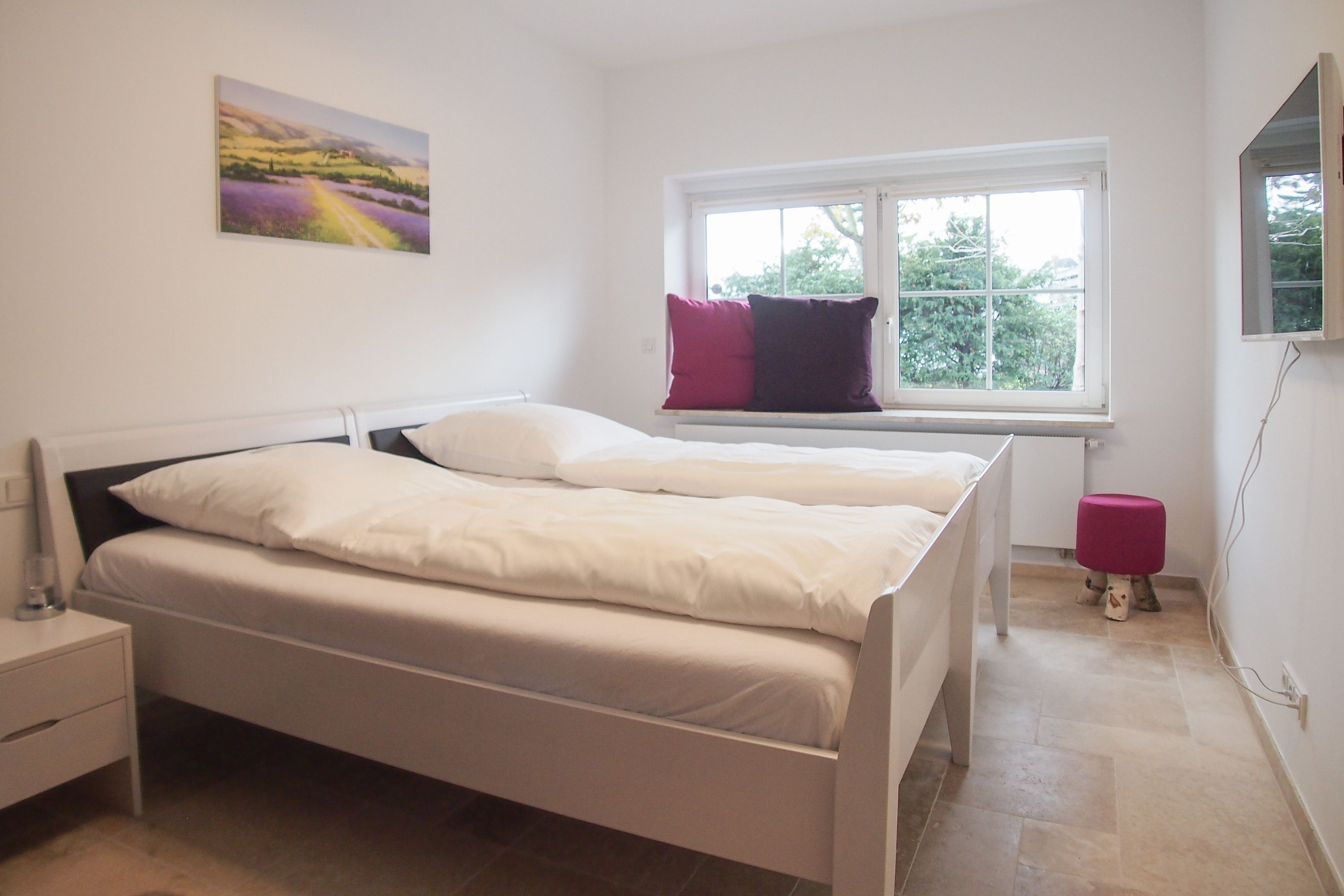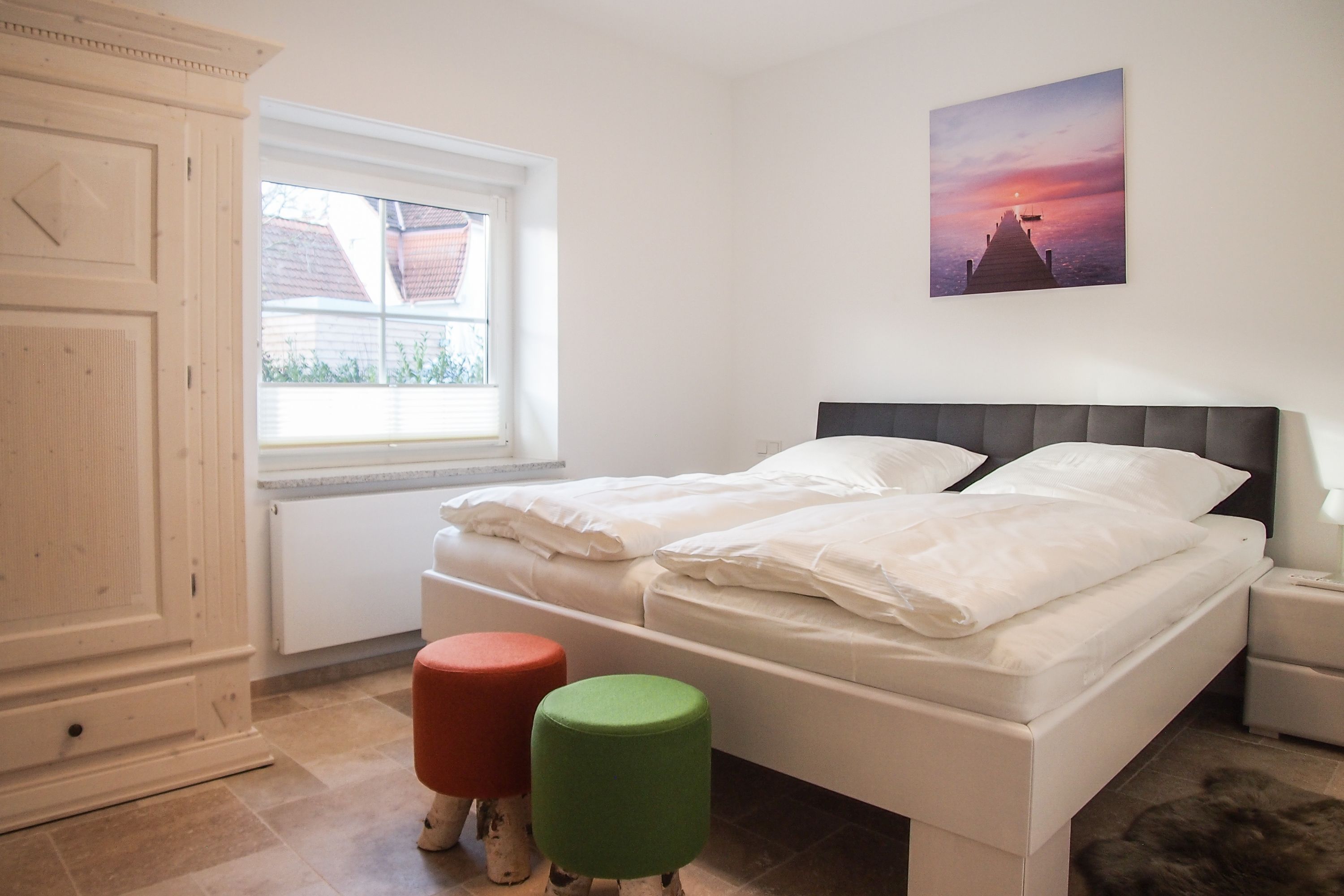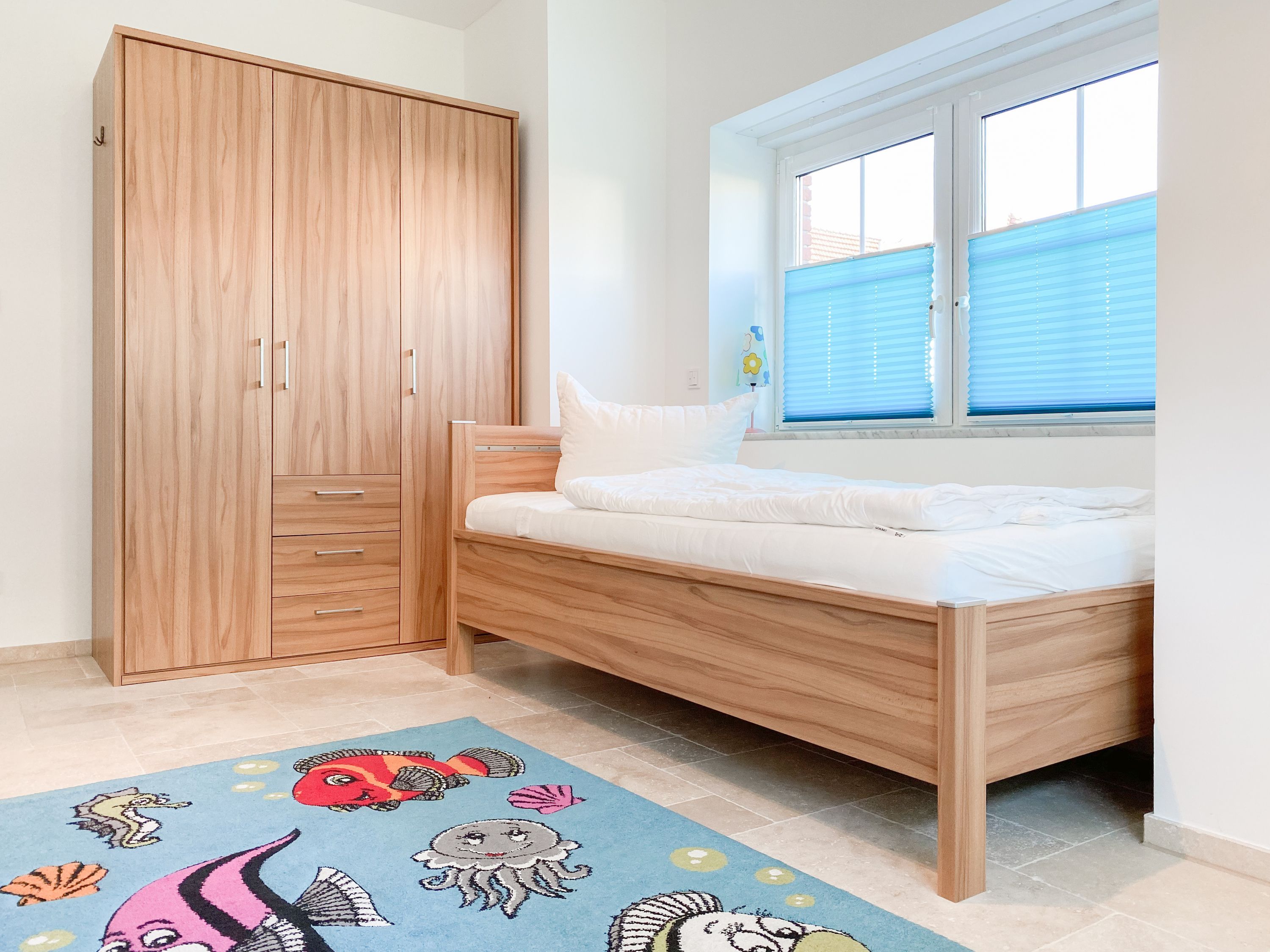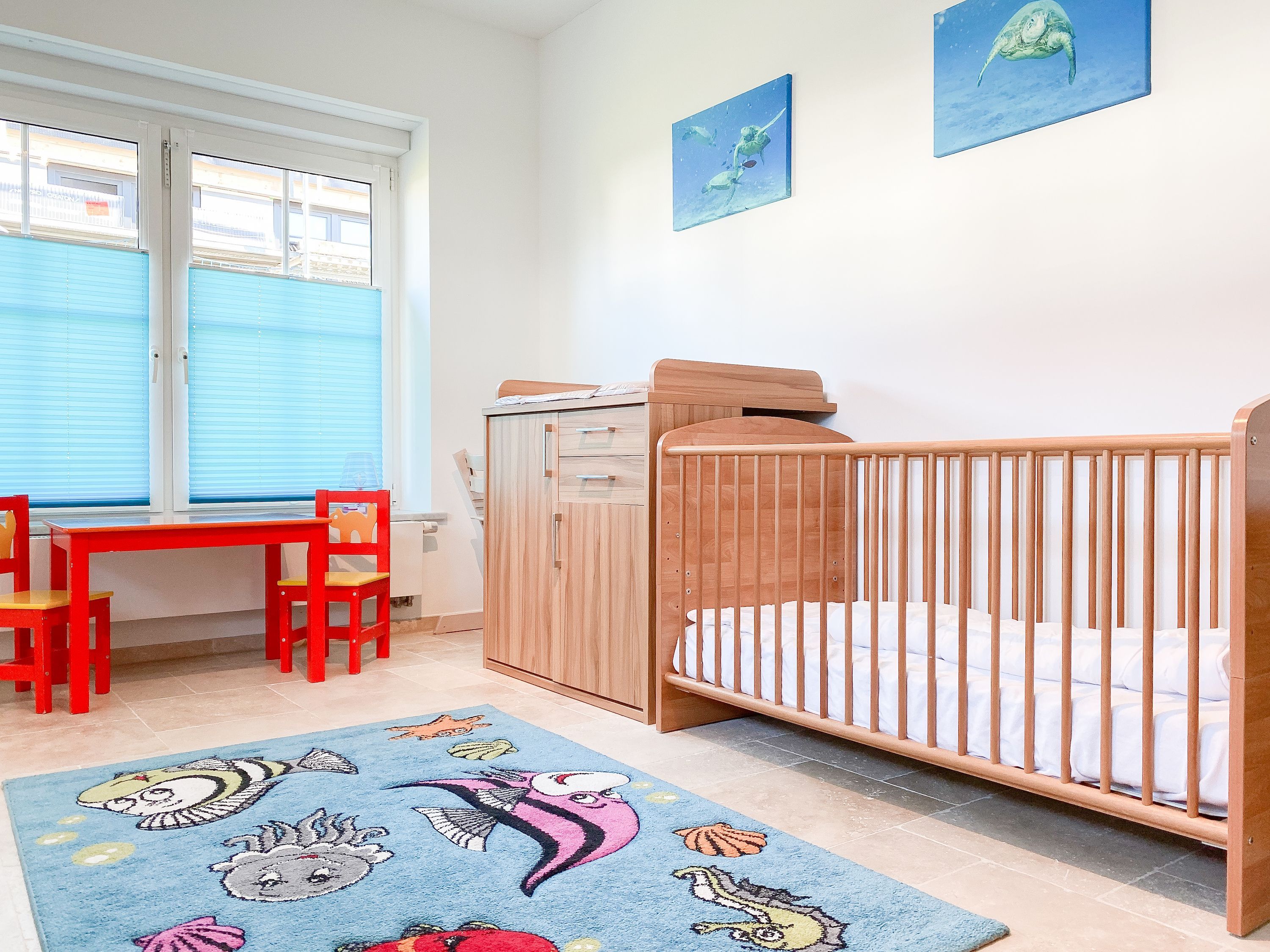 Im Erdgeschoss befinden sich zwei geräumige Schlafzimmer mit Doppelbetten und TV, zwei moderne Duschbäder sowie ein weiteres Schlafzimmer mit Einzelbett, Kinderbett und Wickelkommode für die Kleinsten. Weiter eine abgeschlossene, gut ausgestattete Küche mit gemütlichem Frühstücksbereich. Über den Flur ist das für 9 Personen ausgelegte Esszimmer sowie das großzügige, angeschlossene Wohnzimmer (TV, Sonosanlage, WLAN) zu erreichen. Im Obergeschoss sind zwei weitere große Schlafzimmer mit Doppelbetten, Balkon und TV sowie das Masterbad mit Badewanne, Dusche und integrierter Sauna. Alle Fenster sind mit elektrischen Außenjalousien versehen. Waschmaschine und Trockner sind im Keller untergebracht. Auf dem Grundstück befinden sich drei PKW Stellplätze. Am Haus befindet sich eine Wallbox zum Laden von E -Fahrzeugen (vorherige Anmeldung notwendig).