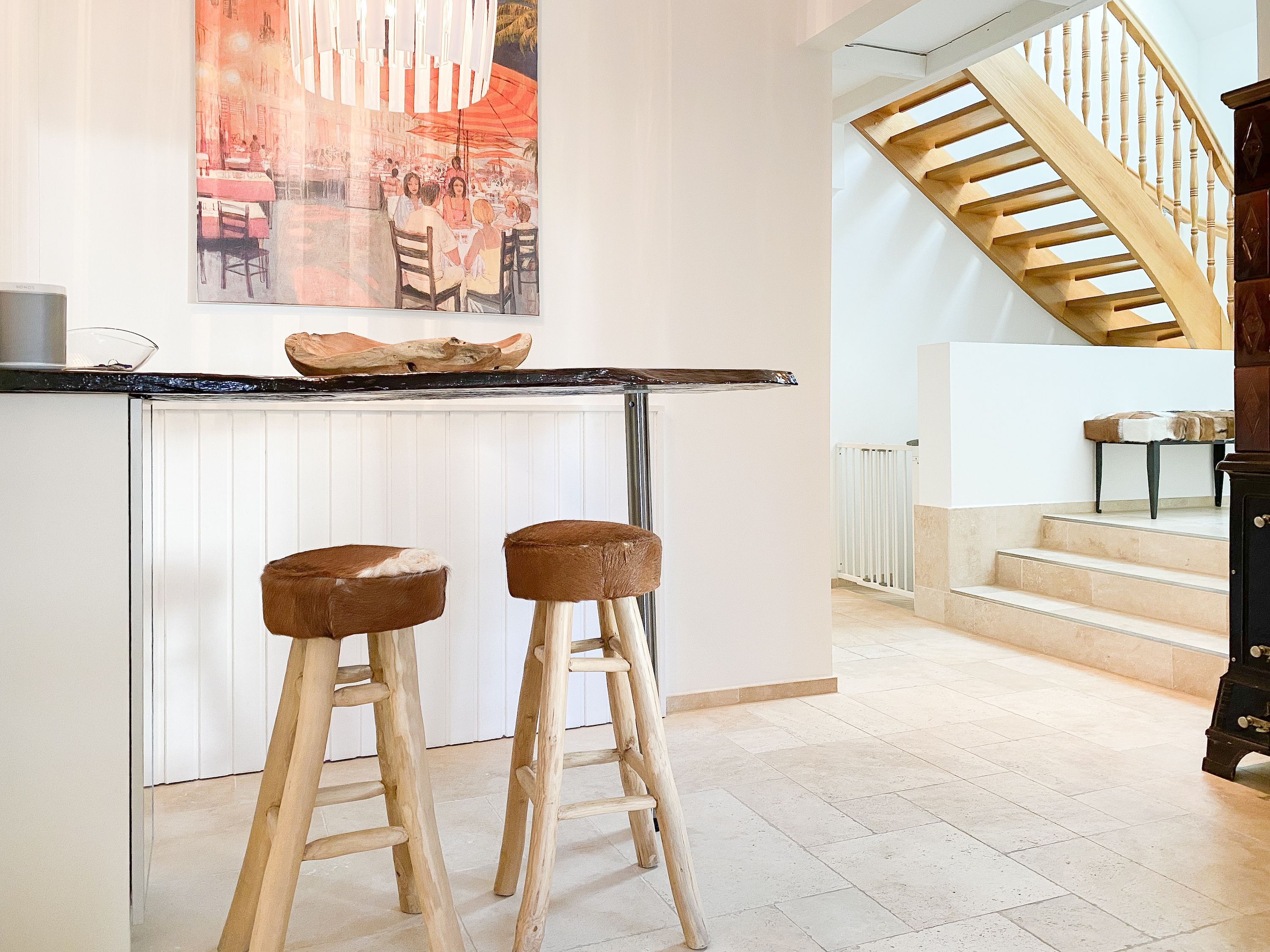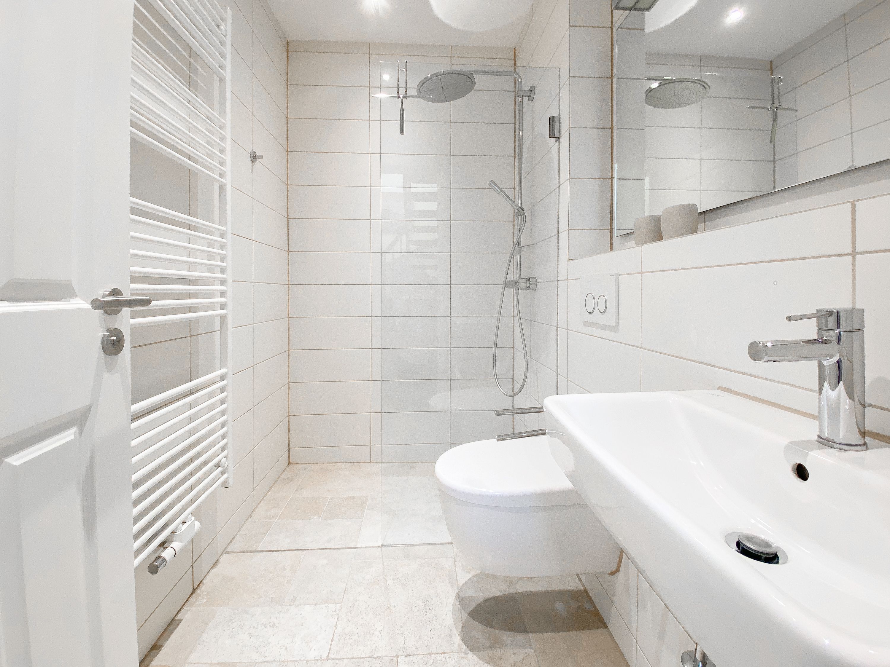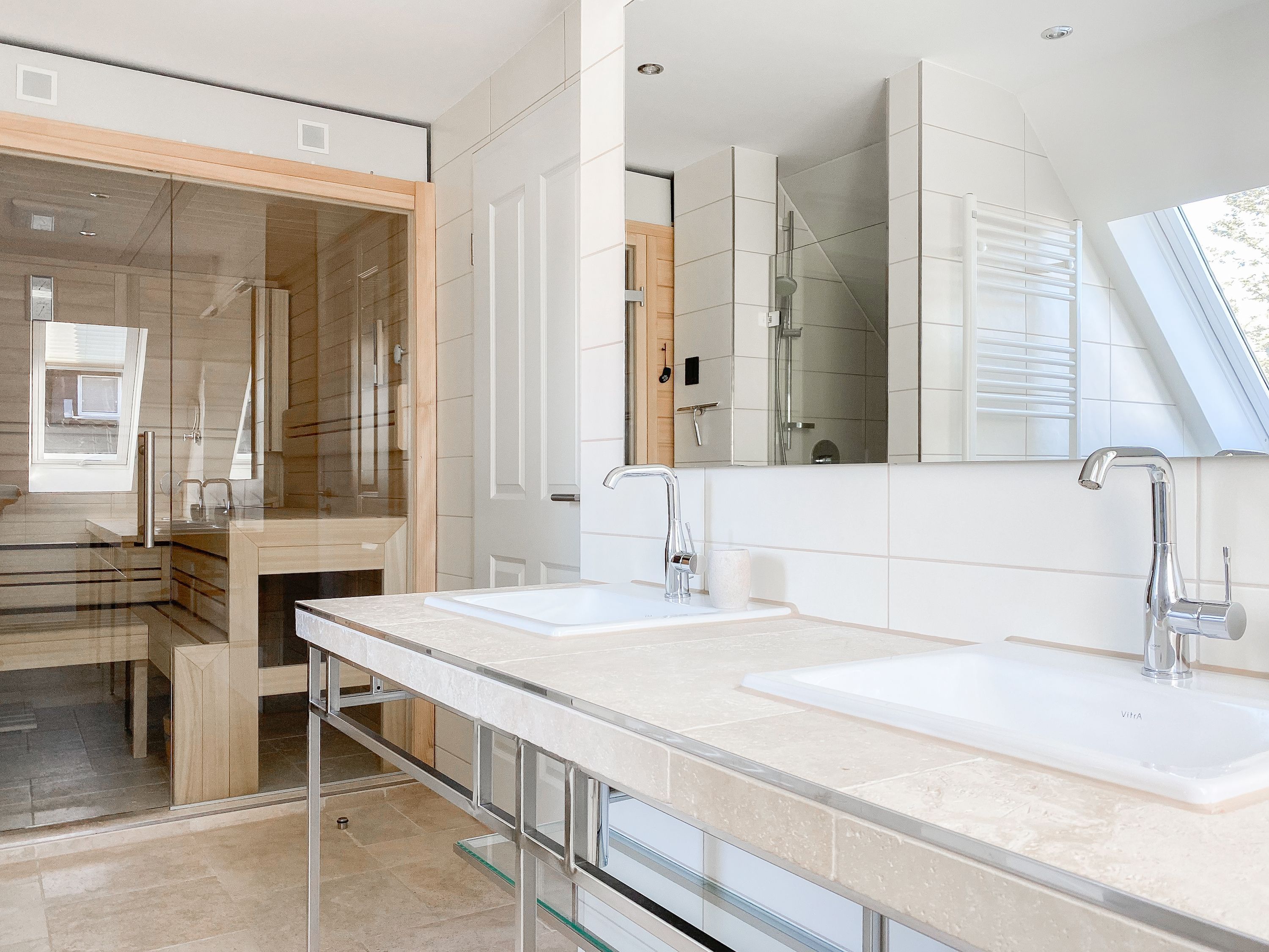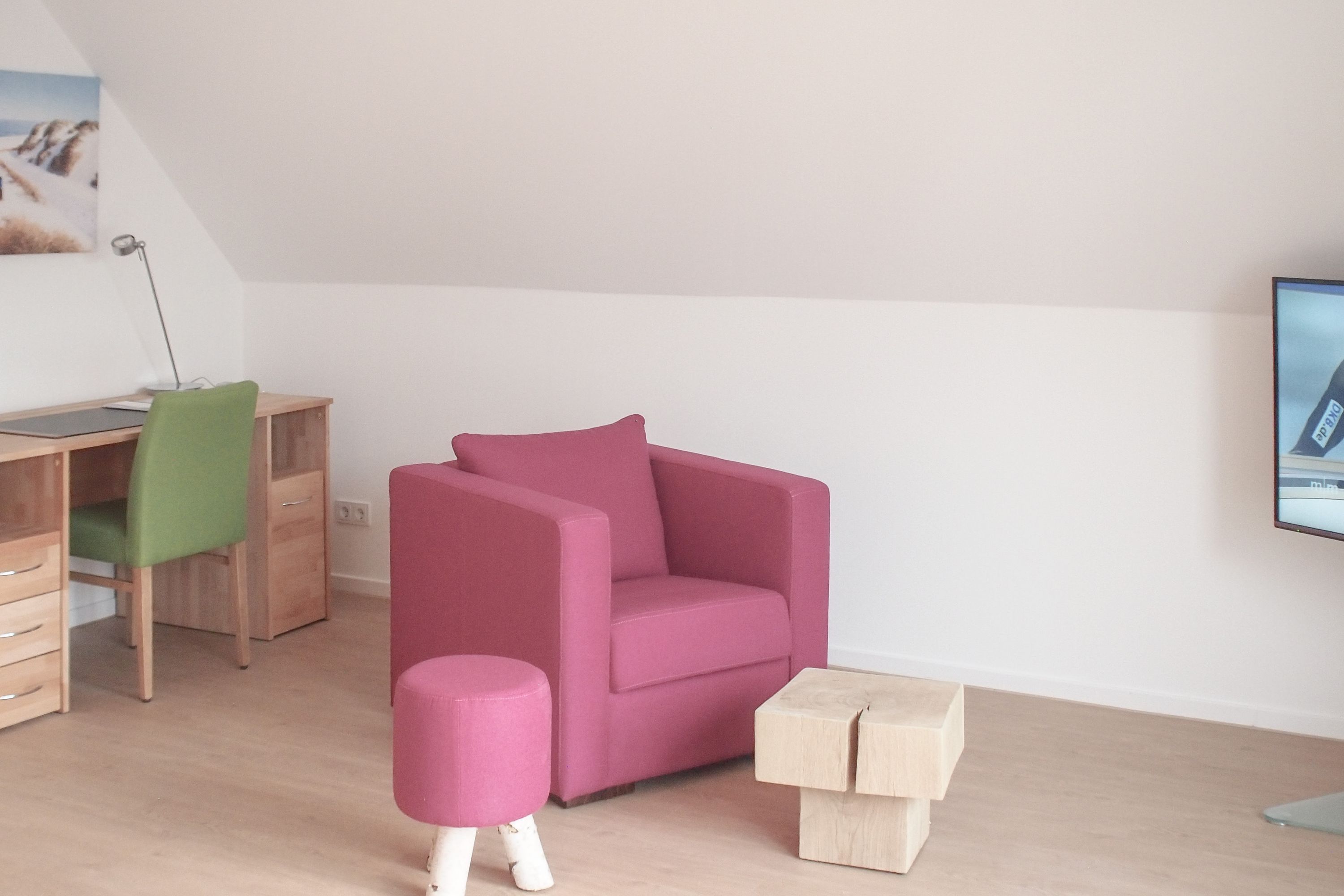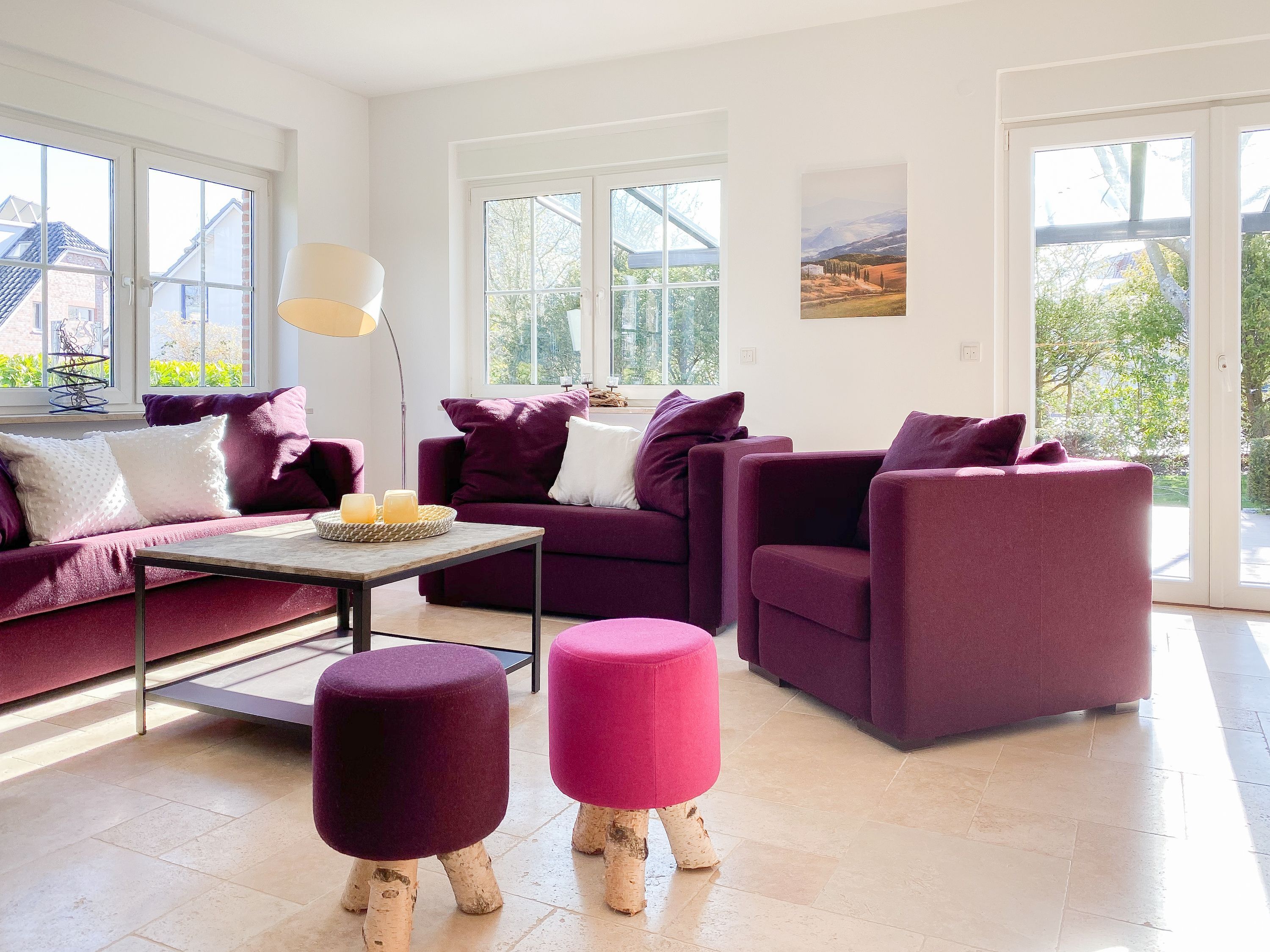 Im Erdgeschoss befinden sich zwei geräumige Schlafzimmer mit Doppelbetten und TV, zwei moderne Duschbäder sowie ein weiteres Schlafzimmer mit Einzelbett, Kinderbett und Wickelkommode für die Kleinsten. Weiter eine abgeschlossene, gut ausgestattete Küche mit gemütlichem Frühstücksbereich. Über den Flur ist das für 9 Personen ausgelegte Esszimmer sowie das großzügige, angeschlossene Wohnzimmer (TV, Sonosanlage, WLAN) zu erreichen. Im Obergeschoss sind zwei weitere große Schlafzimmer mit Doppelbetten, Balkon und TV sowie das Masterbad mit Badewanne, Dusche und integrierter Sauna. Alle Fenster sind mit elektrischen Außenjalousien versehen. Waschmaschine und Trockner sind im Keller untergebracht. Auf dem Grundstück befinden sich drei PKW Stellplätze. Am Haus befindet sich eine Wallbox zum Laden von E -Fahrzeugen (vorherige Anmeldung notwendig).
