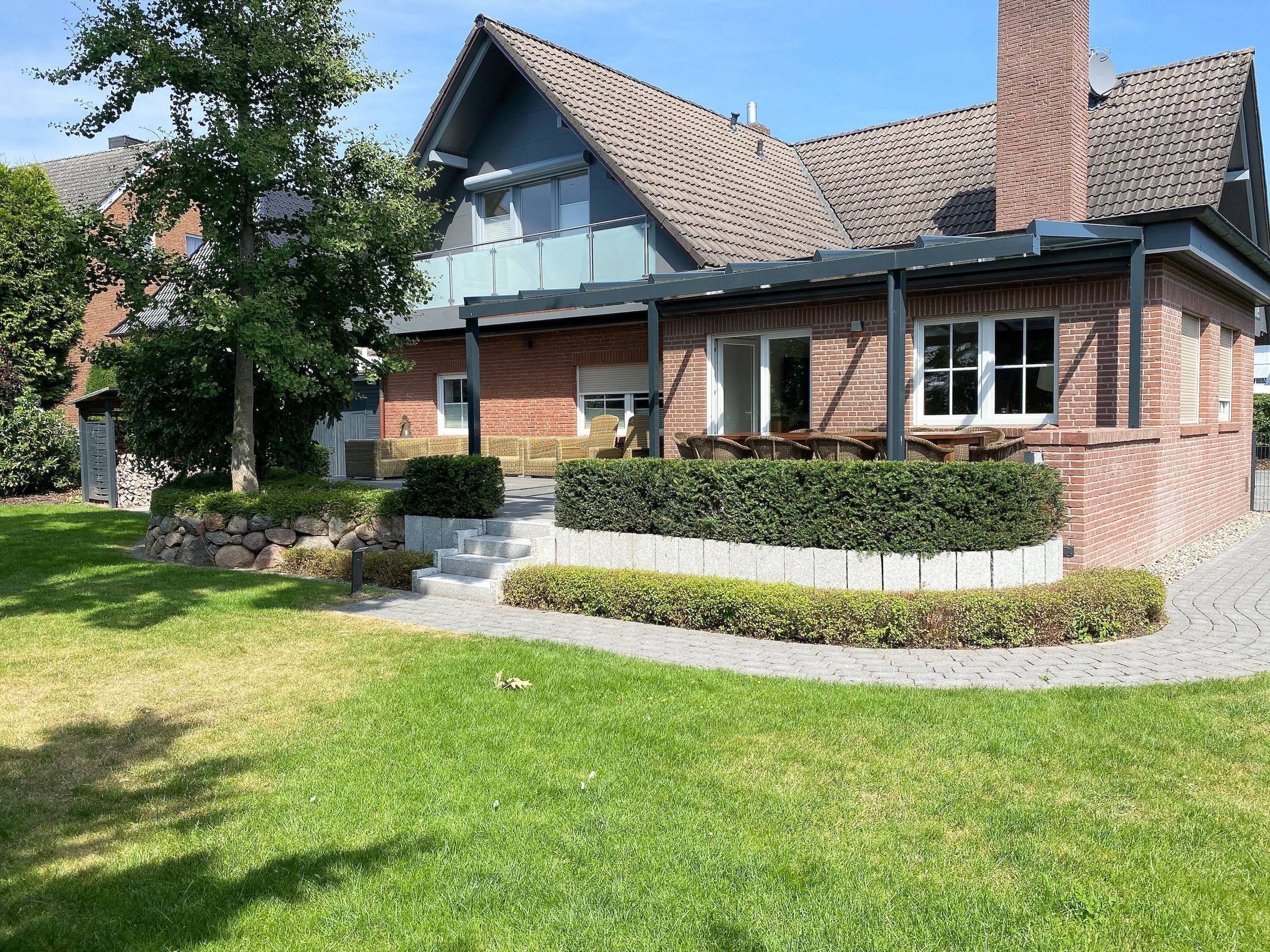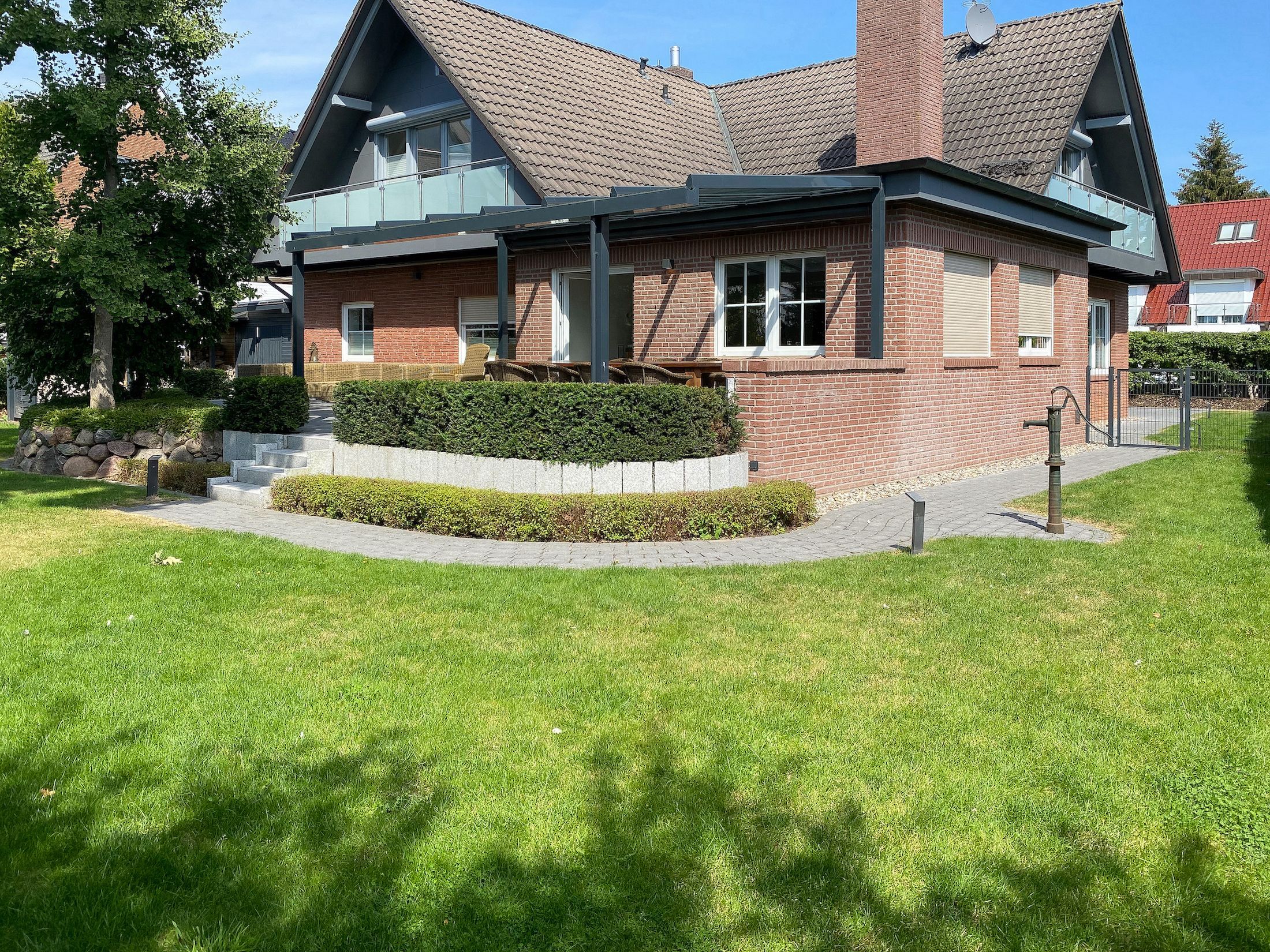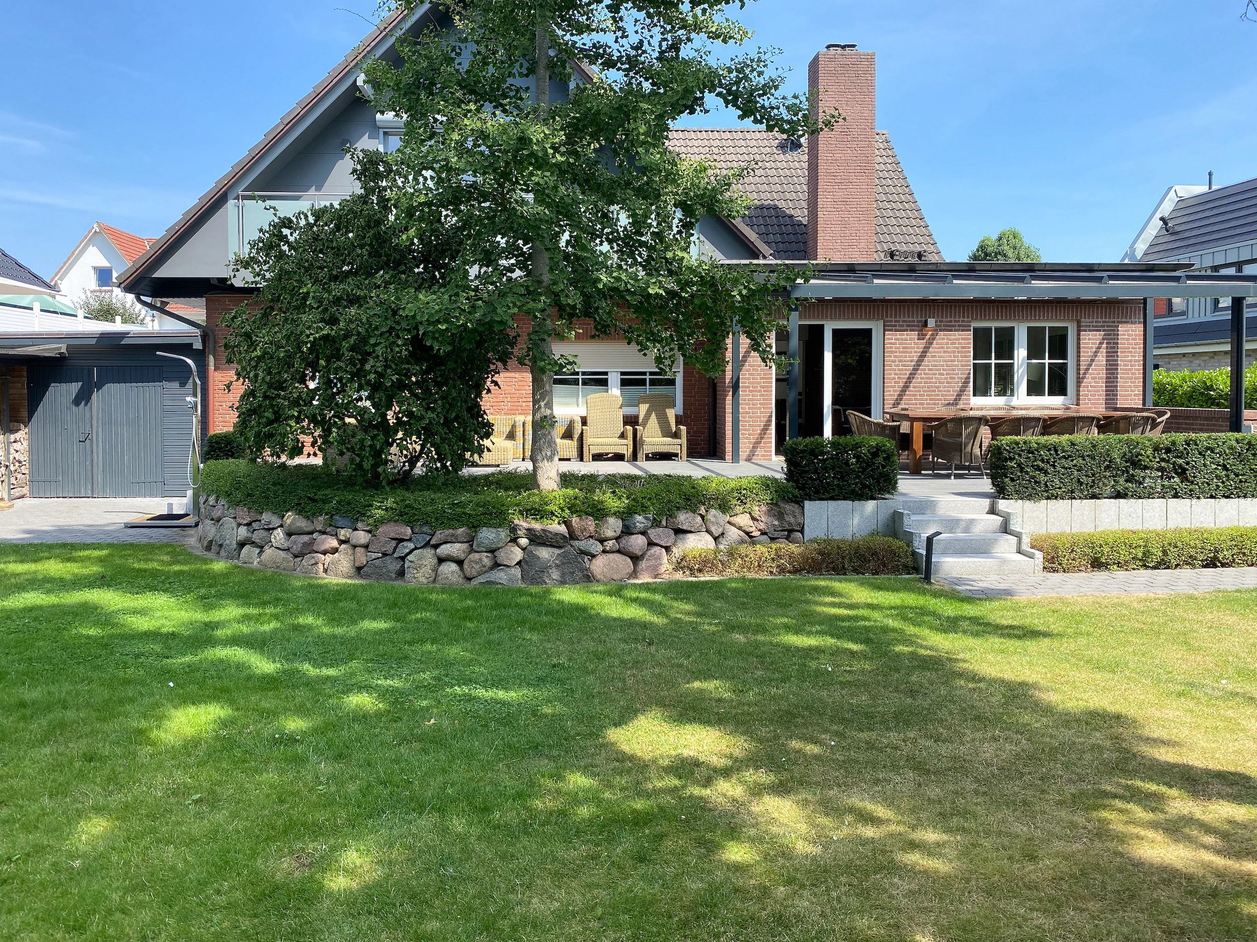 Das Ferienhaus Seepferd bietet auf 240 m² zeitgemäßen Luxus und eine Atmosphäre zum Wohlfühlen. Das äußerst großzügige, neu angelegte Gartengrundstück (eingezäunt) lässt keine Wünsche offen. Es gibt eine überdachte Sonnenterrasse mit elektrischer Markise, einen Essbereich für 10 Personen, einen gemütlichen Loungebereich und eine Gartendusche.