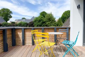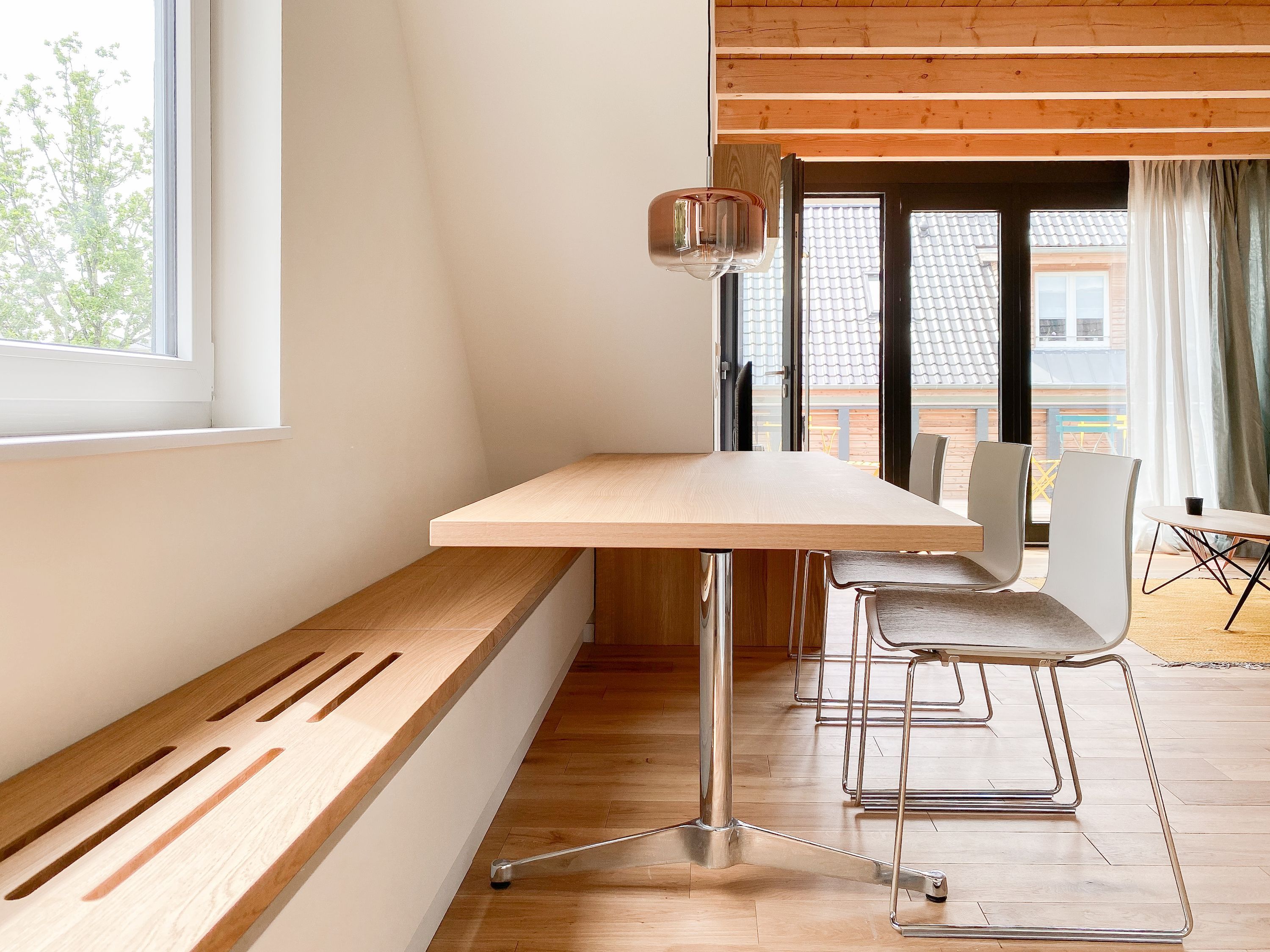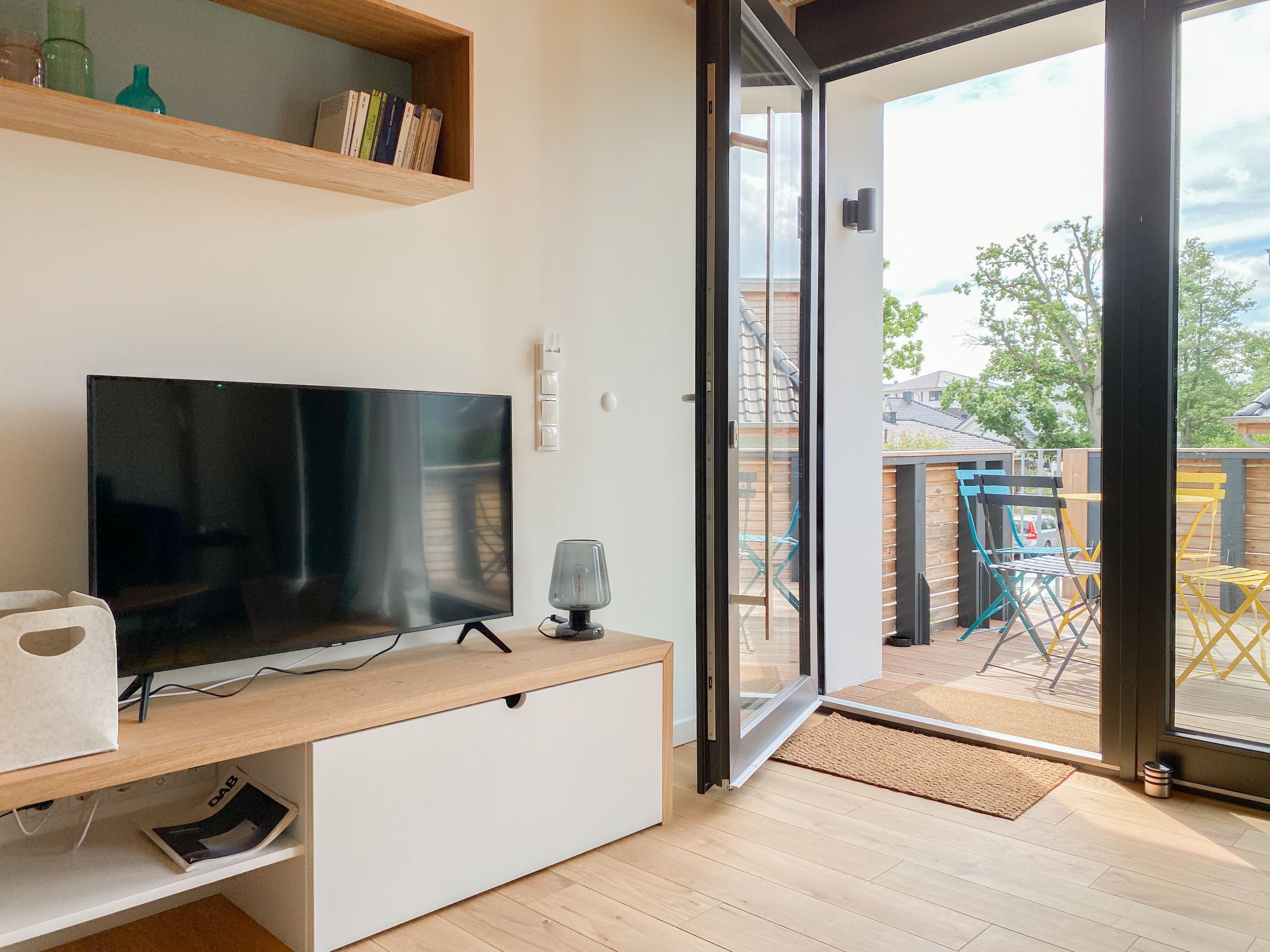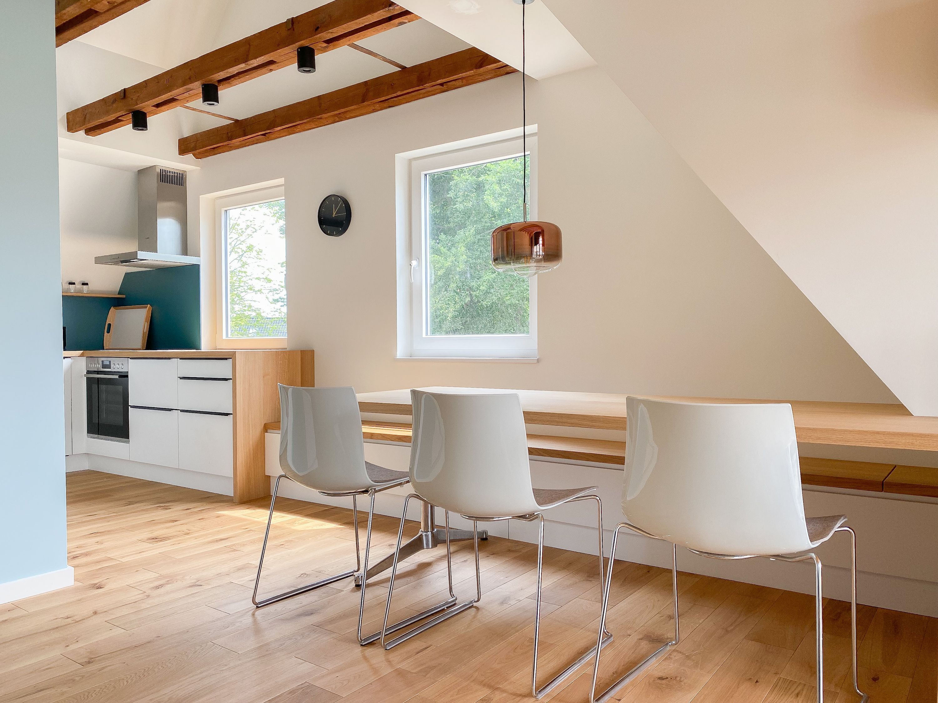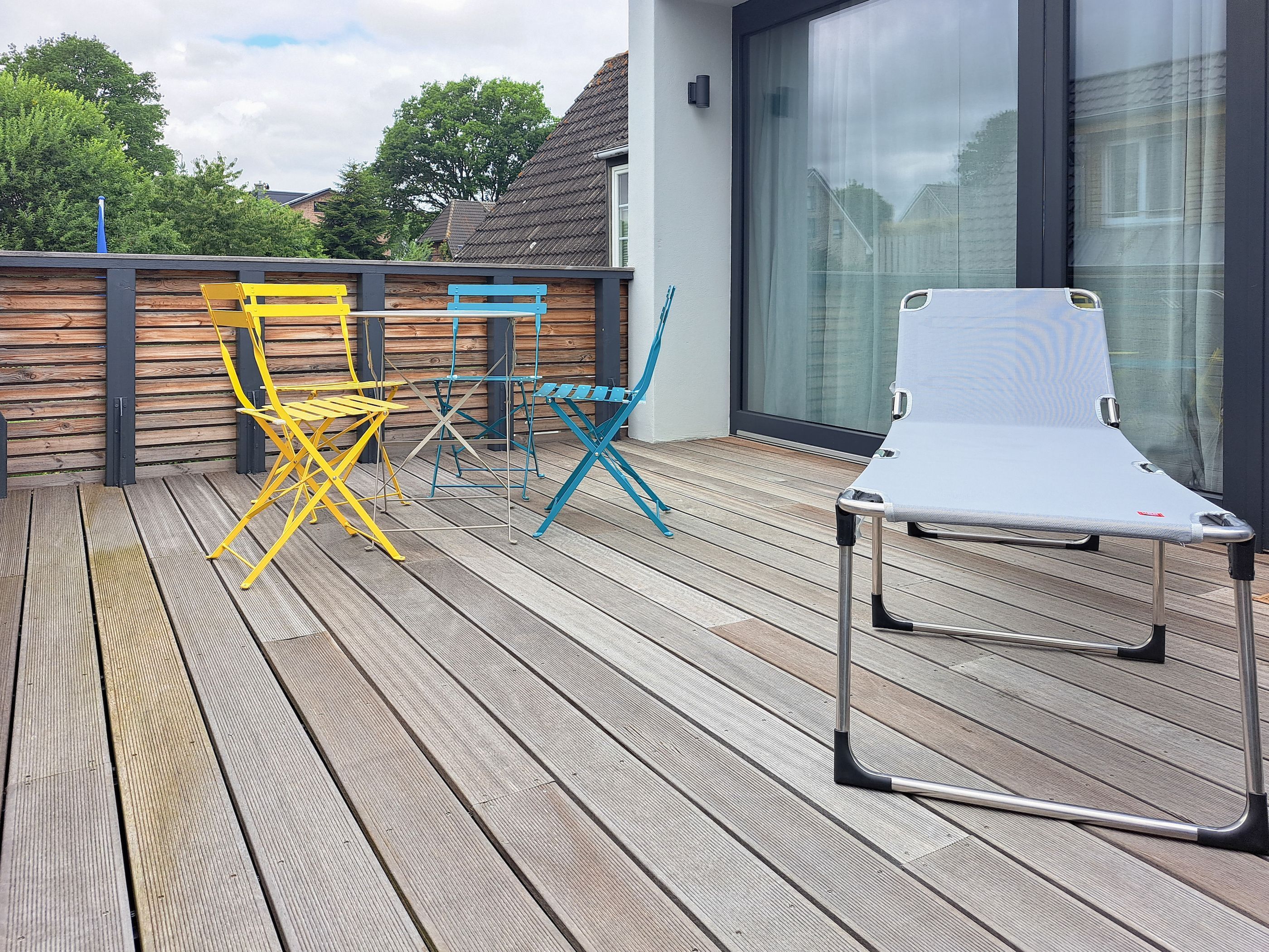 Es erwartet Sie eine wunderschöne Ferienwohnung im hyggeligen Wohnstil, der Gemütlichkeit und Wohlbefinden vermittelt. Natürliche Materialien, warme Farben und ein durchdachtes Raumkonzept schaffen eine ganz besondere Atmosphäre, um wohl verdiente Urlaubstage zu genießen. Der lichtdurchflutete Wohnbereich ist mit einem gemütlichen Ecksofa und TV ausgestattet. Die vorgelagerte Holzveranda in Südwest Ausrichtung ist großzügig angelegt und bietet ein tolles Ambiente für geselliges Zusammensein. Der anschließende Essbereich bietet ausreichend Platz für 6 Personen und fügt sich harmonisch in die top ausgestattete Wohnküche ein. Es gibt insgesamt 3 Schlafzimmer. Schlafzimmer 1 ist mit einem Doppelbett (180x200) und Verdunkelungsvorhängen, Schlafzimmer 2 mit einem Einzelbett (90x200) mit Auszug (80x175) und black out Rollo eingerichtet. Das dritte Schlafzimmer (Palettenbett 160x200 und black out Rollos) ist über eine Treppe vom Flur zu erreichen und als halboffene Galerie gestaltet. Im lichtdurchfluteten Bad wurde jeder qm optimal genutzt und ein Doppelwaschtisch, WC und eine Walk In Dusche untergebracht. WLAN steht selbstverständlich kostenlos zur Verfügung. Eine Waschmaschine ist in der Küche integriert.