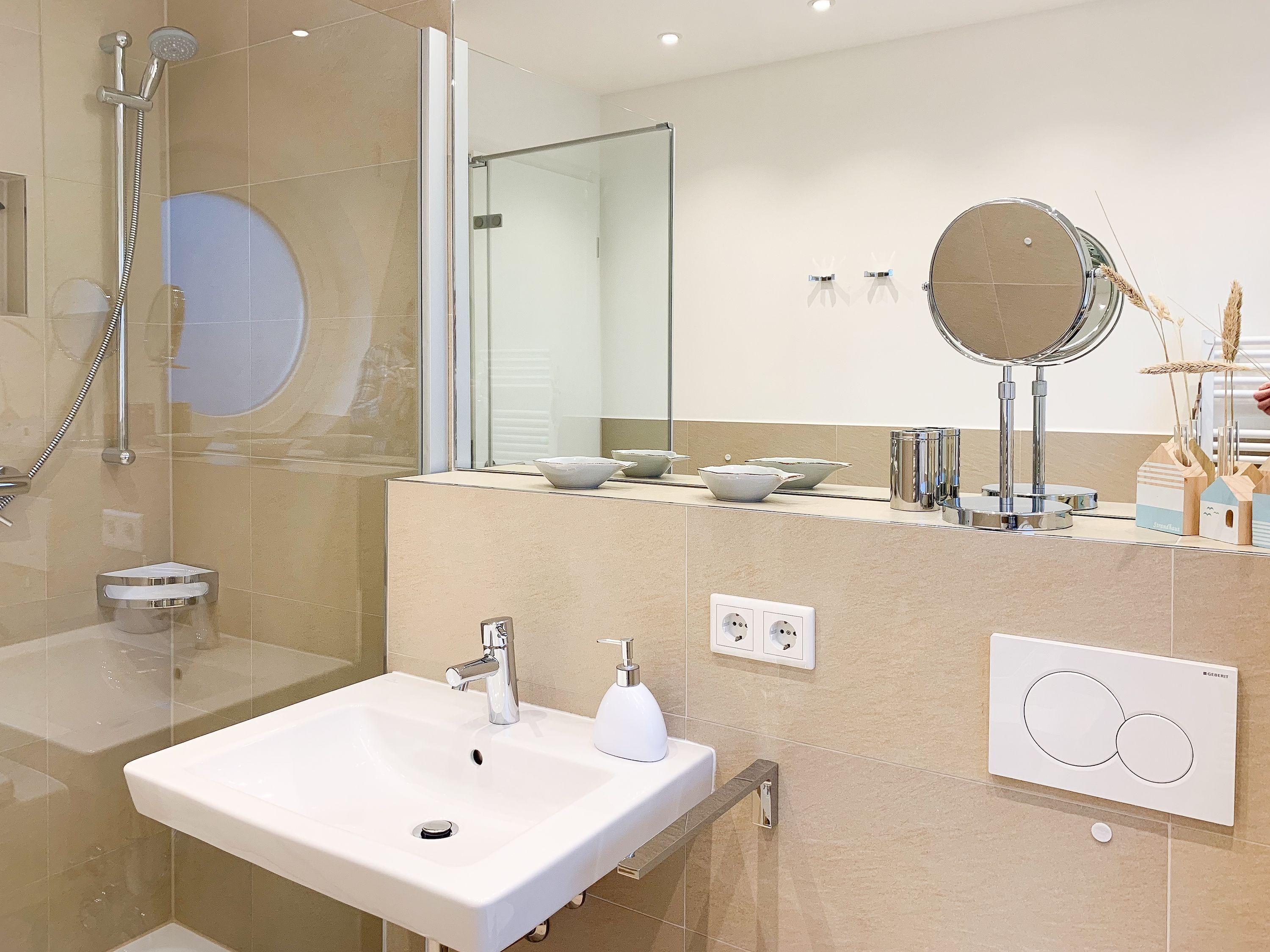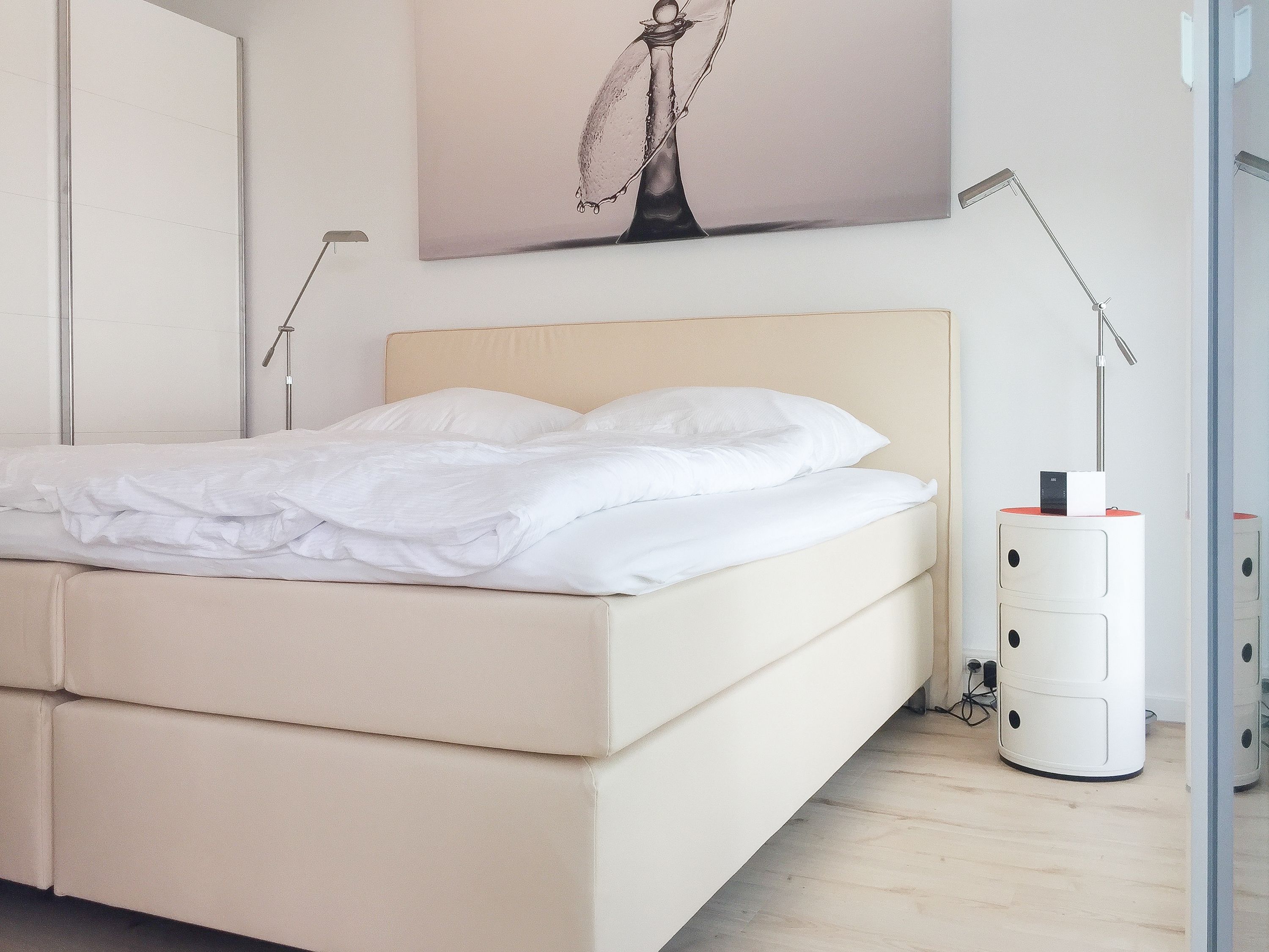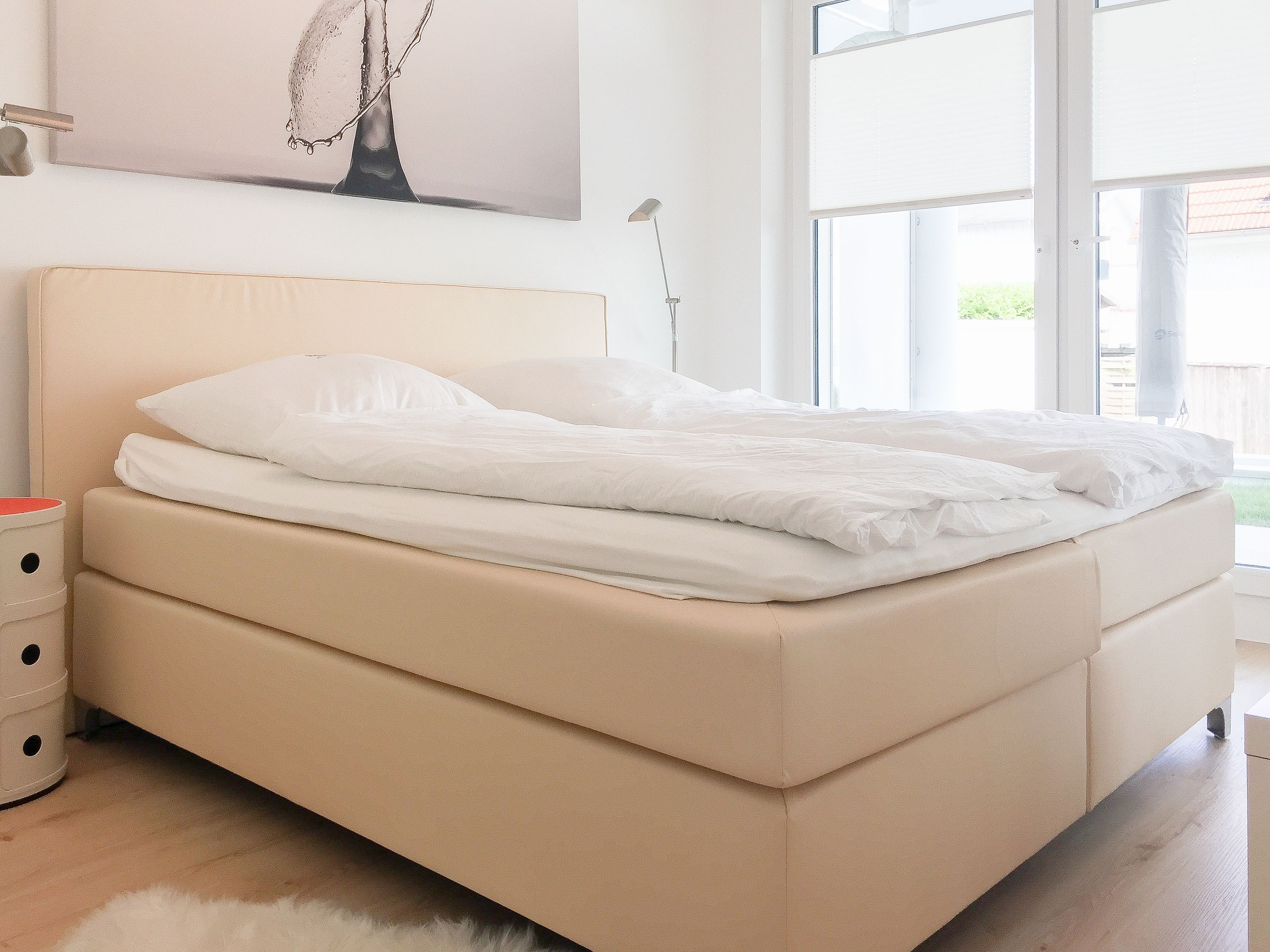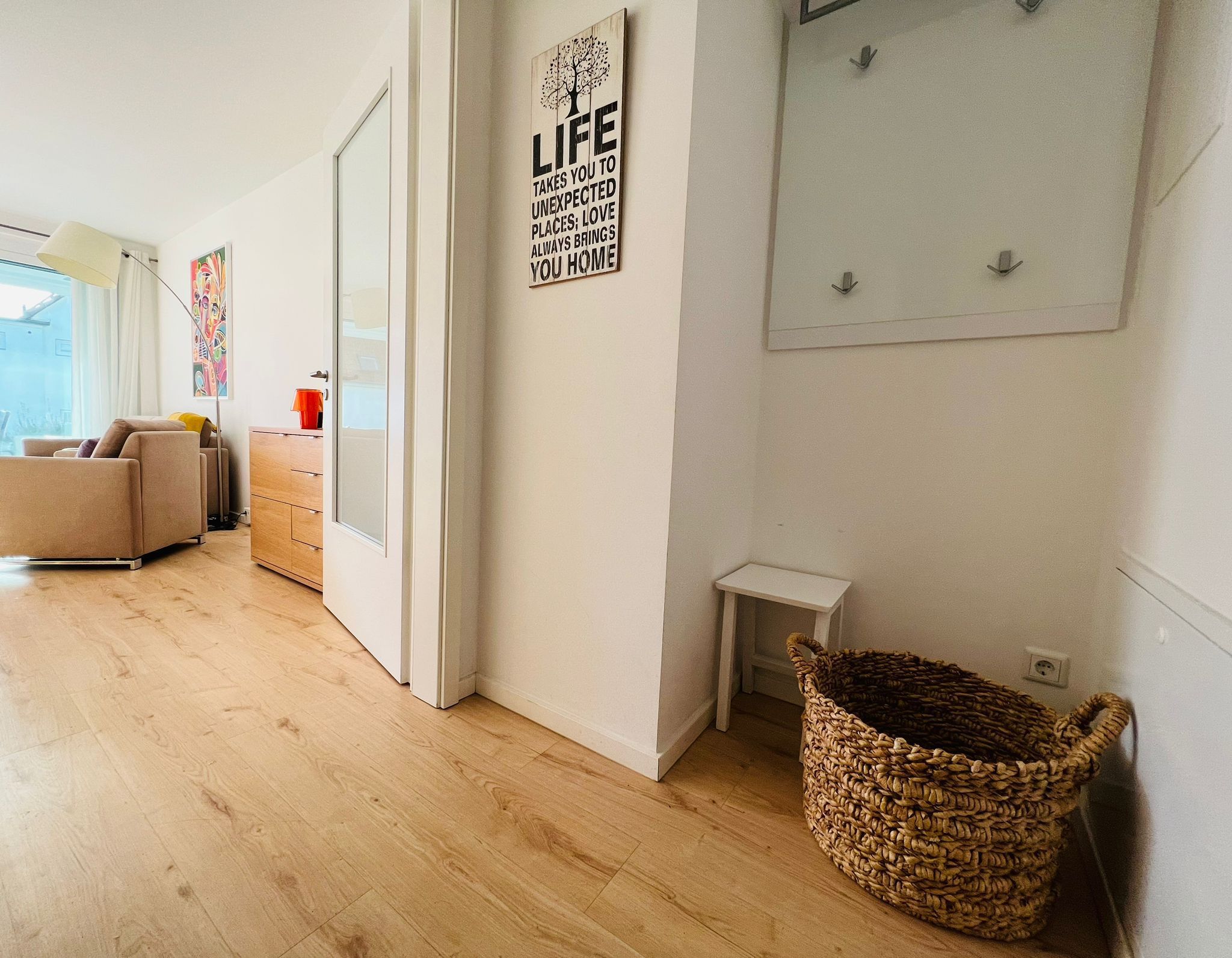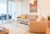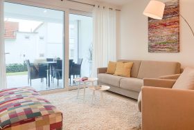 Bodentiefe Fenster, Bio-Designboden und die hochwertige Einrichtung sorgen für  eine helle und angenehme Wohnatmosphäre. Auf der überdachten Sonnenterrasse, die sich über die gesamte Breite der Wohnung erstreckt, lässt es sich vom Frühstück bis zum Abend herrlich entspannen. Die moderne Einbauküche ist bestens ausgestattet und der integrierte Essbereich bietet ausreichend Platz für 3 Personen. Der Wohnbereich mit Terrassenzugang ist mit einem Schlafsofa, Sessel, TV und WLAN ausgestattet. Das Schlafzimmer, ebenfalls mit Terrassenzugang, verfügt über ein Boxspringbett (180x200) und TV.  Alle Fenster sind mit elektrischen Außenjalousien versehen. Das hochwertige, helle Bad ist großzügig angelegt.