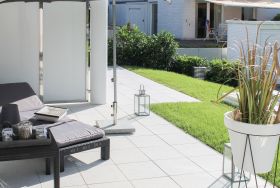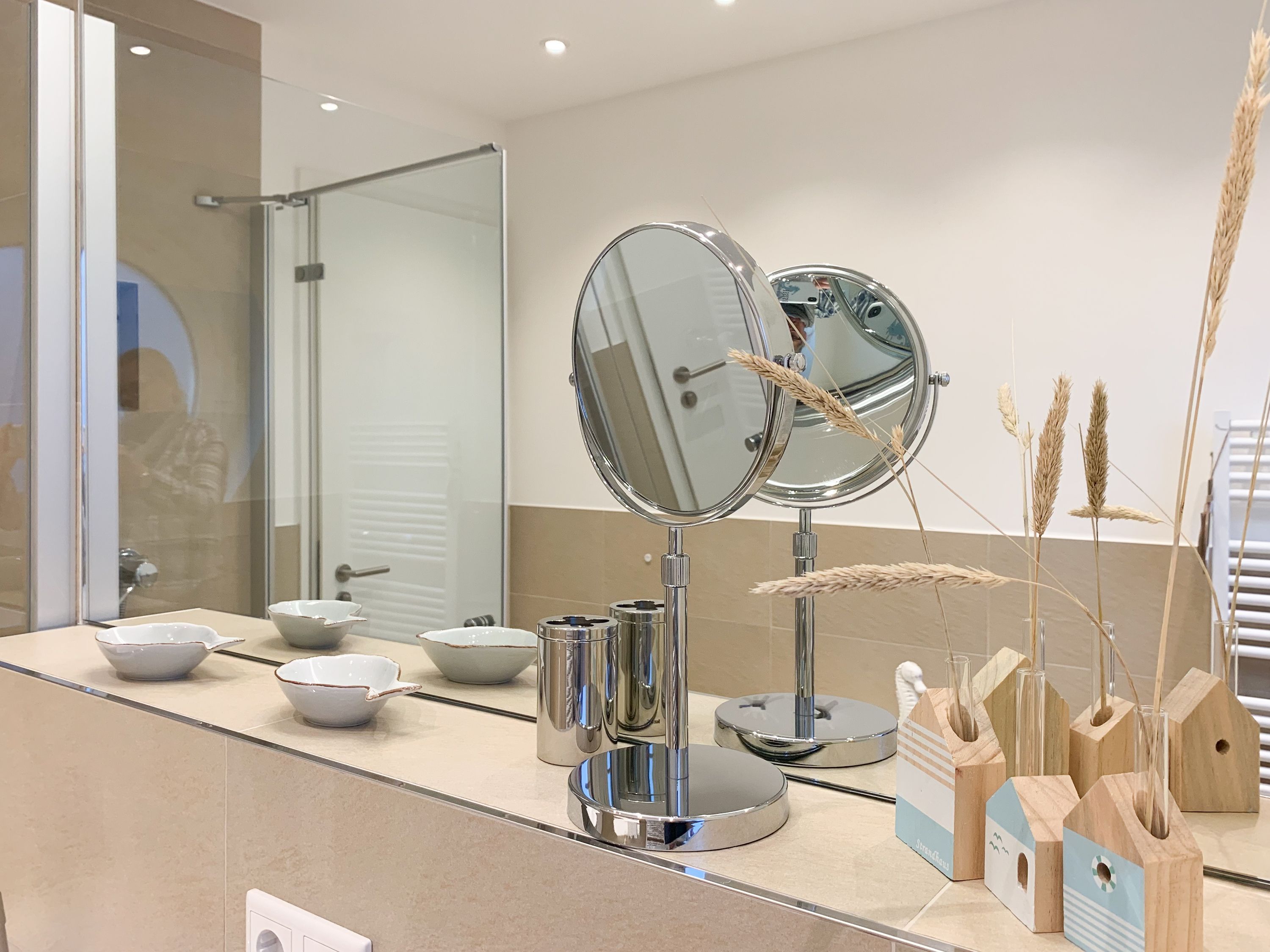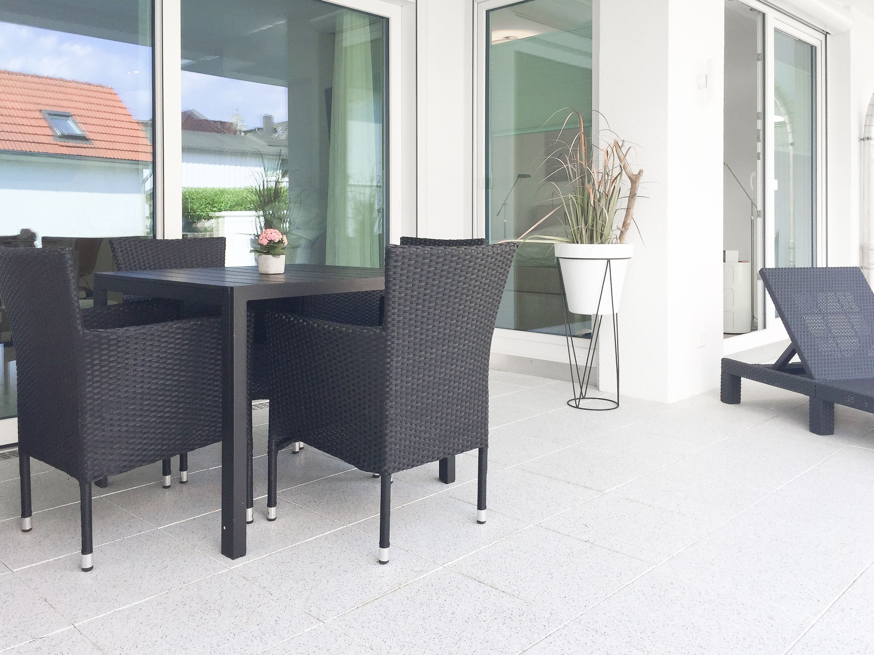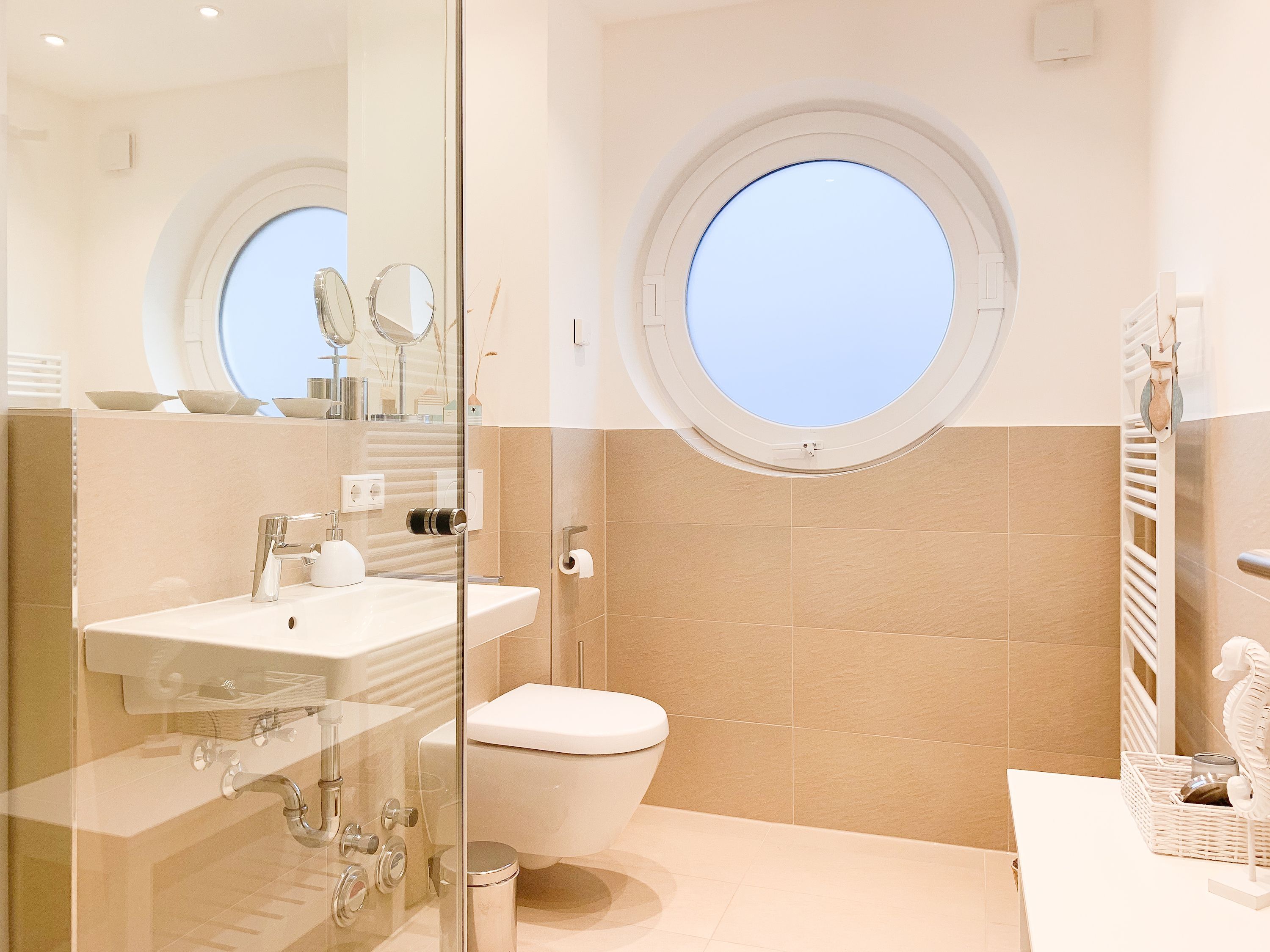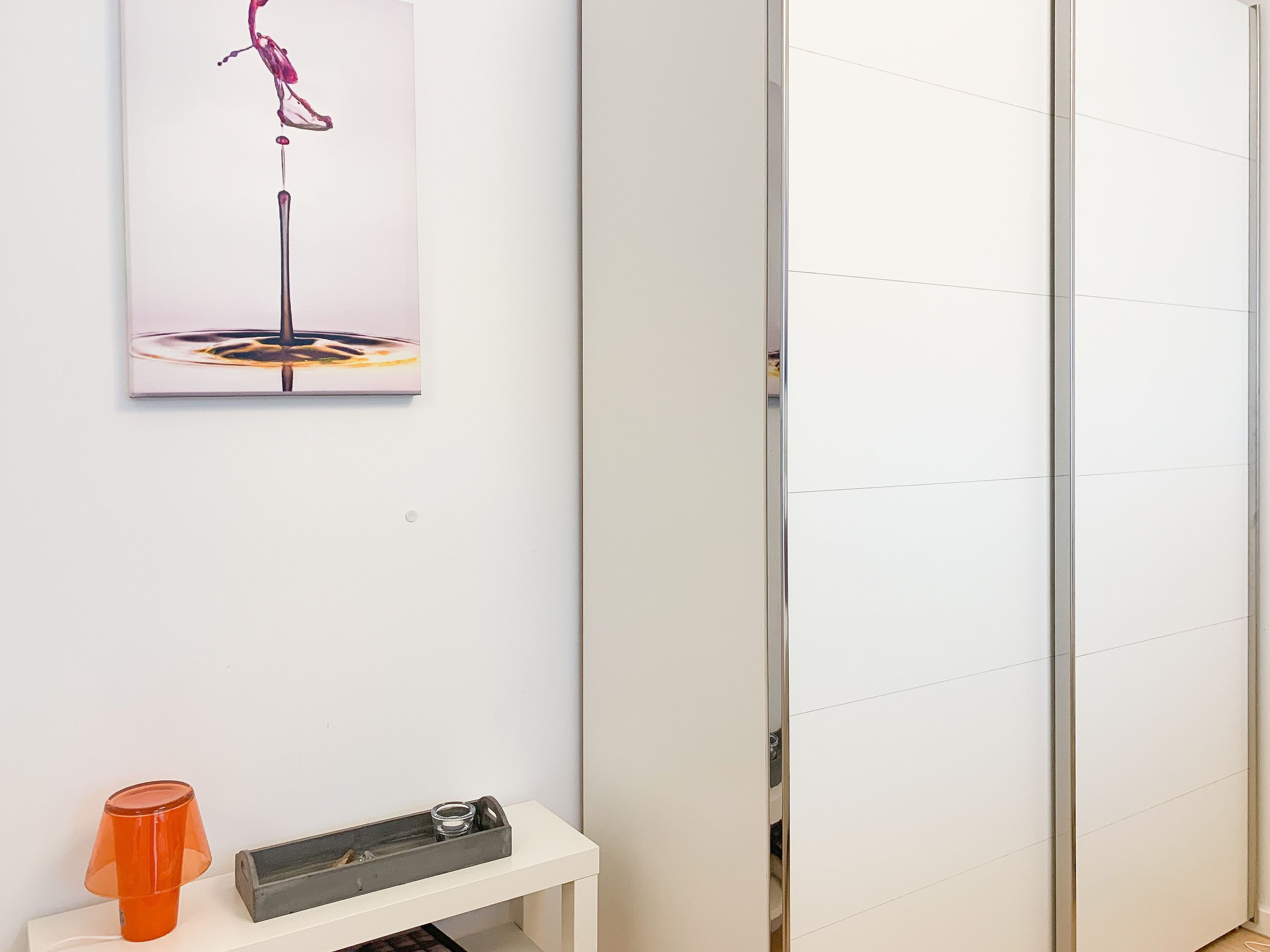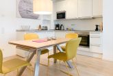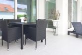 Bodentiefe Fenster, Bio-Designboden und die hochwertige Einrichtung sorgen für  eine helle und angenehme Wohnatmosphäre. Auf der überdachten Sonnenterrasse, die sich über die gesamte Breite der Wohnung erstreckt, lässt es sich vom Frühstück bis zum Abend herrlich entspannen. Die moderne Einbauküche ist bestens ausgestattet und der integrierte Essbereich bietet ausreichend Platz für 3 Personen. Der Wohnbereich mit Terrassenzugang ist mit einem Schlafsofa, Sessel, TV und WLAN ausgestattet. Das Schlafzimmer, ebenfalls mit Terrassenzugang, verfügt über ein Boxspringbett (180x200) und TV.  Alle Fenster sind mit elektrischen Außenjalousien versehen. Das hochwertige, helle Bad ist großzügig angelegt.