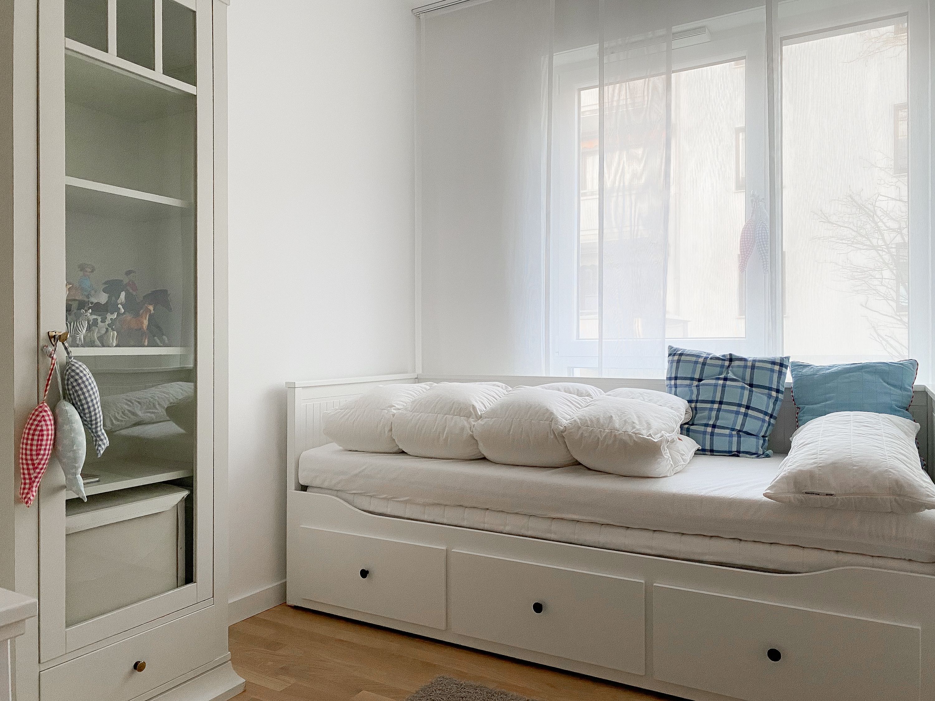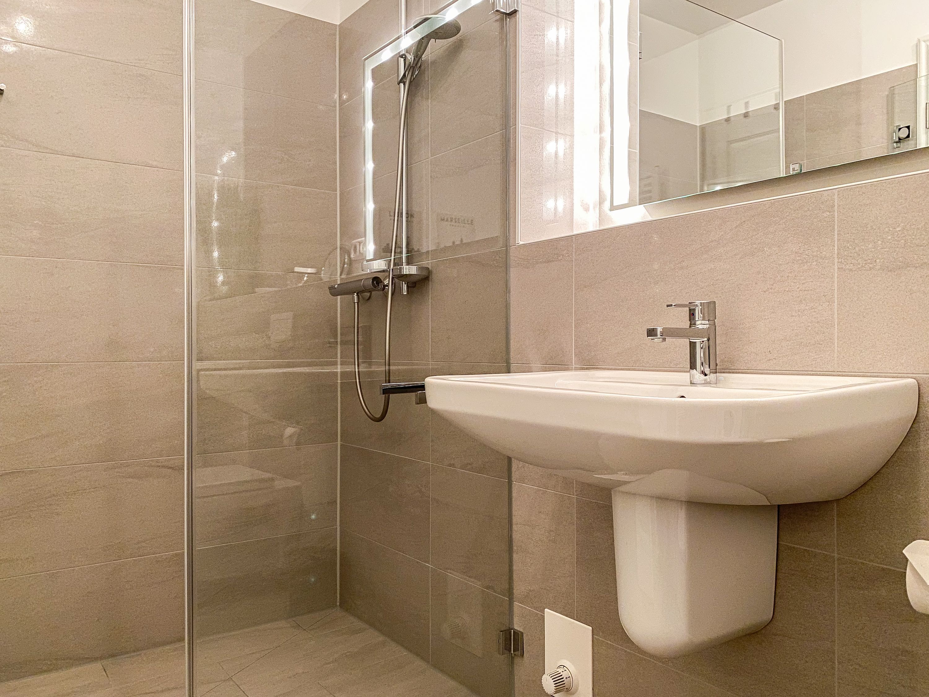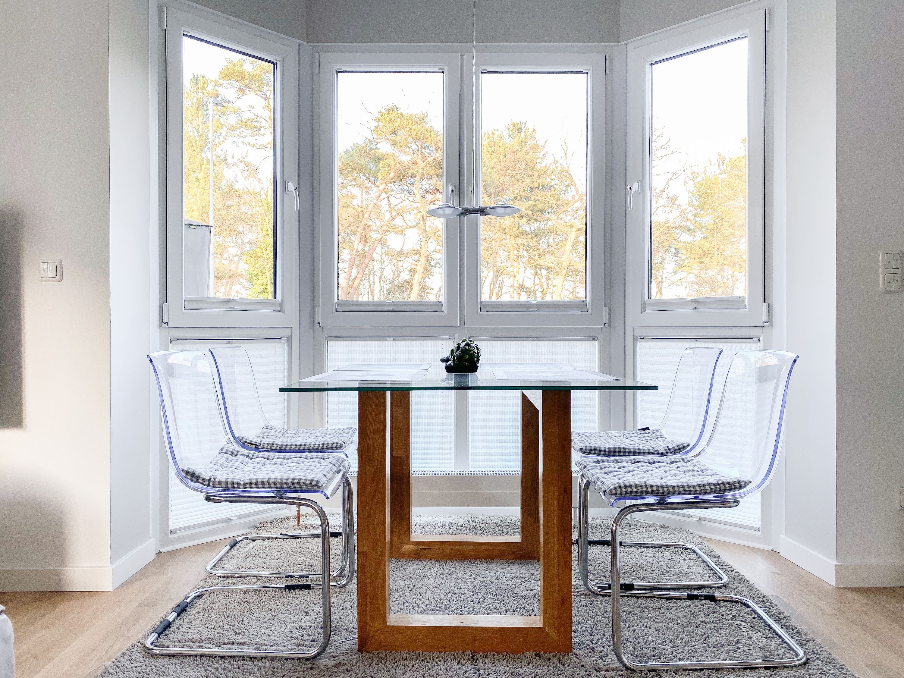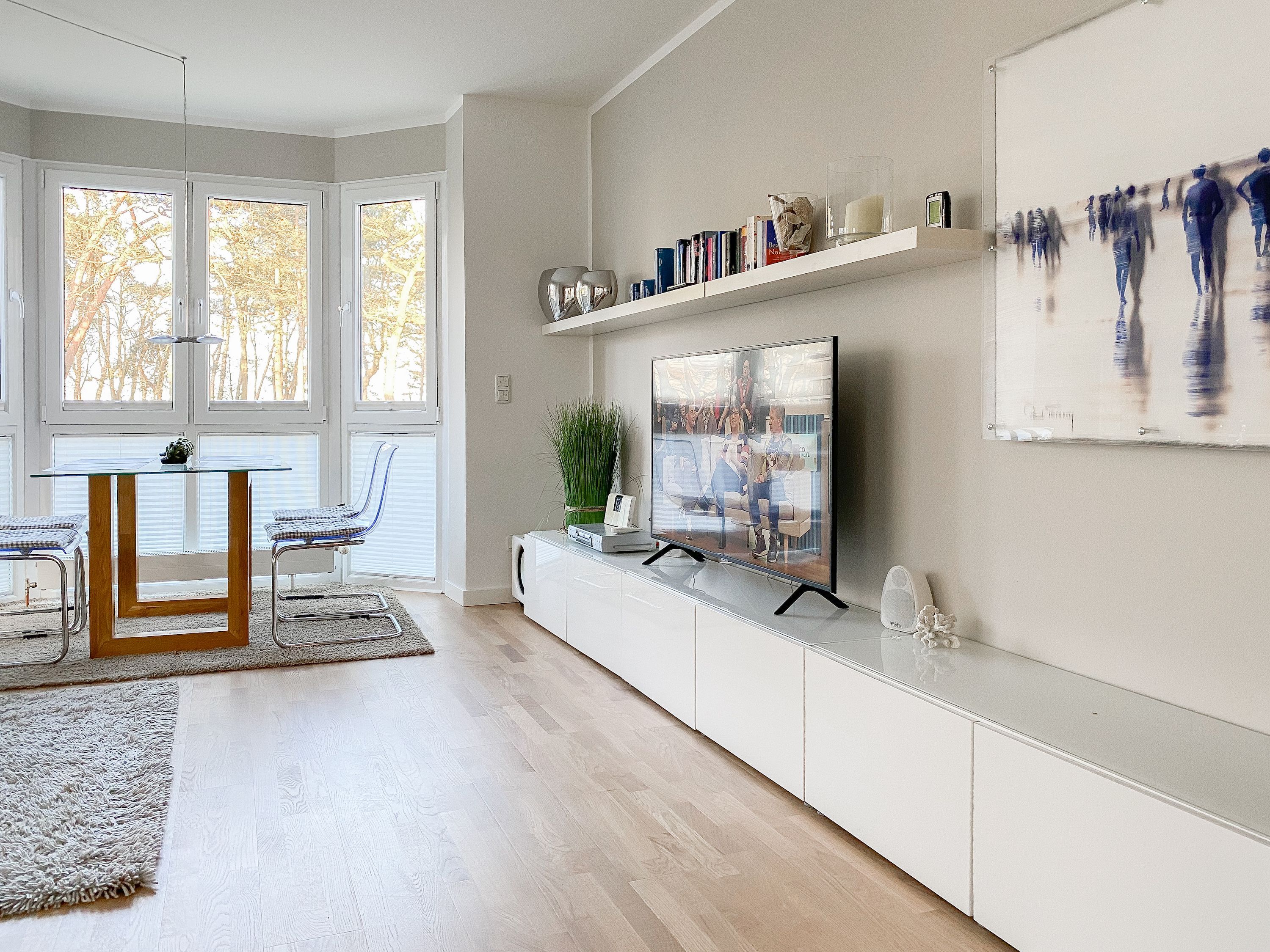Die moderne, geschmackvoll eingerichtete Wohnung verfügt über einen großzügigen Wohnbereich mit angrenzendem Essbereich und schönem Blick durch den gegenüberliegenden Park bis zur Ostsee. Die Räumlichkeiten sind hell und freundlich dank bodentiefer Fensterelemente, die alle mit elektrischen Außenjalousien versehen sind. Die offene, hochwertige Einbauküche ist bestens ausgestattet und verfügt über alle technischen Geräte. Es stehen zwei separate Schlafzimmer zur Verfügung. Eines ist mit einem komfortablen Doppelbett (180x200) ausgestattet, das Kinderzimmer verfügt über zwei Einzelbetten. Im modernen Bad mit großzügigem, ebenerdigen Duschbereich und Fußbodenheizung sind auch Waschmaschine und Trockner untergebracht. Ein separates Gäste WC steht ebenfalls zur Verfügung. Zwei große Terrassen, ausgestattet mit Gartenmöbeln und Strandkorb, eignen sich hervorragend zum Entspannen.