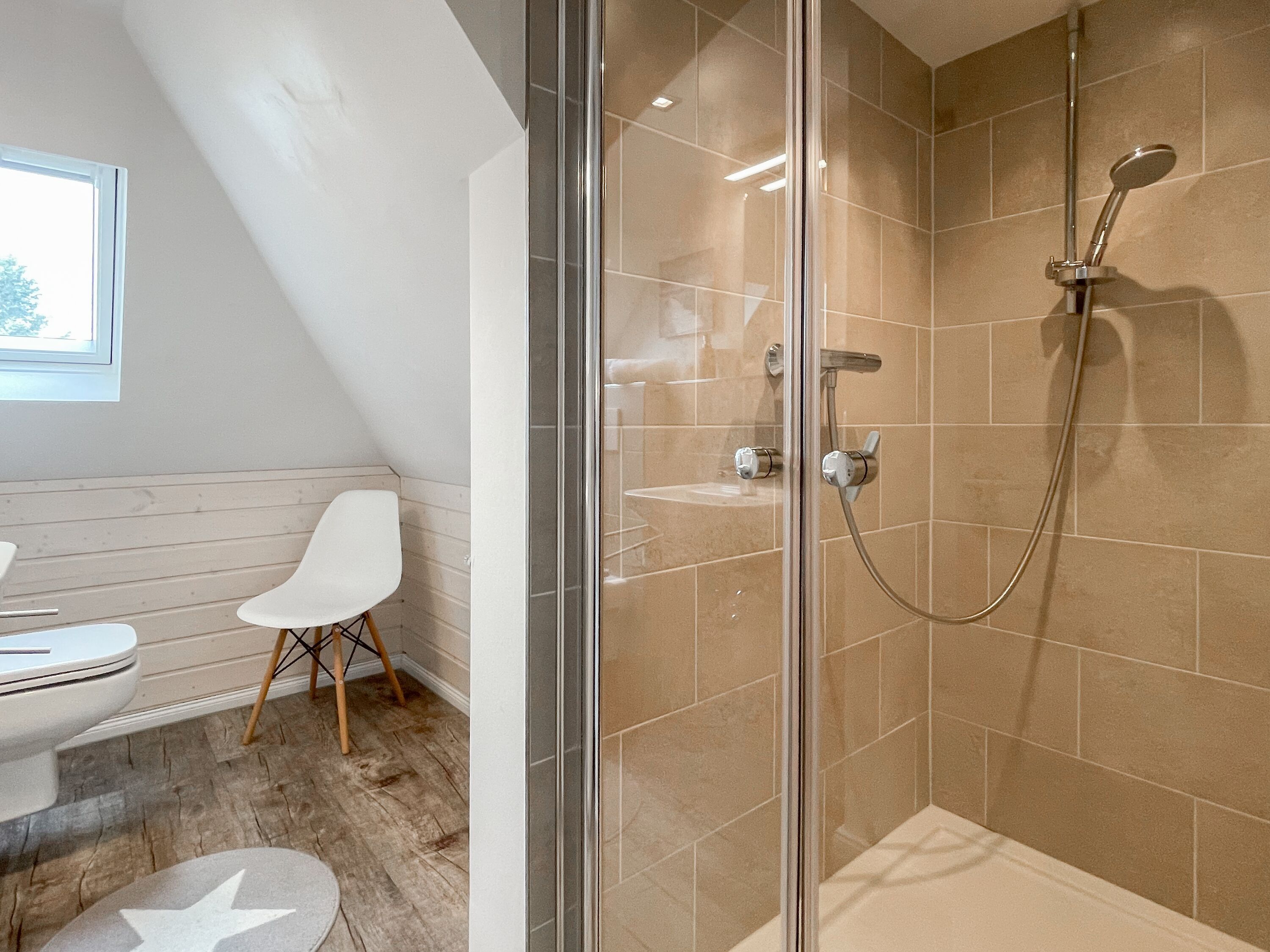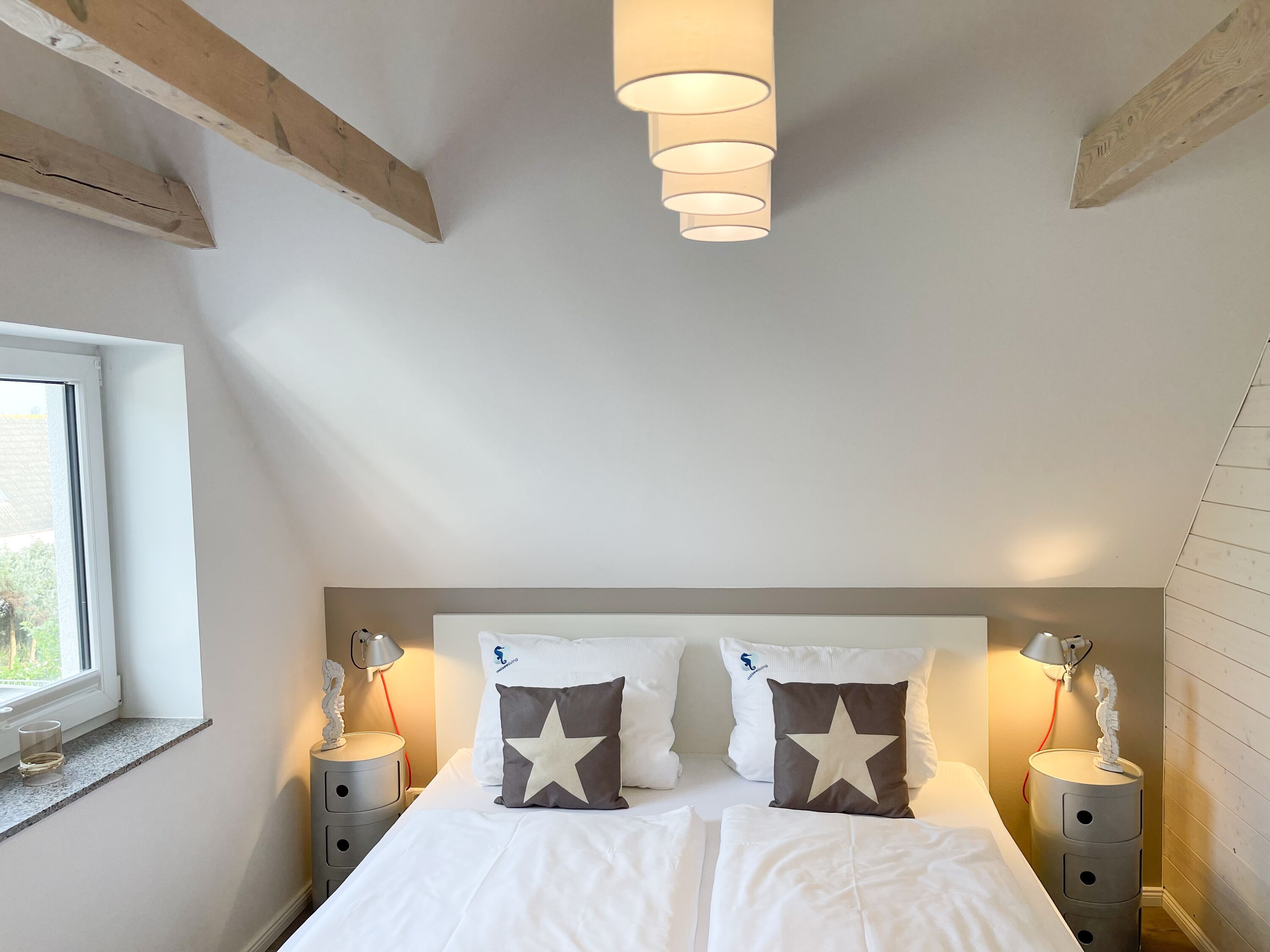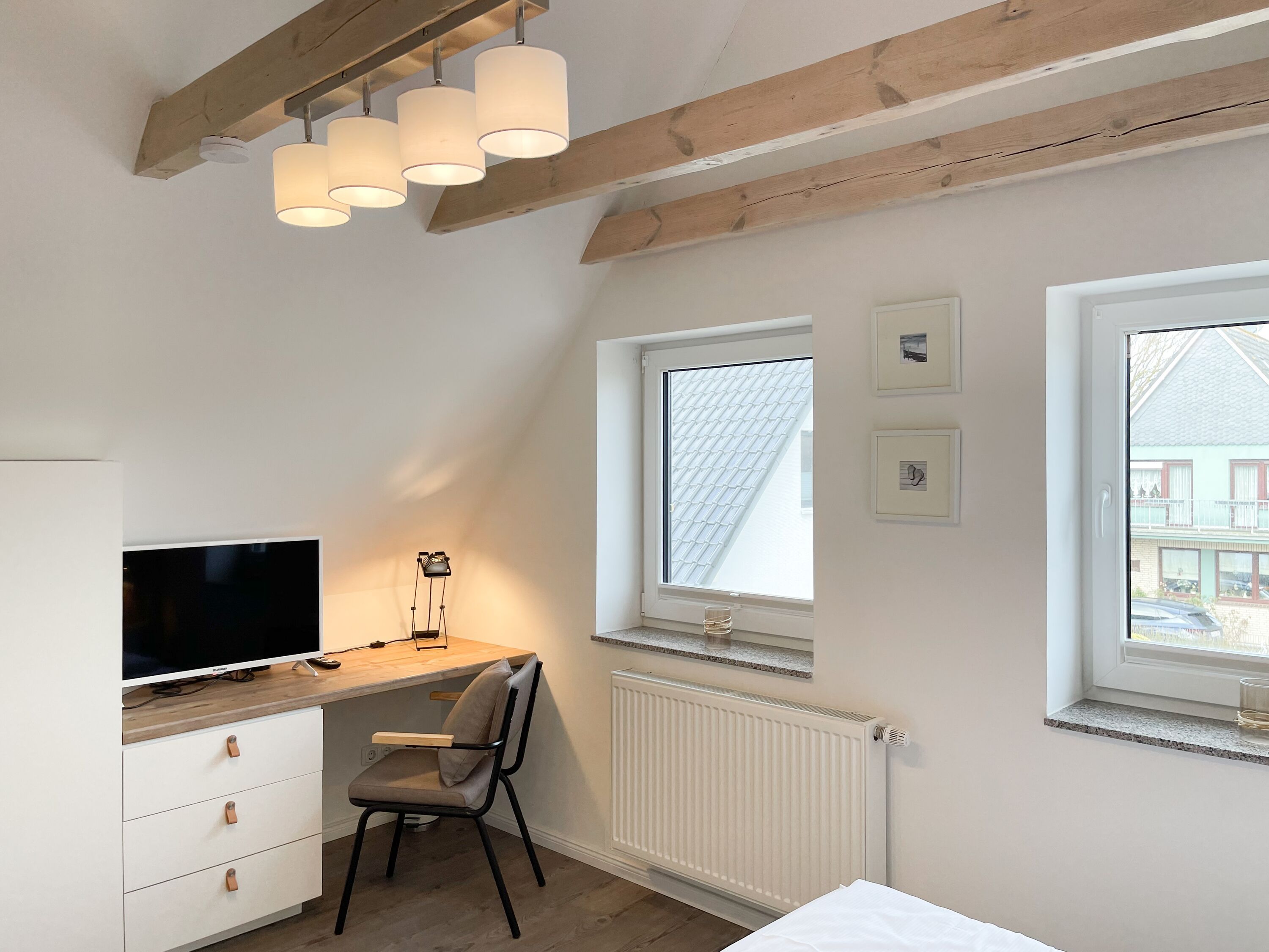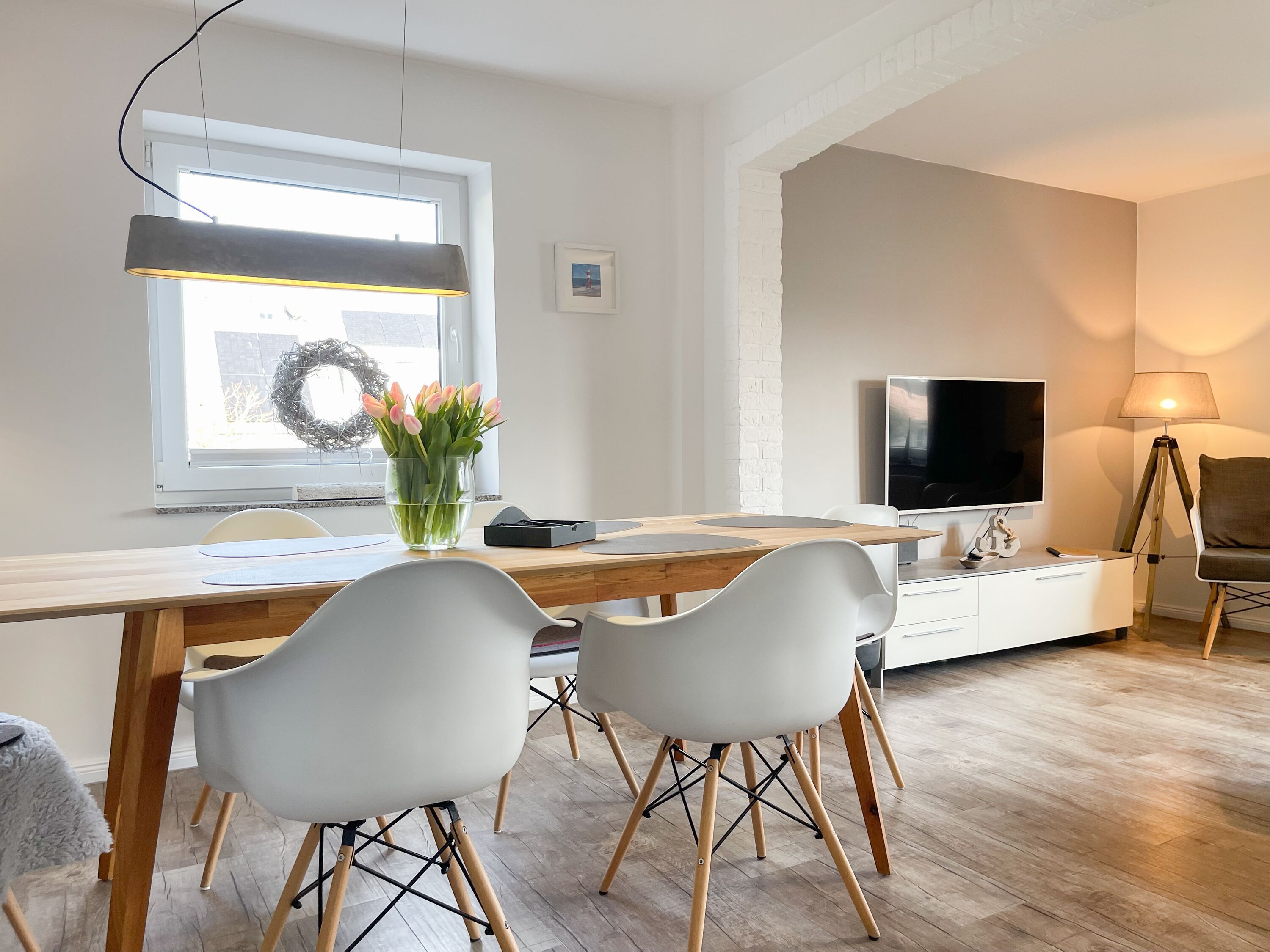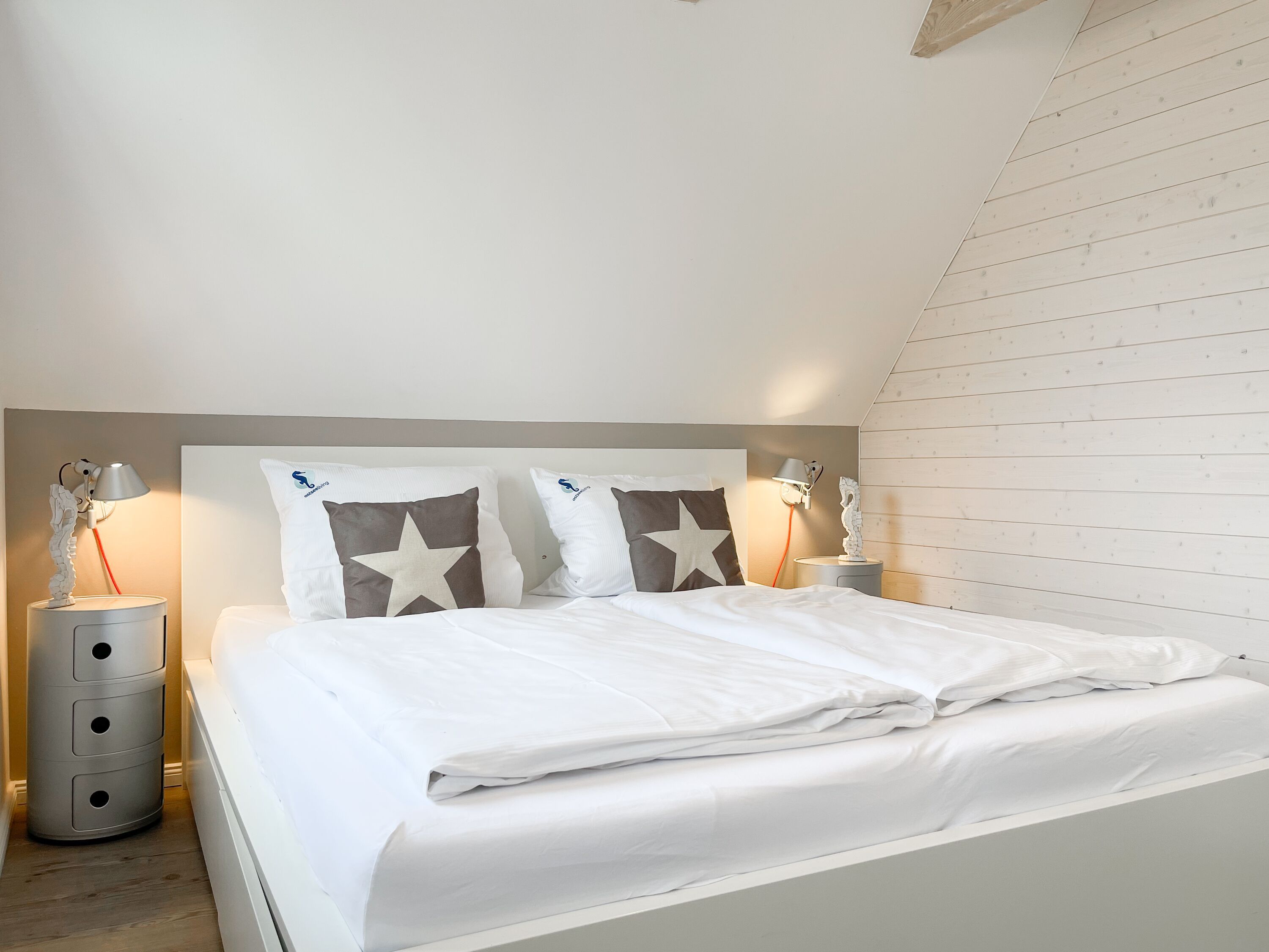 Mittelpunkt des Hauses bildet ein großzügig angelegter, heller Wohnbereich, hochwertig und geschmackvoll eingerichtet (TV, Hifi Anlage, WLAN) mit einem angrenzenden Essbereich, der ausreichend Platz für 6 Personen bietet. Die abgeschlossene Küche ist bestens ausgestattet. Der Bartresen mit zwei Barhockern ist als kleiner Frühstücksbereich oder Treffpunkt für gemeinsames Kochen gedacht. Ein hochwertiges Bad mit Dusche und Badewanne ist ebenfalls im Erdgeschoss untergebracht. Im Obergeschoss befindet sich ein Schlafzimmer mit zwei Einzelbetten (80x200) und ein modernes Duschbad en-suite sowie ein äußerst großzügiges Schlafzimmer mit einem Doppelbett (180x200), TV und Einbauschrank. Ein weiteres kleines Schlafzimmer ist mit einem Einzelbett, Sessel und Kommode eingerichtet.