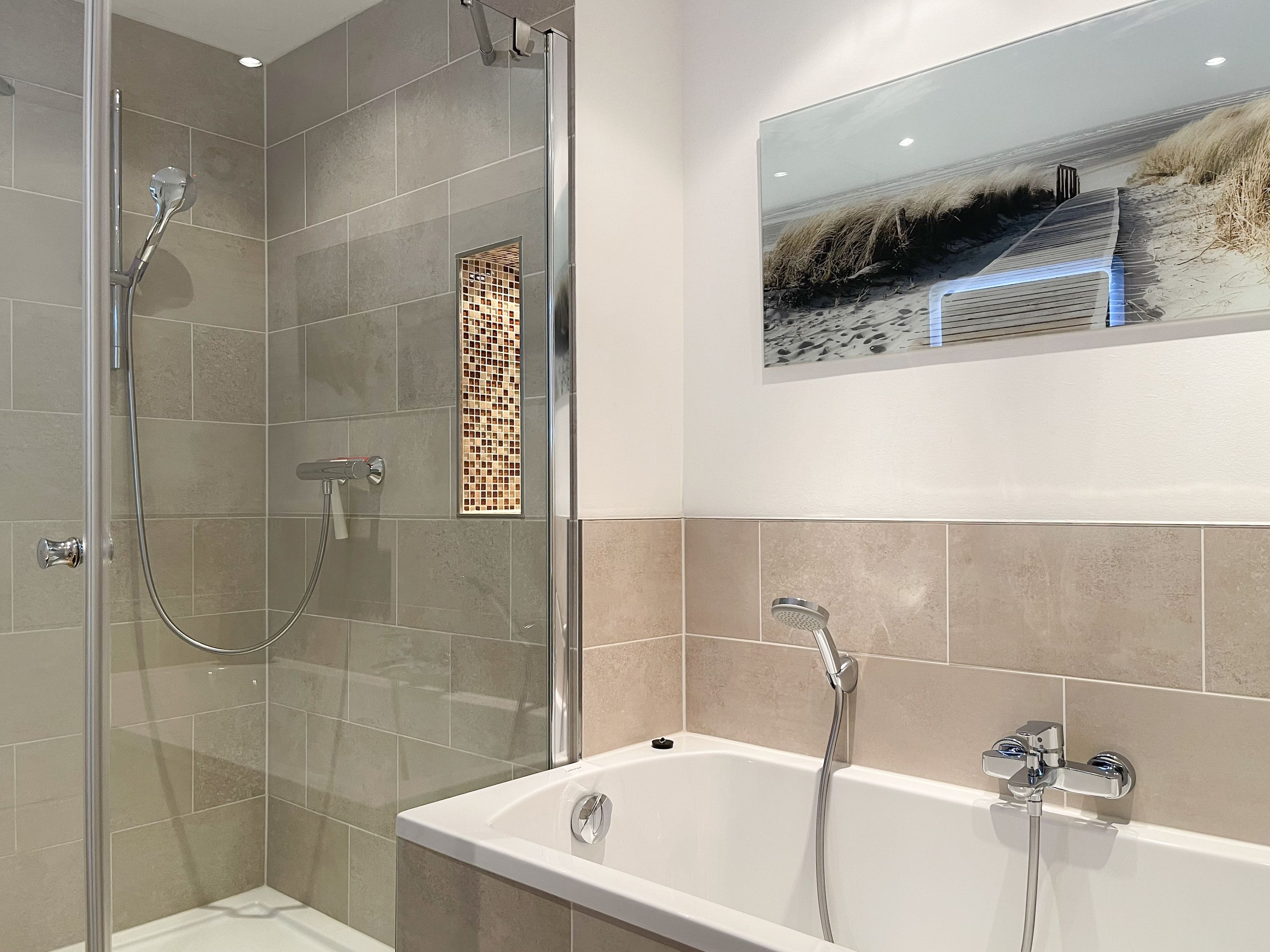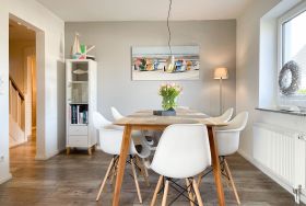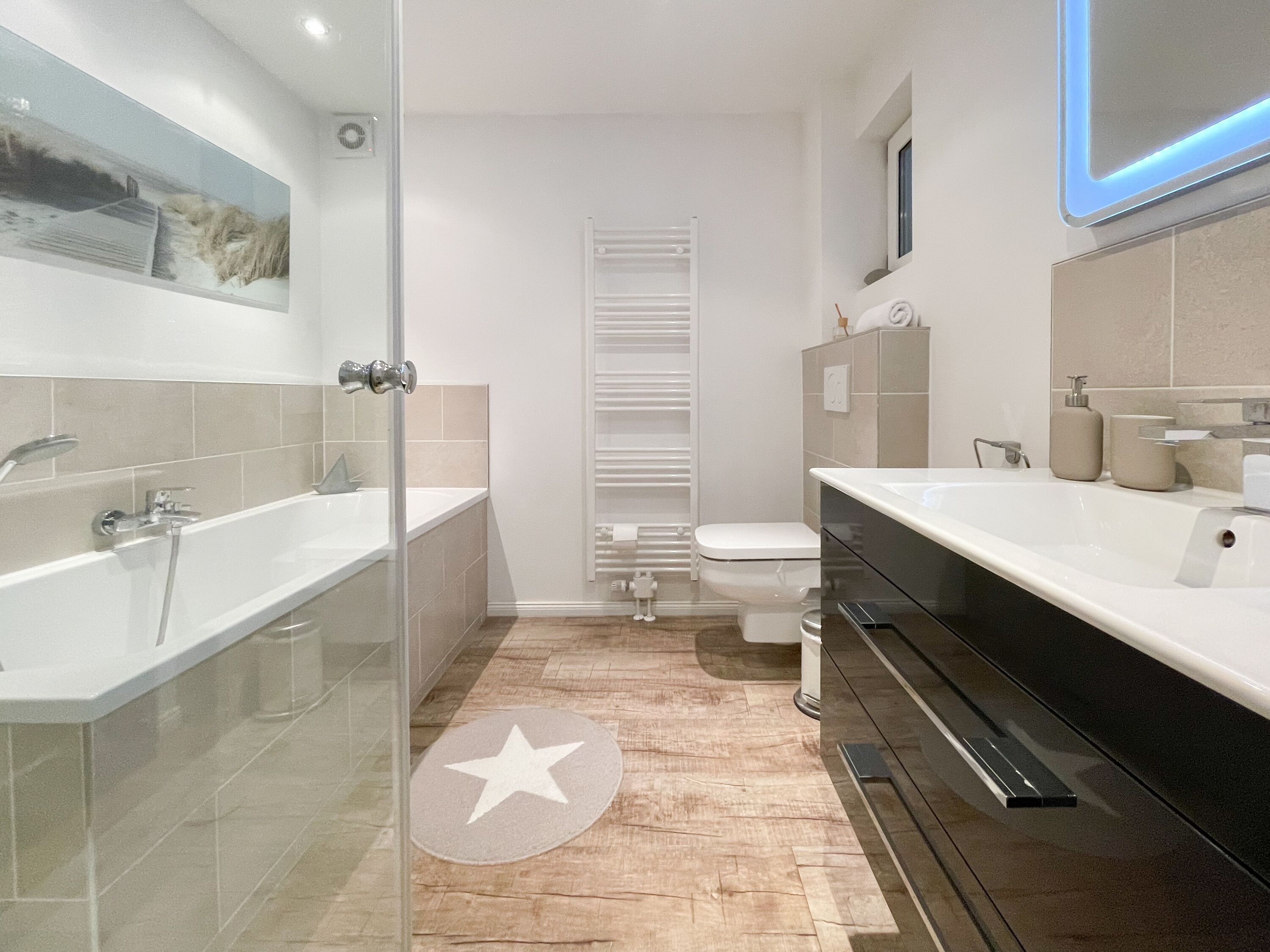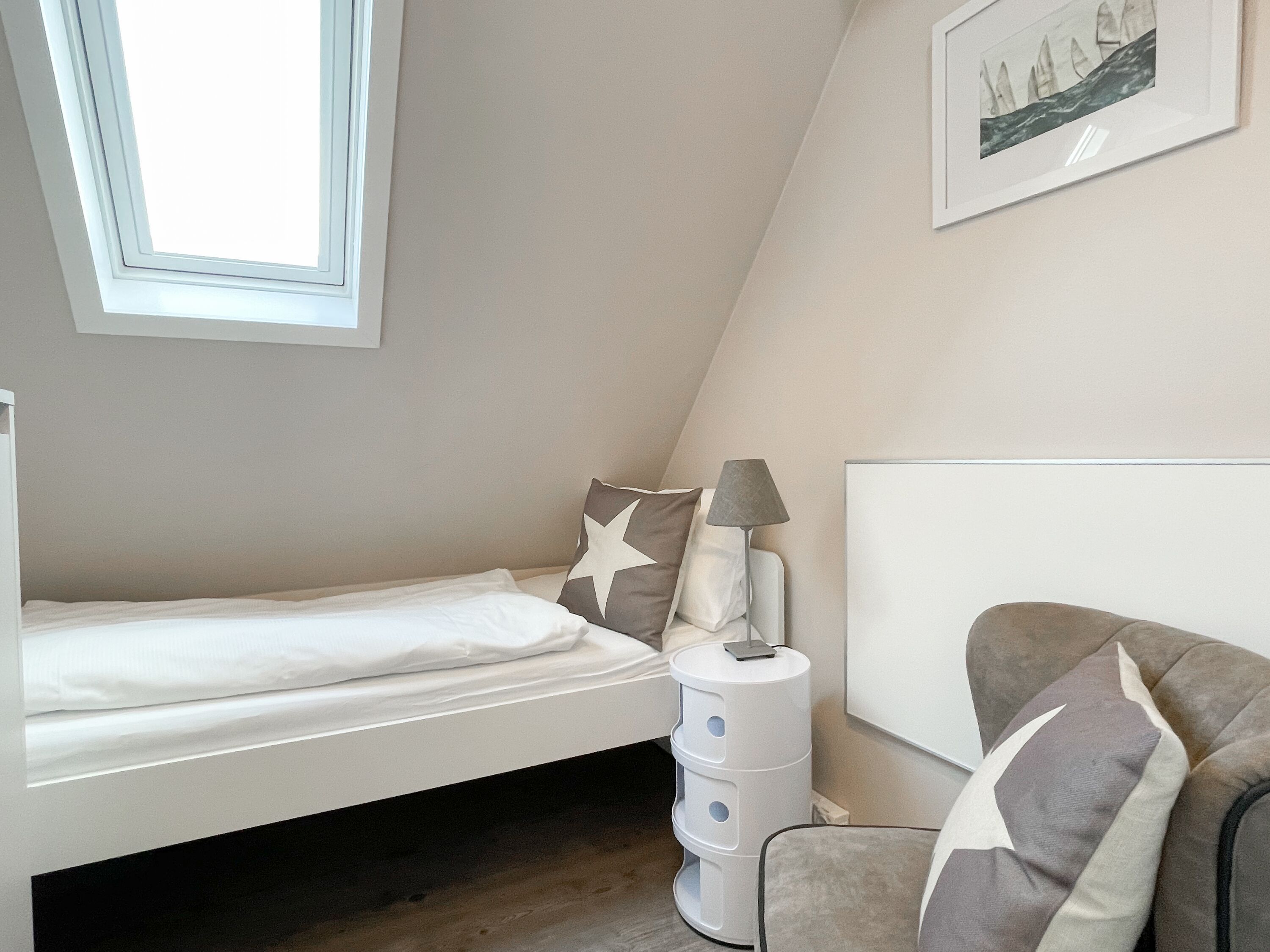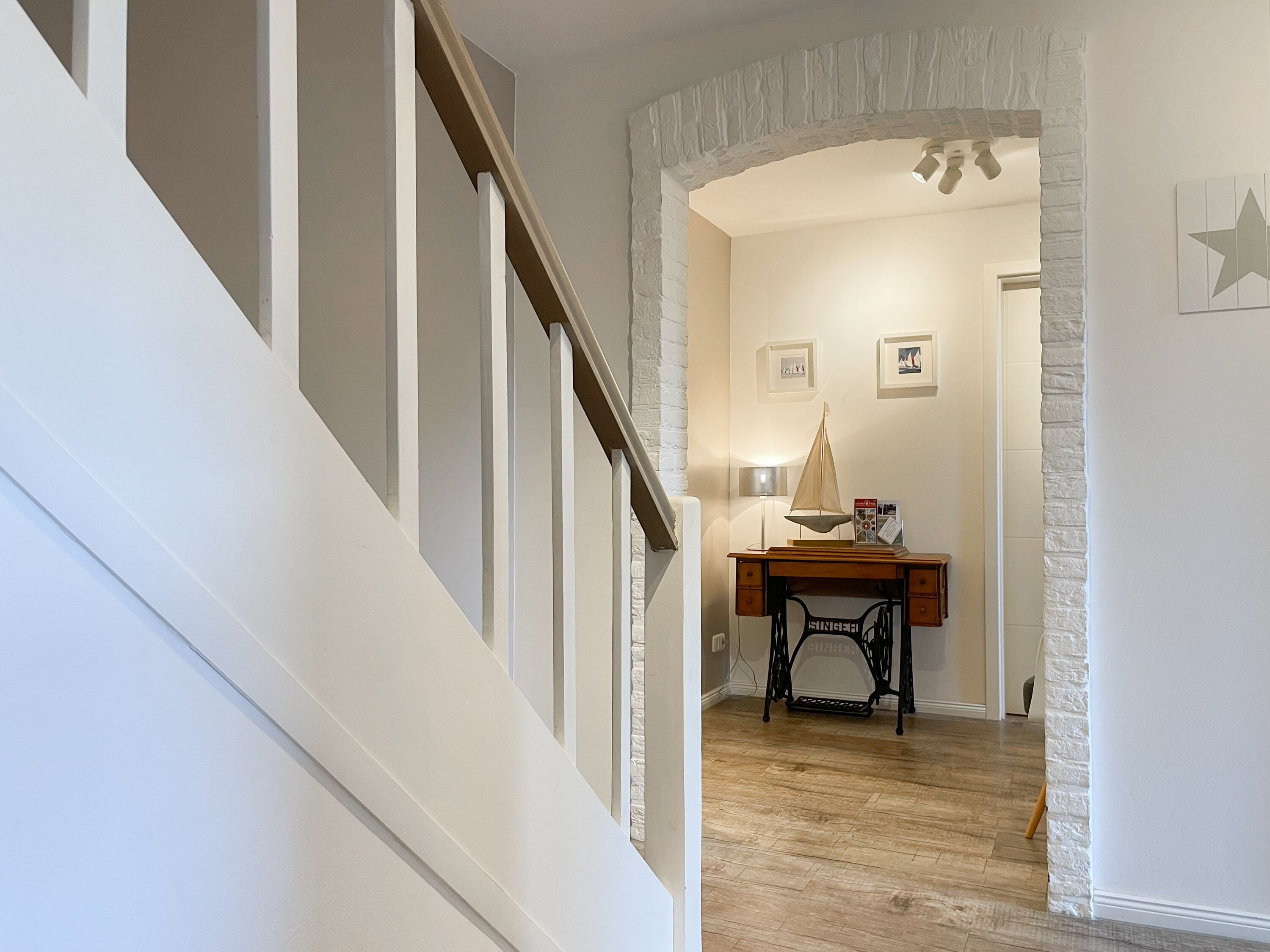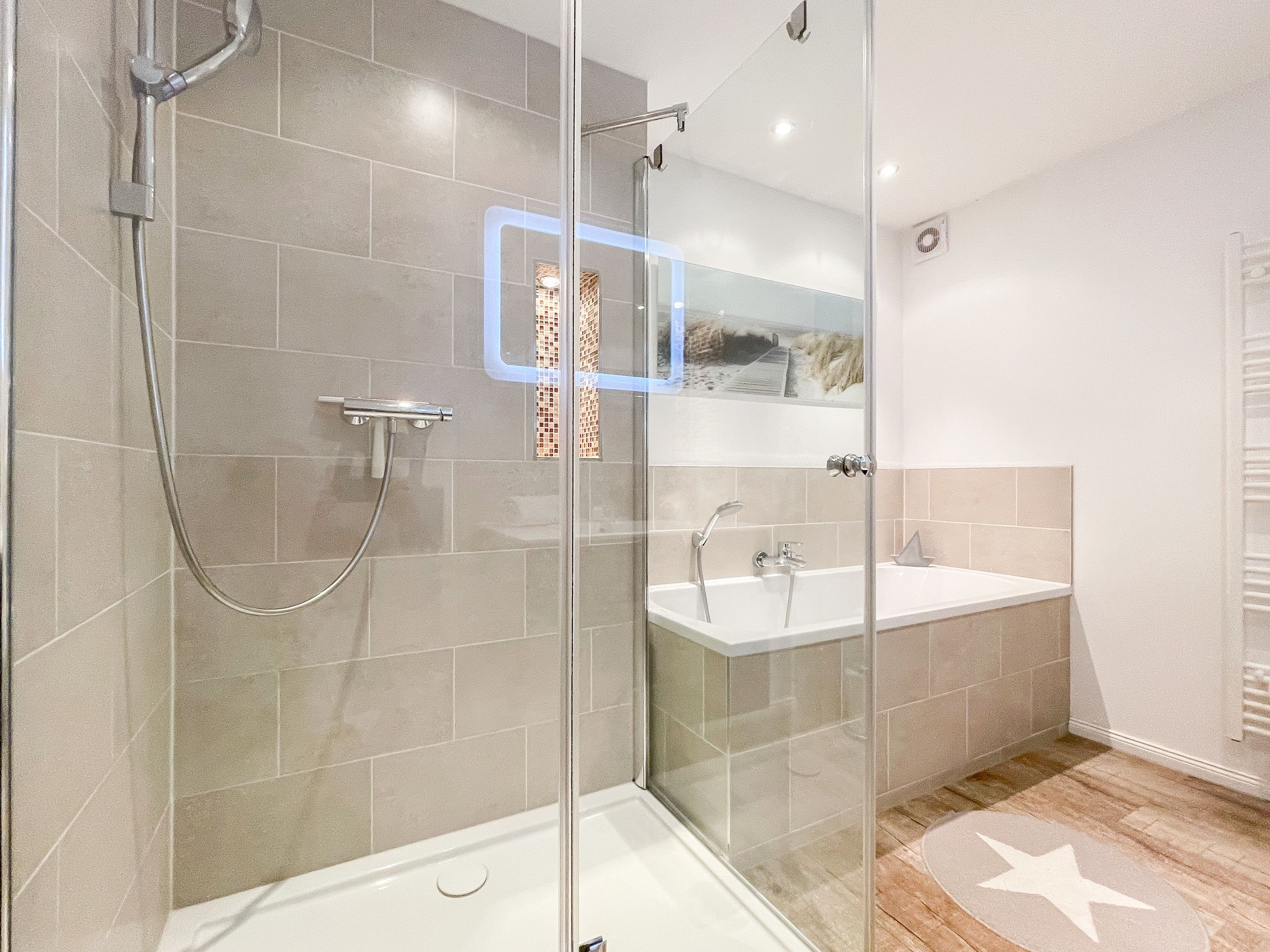 Mittelpunkt des Hauses bildet ein großzügig angelegter, heller Wohnbereich, hochwertig und geschmackvoll eingerichtet (TV, Hifi Anlage, WLAN) mit einem angrenzenden Essbereich, der ausreichend Platz für 6 Personen bietet. Die abgeschlossene Küche ist bestens ausgestattet. Der Bartresen mit zwei Barhockern ist als kleiner Frühstücksbereich oder Treffpunkt für gemeinsames Kochen gedacht. Ein hochwertiges Bad mit Dusche und Badewanne ist ebenfalls im Erdgeschoss untergebracht. Im Obergeschoss befindet sich ein Schlafzimmer mit zwei Einzelbetten (80x200) und ein modernes Duschbad en-suite sowie ein äußerst großzügiges Schlafzimmer mit einem Doppelbett (180x200), TV und Einbauschrank. Ein weiteres kleines Schlafzimmer ist mit einem Einzelbett, Sessel und Kommode eingerichtet.