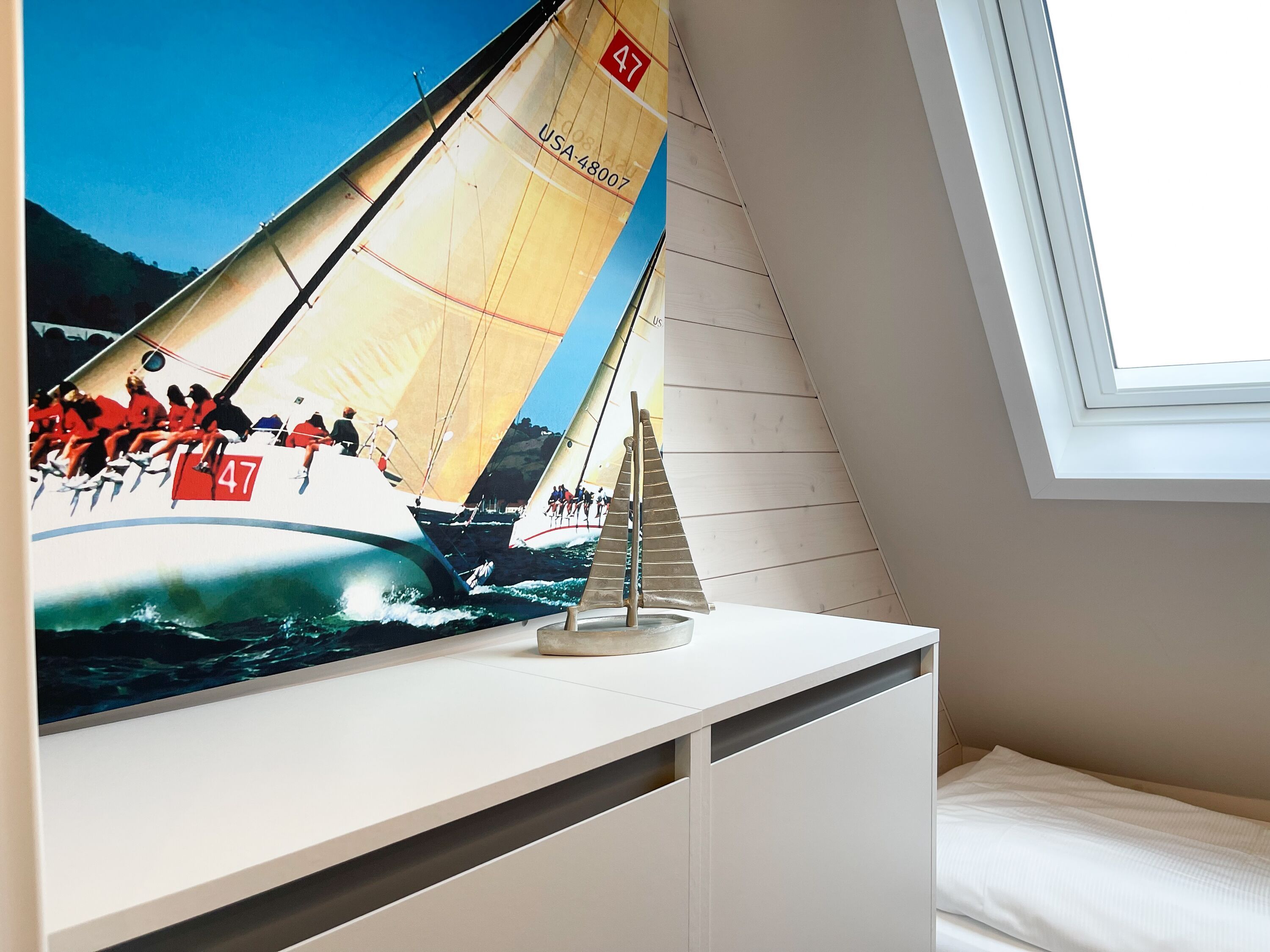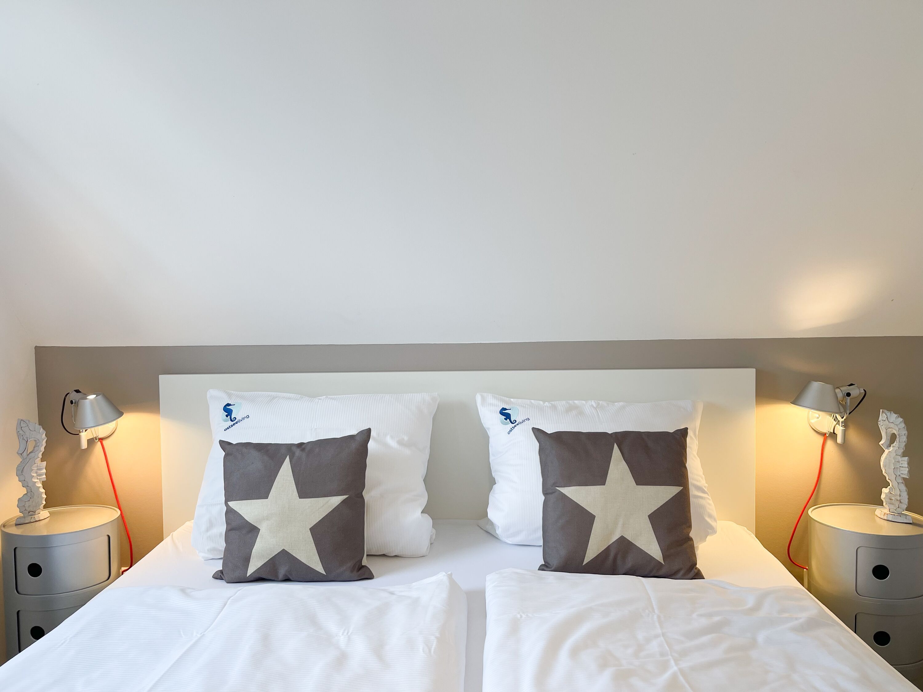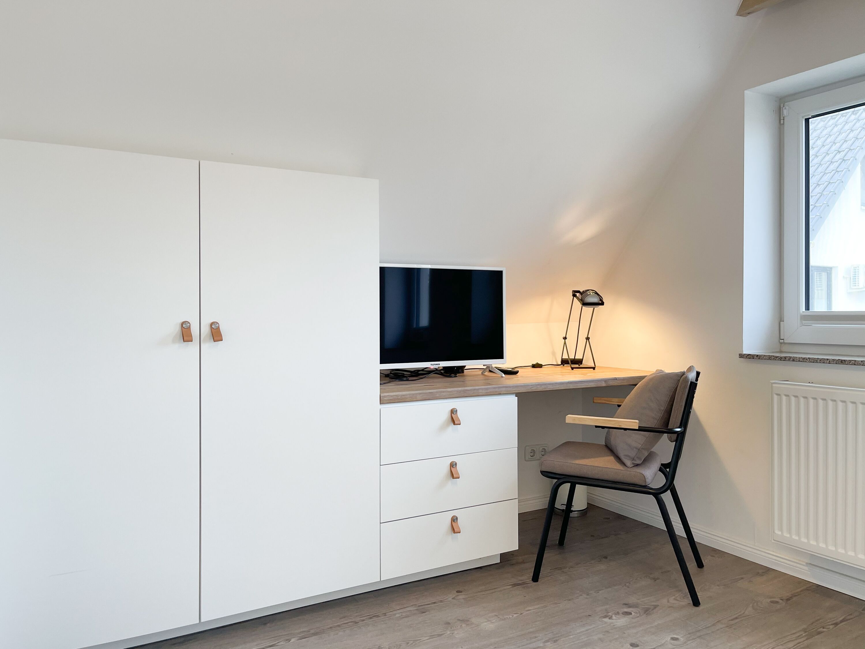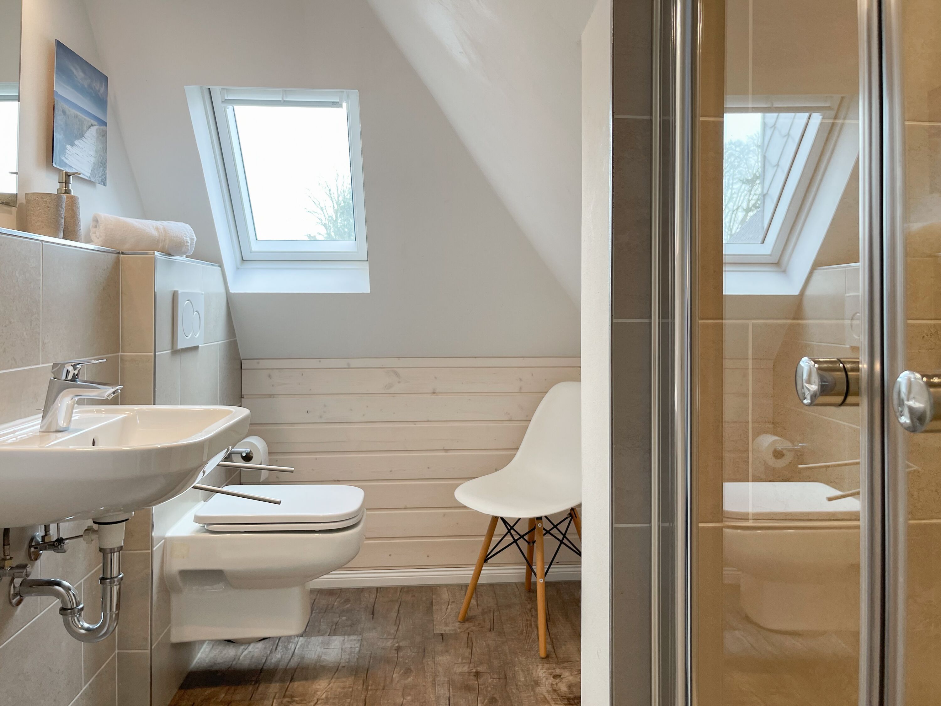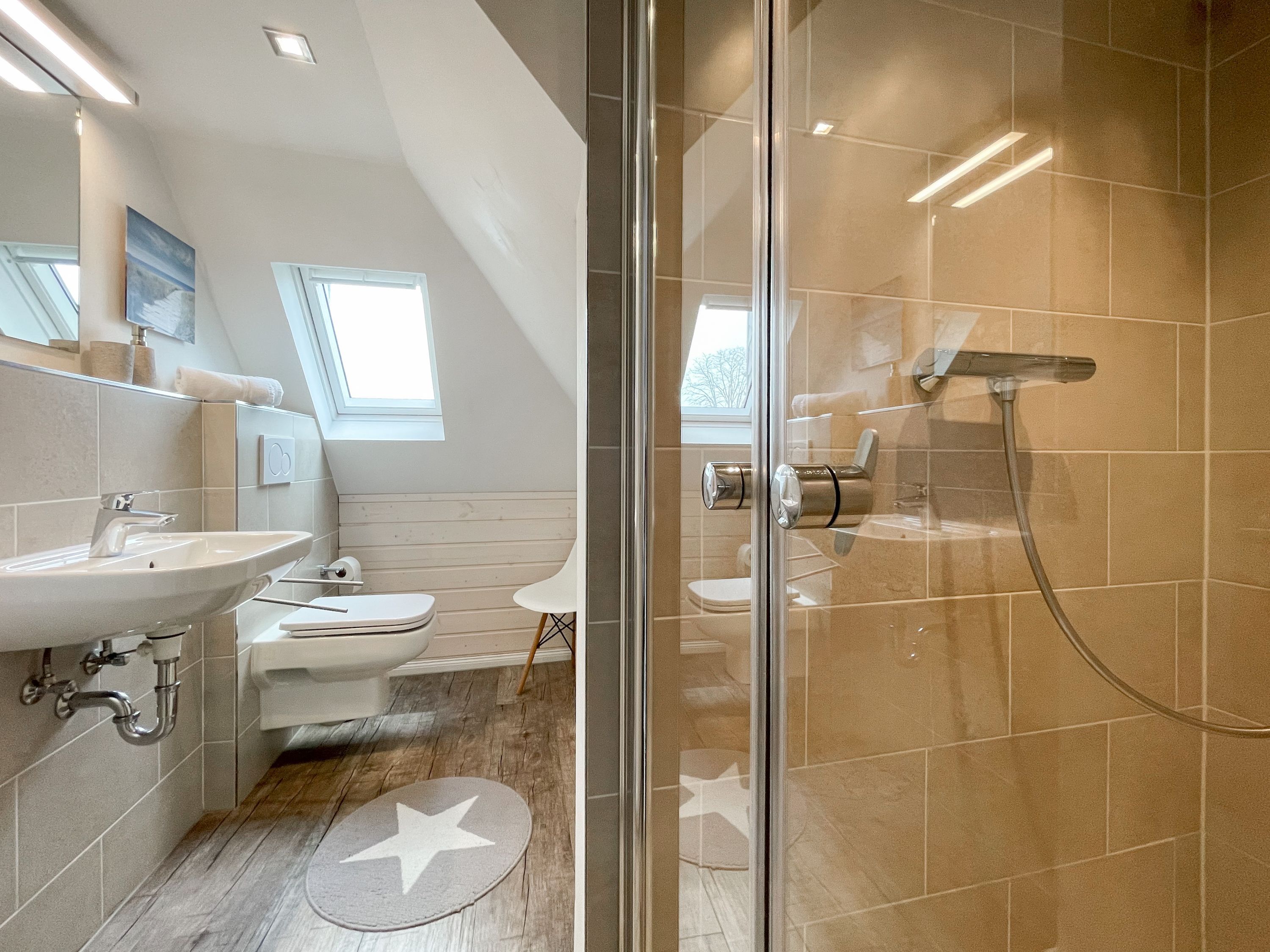 Mittelpunkt des Hauses bildet ein großzügig angelegter, heller Wohnbereich, hochwertig und geschmackvoll eingerichtet (TV, Hifi Anlage, WLAN) mit einem angrenzenden Essbereich, der ausreichend Platz für 6 Personen bietet. Die abgeschlossene Küche ist bestens ausgestattet. Der Bartresen mit zwei Barhockern ist als kleiner Frühstücksbereich oder Treffpunkt für gemeinsames Kochen gedacht. Ein hochwertiges Bad mit Dusche und Badewanne ist ebenfalls im Erdgeschoss untergebracht. Im Obergeschoss befindet sich ein Schlafzimmer mit zwei Einzelbetten (80x200) und ein modernes Duschbad en-suite sowie ein äußerst großzügiges Schlafzimmer mit einem Doppelbett (180x200), TV und Einbauschrank. Ein weiteres kleines Schlafzimmer ist mit einem Einzelbett, Sessel und Kommode eingerichtet.